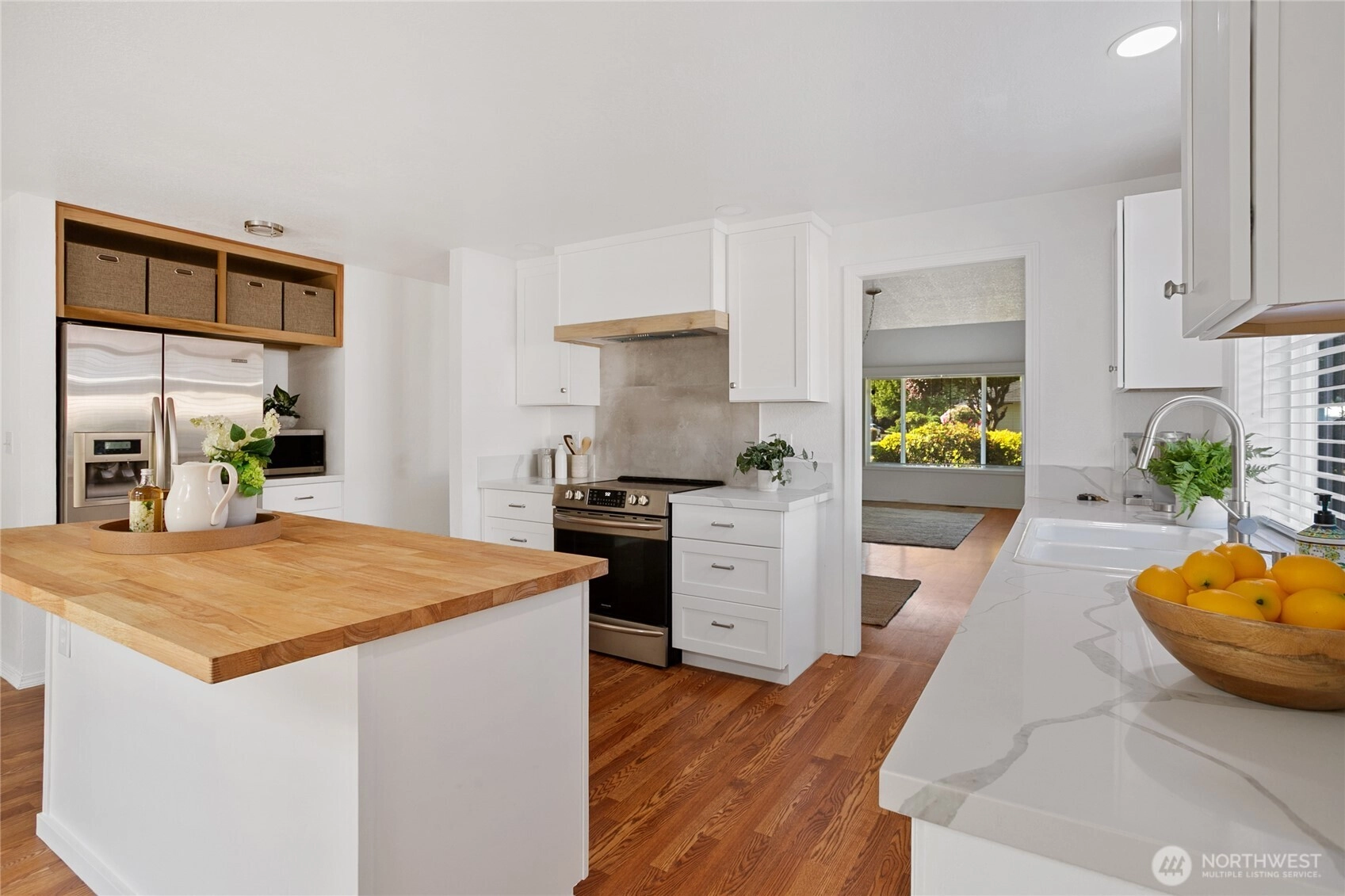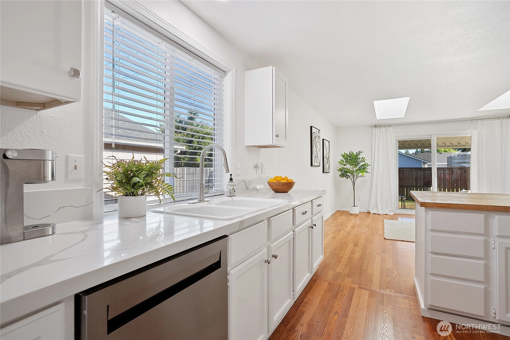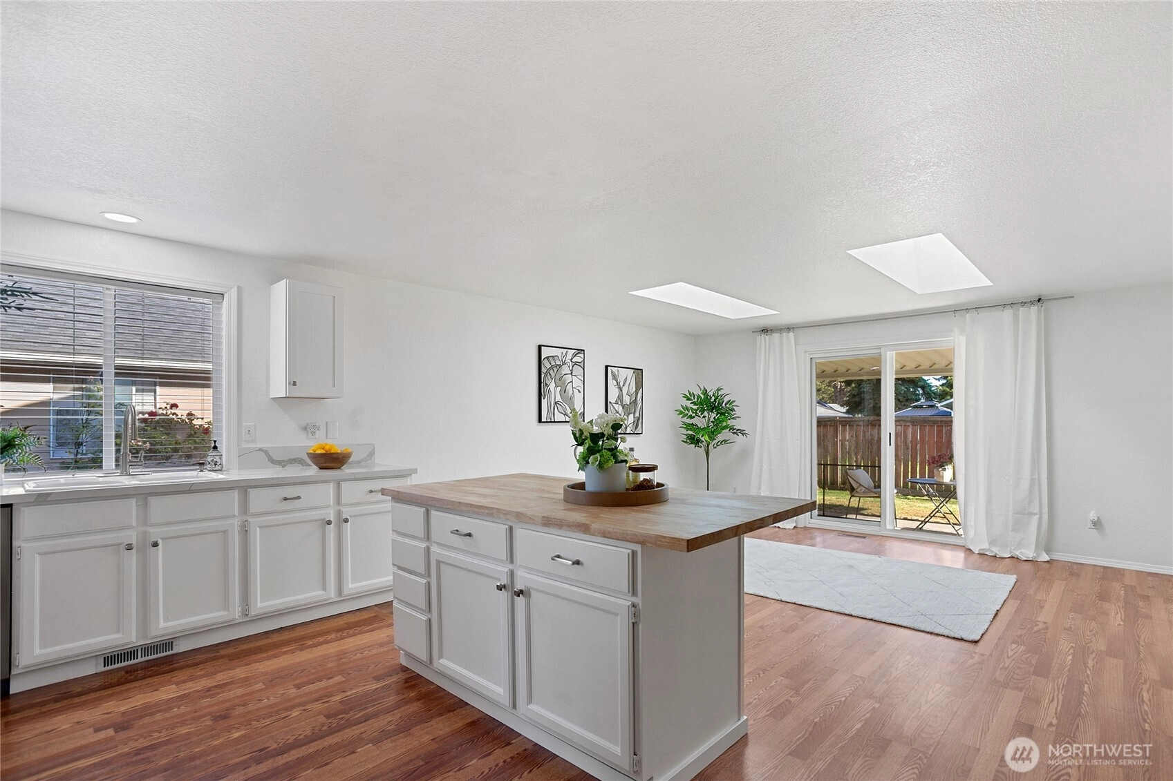 Beautifully updated 3-bedroom, 1.75-bath rambler with 1,666 SF of functional living space on a fully fenced lot. Built in 1991, this home features a remodeled kitchen with expanded footprint, new quartz countertops, butcher block island, newer stainless-steel appliances, updated cabinets, and new hood vent. Continuous flooring and all new can lighting throughout. Living room with fireplace and large covered patio perfect for entertaining. Primary suite has updated vanity with quartz countertop, lighting, and new faucet/sink. Guest bath also updated w/ quartz countertop. New skylights, ceiling fans, and overhead lighting throughout. A move-in-ready gem offering comfort, style, and great value!