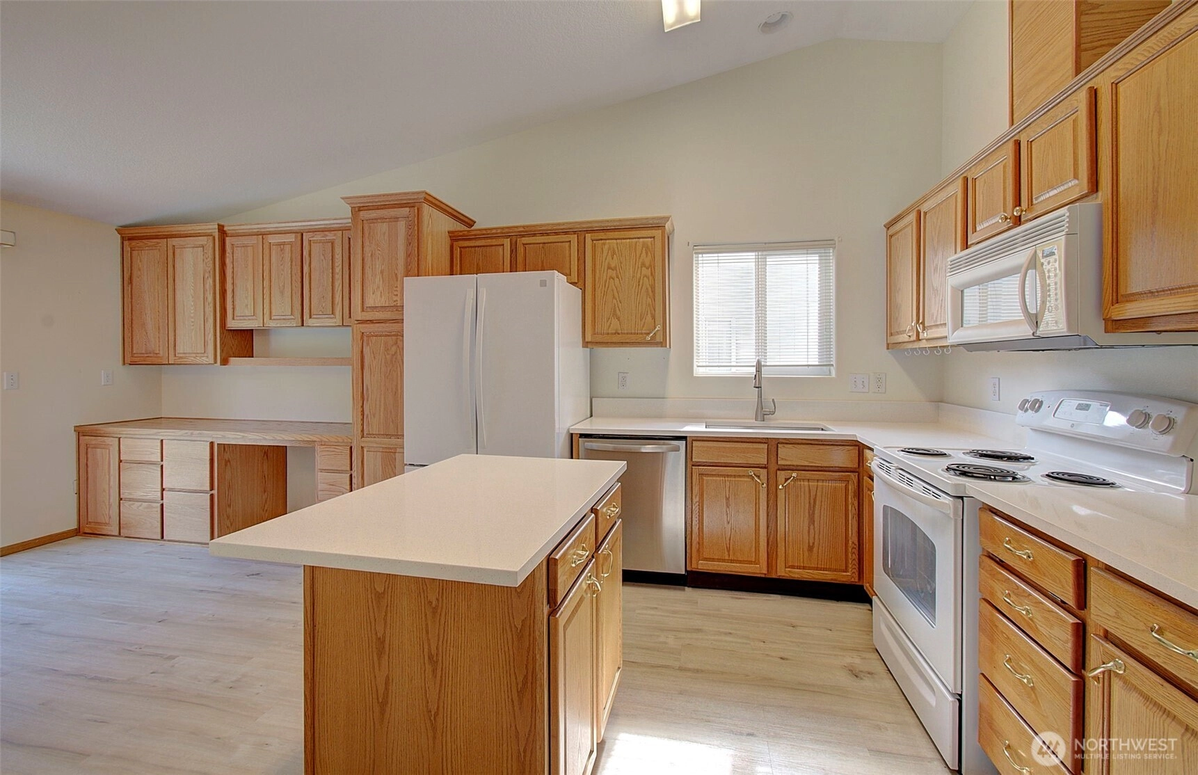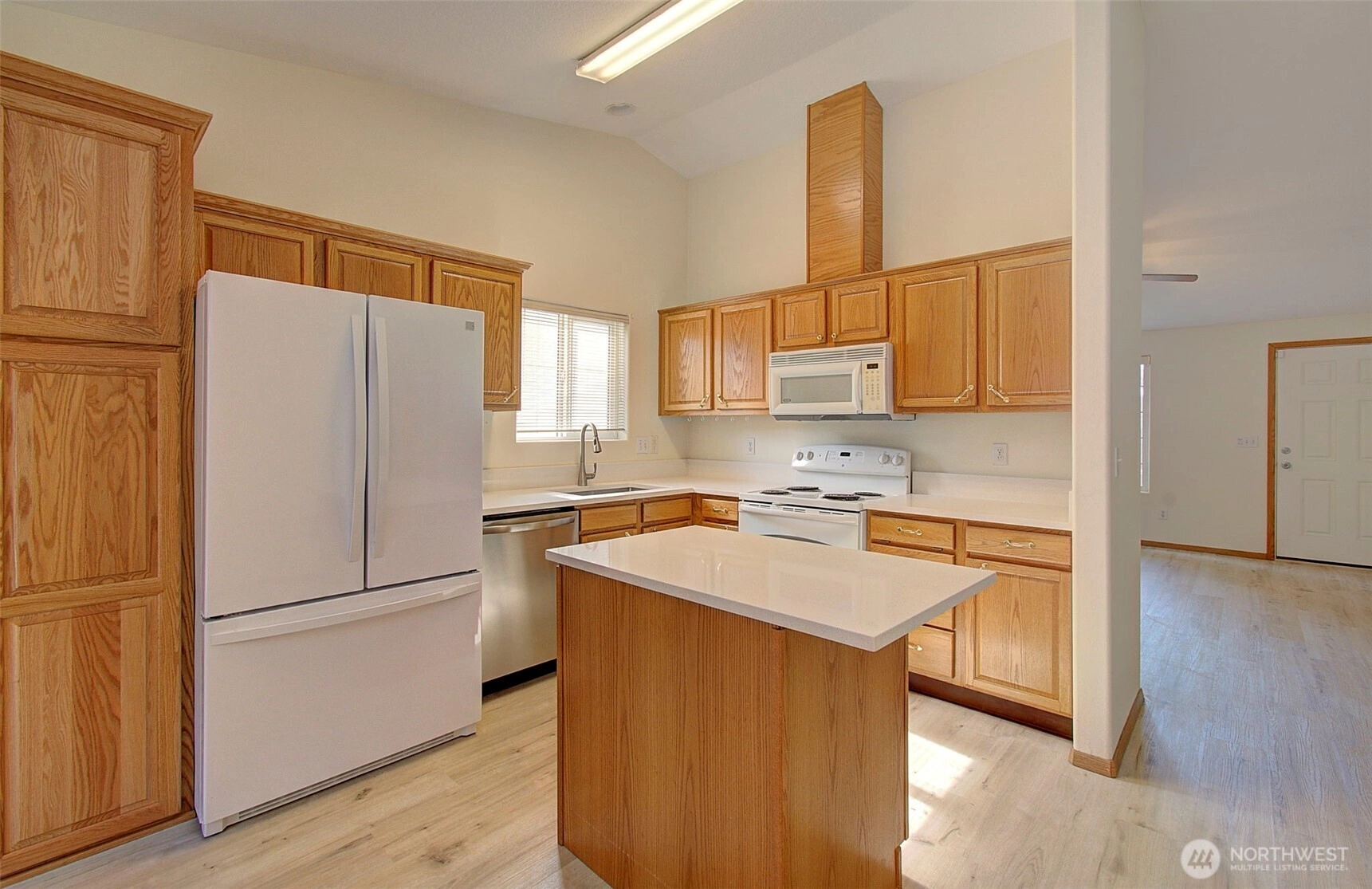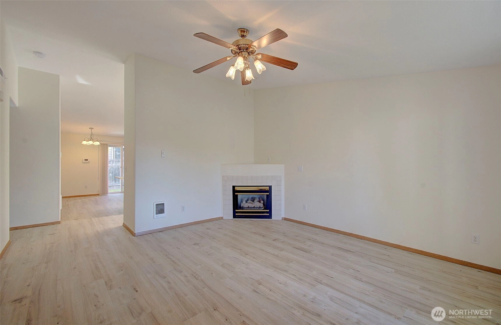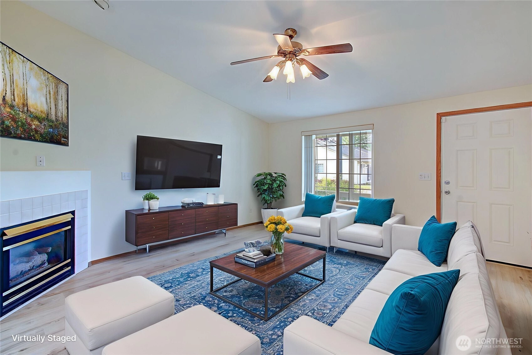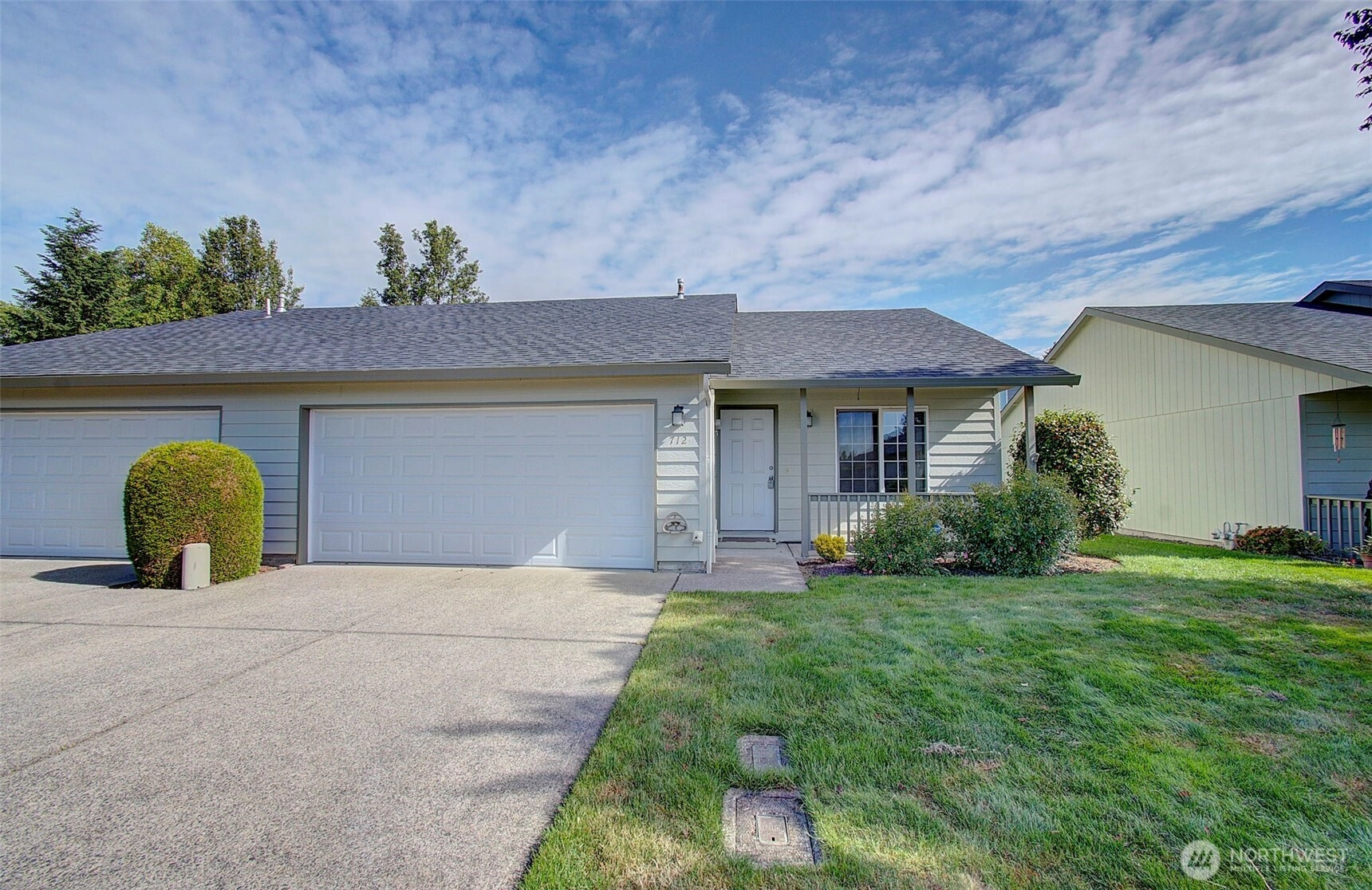 This charming 2 bed, 2 full bath single-level home with new flooring throughout. Kitchen includes an island, built-in dishwasher, new countertops and plenty of cupboards space. Vaulted ceilings, corner gas fireplace, with a fan highlight the spacious living room. The primary suite features an en suite bathroom and a walk-in closet. Large garage offers ample space for parking and storage. Located in a quiet community with a small-town feel, just minutes from downtown and Old Town Battle Ground. Move in ready!