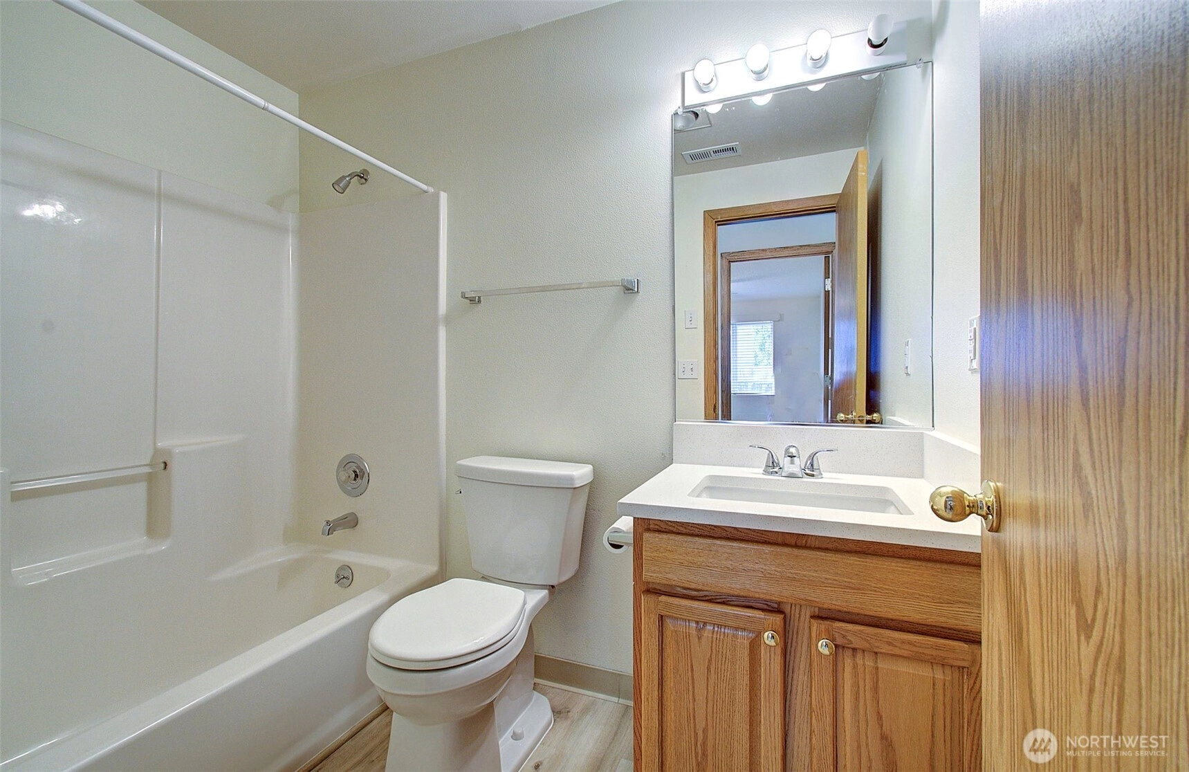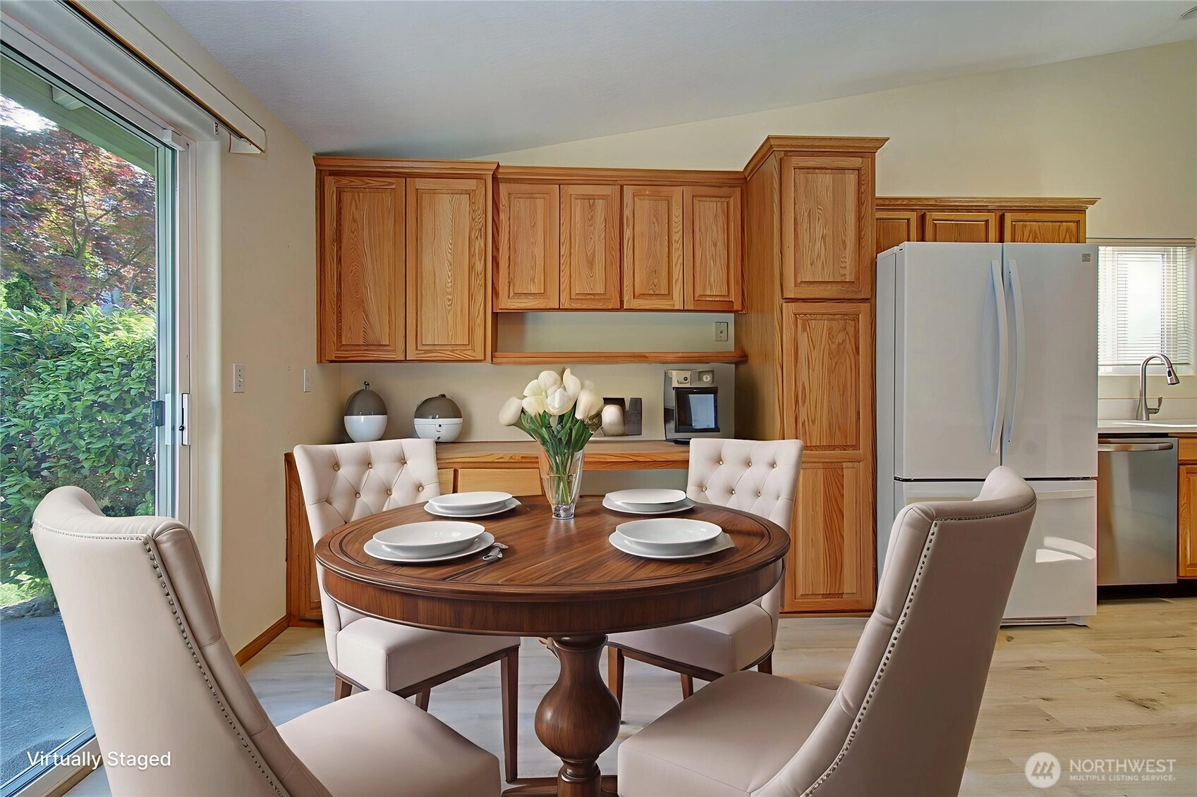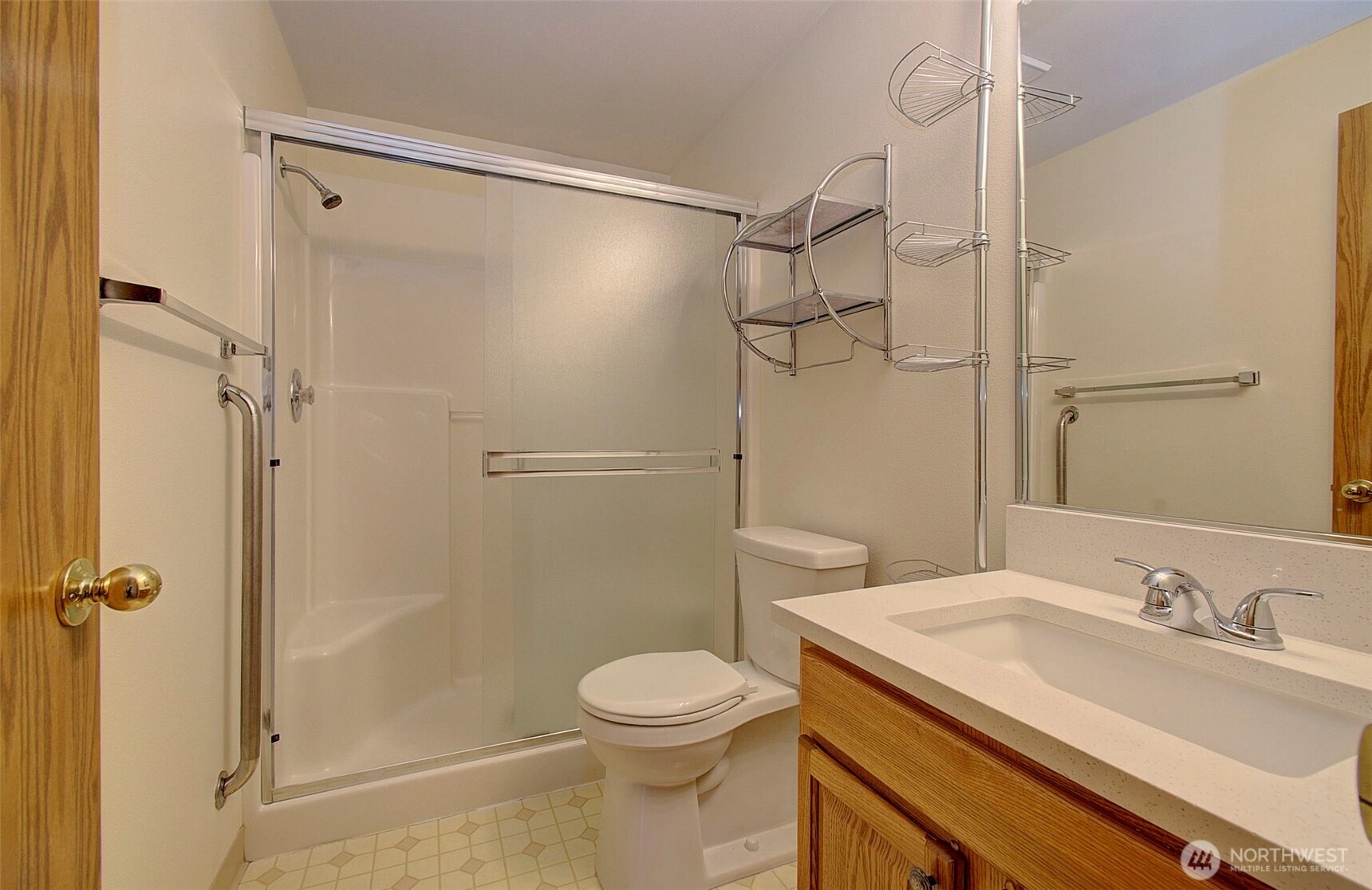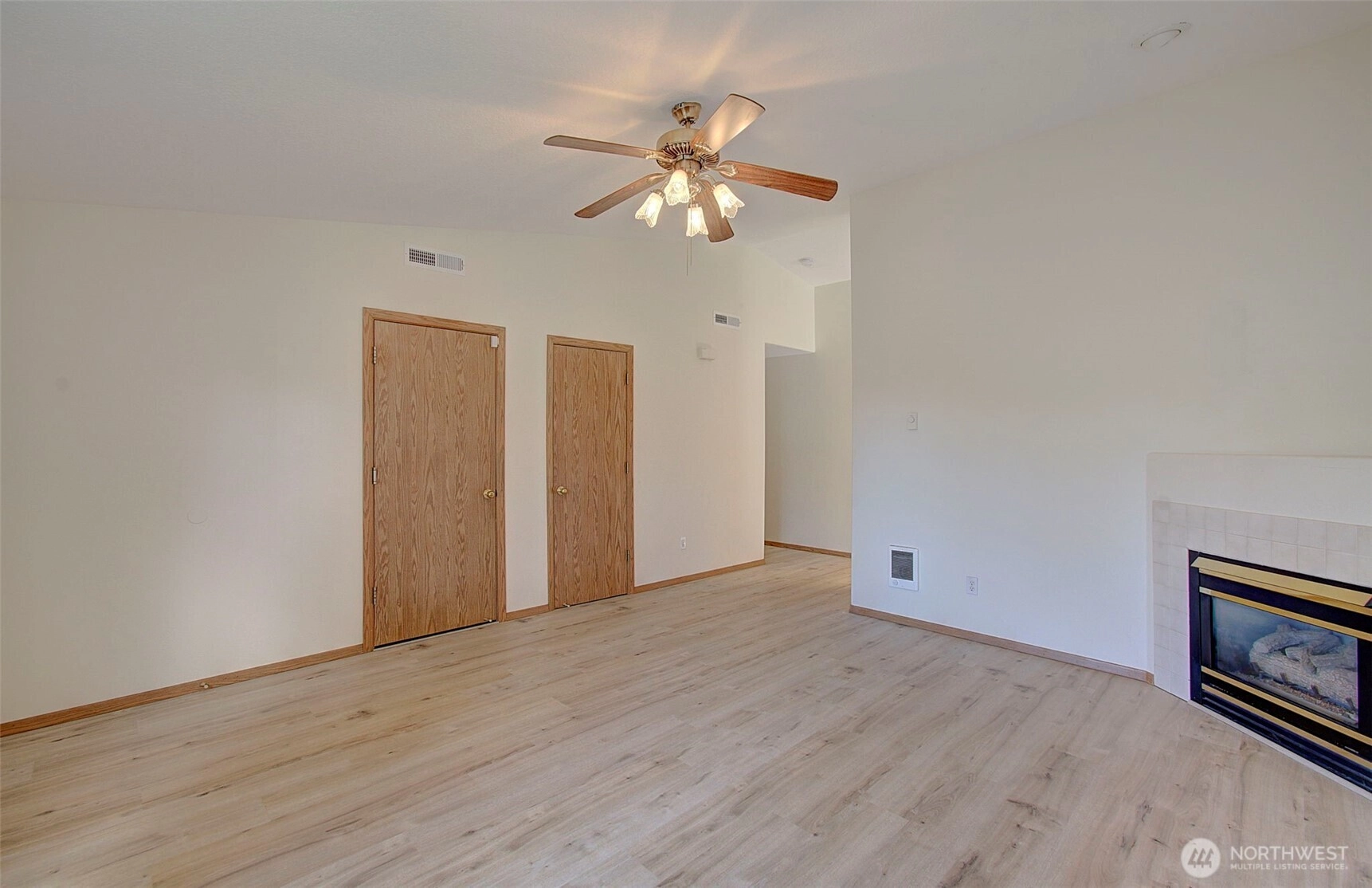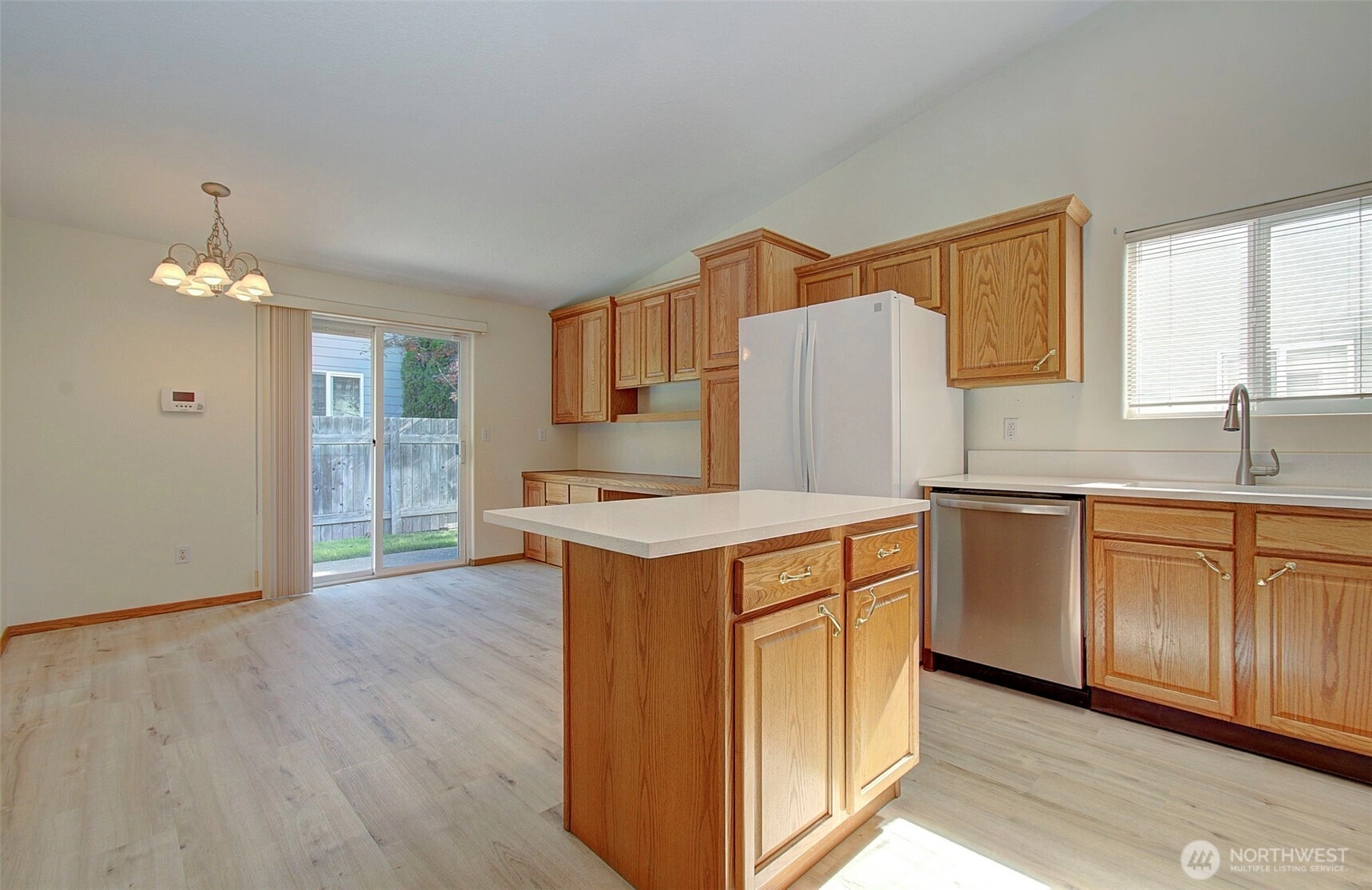 This charming 2 bed, 2 full bath single-level home with new flooring throughout. Kitchen includes an island, built-in dishwasher, new countertops and plenty of cupboards space. Vaulted ceilings, corner gas fireplace, with a fan highlight the spacious living room. The primary suite features an en suite bathroom and a walk-in closet. Large garage offers ample space for parking and storage. Located in a quiet community with a small-town feel, just minutes from downtown and Old Town Battle Ground. Move in ready!