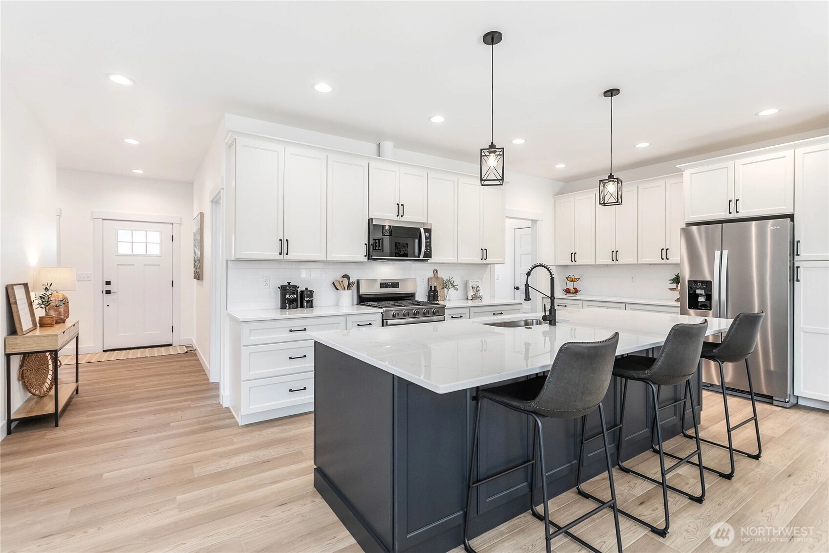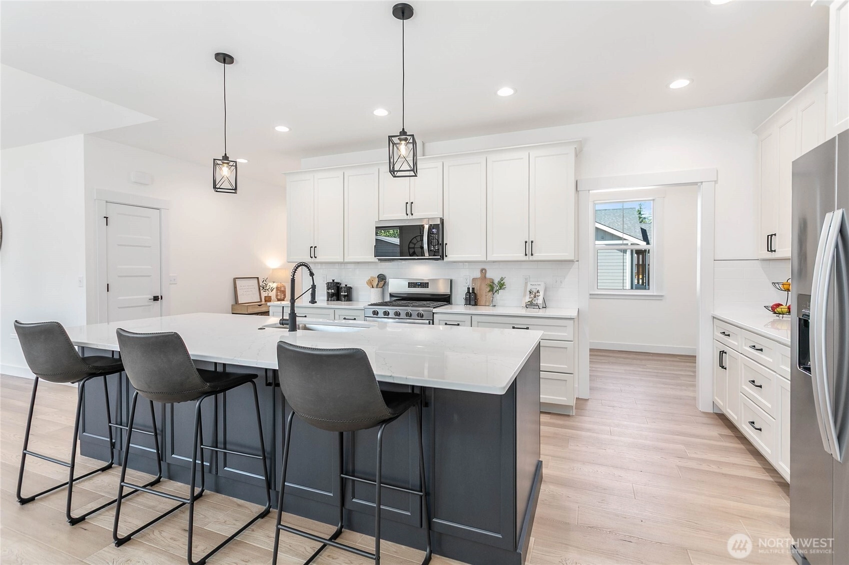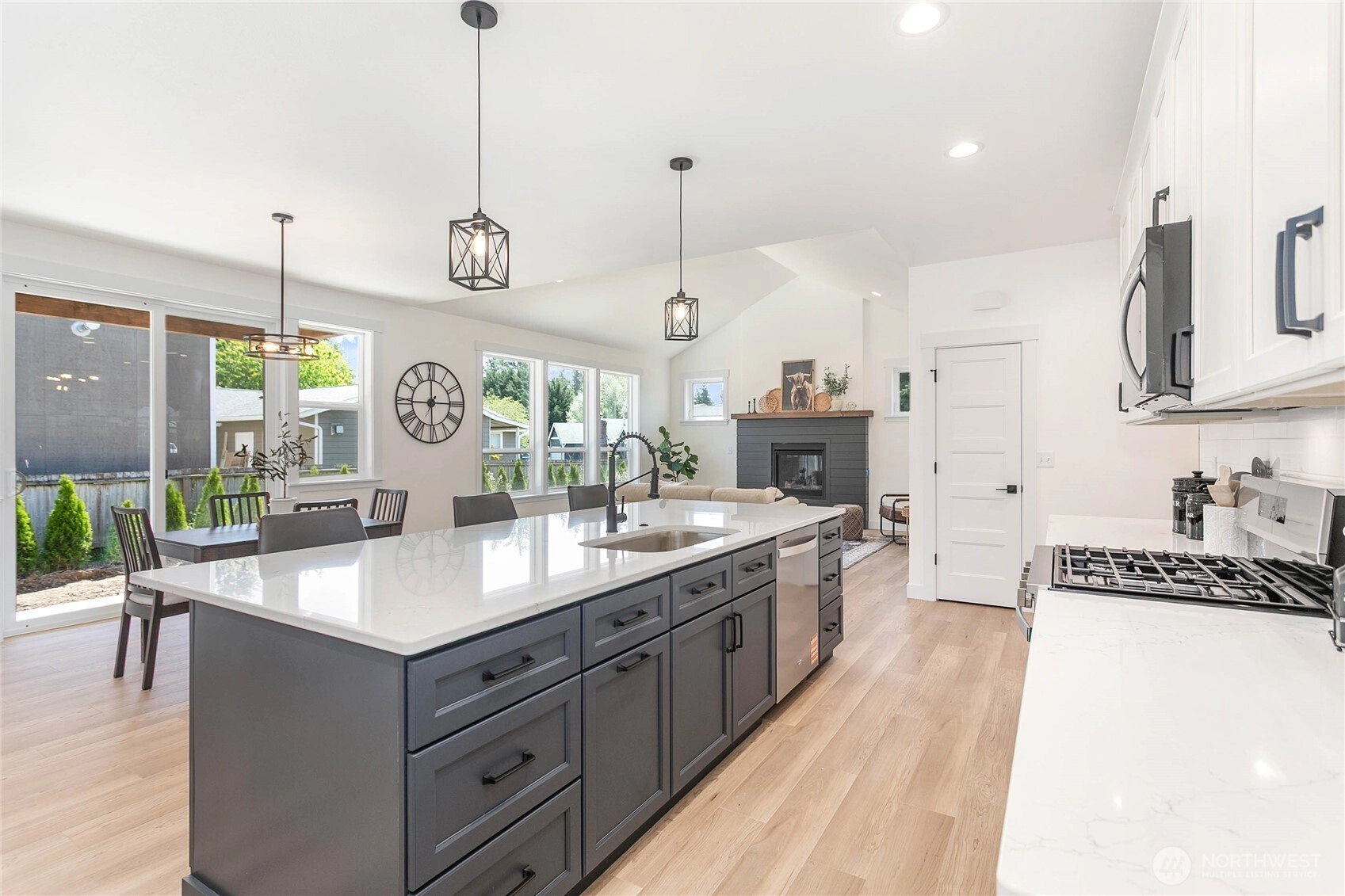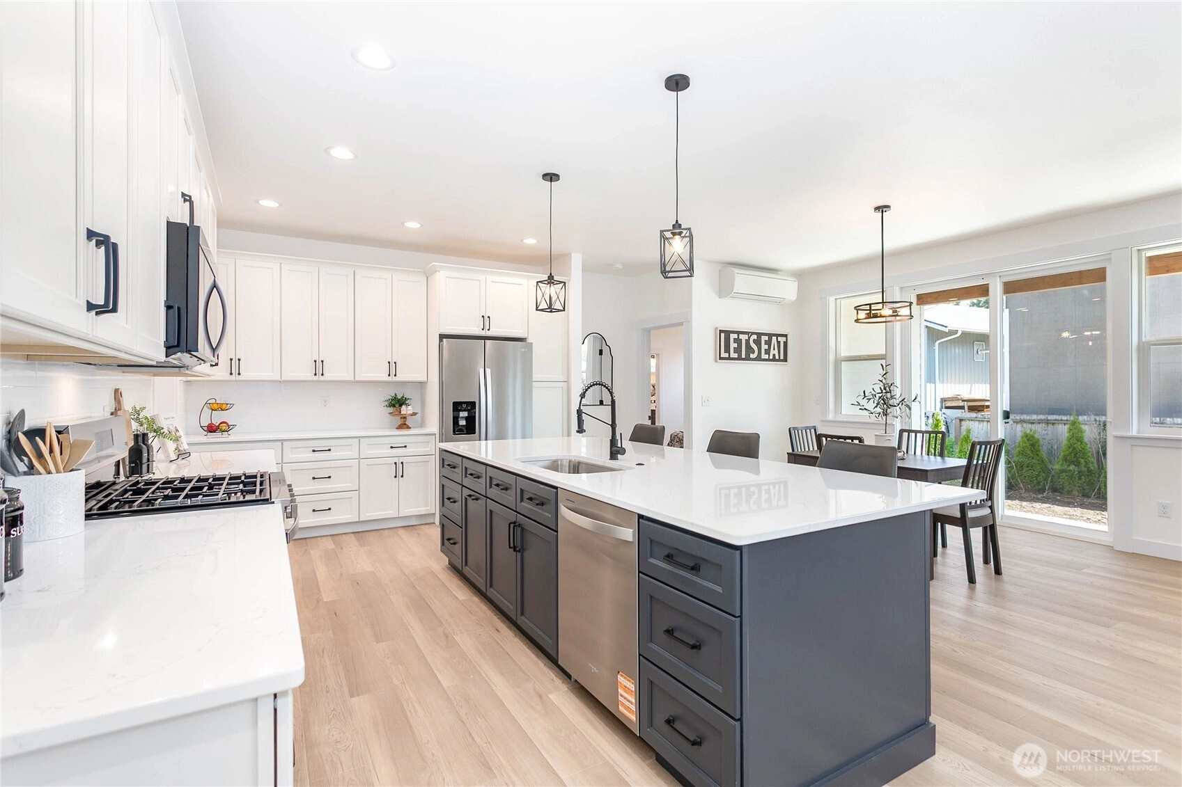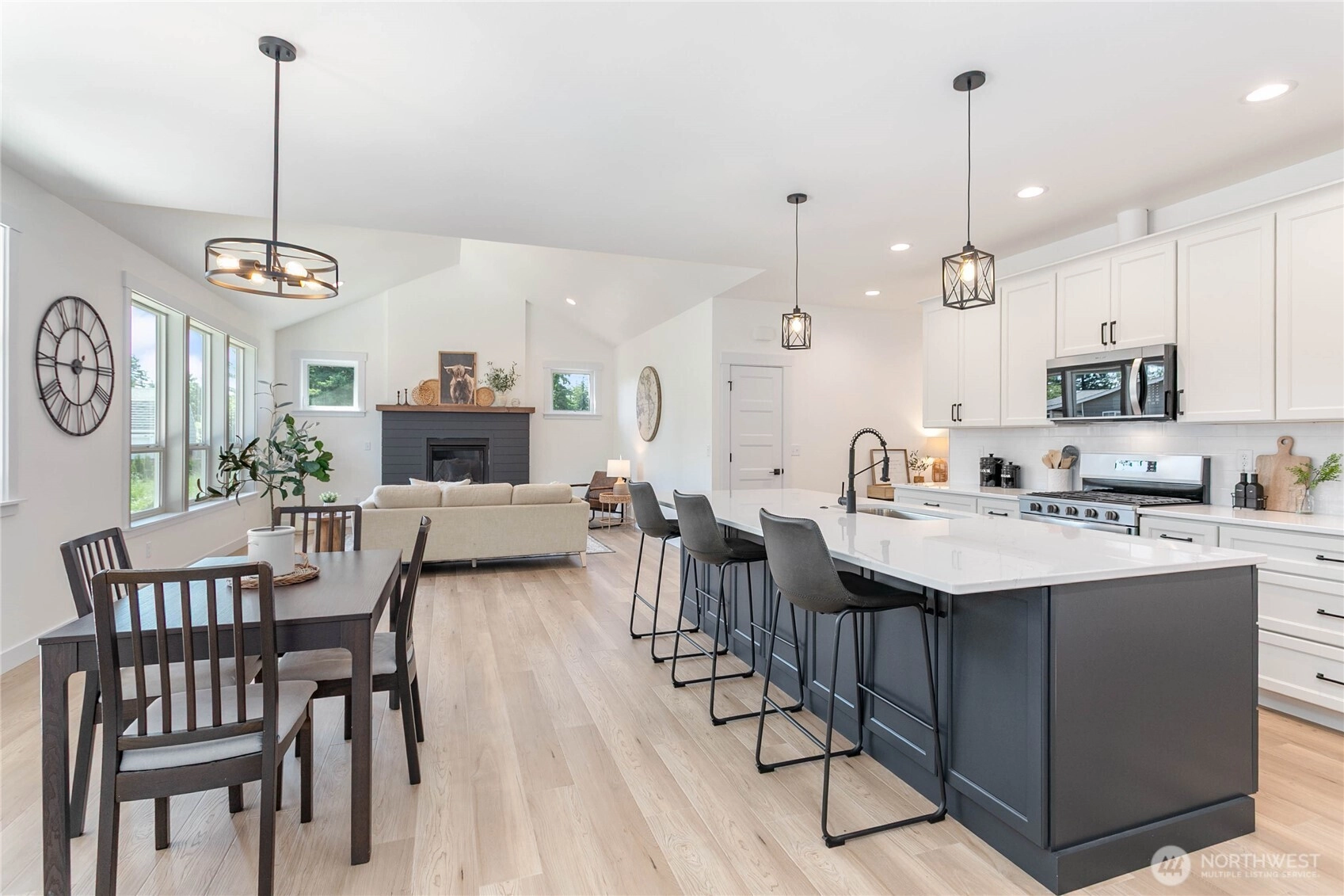 Beautiful new Pacific Edge Builders home w/ 4 bed & 2 bath on one level w/ large 3 car garage! Custom designed finishes including quartz countertops & LVP flooring throughout. Upgrades including gas fireplace & air conditioning. Large kitchen w/ custom cabinetry, tile backsplash and stainless steel appliance package. Open design concept with vaulted living room and functional floor plan. Primary bedroom with large walk in closet, bath with soaker tub & separate walk in shower. Large covered patio w/ gas hookup great for year round grilling and entertaining. Great location in a neighborhood of new homes with a short walk to Everson Elementary School and community park. Vacant and move in ready!