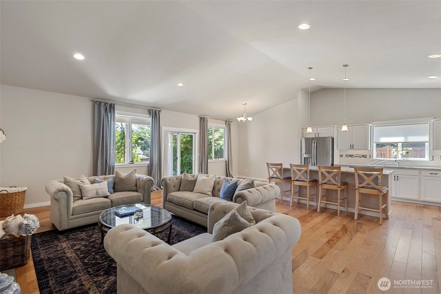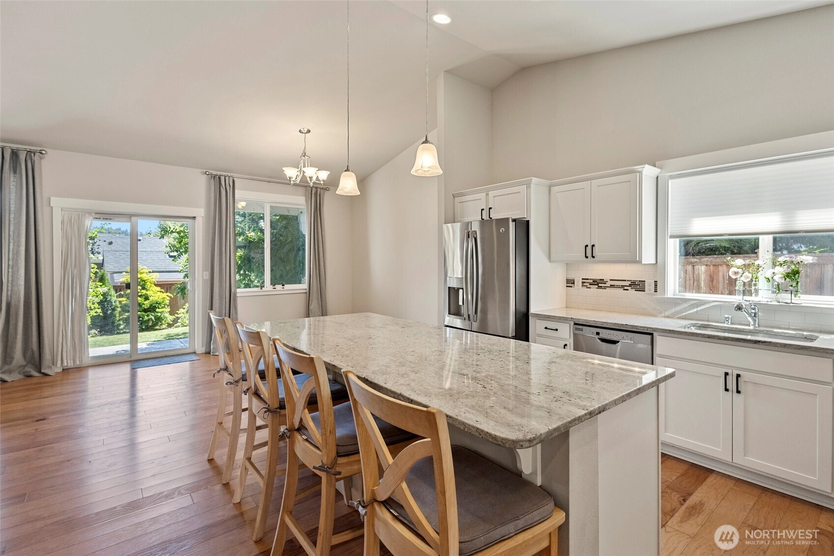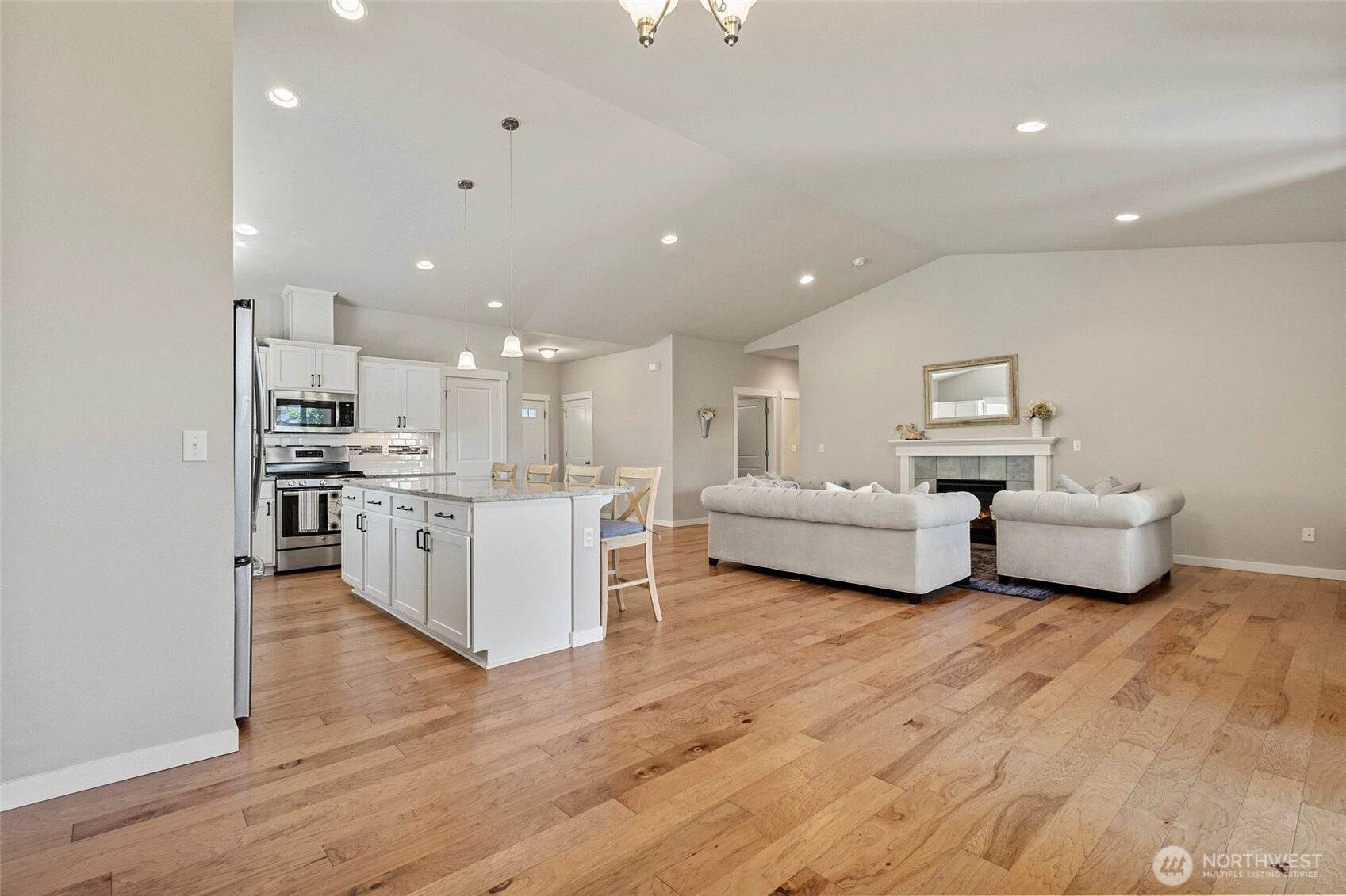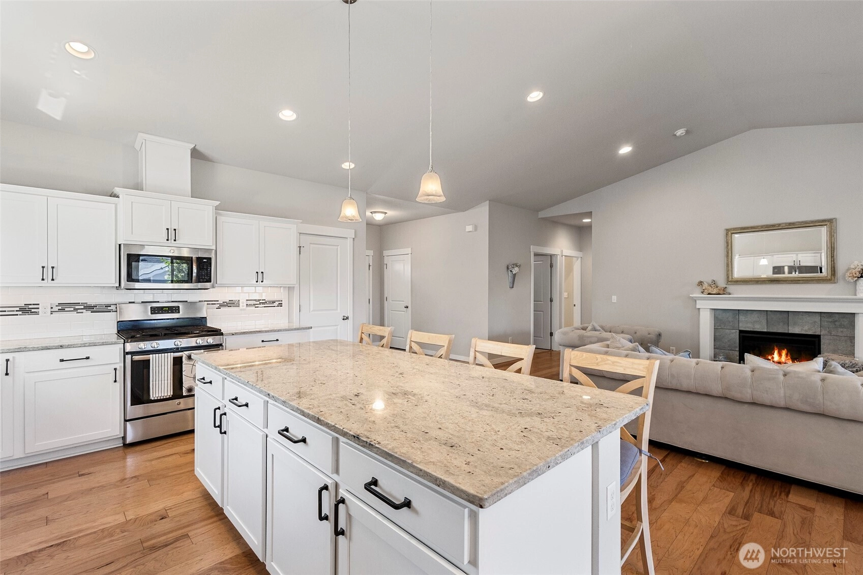 Well-maintained, one-owner rambler w/ NO-STAIR ENTRY in just over 2000 Sqr ft. The fourth bedroom offers flexibility as an office, bonus room and extra living space. Great room/open living concept, engineered hrdwd floors, cozy gas frplc and vaulted ceilings add plenty of natural light. The kitchen features a large island, granite ctps, white cabinets, SS appliances, 5-burner gas stove, pantry & ample dining area. Spacious primary suite w/ walk-in closet & private bath w/ double vanity. Enjoy a heat pump w/AC & a tankless water heater for year-round comfort. Oversized garage w/ utility sink. Level, fully fenced corner lot w/ mature landscape. Community trail & GREAT location to schools, medical, parks, pickleball crts & easy access to I-5.