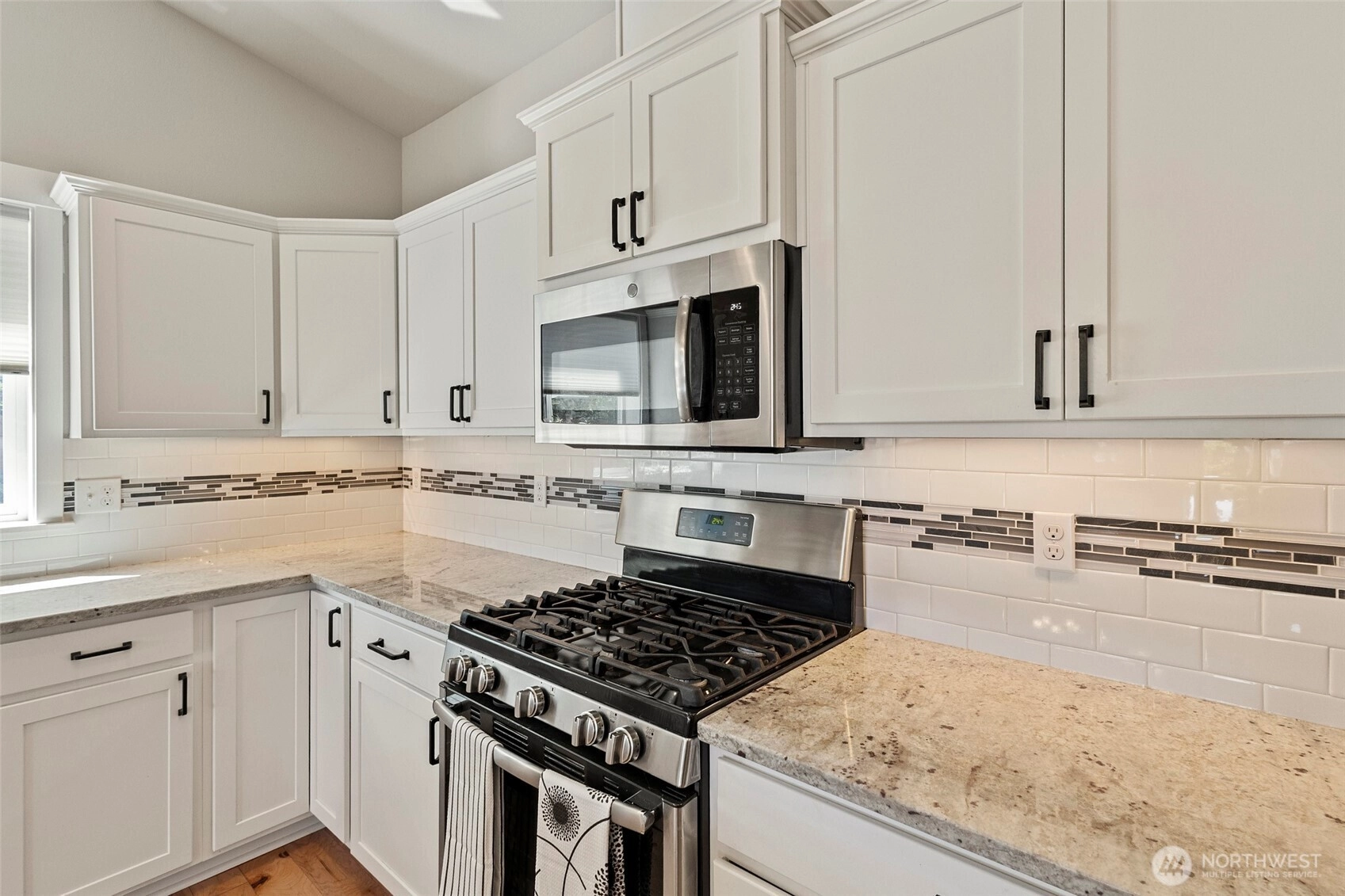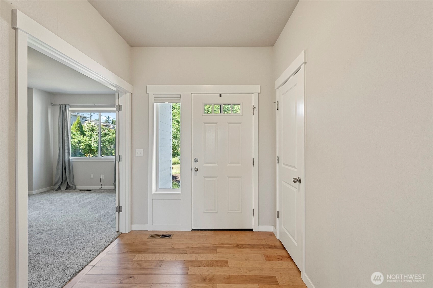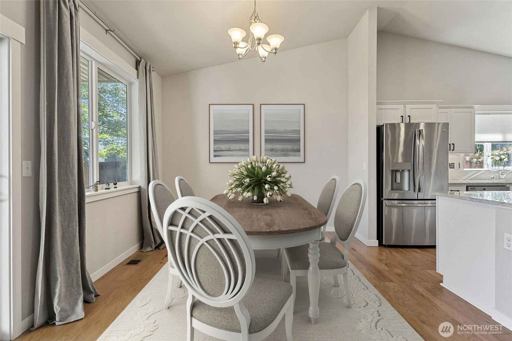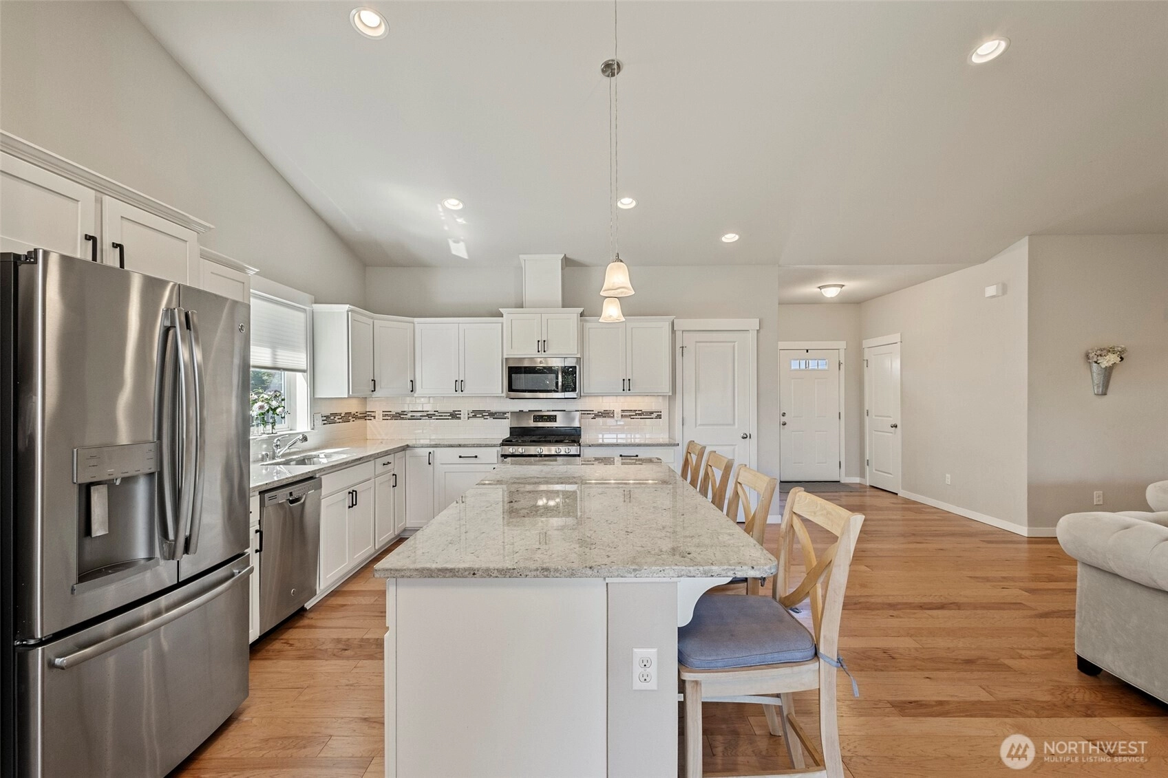 Well-maintained, one-owner rambler w/ NO-STAIR ENTRY in just over 2000 Sqr ft. The fourth bedroom offers flexibility as an office, bonus room and extra living space. Great room/open living concept, engineered hrdwd floors, cozy gas frplc and vaulted ceilings add plenty of natural light. The kitchen features a large island, granite ctps, white cabinets, SS appliances, 5-burner gas stove, pantry & ample dining area. Spacious primary suite w/ walk-in closet & private bath w/ double vanity. Enjoy a heat pump w/AC & a tankless water heater for year-round comfort. Oversized garage w/ utility sink. Level, fully fenced corner lot w/ mature landscape. Community trail & GREAT location to schools, medical, parks, pickleball crts & easy access to I-5.