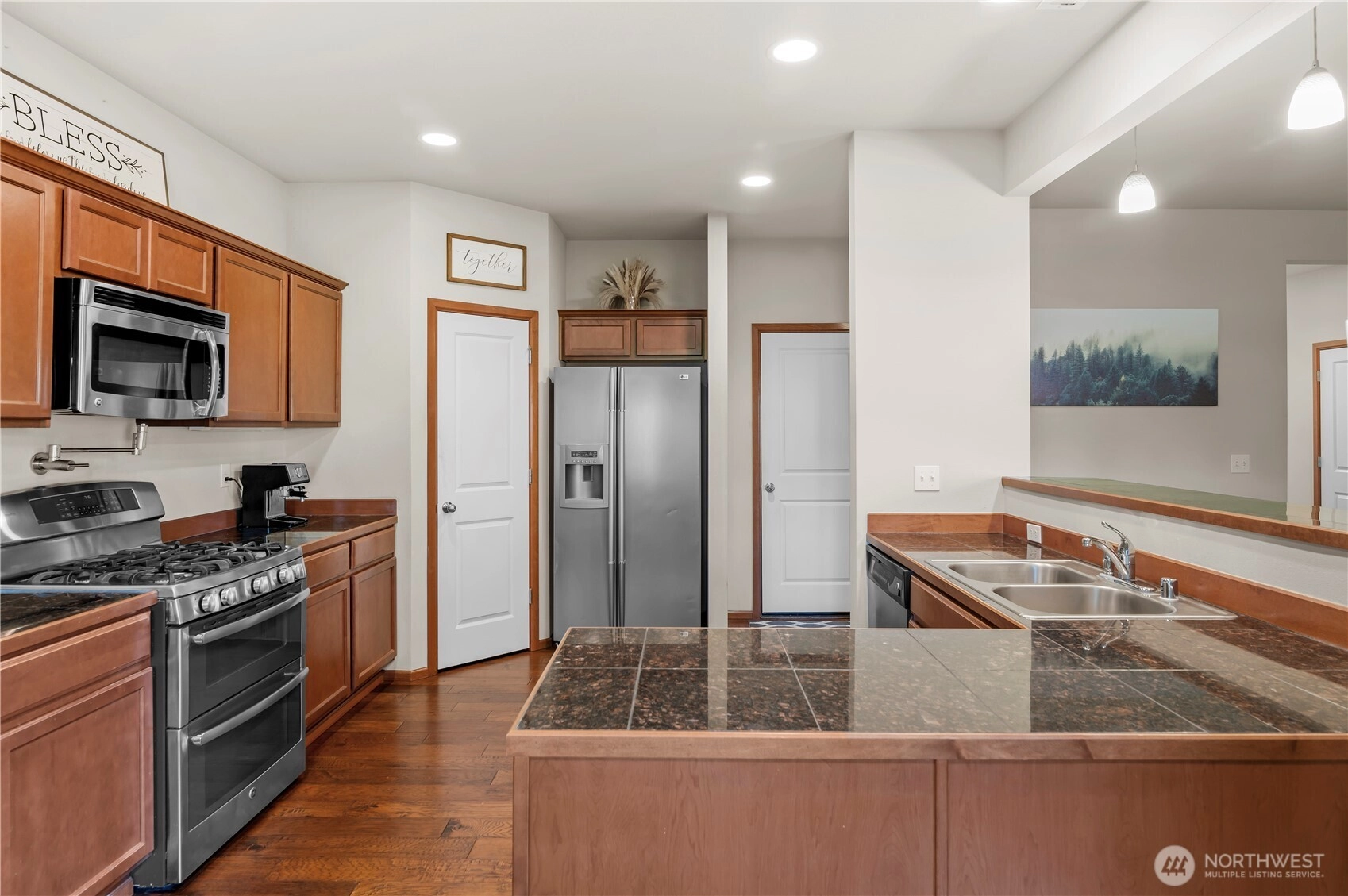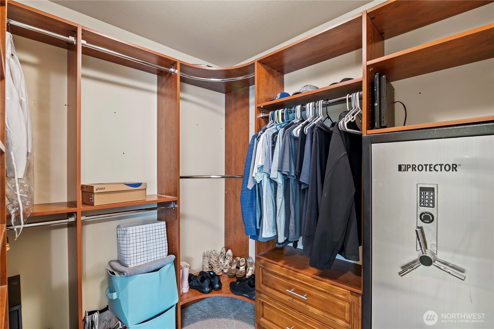 Beautifully maintained 3bed, 2.5bath residence, where quality & comfort come together seamlessly. Soaring ceilings & rich hardwood floors create an inviting atmosphere throughout the main living areas. The open-concept kitchen is a dream, featuring custom cabinetry, SS appliances, a convenient pot filler, pantry organizer, & breakfast bar—perfect for both everyday living & entertaining. Retreat to the spacious primary suite, complete w/ a luxurious ensuite bath, walk-in closet, & built-in safe for added peace of mind. Enjoy the outdoors in your private, fully fenced backyard w/ a covered patio ideal for relaxing or hosting guests. Prime location just minutes from shopping, dining, & easy freeway access. This exceptional home is a must-see!