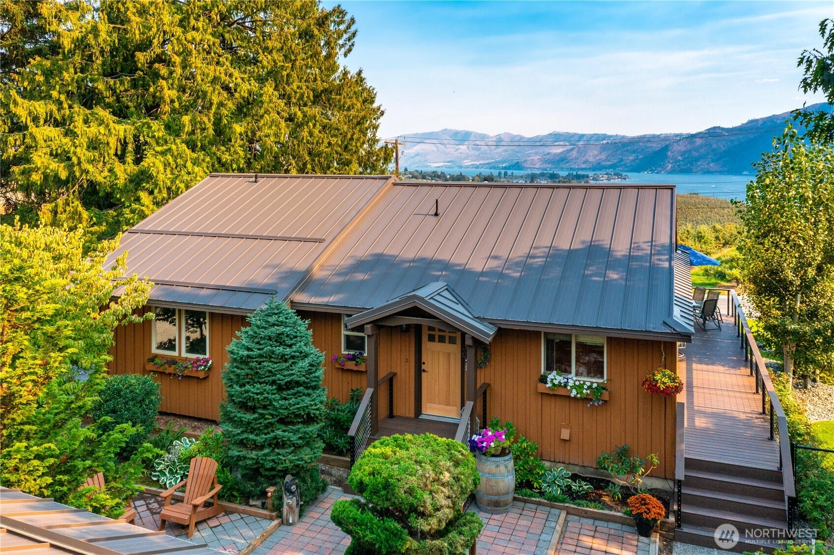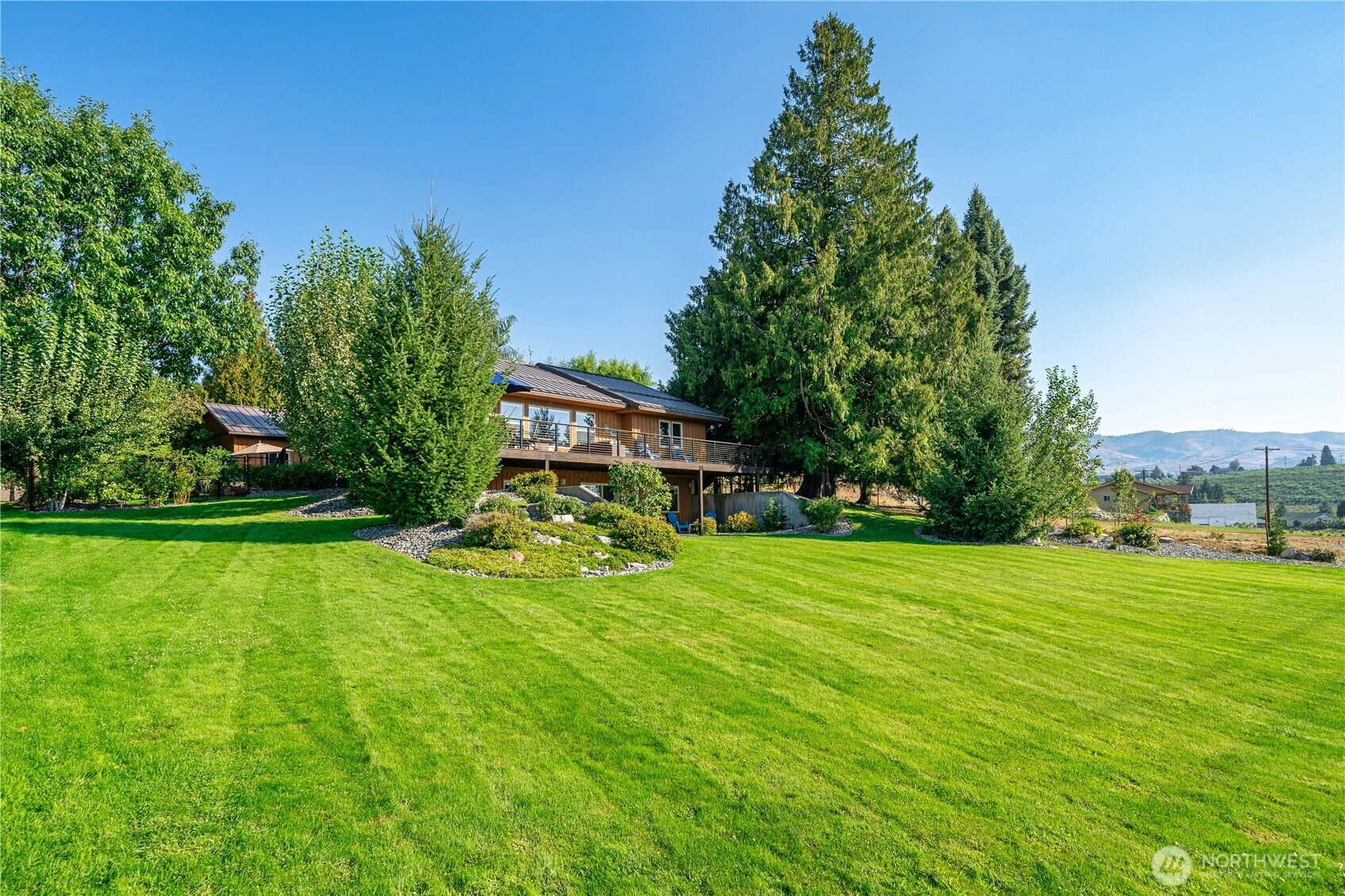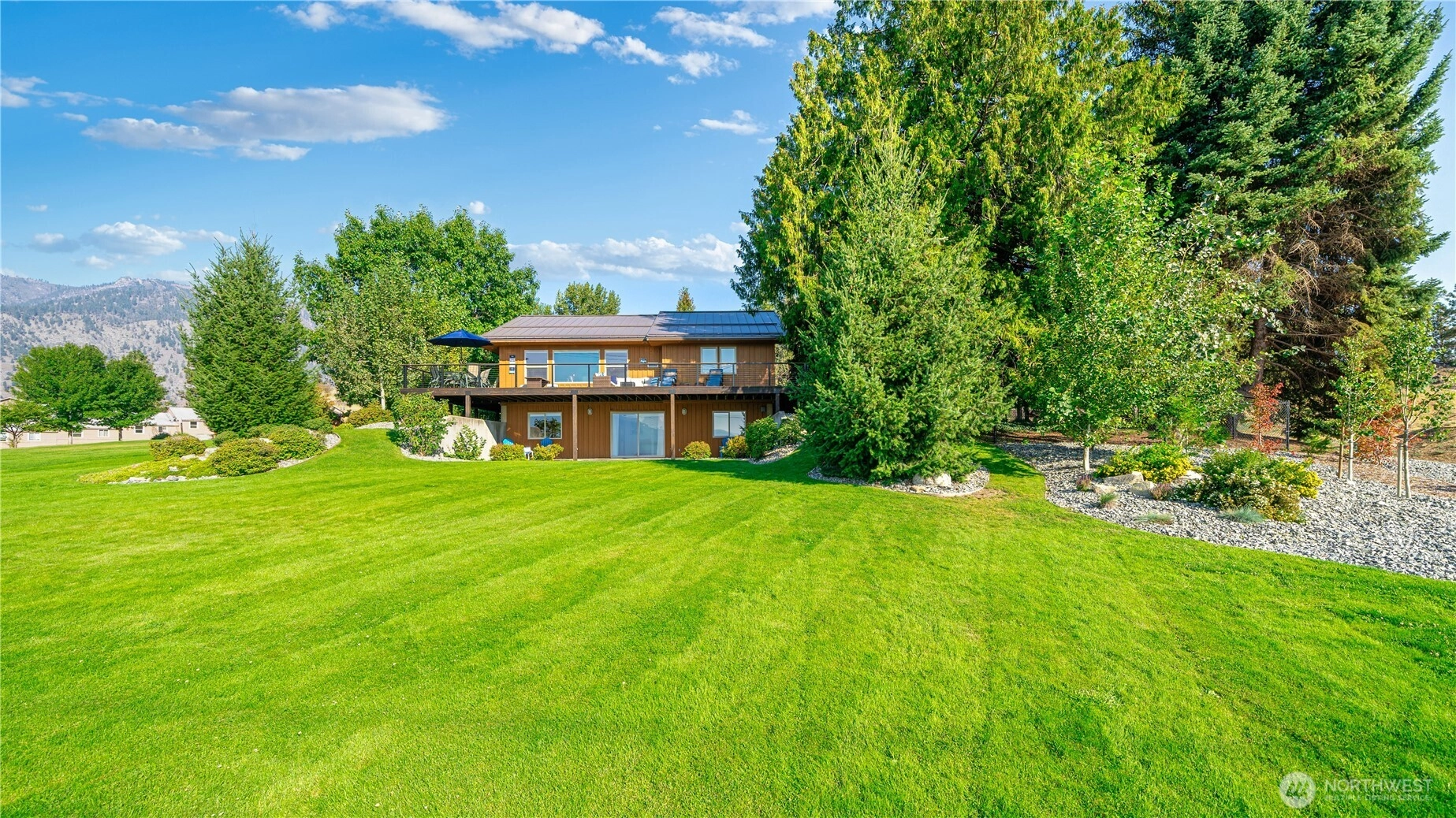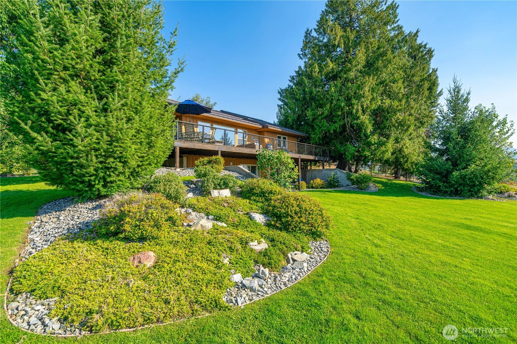 This Lake Chelan view home features a gorgeous park-like setting within a fully-fenced half acre lot - all just 5 minutes from Downtown Manson. With 4 bedrooms & 2.75 baths, it features a 52' wraparound deck, reclaimed wood timber frame & a detached 2-car garage/shop with 50-amp RV/boat parking. The main level includes a vaulted great room, kitchen, primary suite, guest room/office & full bath. Downstairs offers 2 more bedrooms, den, bonus room ideal for a gym or wine storage & a patio with hot tub. Mature landscaping creates a private, fairytale-like setting offering multiple outdoor entertaining areas. Surrounded on 3 sides by HOA-maintained open space, this beautiful property also includes access to the Sienna community clubhouse.