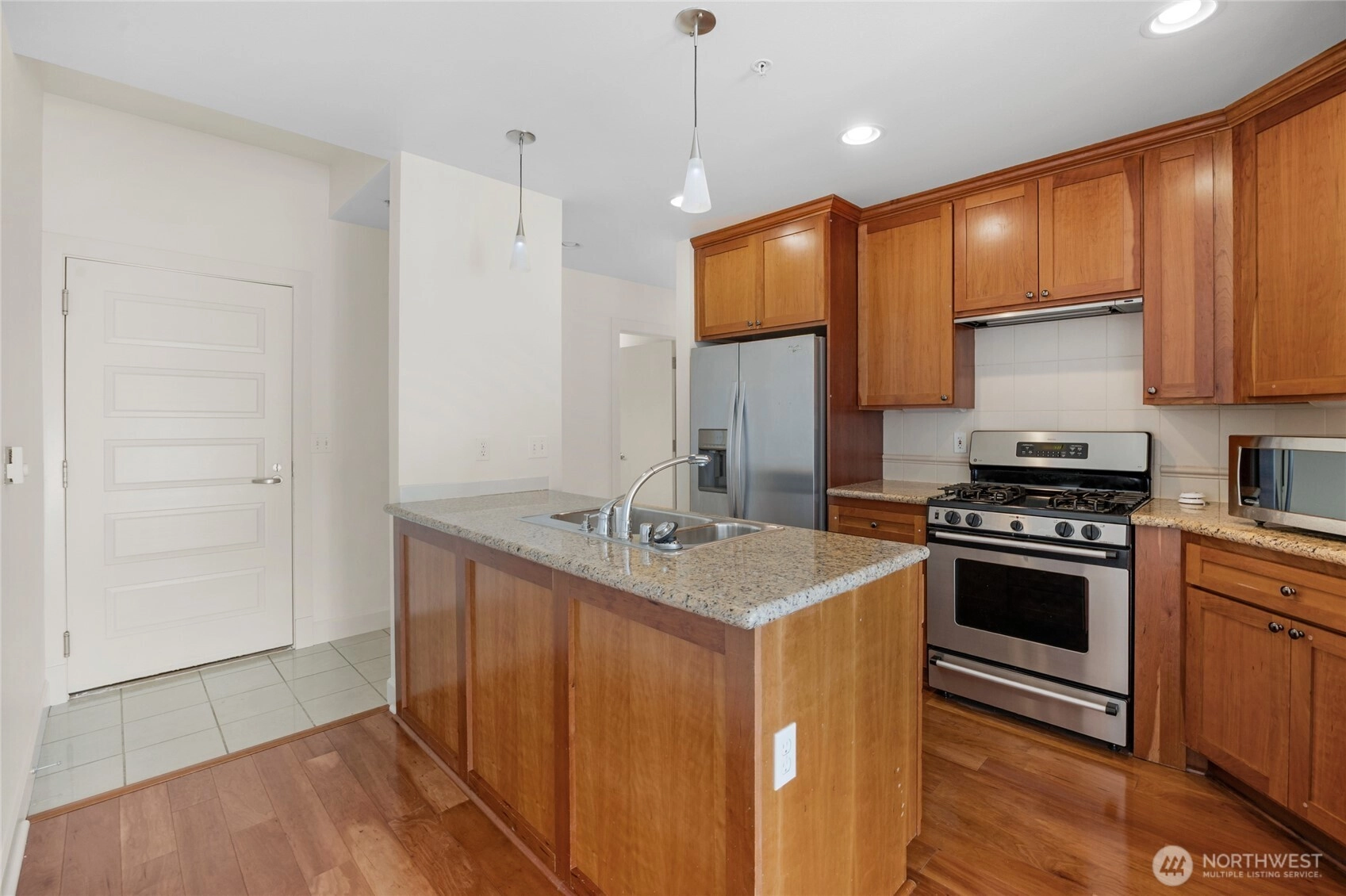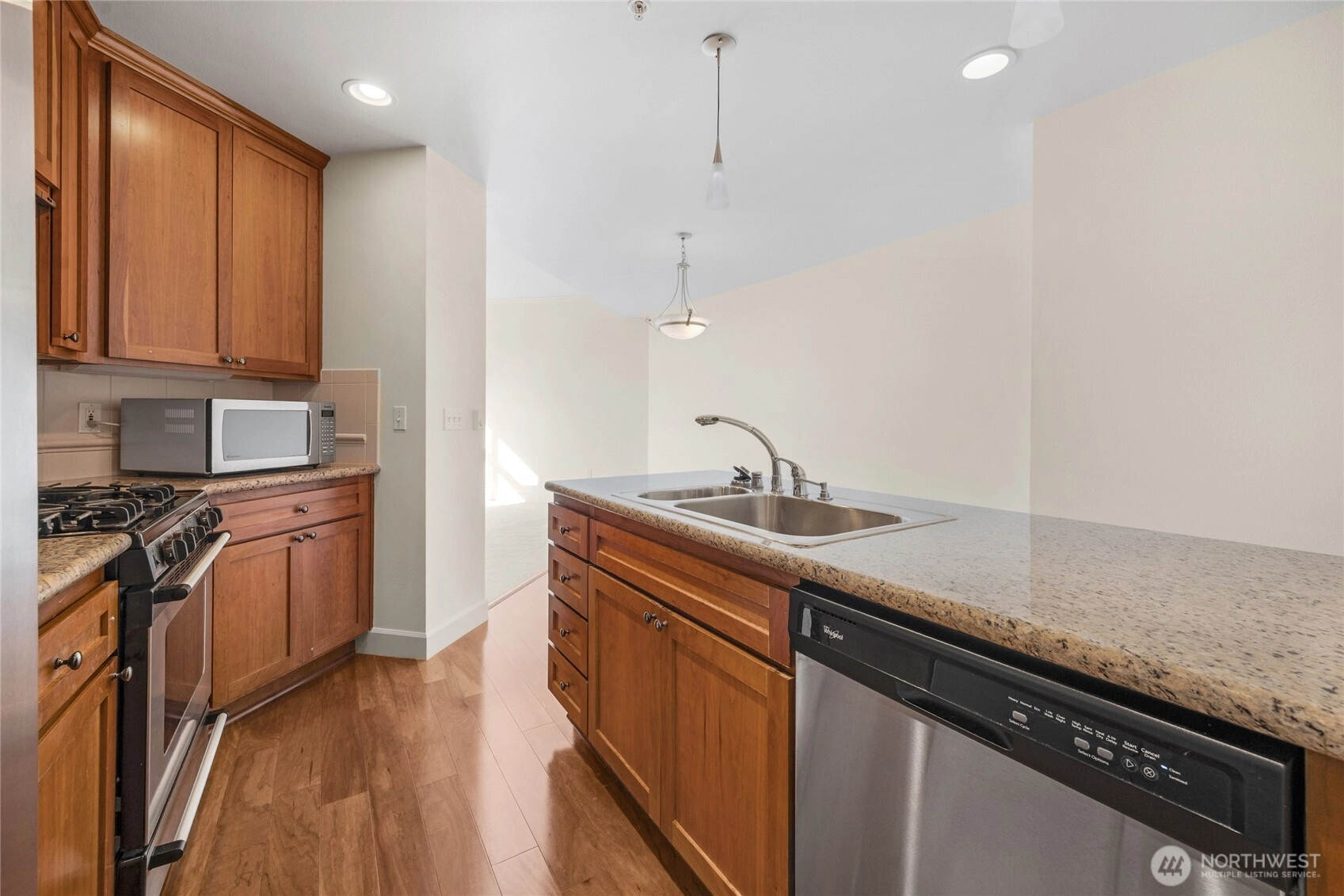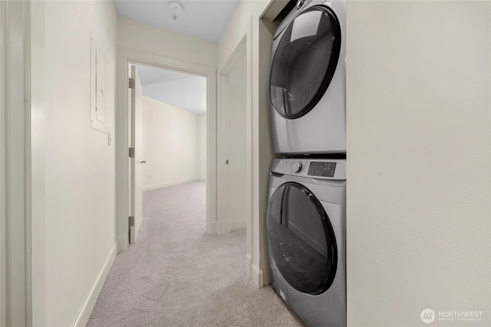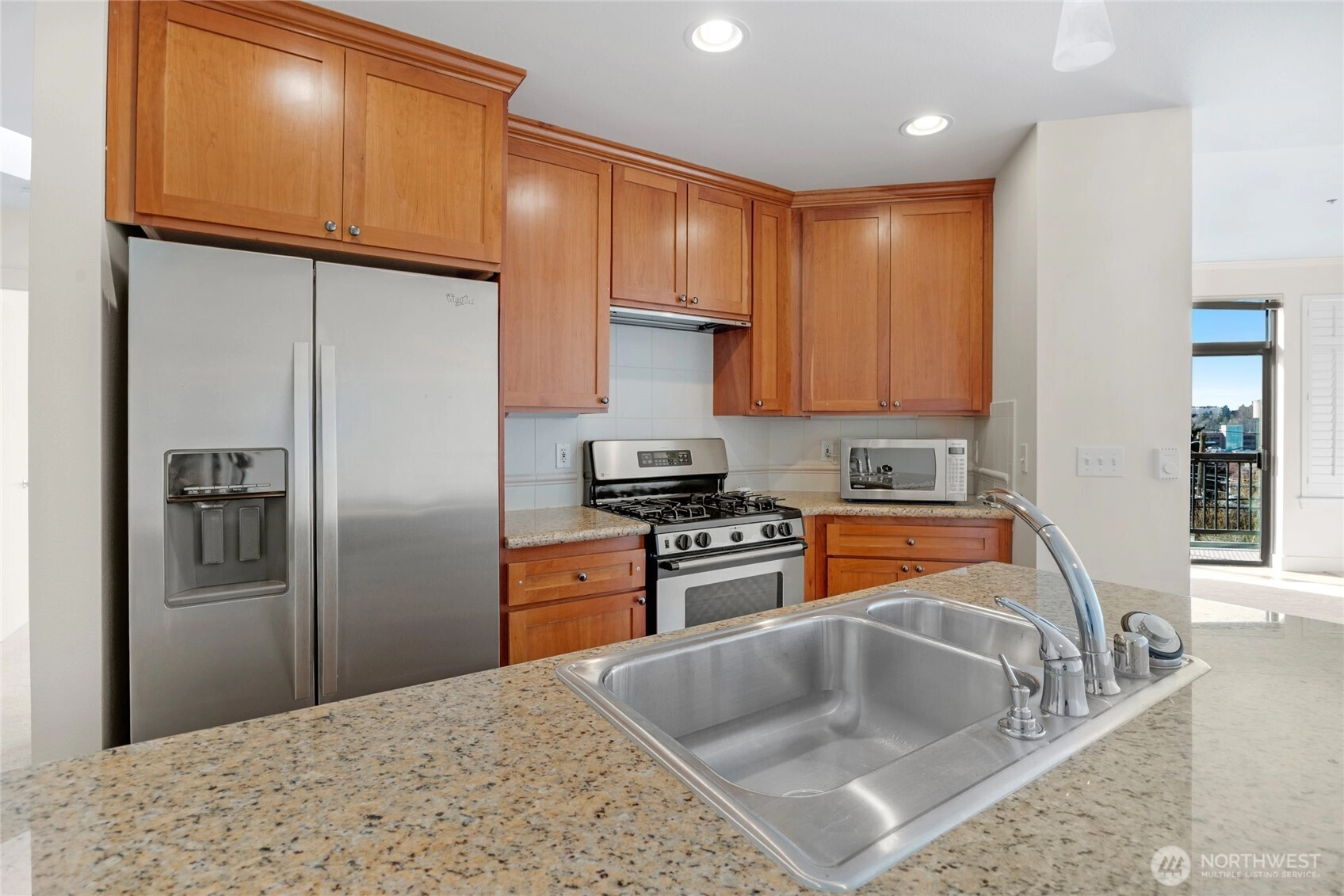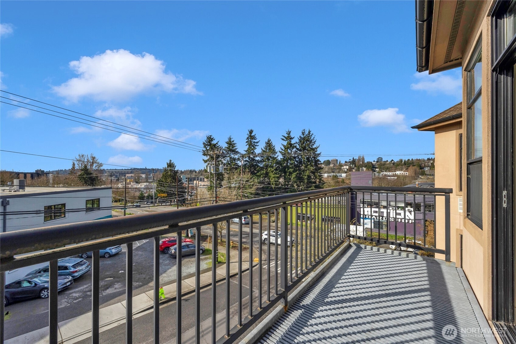 Excellent location! Steps from all that University Village has to offer. One short block to the Burke Gilman Trail. Light Rail connection is located just down the road at Husky/Alaska Stadium. Top floor light and bright corner unit with skylight, 2 bedrooms, 2 baths (3/4 off primary bedroom), with new carpet and paint, gas cooking and fireplace, balcony off living room with view, spacious kitchen w/eating area, ample cabinet space and island. Secure building with elevator, secure dedicated parking, and seperate storage unit in garage. HOA Dues Include: Common Area Maintenance, Earthquake Ins., Garbage, Lawn Service, Sewer, Snow Removal, & Water! All appliances are included. Don't miss this terrific unit in a fantastic location!