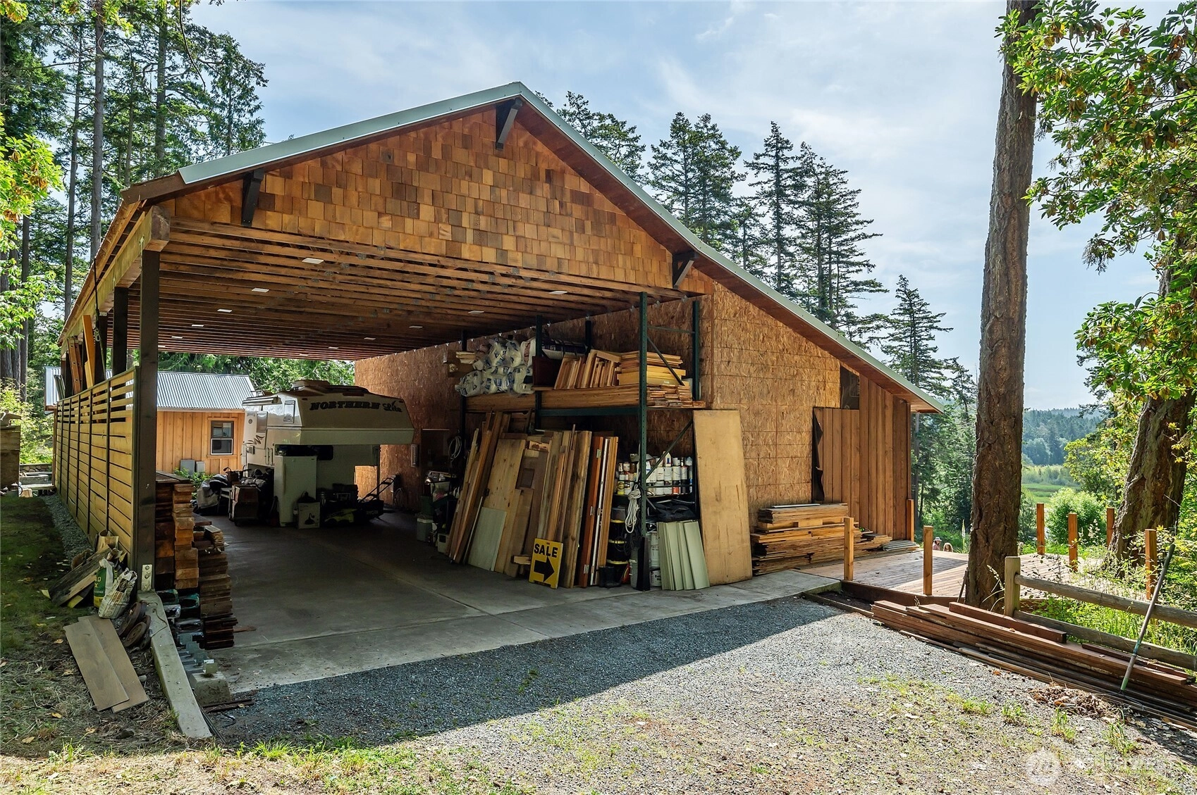Live and glamp in comfort and style on Lopez Island: carport/RV shelter/shop with three studio spaces on 0.72 acres. The main building features a washer/dryer, utility area, half bath, enclosed shop space, two RV hookups, and an attached studio w/a 3/4 bath, polished concrete floors, pine paneling, and a territorial view. Two more detached studio cabins, with modern rustic vibes, are privately situated amongst landscaped beds & paths. The diverse, mature garden is a peaceful haven throughout the seasons. Enjoy this sweet, southend spot as is, or build upon the infrastructure that has been put in place for a main residence: shared well, 4 bedroom septic system, cleared and level build site. Adjacent parcel also for sale (NWMLS #2394243).