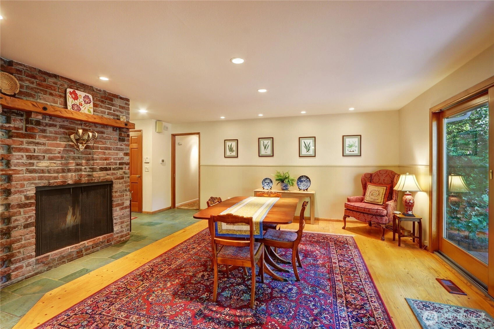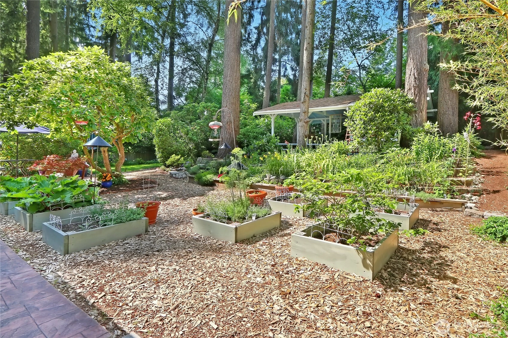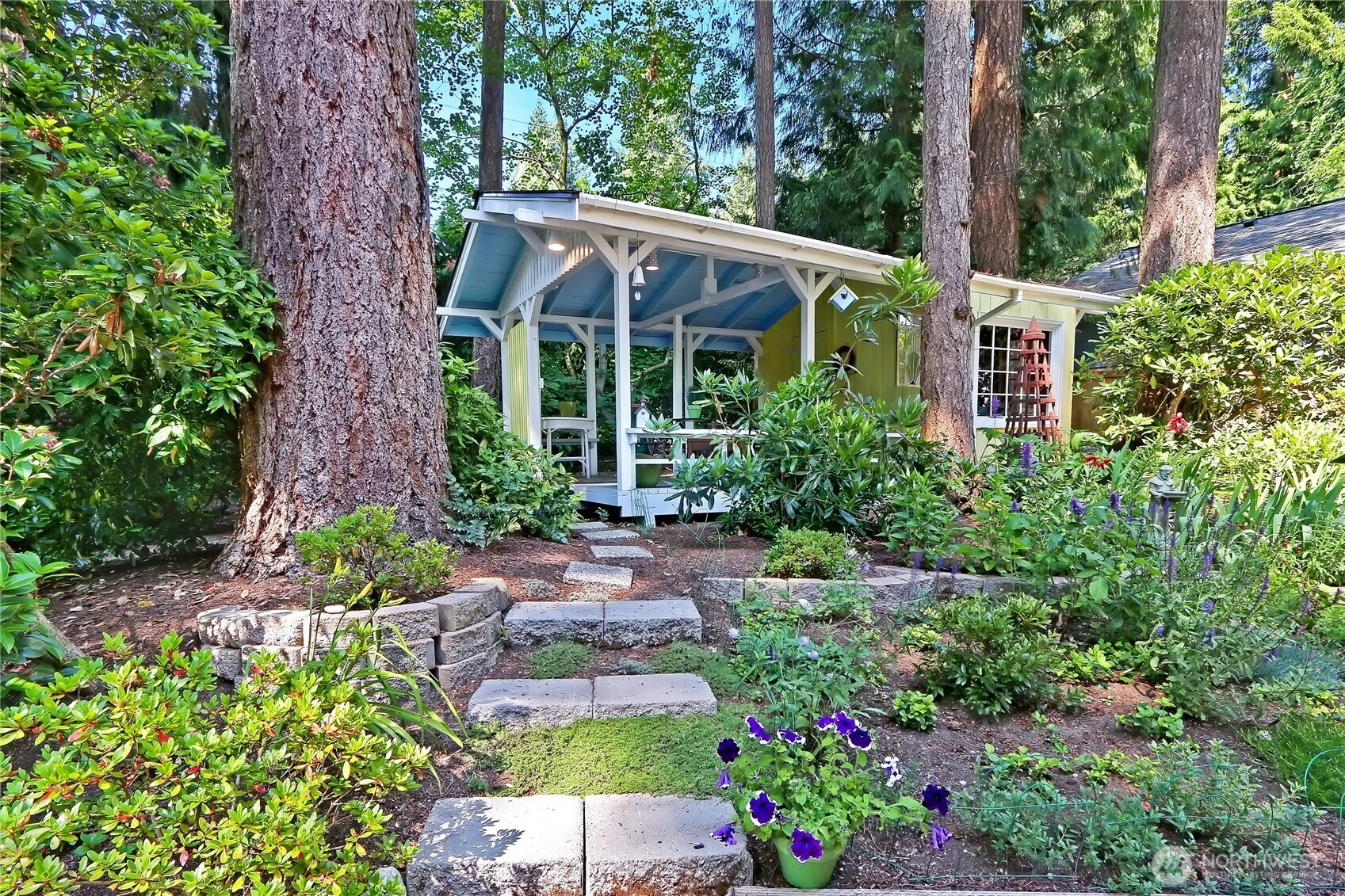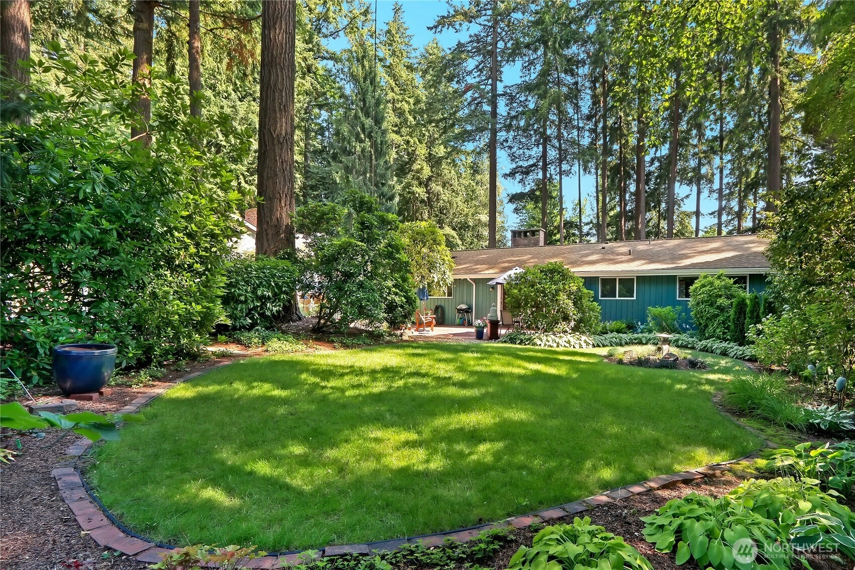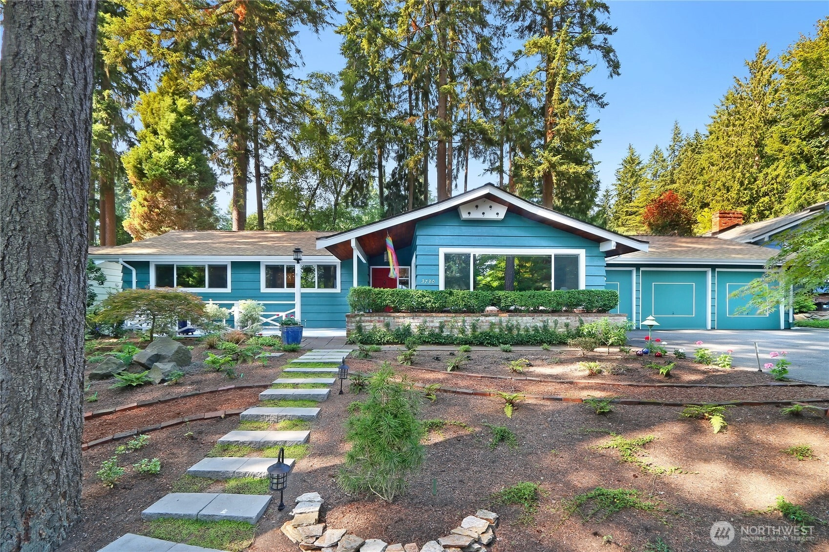 Coveted Lake Forest Park! Classic mid-century rambler sited on serene 12,500+ sq ft lot. Gracious one level living with 3 bedrooms, 3 baths, huge 3 car garage (4th bedroom and more potential). Serene end of cul de sac location. Extraordinary grounds are your own private arboretum, including stamped concrete patio and a garden house with covered deck for year round enjoyment. Large living room with paneled walls, fireplace, new picture windows. Bonus room with second fireplace. Eat in kitchen with handy 3/4 bath off it; between garage and garden. Primary bedroom with private bath. Stunning original slate entry and solid wood doors throughout. Lovingly cared for and upgraded over the years with recent roof, windows, flooring, furnace, + more