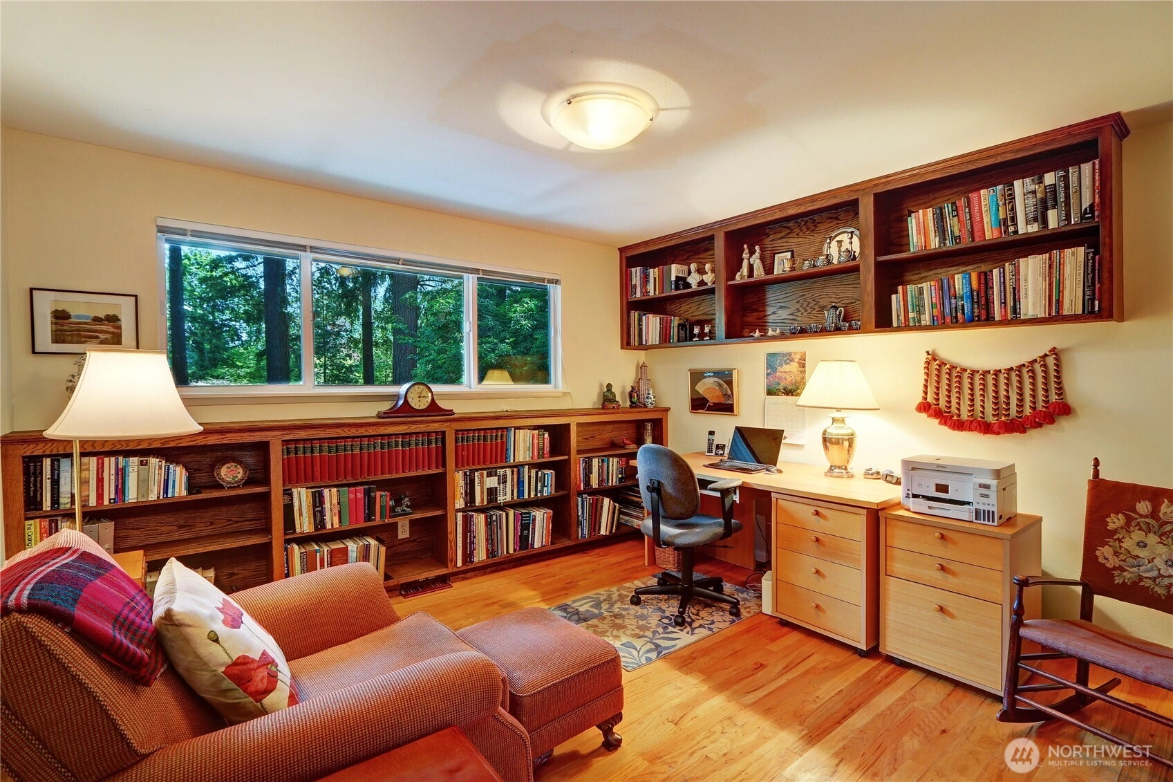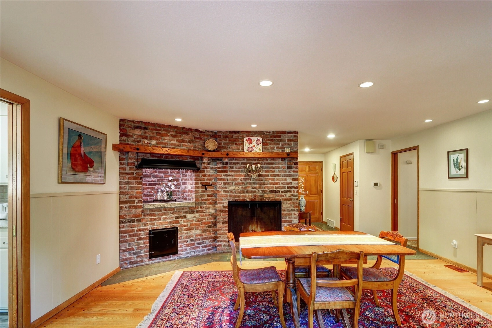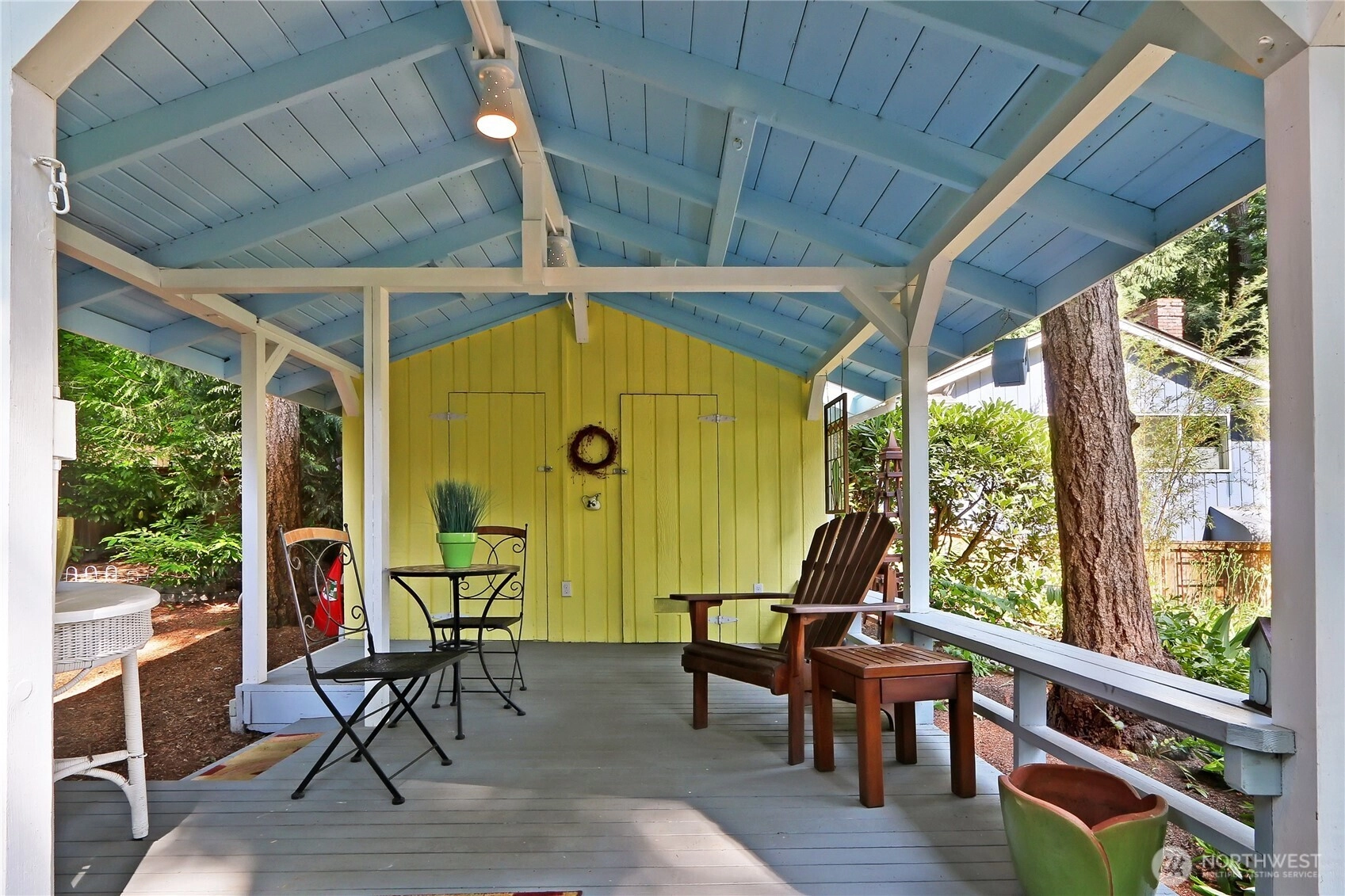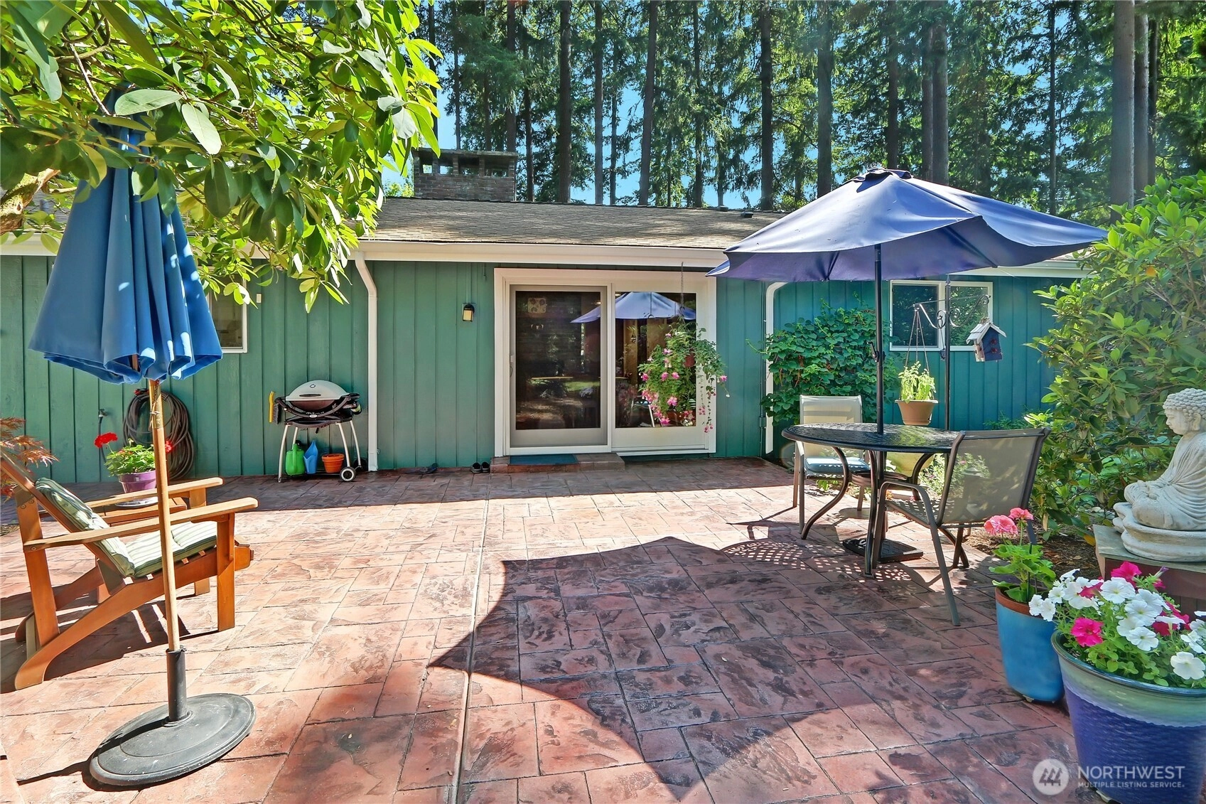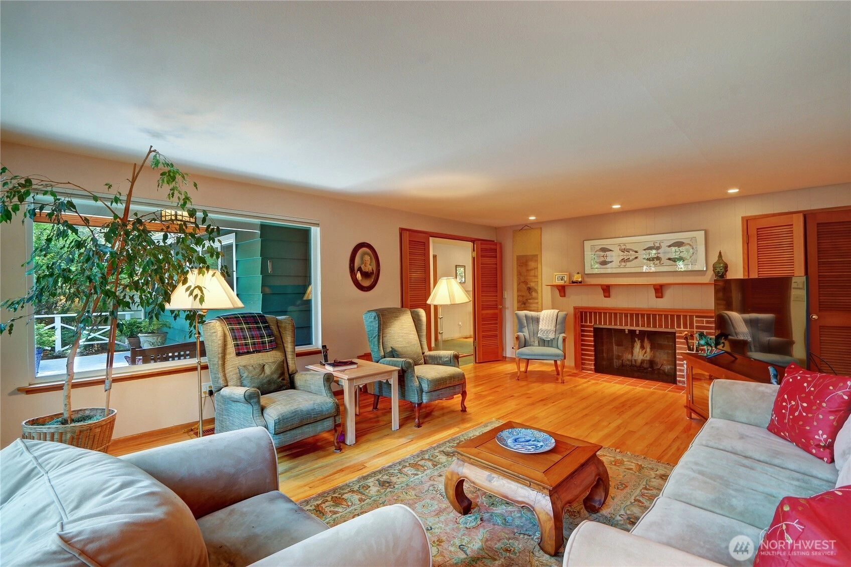 Coveted Lake Forest Park! Classic mid-century rambler sited on serene 12,500+ sq ft lot. Gracious one level living with 3 bedrooms, 3 baths, huge 3 car garage (4th bedroom and more potential). Serene end of cul de sac location. Extraordinary grounds are your own private arboretum, including stamped concrete patio and a garden house with covered deck for year round enjoyment. Large living room with paneled walls, fireplace, new picture windows. Bonus room with second fireplace. Eat in kitchen with handy 3/4 bath off it; between garage and garden. Primary bedroom with private bath. Stunning original slate entry and solid wood doors throughout. Lovingly cared for and upgraded over the years with recent roof, windows, flooring, furnace, + more