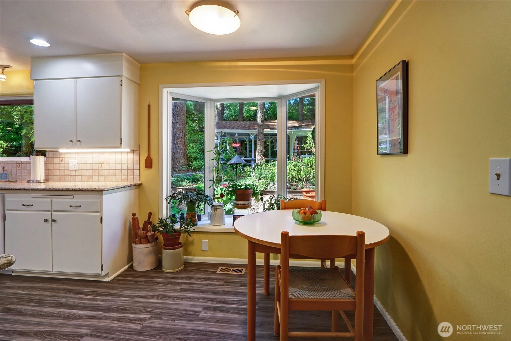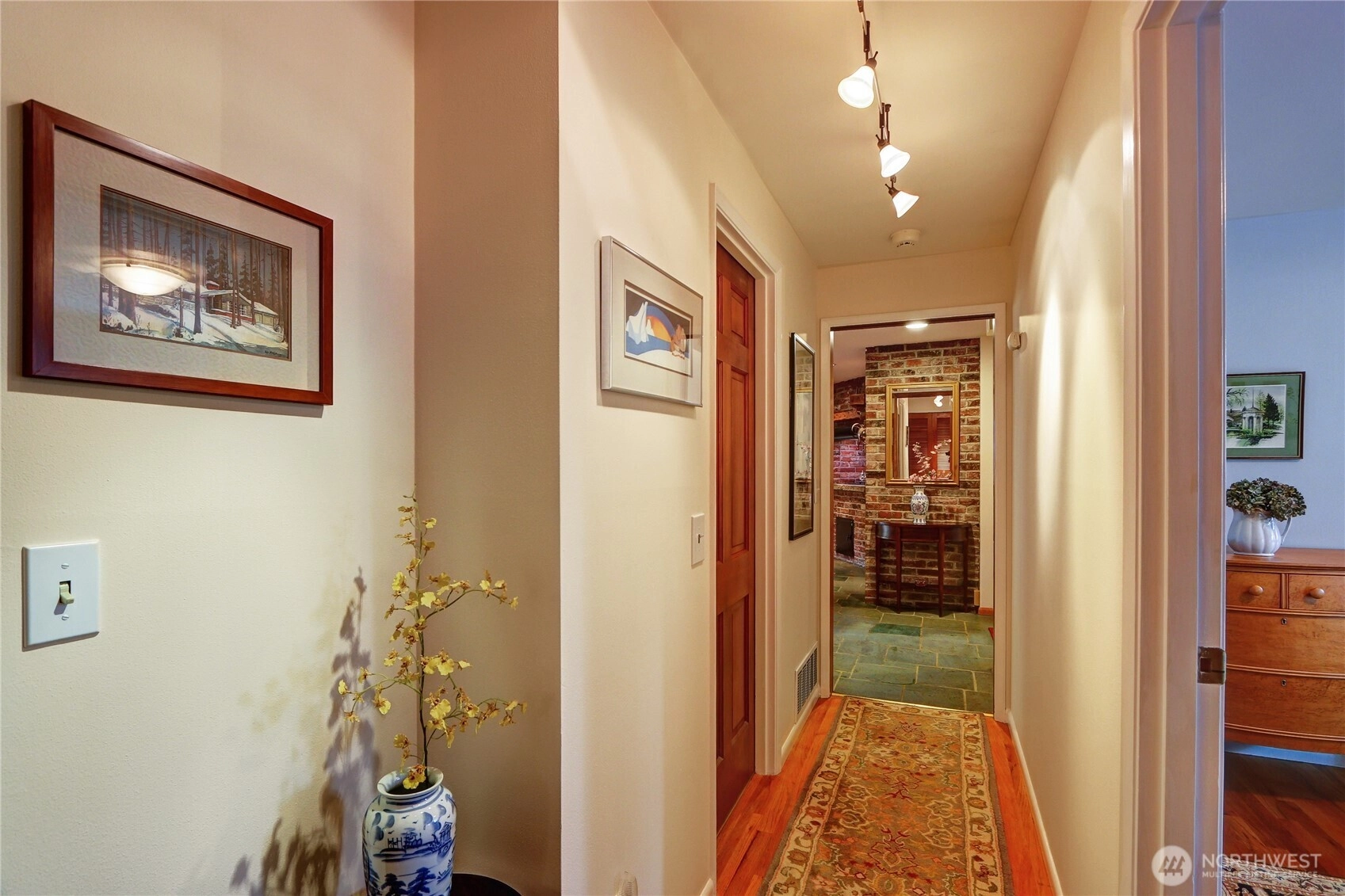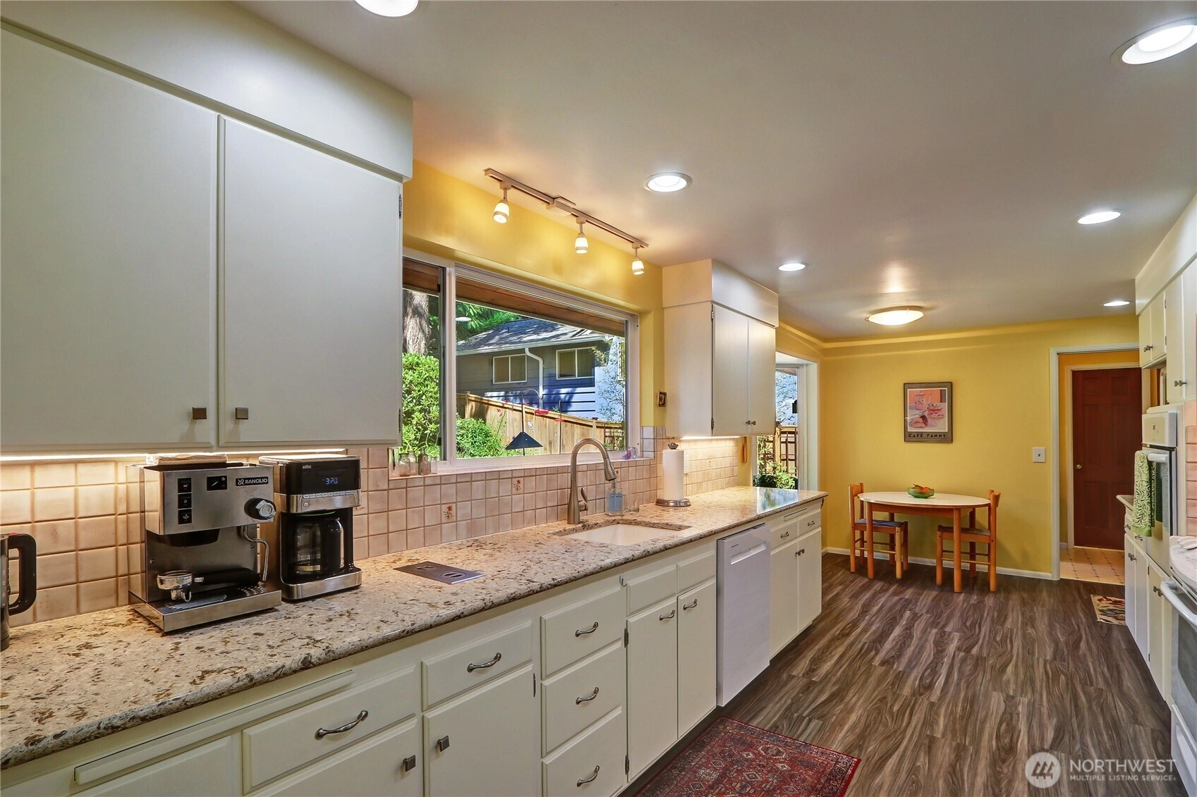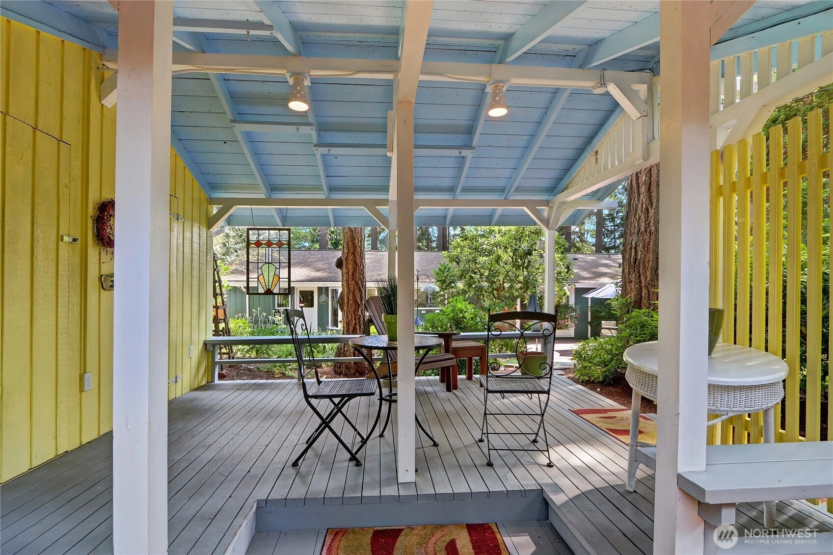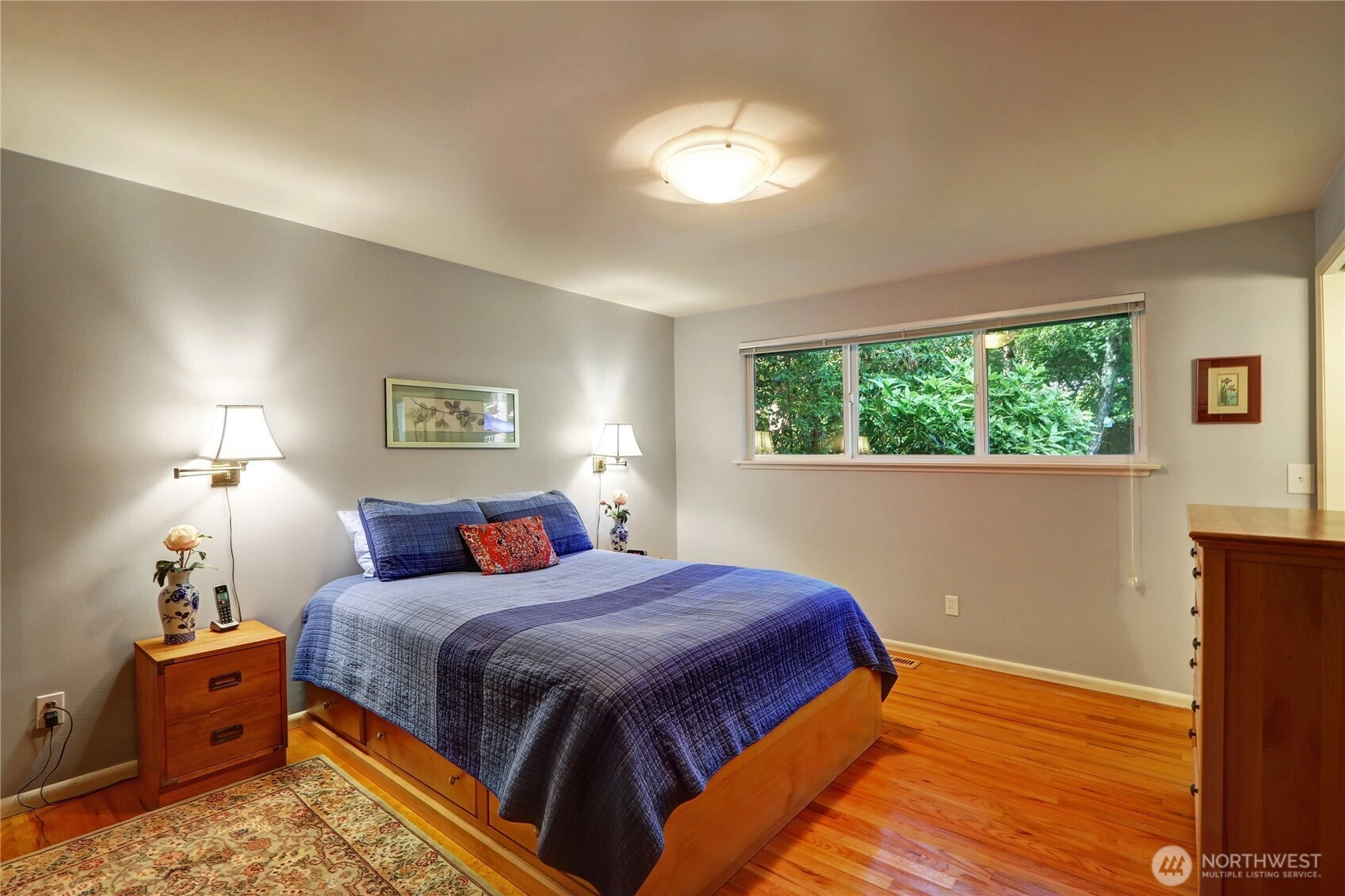Coveted Lake Forest Park! Classic mid-century rambler sited on serene 12,500+ sq ft lot. Gracious one level living with 3 bedrooms, 3 baths, huge 3 car garage (4th bedroom and more potential). Serene end of cul de sac location. Extraordinary grounds are your own private arboretum, including stamped concrete patio and a garden house with covered deck for year round enjoyment. Large living room with paneled walls, fireplace, new picture windows. Bonus room with second fireplace. Eat in kitchen with handy 3/4 bath off it; between garage and garden. Primary bedroom with private bath. Stunning original slate entry and solid wood doors throughout. Lovingly cared for and upgraded over the years with recent roof, windows, flooring, furnace, + more