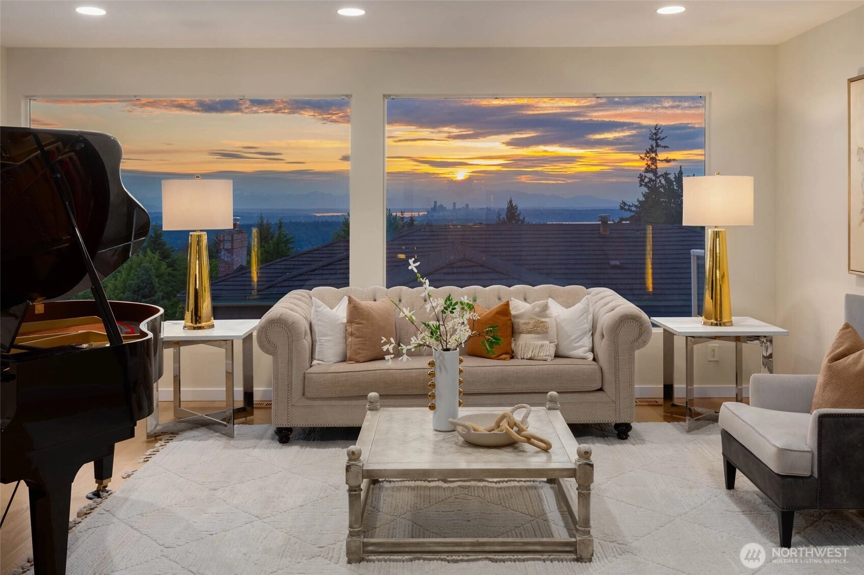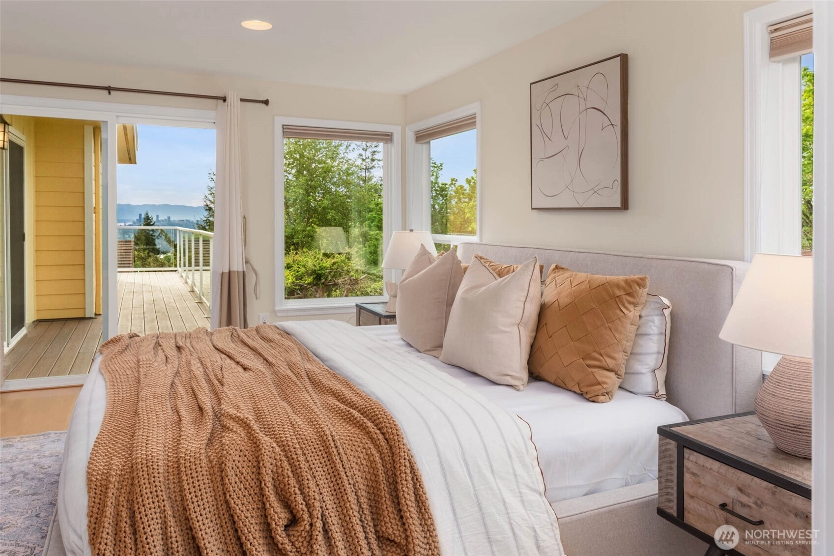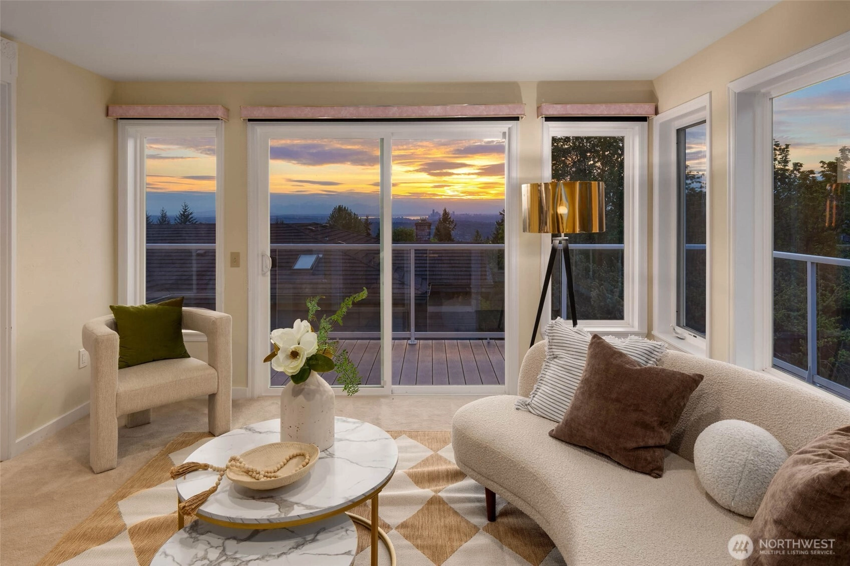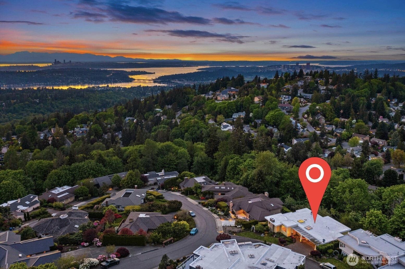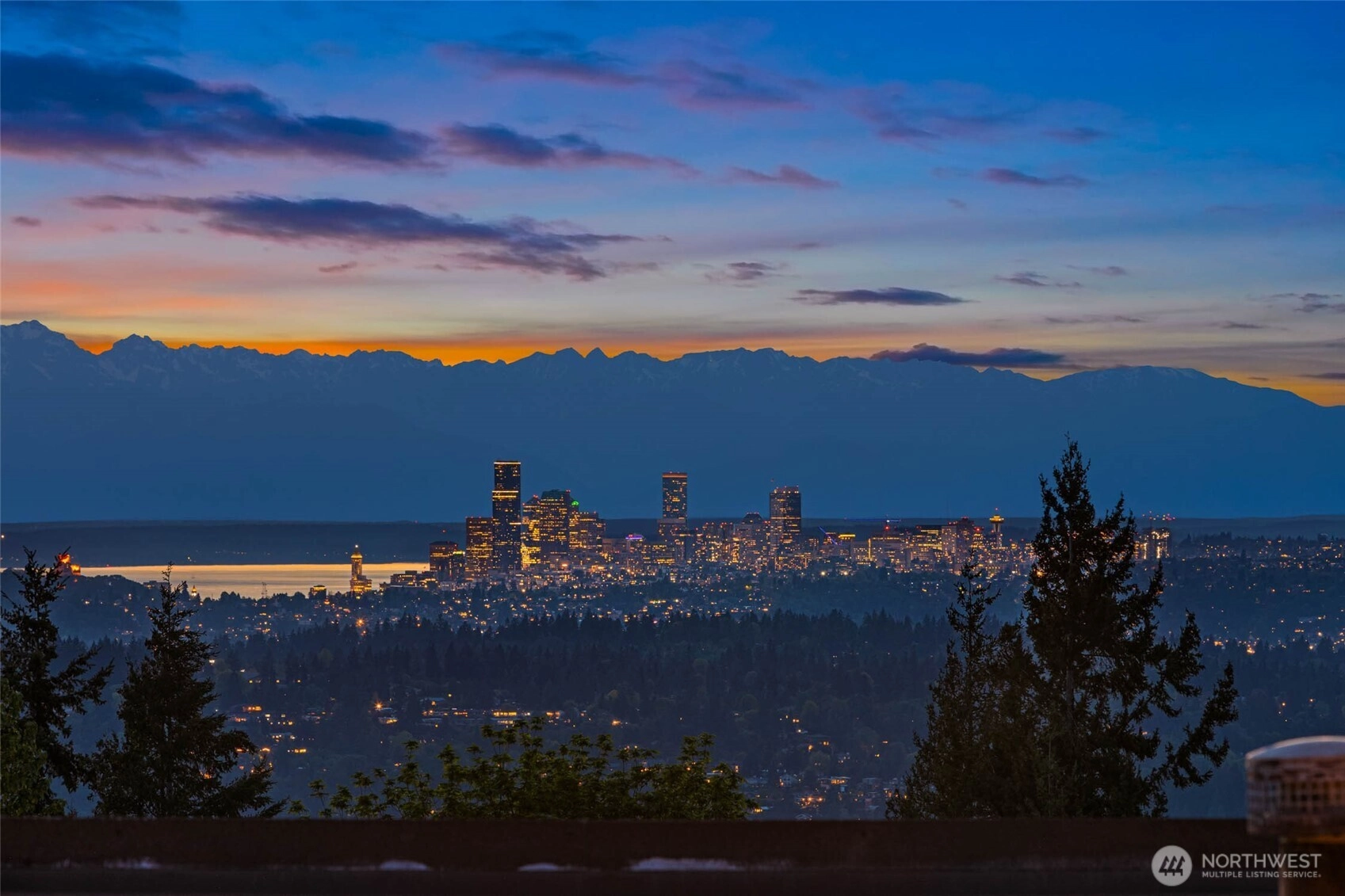 Stunning 5 bed, 3.5 bath updated home in the heart of Somerset with breathtaking Water, Mountain & City views! Nestled in a quiet neighborhood, this light-filled gem features big windows, skylights, and an expansive deck with Trex materials for easy maintenance. Main level boasts a grand foyer, spacious living/family rooms, gourmet kitchen, and a view-facing primary suite. Enjoy the convenience of an office/flex room on the main. Downstairs offers 4 bedrooms, bonus/gym, 2nd office, and a high-end media room. Luxurious steam shower & massage tub for ultimate relaxation. Lush landscaping backs to greenbelt, with a swing set and level backyard Top-rated Somerset schools, minutes to parks, Factoria, and Bellevue DT.