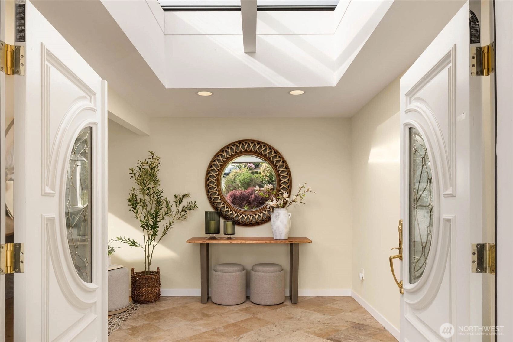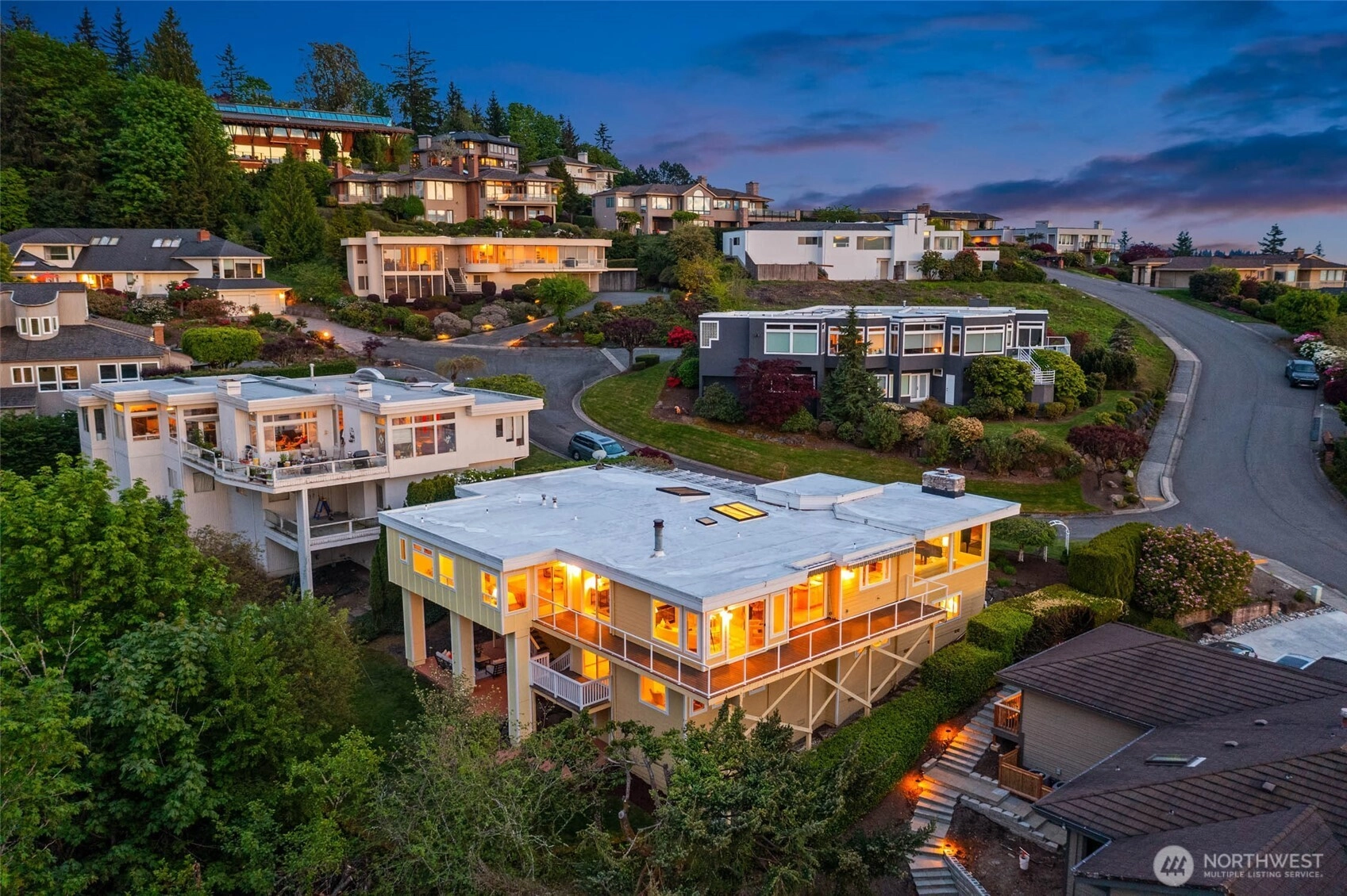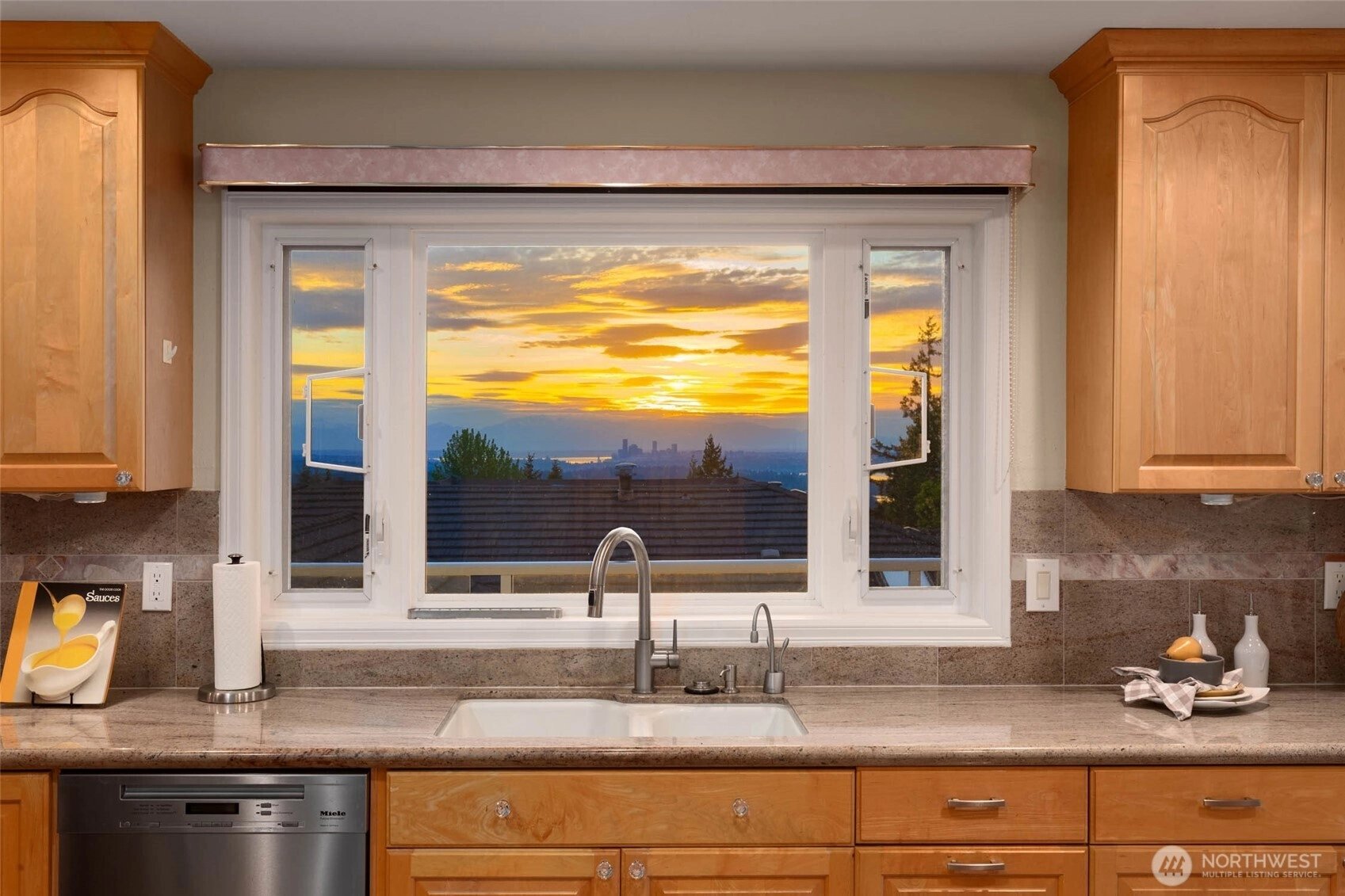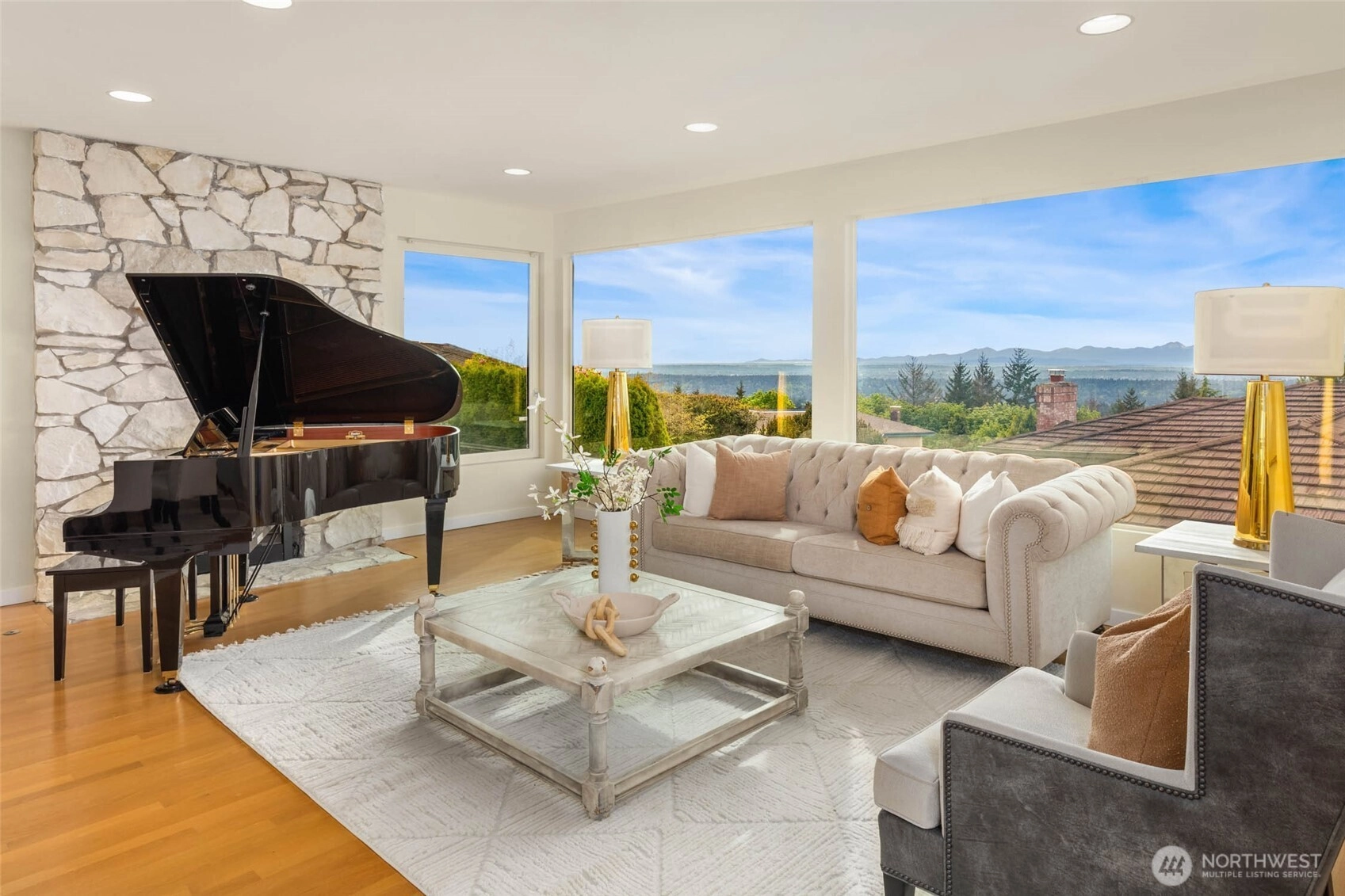 Stunning 5 bed, 3.5 bath updated home in the heart of Somerset with breathtaking Water, Mountain & City views! Nestled in a quiet neighborhood, this light-filled gem features big windows, skylights, and an expansive deck with Trex materials for easy maintenance. Main level boasts a grand foyer, spacious living/family rooms, gourmet kitchen, and a view-facing primary suite. Enjoy the convenience of an office/flex room on the main. Downstairs offers 4 bedrooms, bonus/gym, 2nd office, and a high-end media room. Luxurious steam shower & massage tub for ultimate relaxation. Lush landscaping backs to greenbelt, with a swing set and level backyard Top-rated Somerset schools, minutes to parks, Factoria, and Bellevue DT.