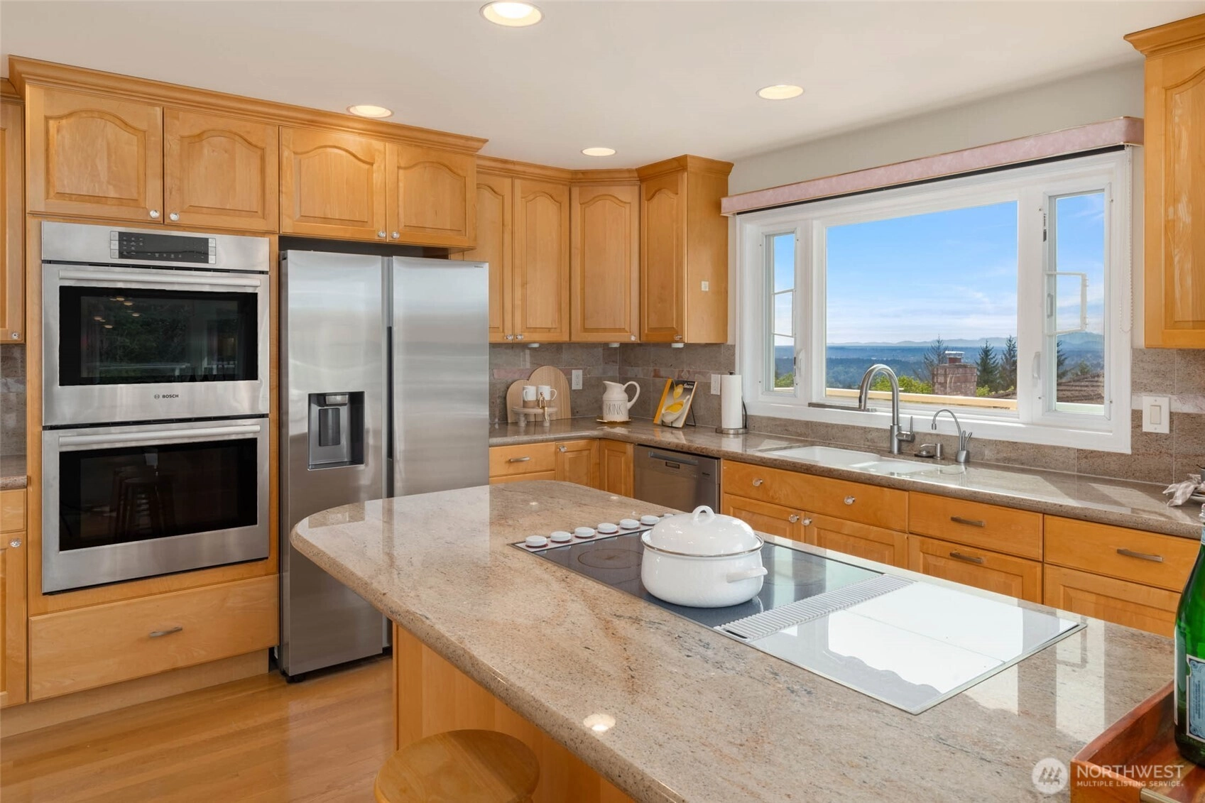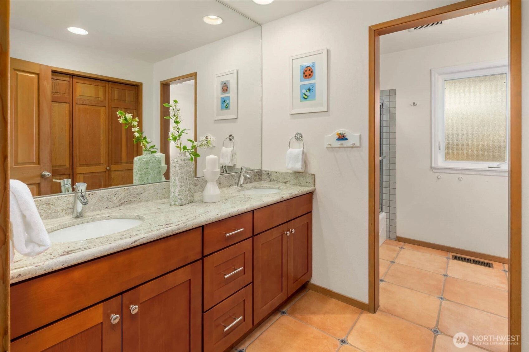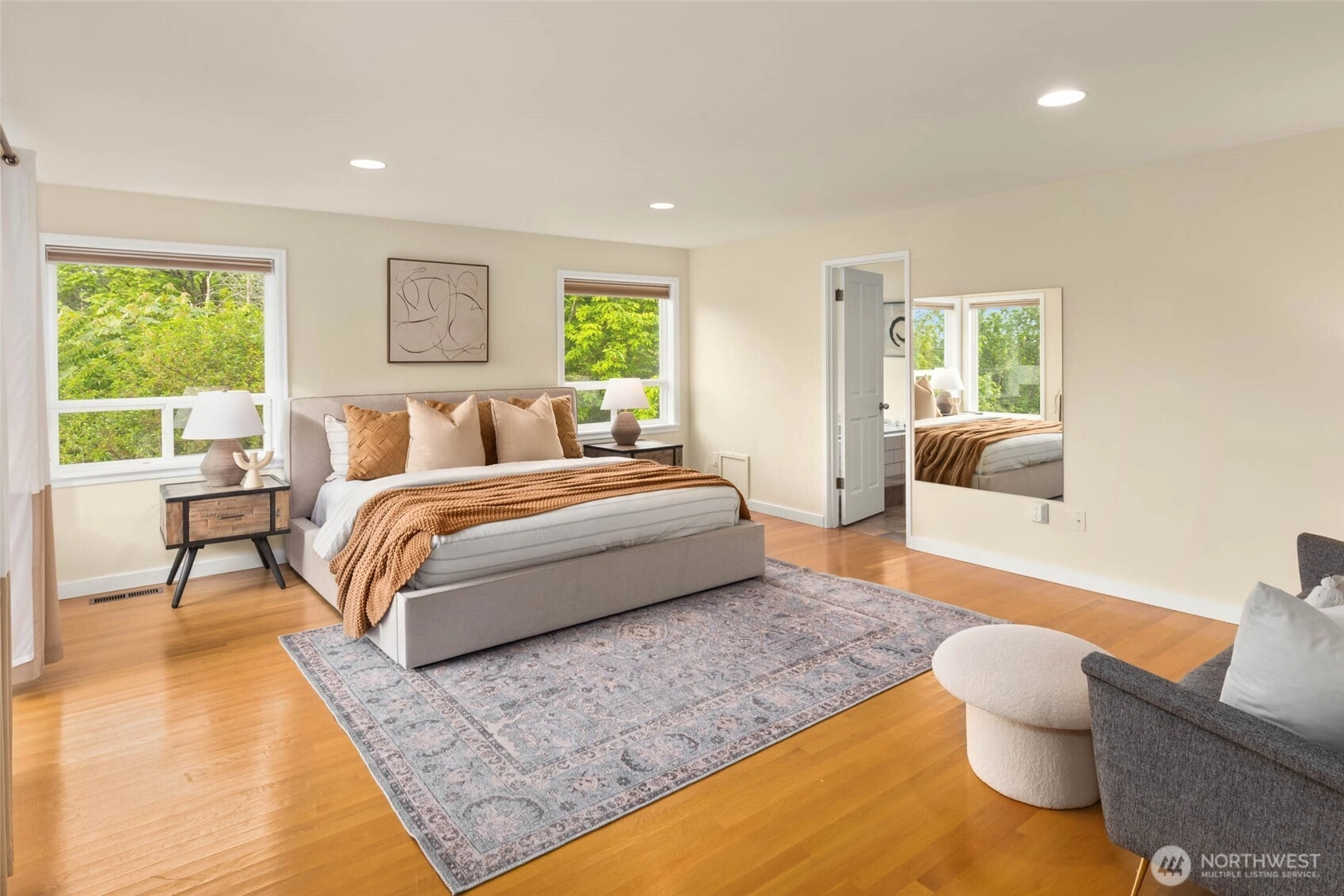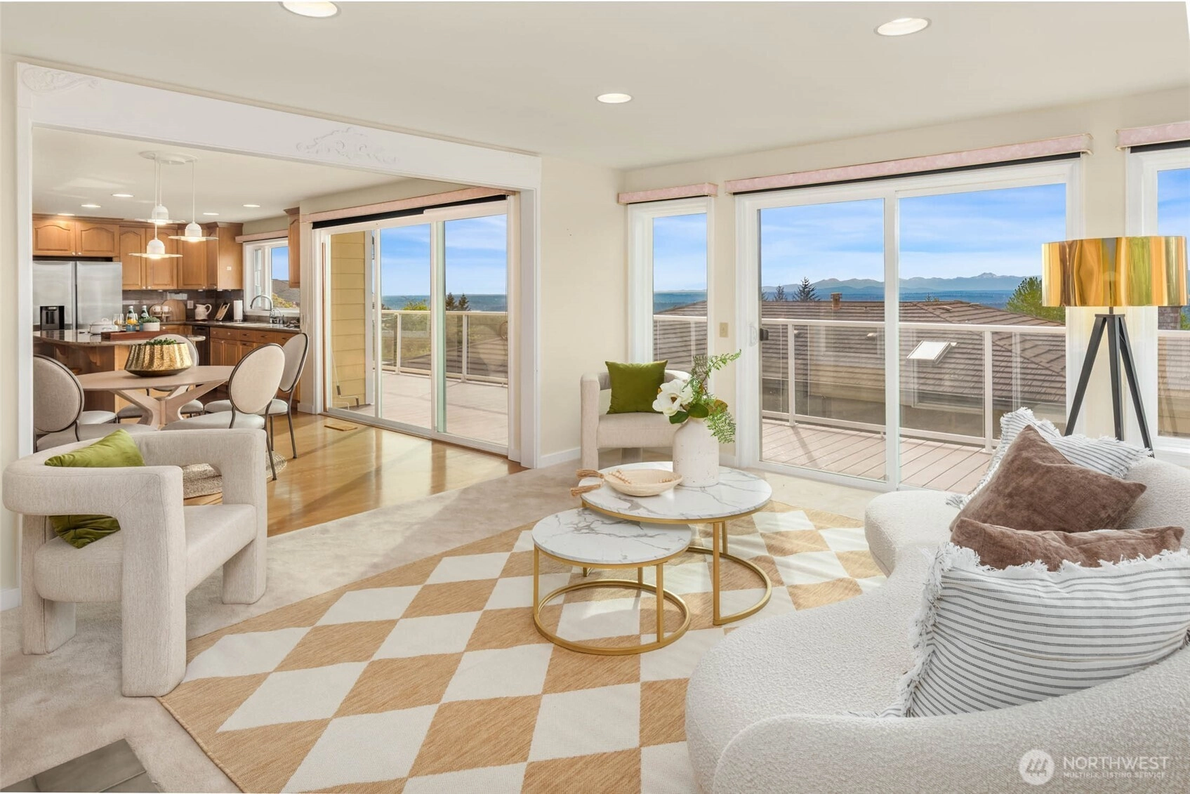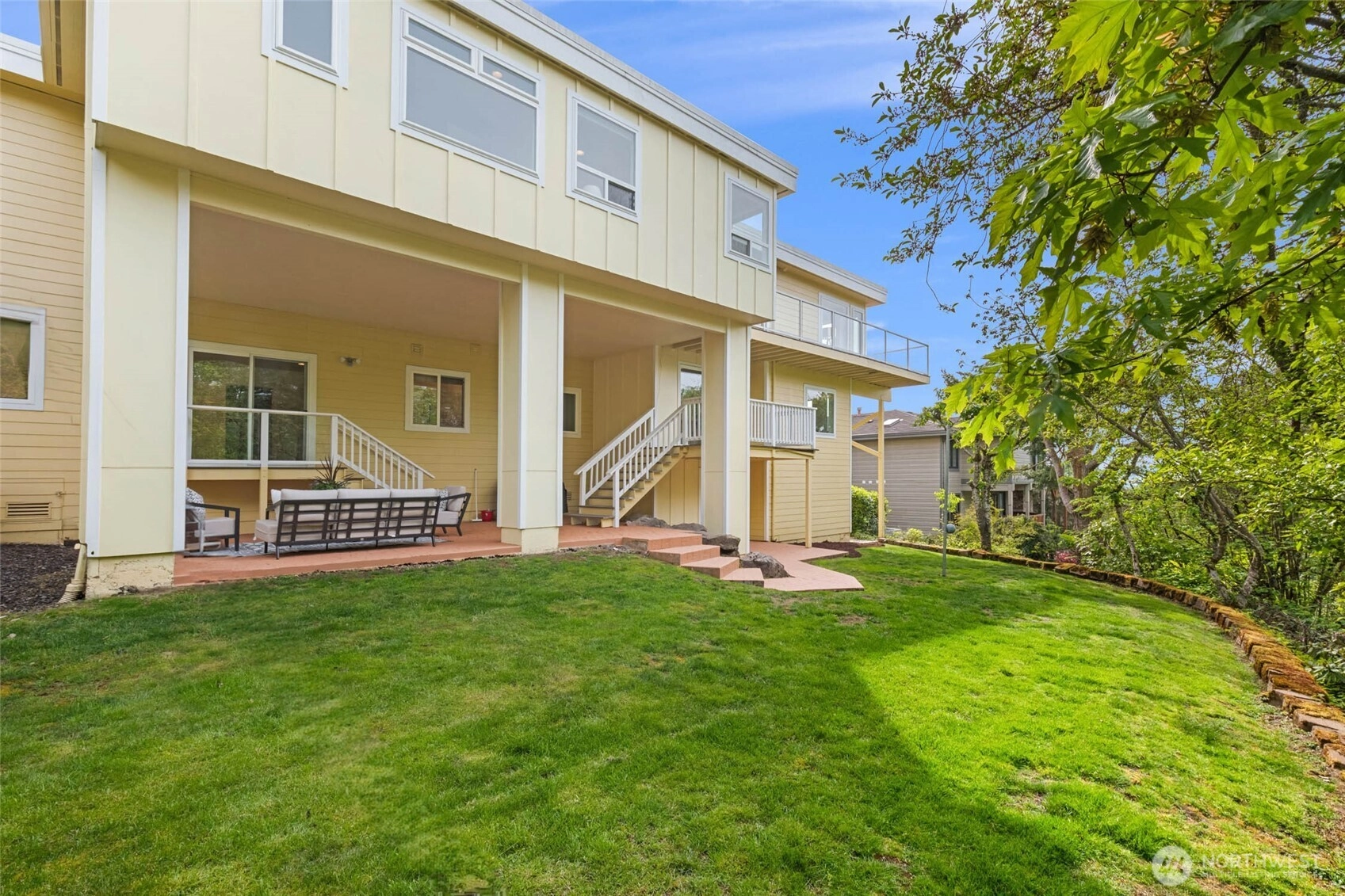 Stunning 5 bed, 3.5 bath updated home in the heart of Somerset with breathtaking Water, Mountain & City views! Nestled in a quiet neighborhood, this light-filled gem features big windows, skylights, and an expansive deck with Trex materials for easy maintenance. Main level boasts a grand foyer, spacious living/family rooms, gourmet kitchen, and a view-facing primary suite. Enjoy the convenience of an office/flex room on the main. Downstairs offers 4 bedrooms, bonus/gym, 2nd office, and a high-end media room. Luxurious steam shower & massage tub for ultimate relaxation. Lush landscaping backs to greenbelt, with a swing set and level backyard Top-rated Somerset schools, minutes to parks, Factoria, and Bellevue DT.