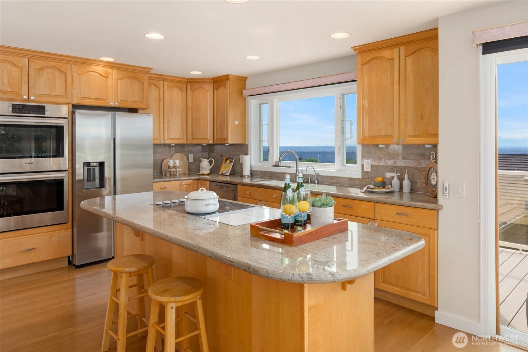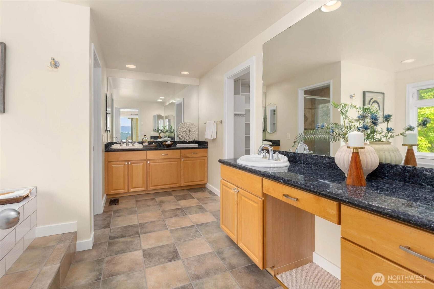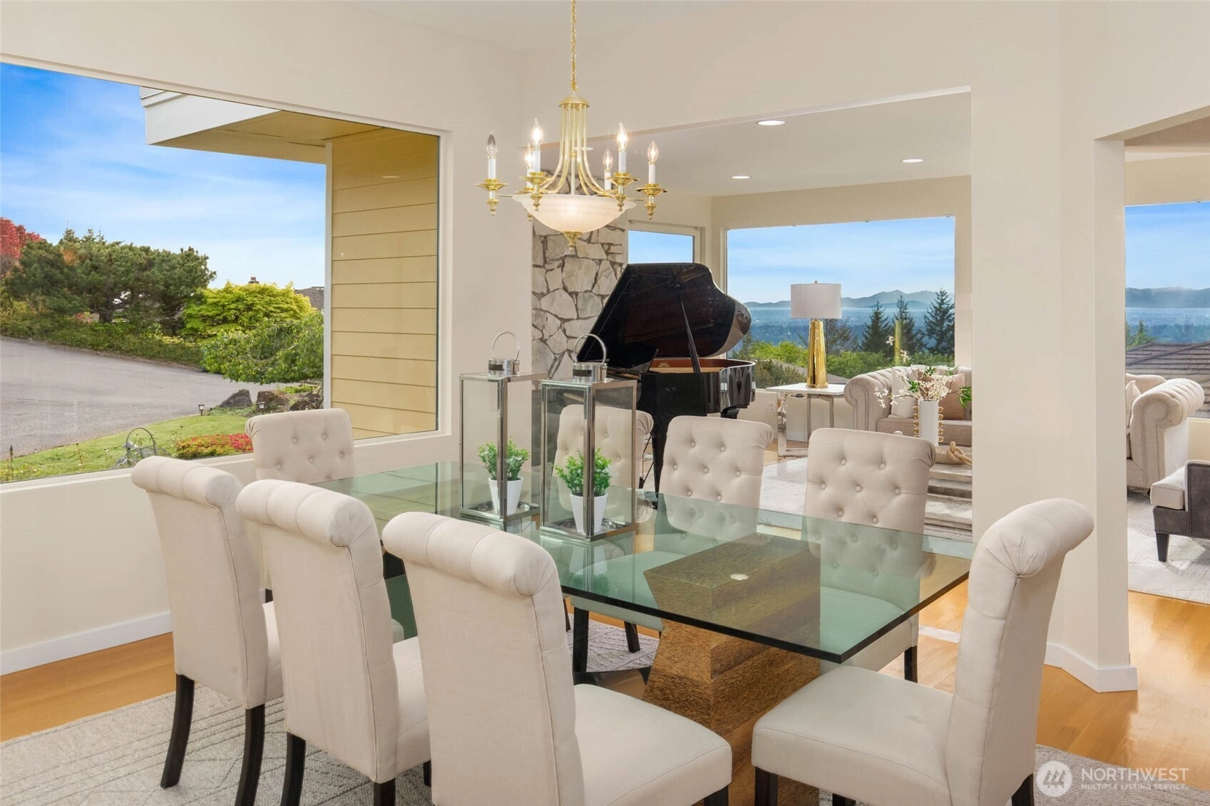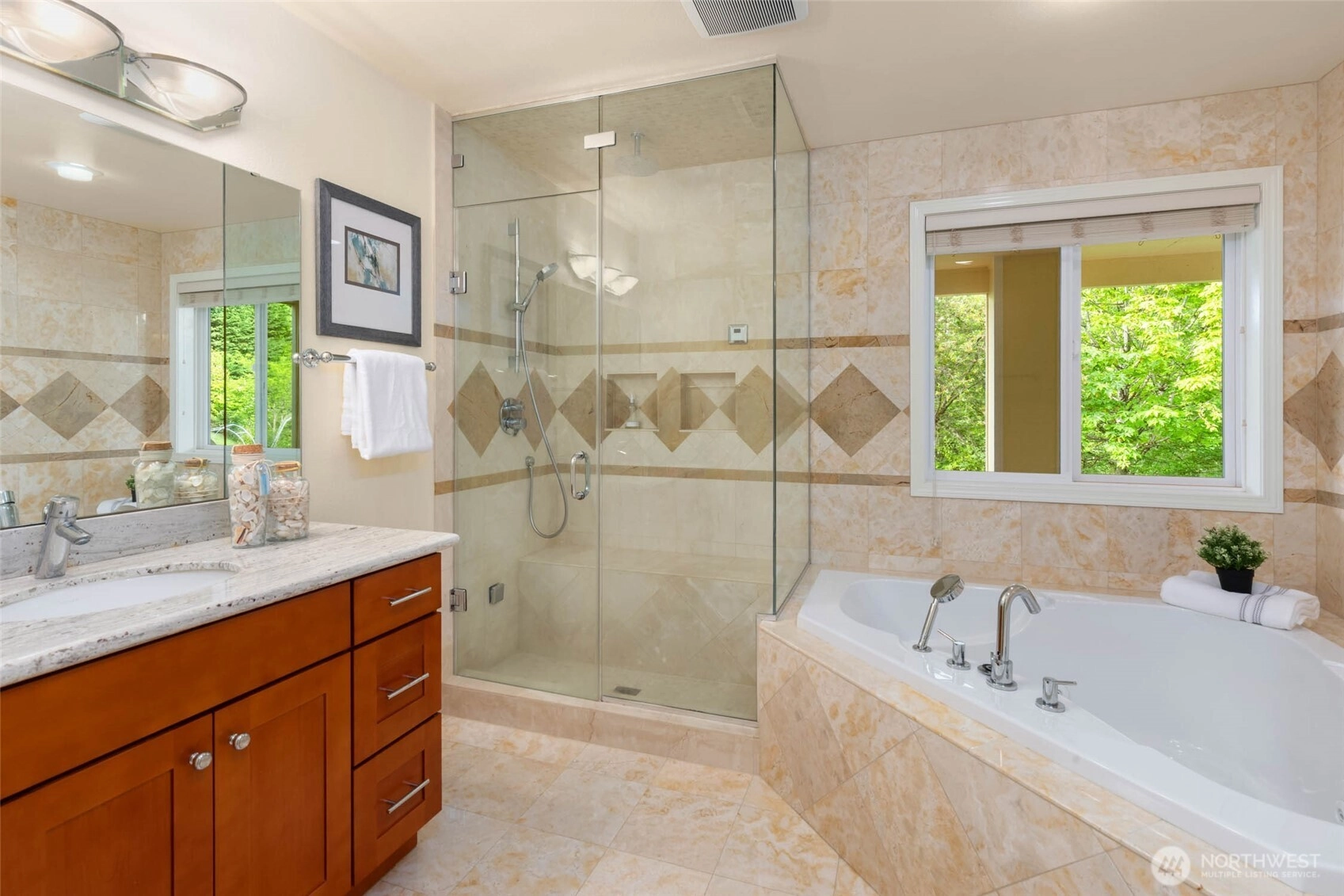 Stunning 5 bed, 3.5 bath updated home in the heart of Somerset with breathtaking Water, Mountain & City views! Nestled in a quiet neighborhood, this light-filled gem features big windows, skylights, and an expansive deck with Trex materials for easy maintenance. Main level boasts a grand foyer, spacious living/family rooms, gourmet kitchen, and a view-facing primary suite. Enjoy the convenience of an office/flex room on the main. Downstairs offers 4 bedrooms, bonus/gym, 2nd office, and a high-end media room. Luxurious steam shower & massage tub for ultimate relaxation. Lush landscaping backs to greenbelt, with a swing set and level backyard Top-rated Somerset schools, minutes to parks, Factoria, and Bellevue DT.