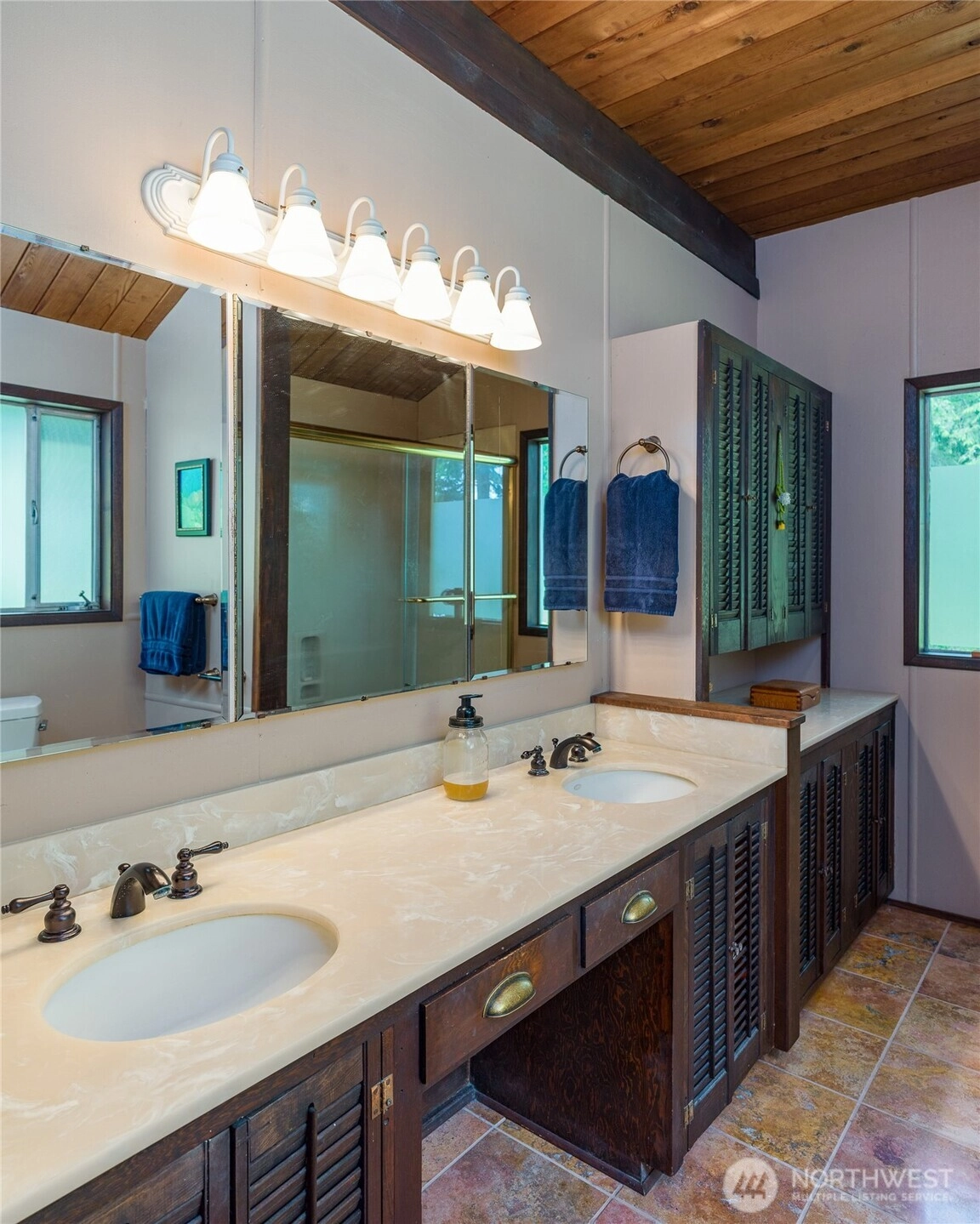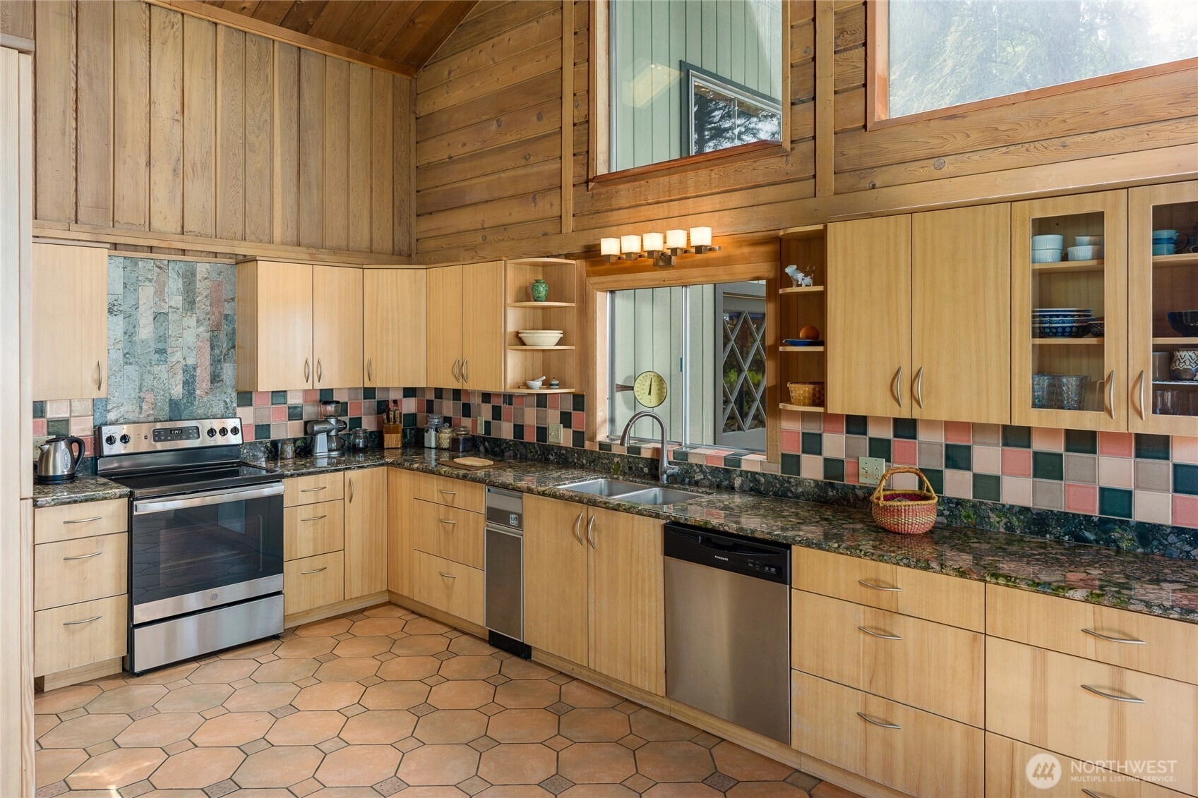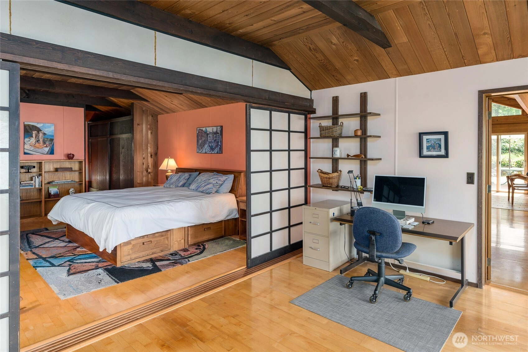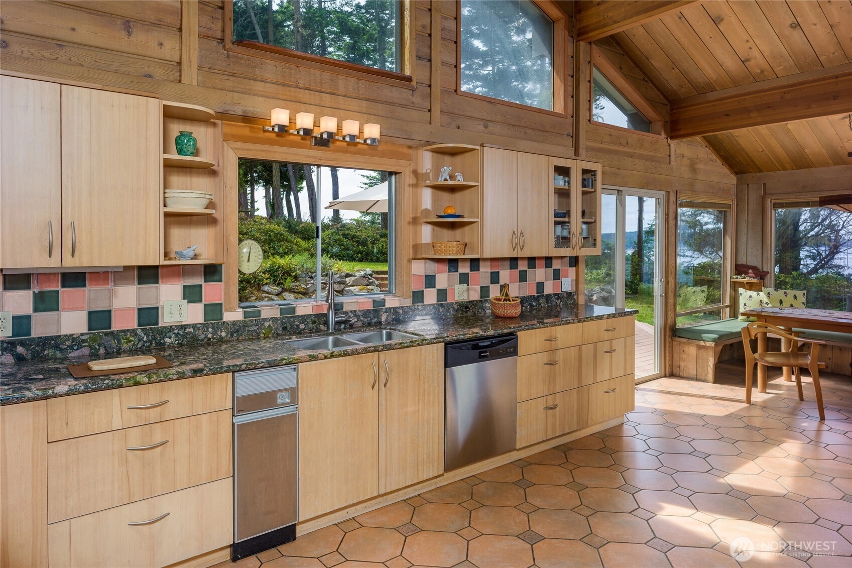 Westside, all cedar beach house tucked at the end of a quiet road offers 295 ft WF & views over San Juan Channel, the Straits & Olympic Mtns. Easy trail to miles of some of the best beach on Lopez. The single-level, 2bd/2ba home has vaulted ceilings open to walls of windows to capture the views & vibrant sunsets. Inside maple floors, warm cedar walls & ceilings, cozy brick FP. den/office & project room. Step outside to a large deck, hot tub & beach pebble patio to enjoy the natural tranquility. Detached garage with separate exercise/guest space, well finished shop, greenhouse, storage building, fruit trees & garden. Set on 5 wooded park-like acres with walking trail. Close to the golf course and a 10 minute drive to the Village.
