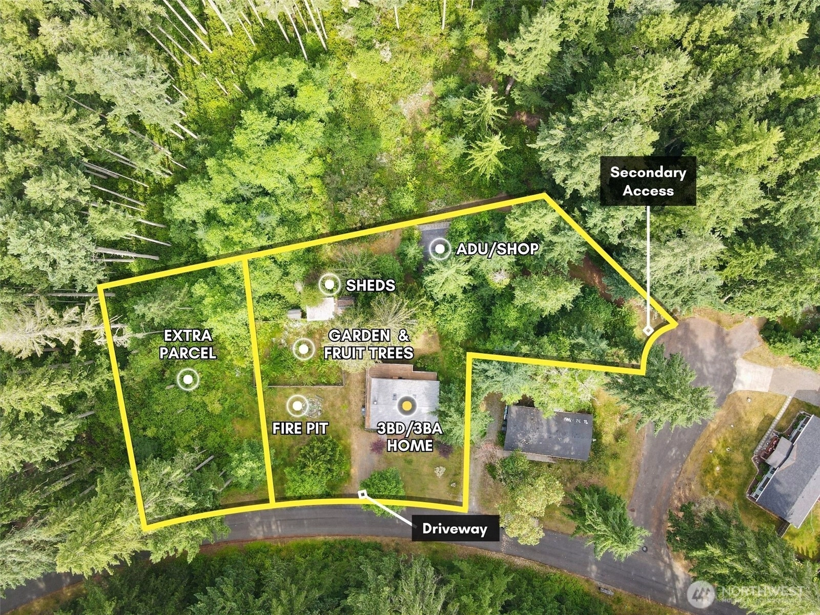 3 Bed/3 Bath Rambler with 24x24 partially finished Shop/DADU on 0.89 acres of land across 4 underlying lots. This is one of the largest properties in the Riviera Community & offers unique development potential — build more homes or expand as desired. The home features a great room that blends the kitchen, dining, & living room spaces into a singular, open room. All 3 bedrooms have a walk-in closet, full bathroom, & egress to deck or patio. The Shop has a kitchenette, bathroom, laundry, & pellet stove & could be easily converted into a separate living quarters or used as a workshop or studio. Fenced garden w/ mix of fruit/berry trees & multiple sheds. Riviera amenities include marina, golf course, sports courts, parks, beaches, & trails.