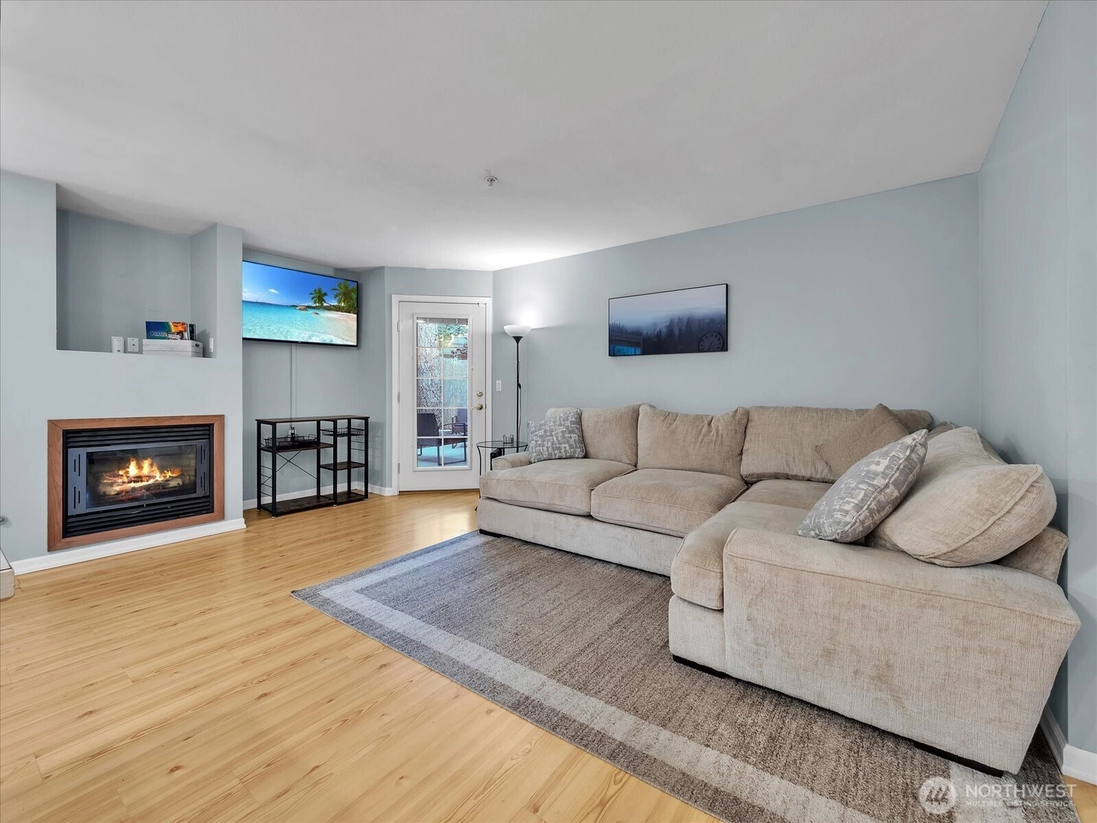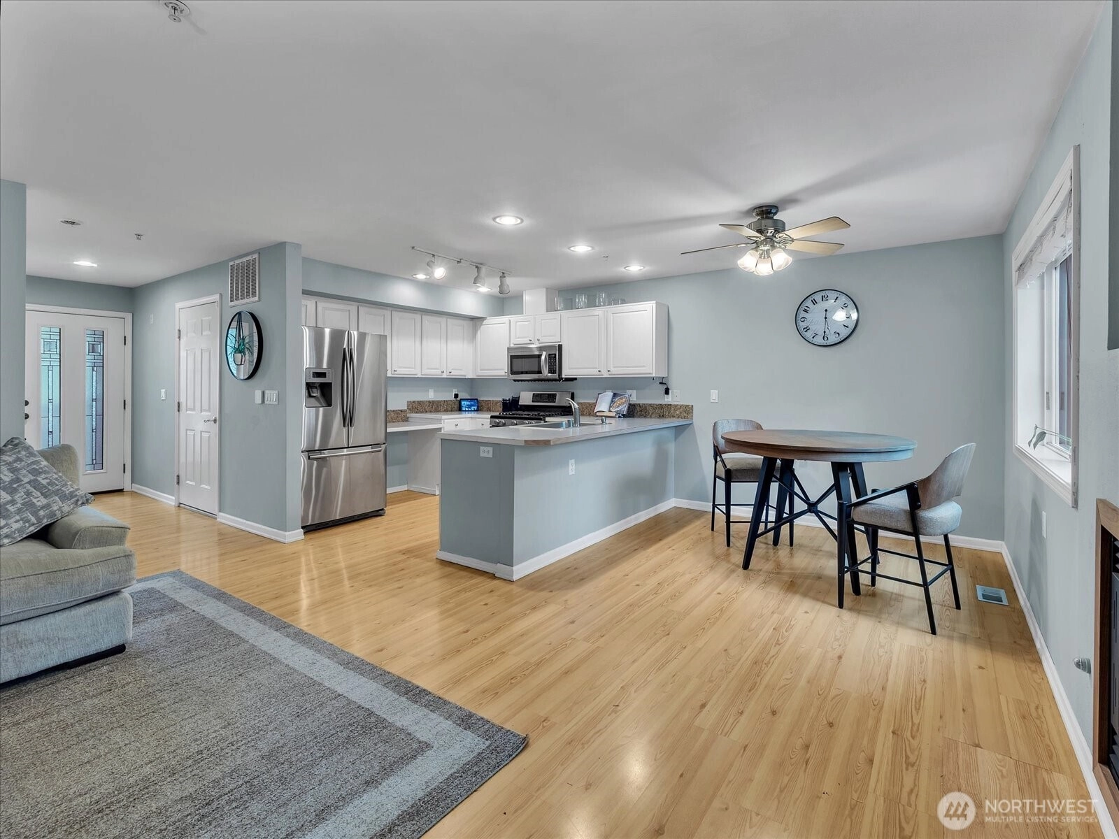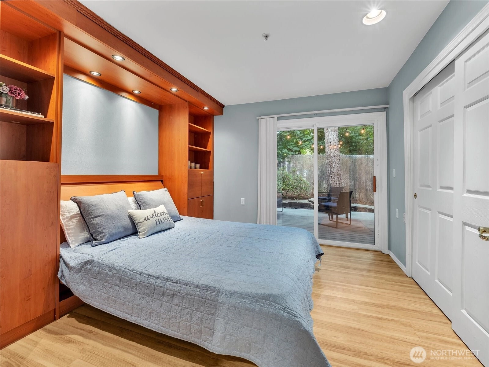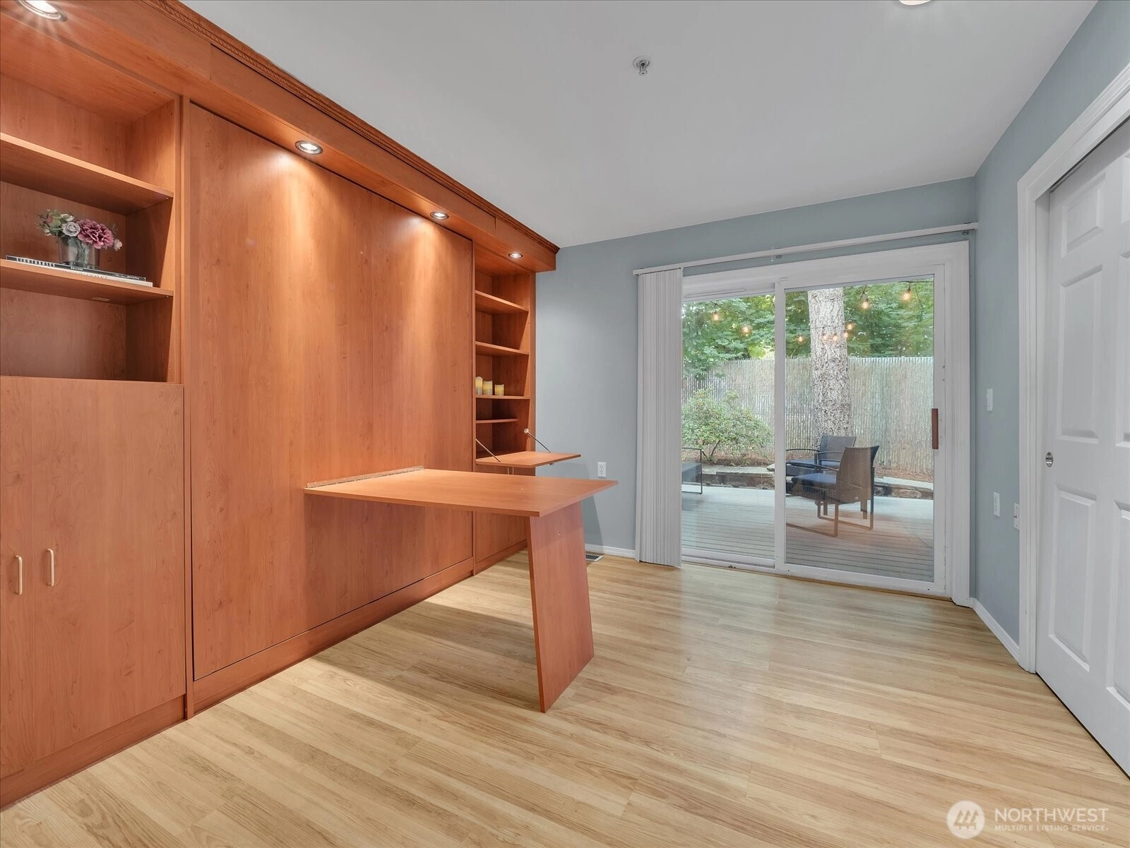 A well-designed condo with 2 beds, 1.75 baths, 1,113 sq ft, open-concept layout, and cozy gas fireplace. Enjoy access to the private Trex deck and fenced yard from both bedrooms and the living room. Designed for a variety of lifestyles, this home features step-free entry, wide doorways/hallways, roll-under kitchen counter, and an accessible secondary bath with roll-under vanity and pull-down bench. The second bedroom doubles as an office with a custom Murphy bed and pull-down desk. Low-maintenance and centrally located with easy access to I-5—comfort, style, and convenience in one package.
