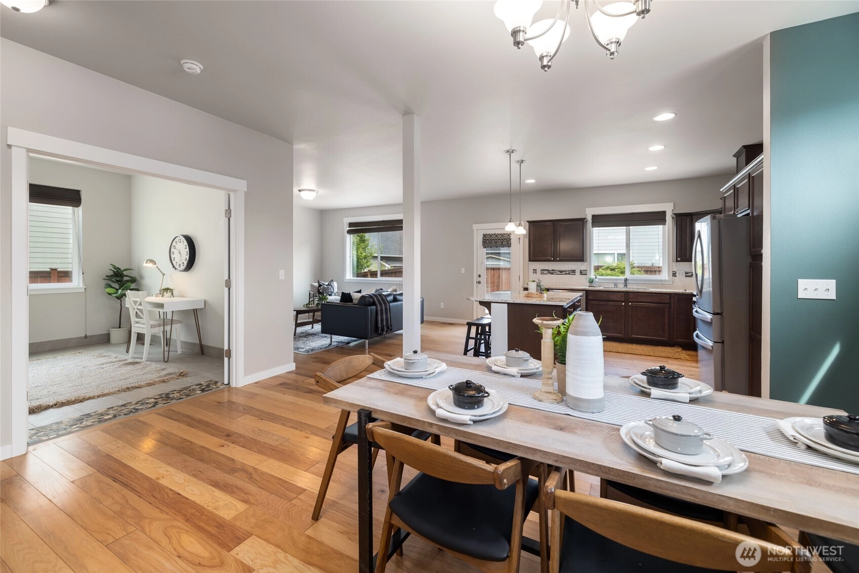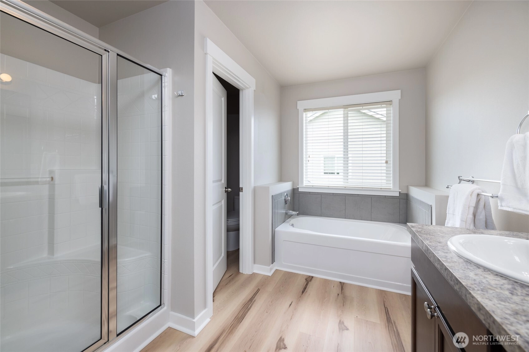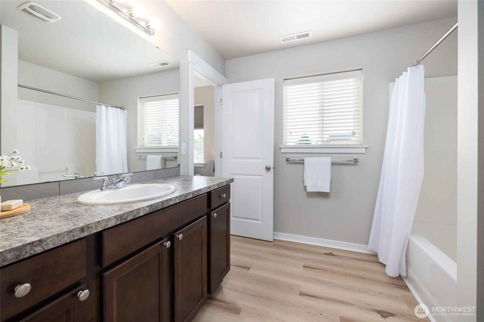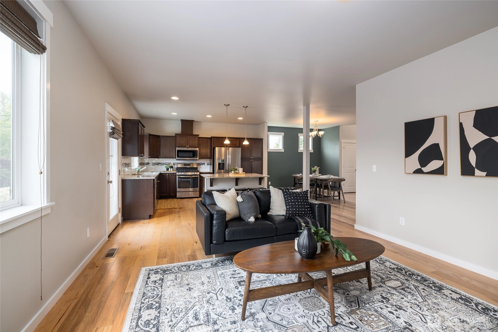 This thoughtfully designed home in Summersun Estates offers 3 bedrooms plus a den and a spacious great room that flows effortlessly into the kitchen and dining areas ideal for everyday living. Engineered hardwood floors welcome you into the entry, kitchen, and dining spaces, while a cozy gas fireplace adds warmth to the great room. The kitchen features slab granite countertops, stainless steel appliances, and stylish finishes throughout. Upstairs, a convenient laundry room, 2 bedrooms and a generous primary suite await complete with a large sitting area w/second gas fireplace for the perfect private retreat. Enjoy a fully fenced backyard 3-car garage, and close proximity to the community's paved walking trail.