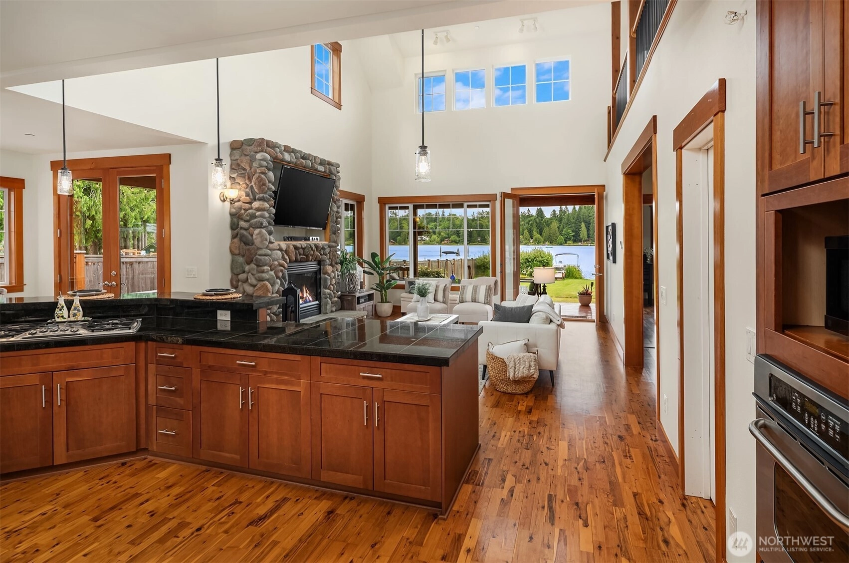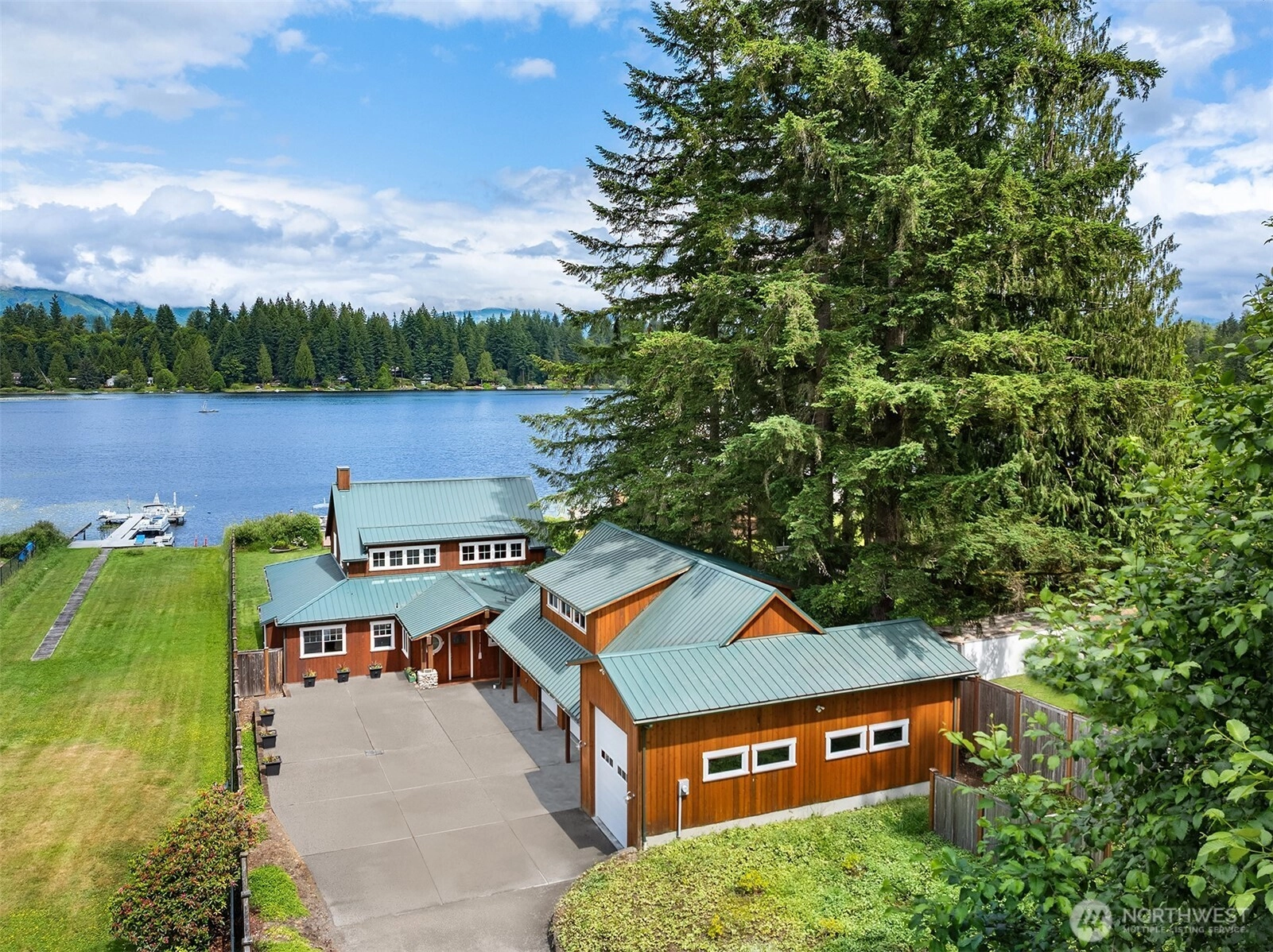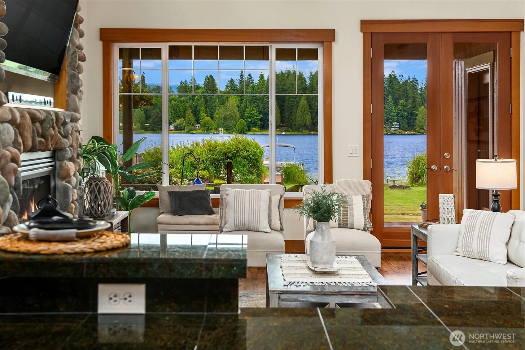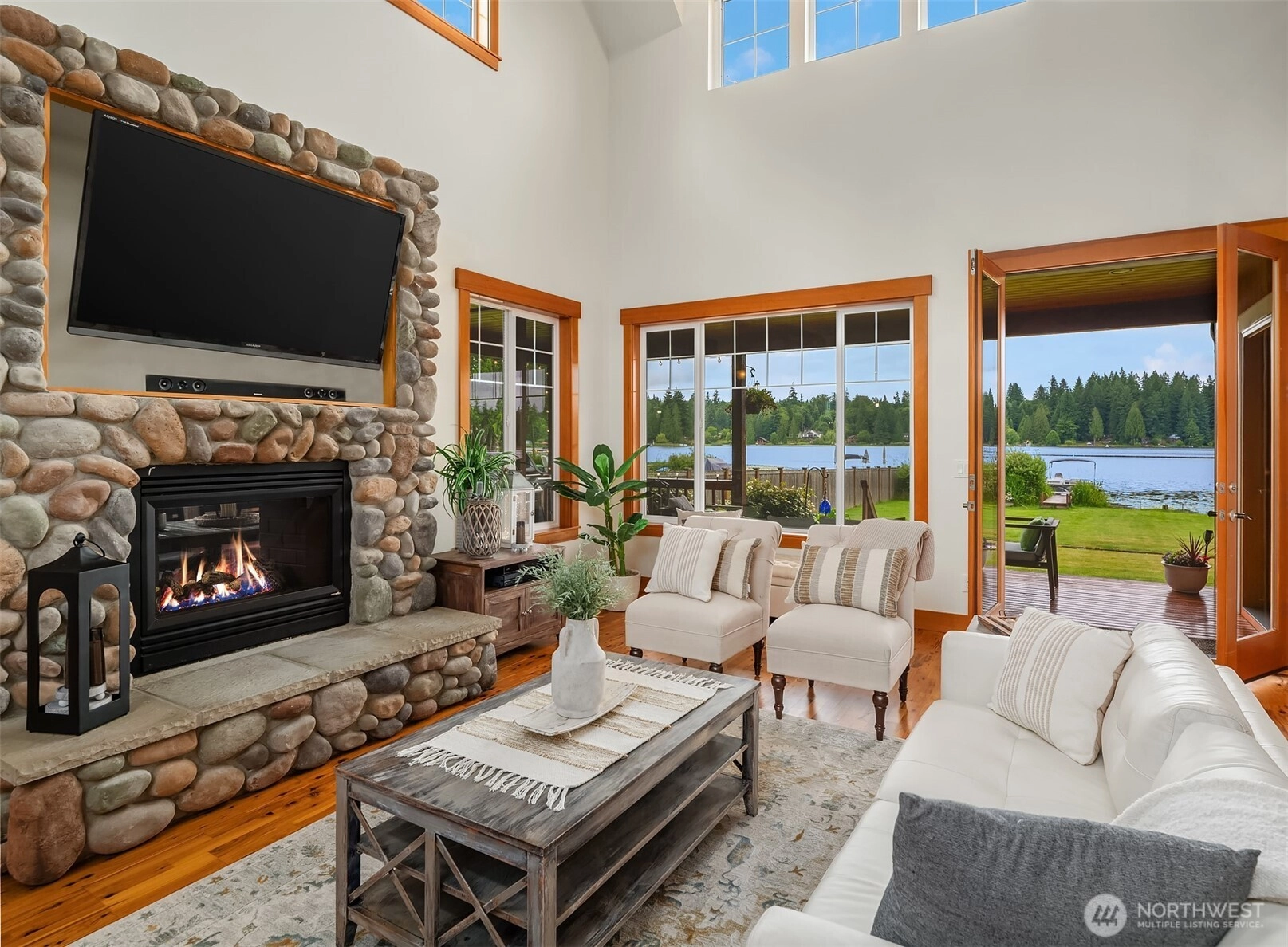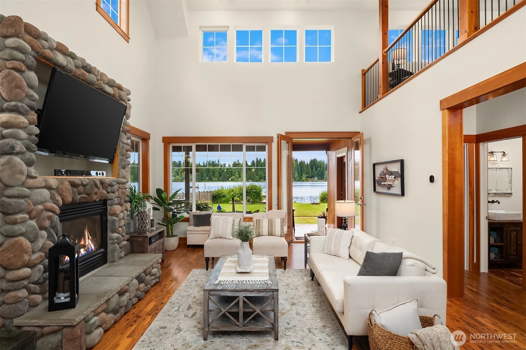 Welcome to Lake Joy and your waterfront dream home! Enjoy 75' of no-bank lakefront with dock. Exceptional Craftsman style custom Rambler boasting an expansive open-concept great room with stunning Australian Cypress floors, soaring open-beam ceilings and clerestory windows creating an atmosphere bathed in natural light. Panoramic lake and mountain views from most rooms. Living room w/double-sided river rock fireplace serving both the interior & exterior spaces. Chef's kitchen with large island, eating bar, stainless appliances & walk-in pantry. Roomy dining area with French doors to the covered deck. Large crowsnest loft to admire the view. Massive 1520 SF 4-car garage with dedicated RV stall and 1,000 SF unfinished Bonus Room above.