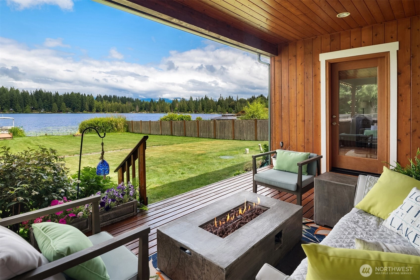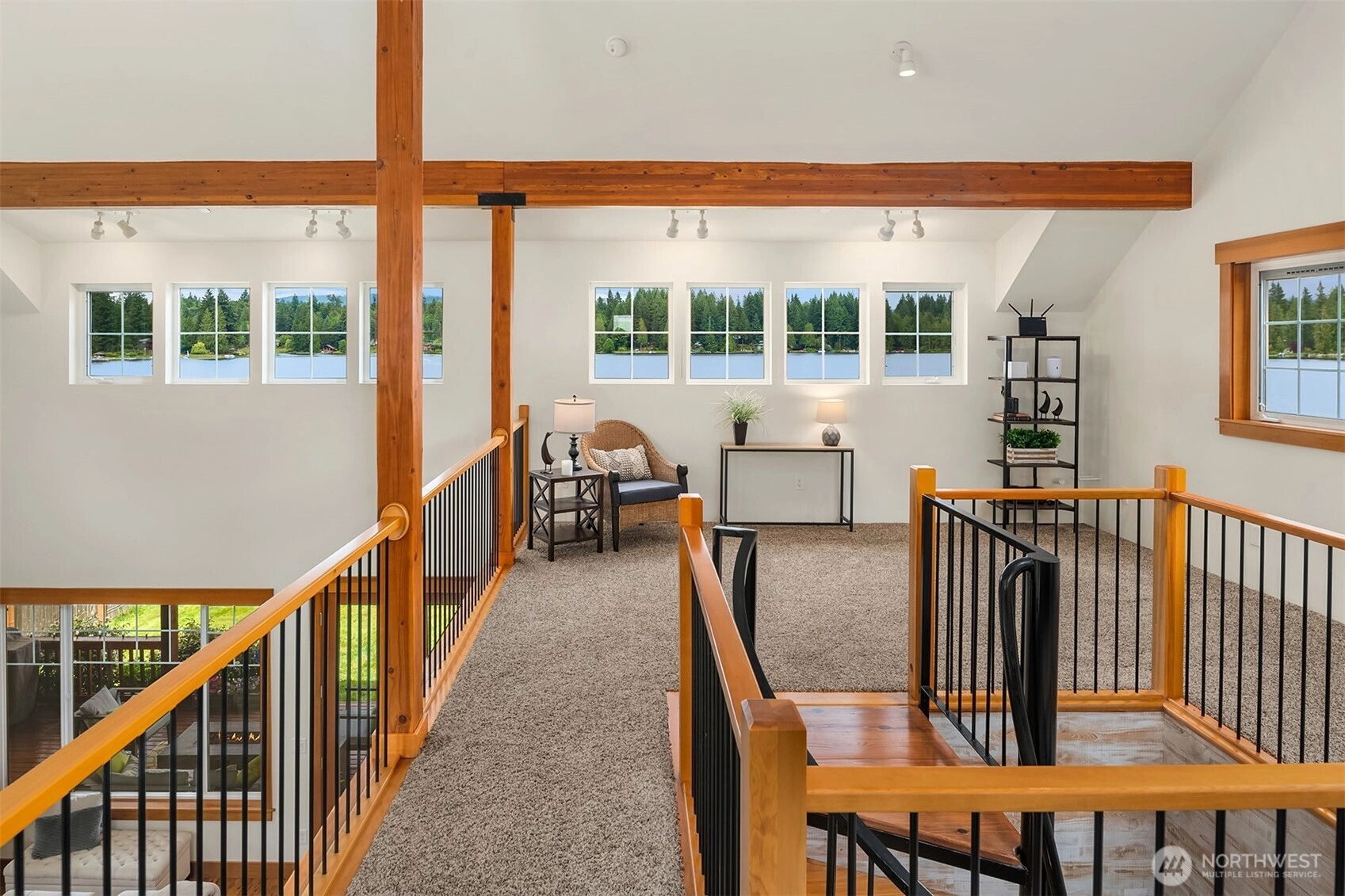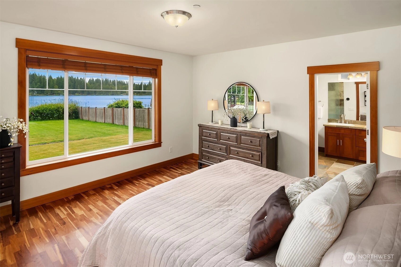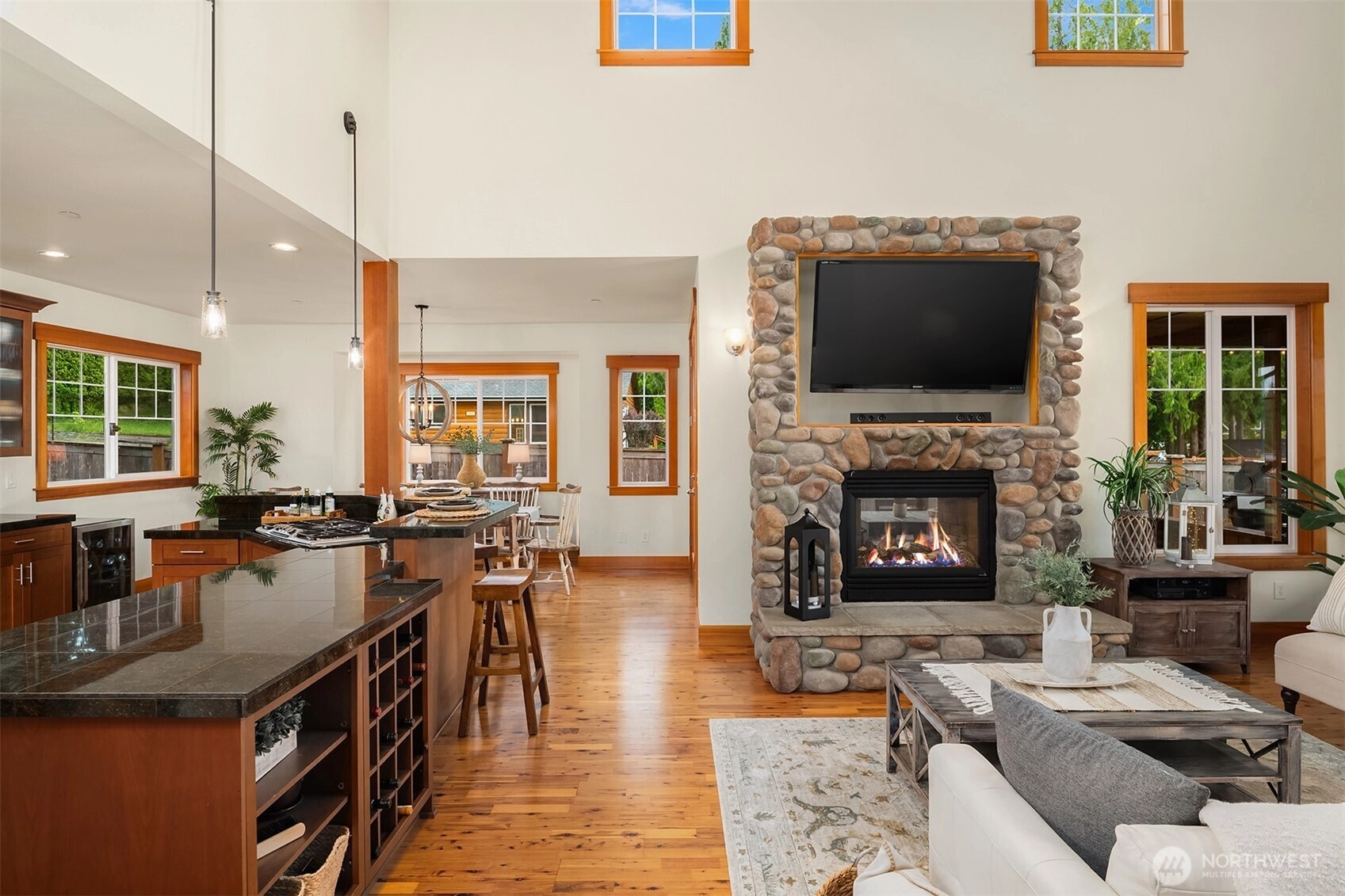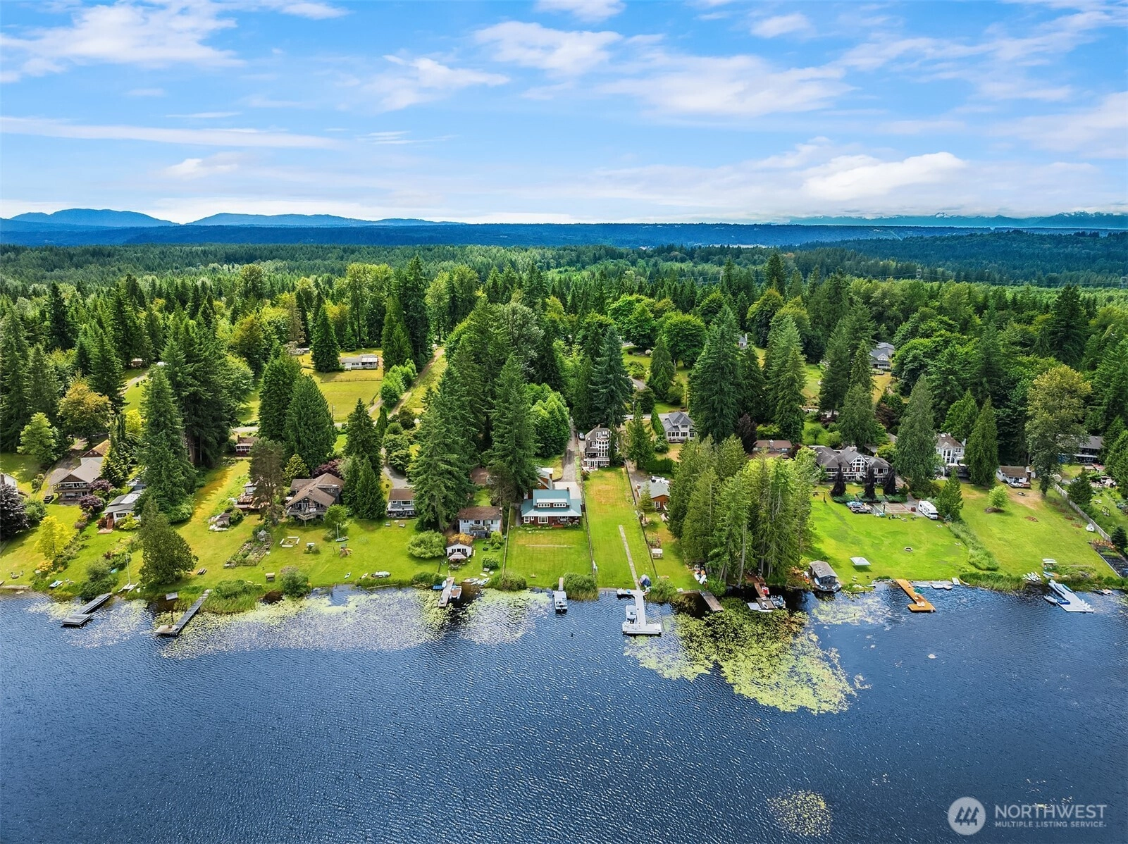 Welcome to Lake Joy and your waterfront dream home! Enjoy 75' of no-bank lakefront with dock. Exceptional Craftsman style custom Rambler boasting an expansive open-concept great room with stunning Australian Cypress floors, soaring open-beam ceilings and clerestory windows creating an atmosphere bathed in natural light. Panoramic lake and mountain views from most rooms. Living room w/double-sided river rock fireplace serving both the interior & exterior spaces. Chef's kitchen with large island, eating bar, stainless appliances & walk-in pantry. Roomy dining area with French doors to the covered deck. Large crowsnest loft to admire the view. Massive 1520 SF 4-car garage with dedicated RV stall and 1,000 SF unfinished Bonus Room above.