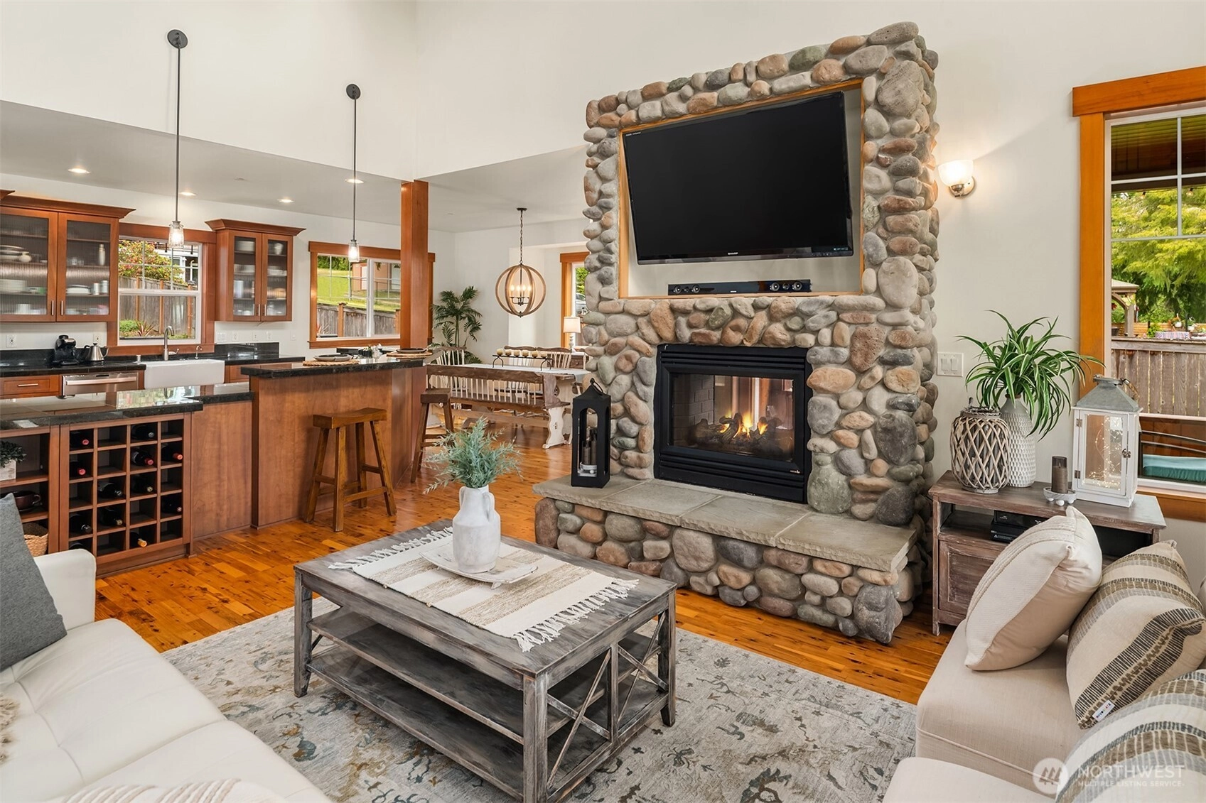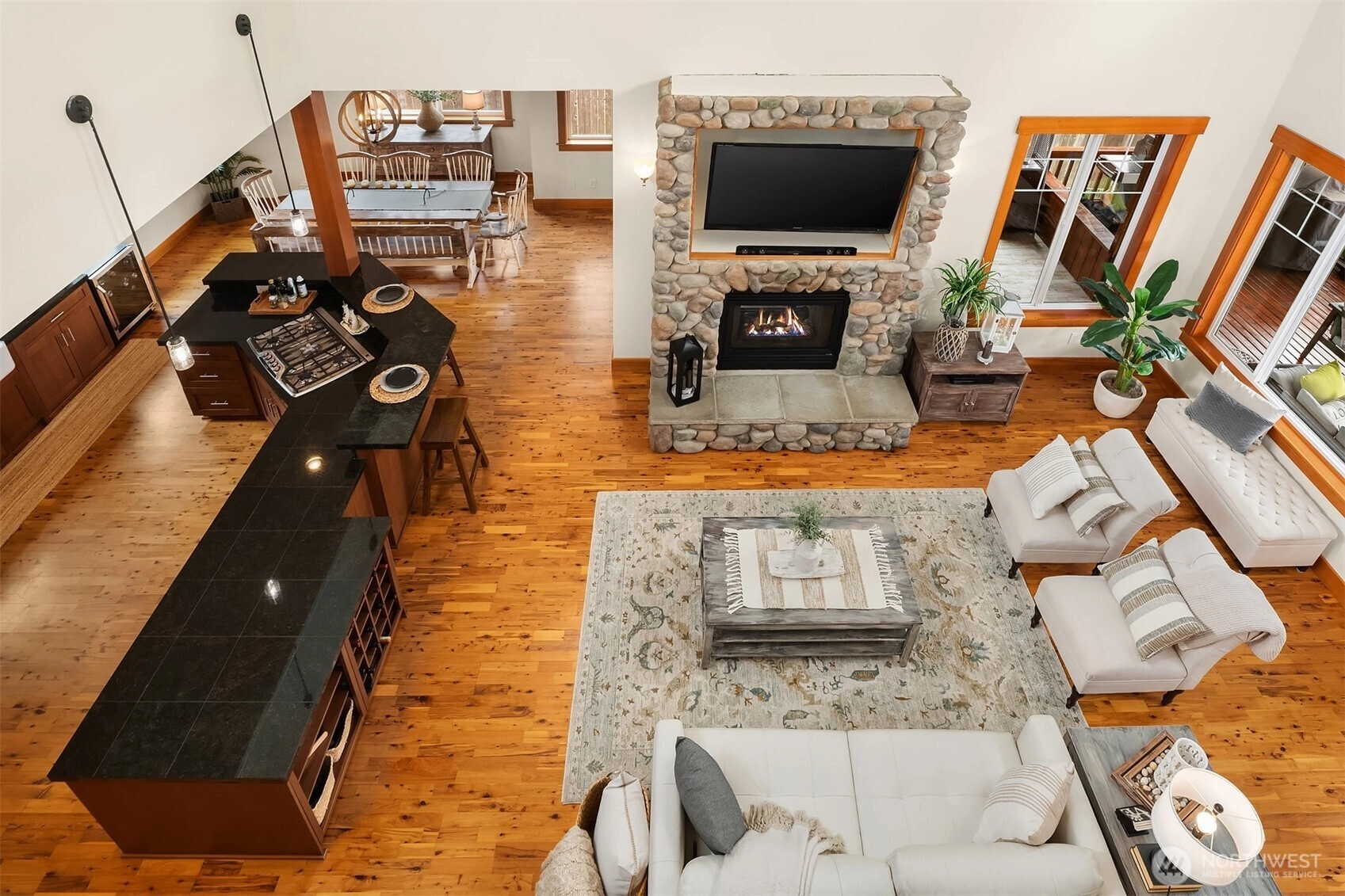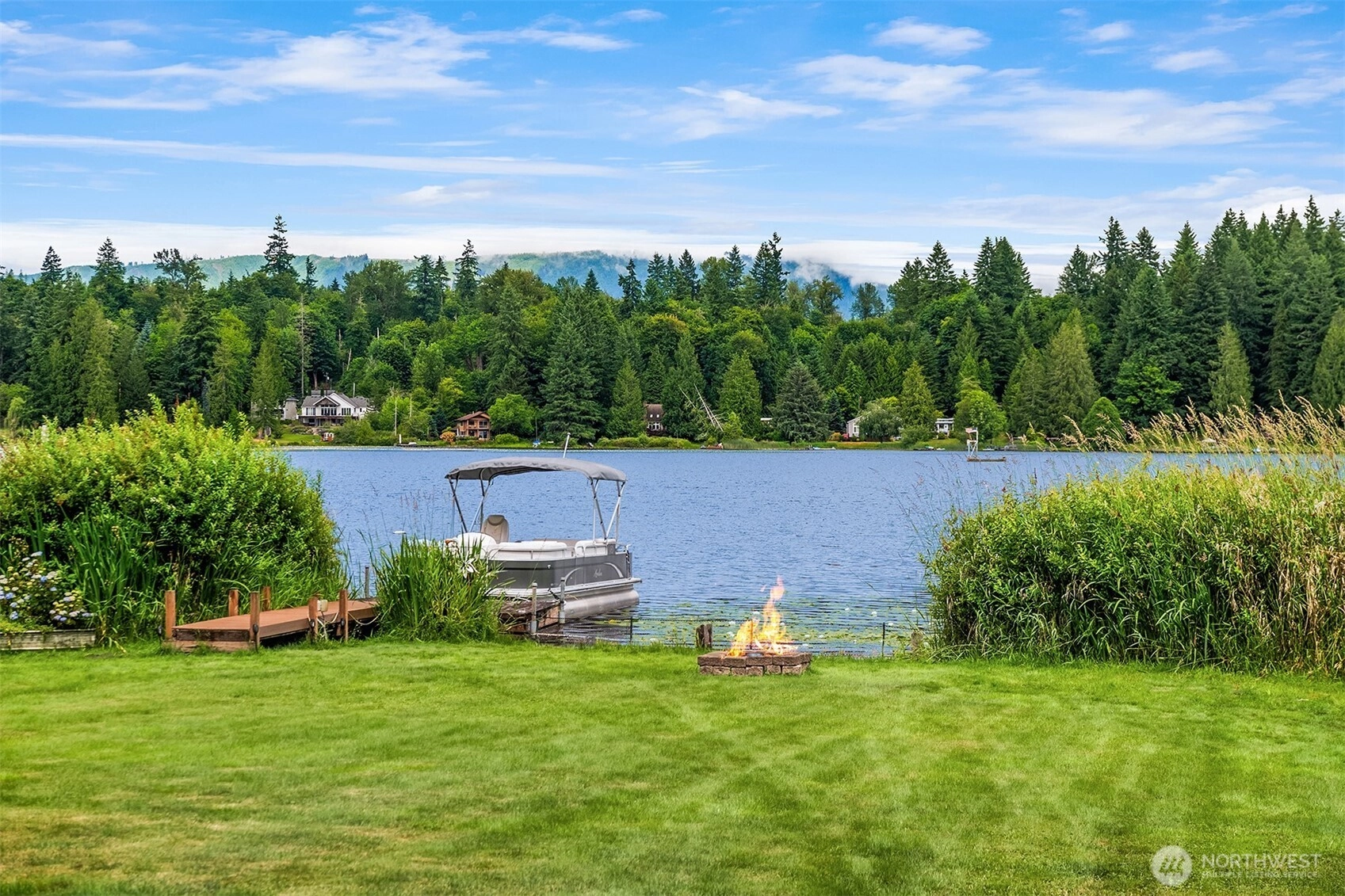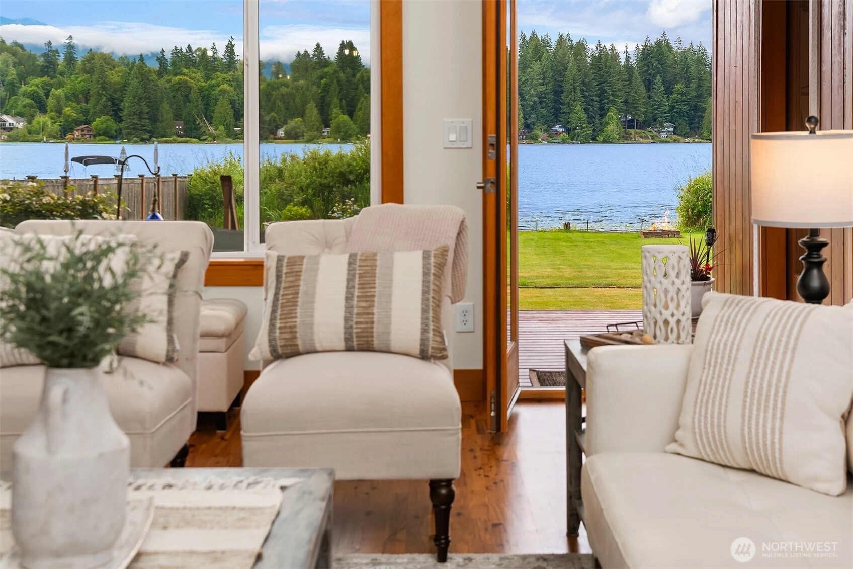Welcome to Lake Joy and your waterfront dream home! Enjoy 75' of no-bank lakefront with dock. Exceptional Craftsman style custom Rambler boasting an expansive open-concept great room with stunning Australian Cypress floors, soaring open-beam ceilings and clerestory windows creating an atmosphere bathed in natural light. Panoramic lake and mountain views from most rooms. Living room w/double-sided river rock fireplace serving both the interior & exterior spaces. Chef's kitchen with large island, eating bar, stainless appliances & walk-in pantry. Roomy dining area with French doors to the covered deck. Large crowsnest loft to admire the view. Massive 1520 SF 4-car garage with dedicated RV stall and 1,000 SF unfinished Bonus Room above.