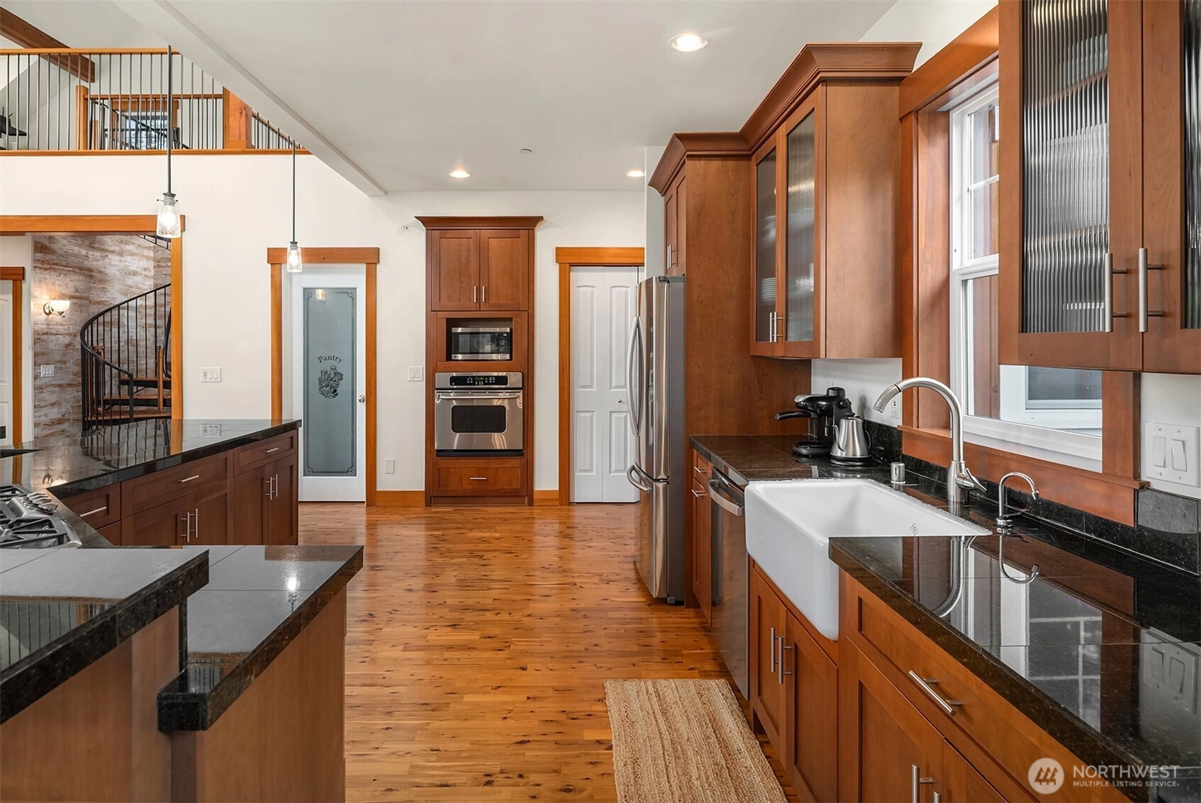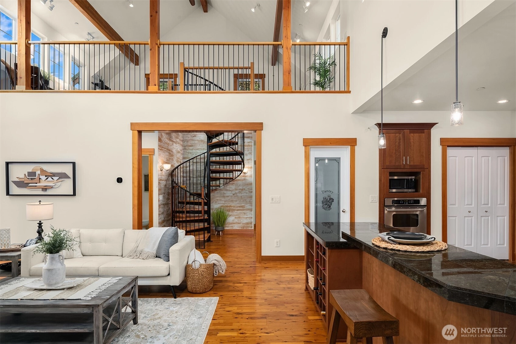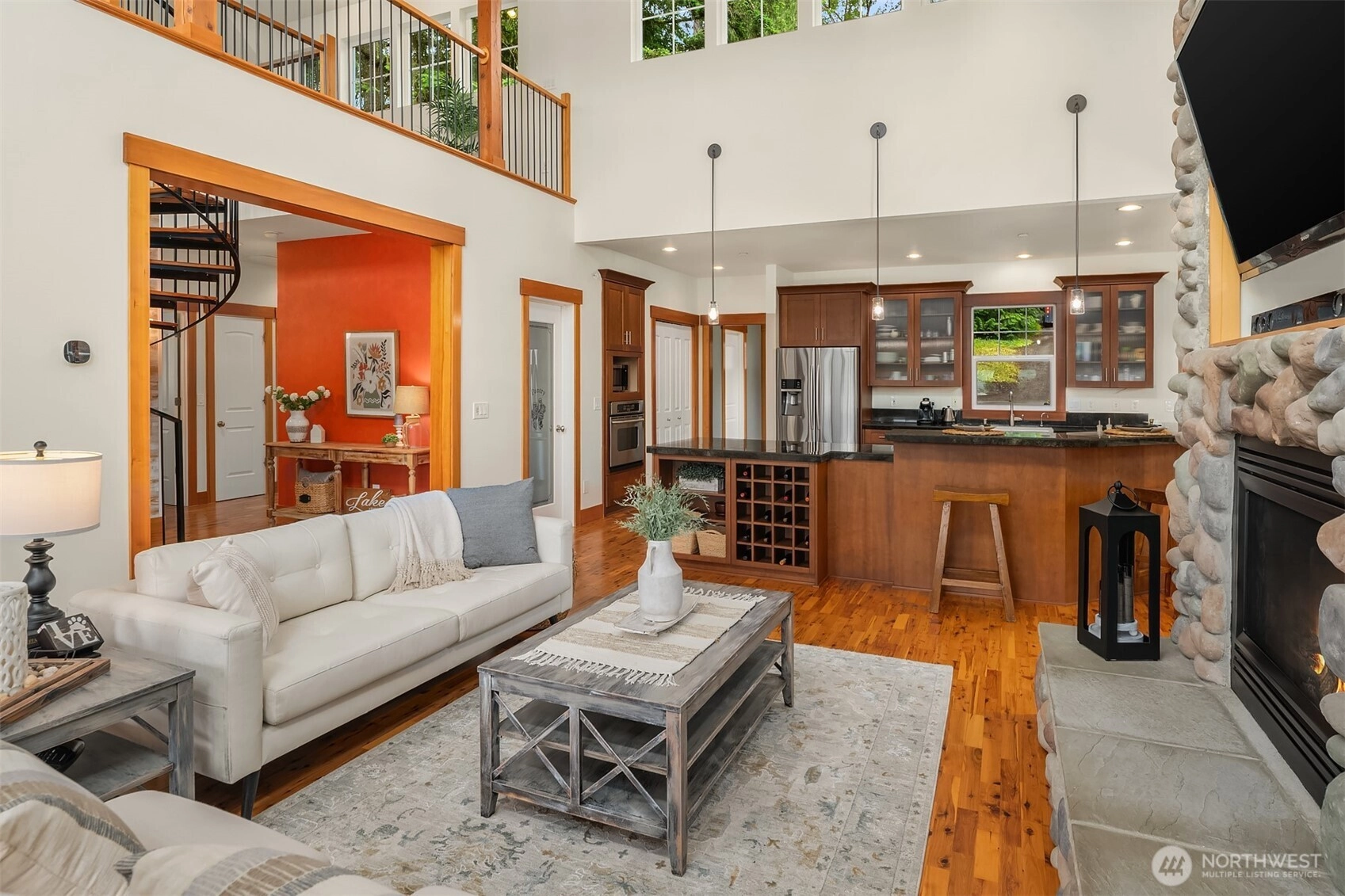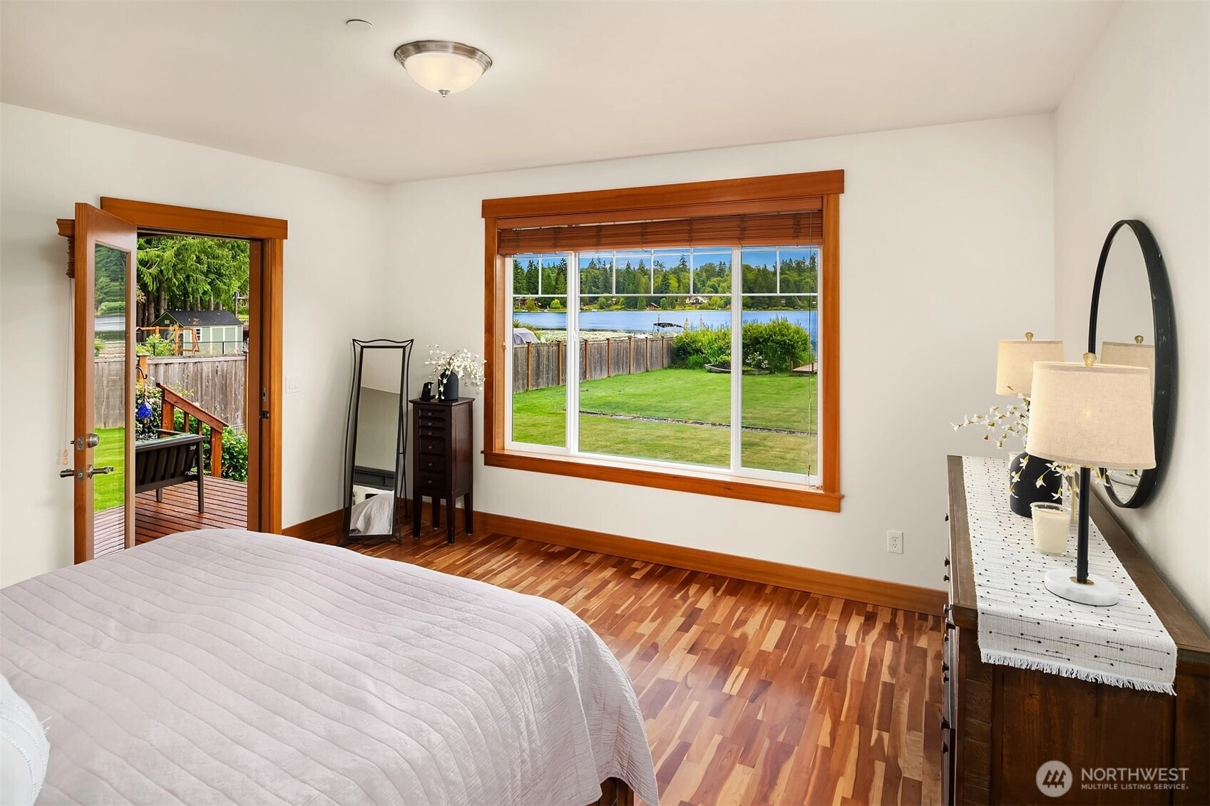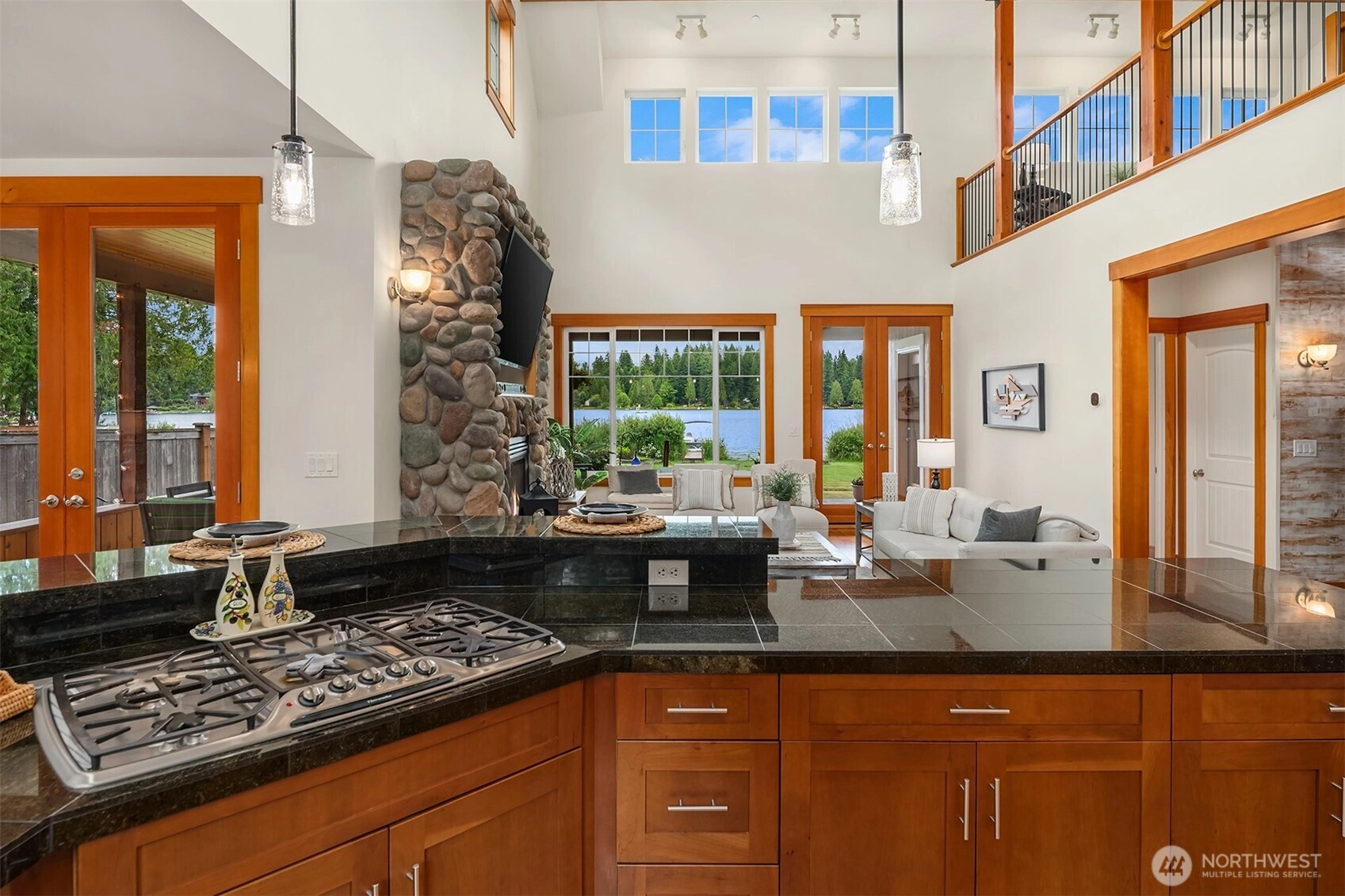 Welcome to Lake Joy and your waterfront dream home! Enjoy 75' of no-bank lakefront with dock. Exceptional Craftsman style custom Rambler boasting an expansive open-concept great room with stunning Australian Cypress floors, soaring open-beam ceilings and clerestory windows creating an atmosphere bathed in natural light. Panoramic lake and mountain views from most rooms. Living room w/double-sided river rock fireplace serving both the interior & exterior spaces. Chef's kitchen with large island, eating bar, stainless appliances & walk-in pantry. Roomy dining area with French doors to the covered deck. Large crowsnest loft to admire the view. Massive 1520 SF 4-car garage with dedicated RV stall and 1,000 SF unfinished Bonus Room above.