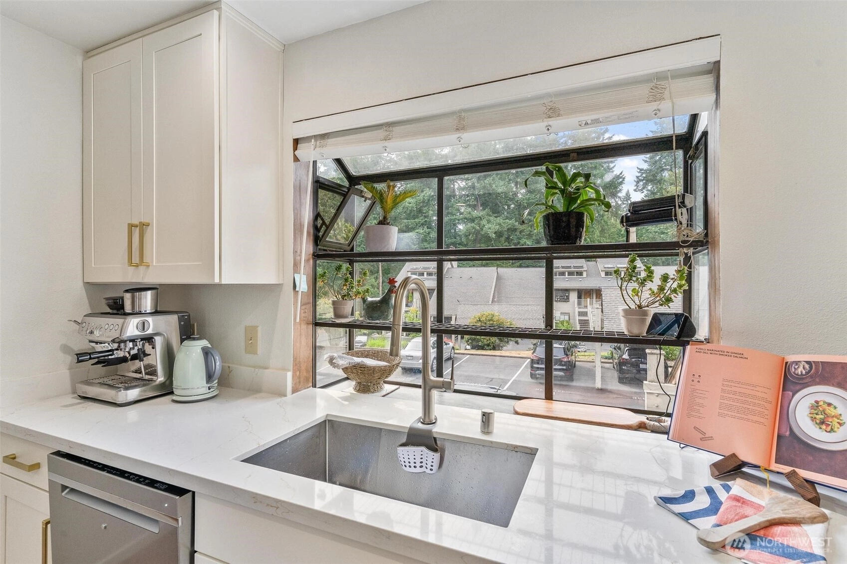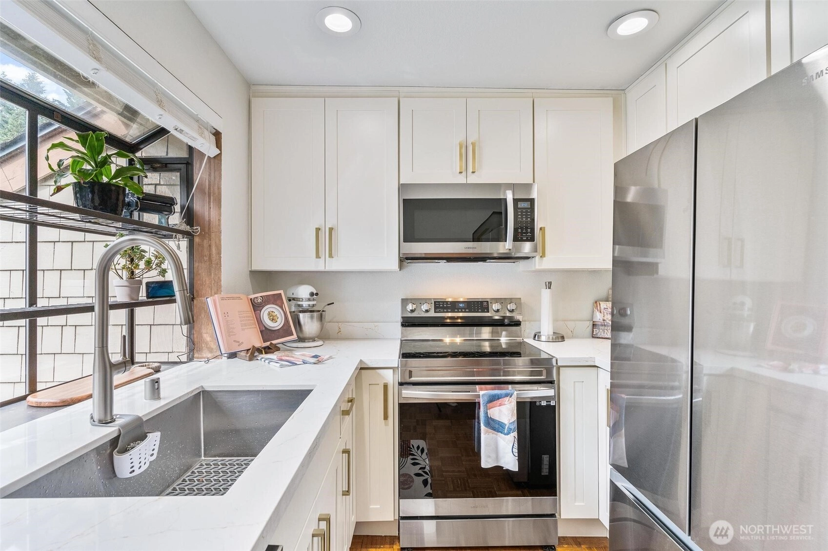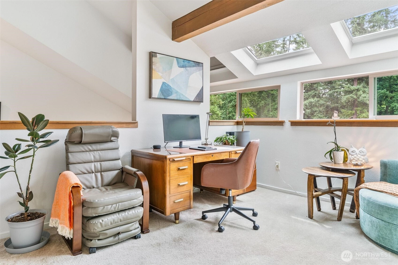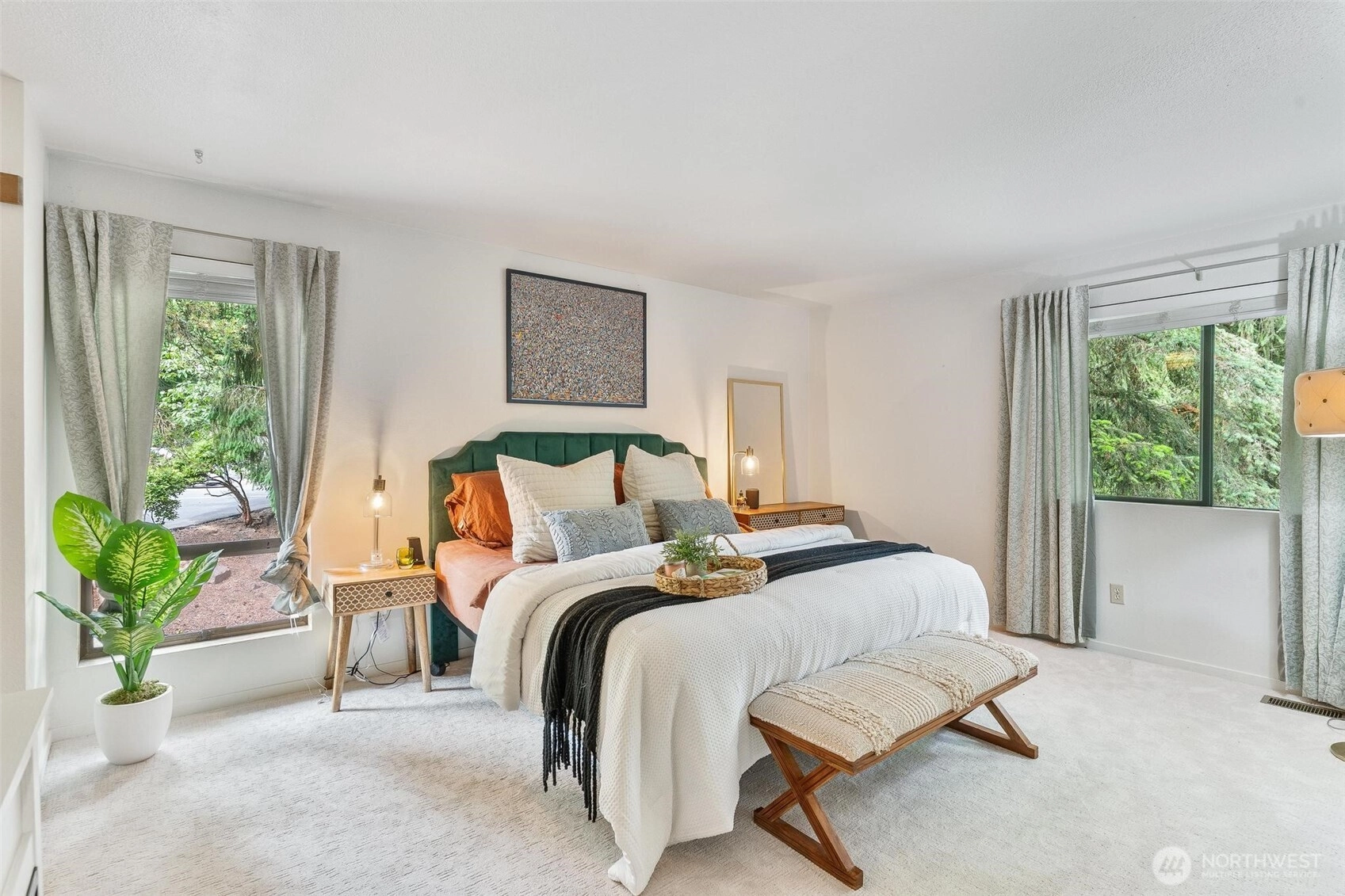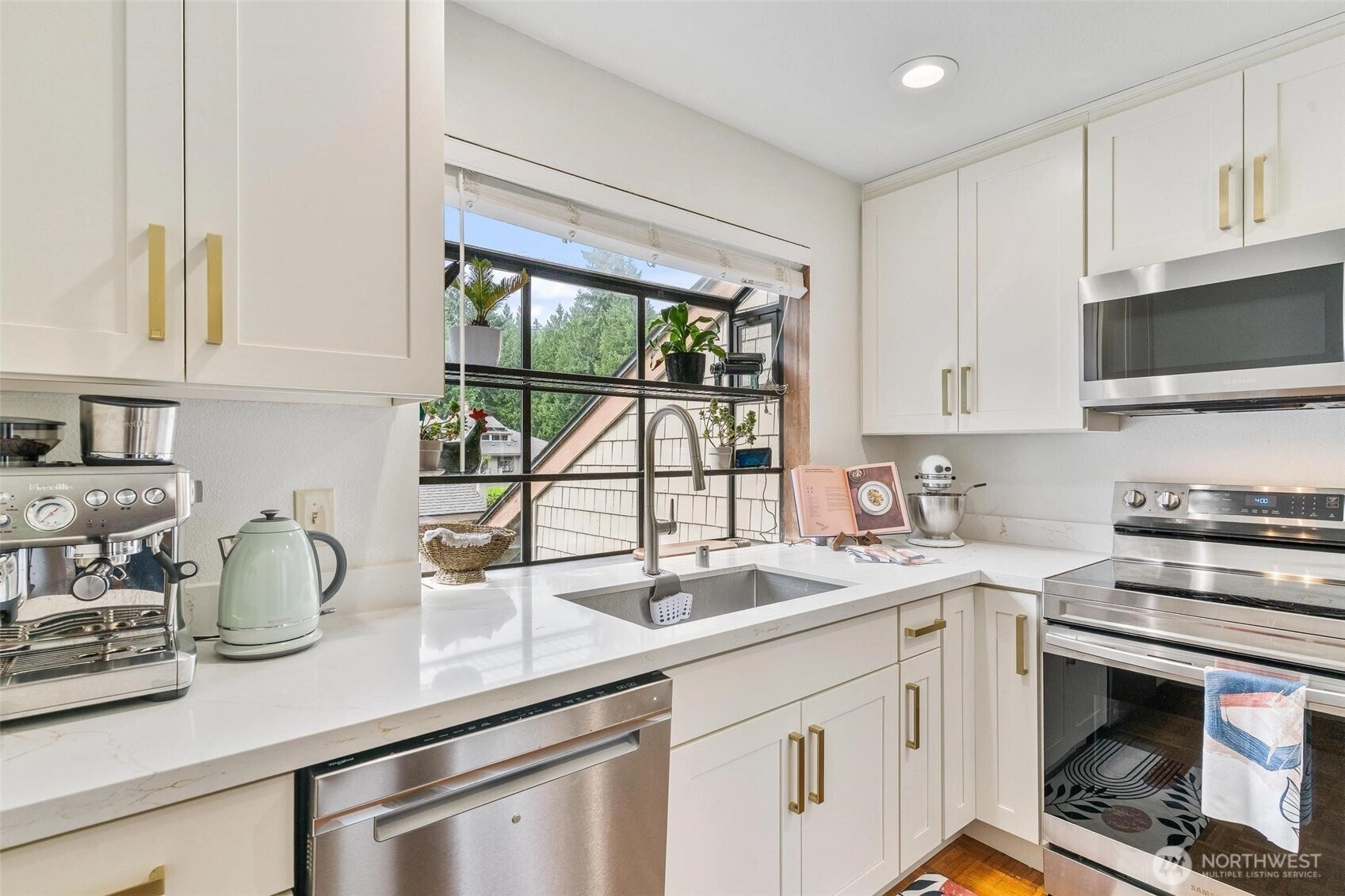 Top-floor end unit with private terrace—1 of only 3 in the complex. 2 beds, 1.5 bath on main, with a large loft upstairs. Vaulted ceilings in living room and updated with renovated kitchen, bathroom, & fireplace. New stove, microwave, and refrigerator (2023), plus new water heater (2024). Exceptional storage includes a large attic and 2 additional storage areas. 2 dedicated parking spots and abundant guest parking. HOA includes Water, Sewer, Garbage, Cable & Common Area Maintenance. No rental cap. Located minutes from 520, light rail, Google, Meta, Microsoft, and the 520 bike trail. Lake WA views, entry into the Eastside Rail Corridor Trail, Carillon Point and downtown Bellevue. A rare opportunity to live large in a prime location.