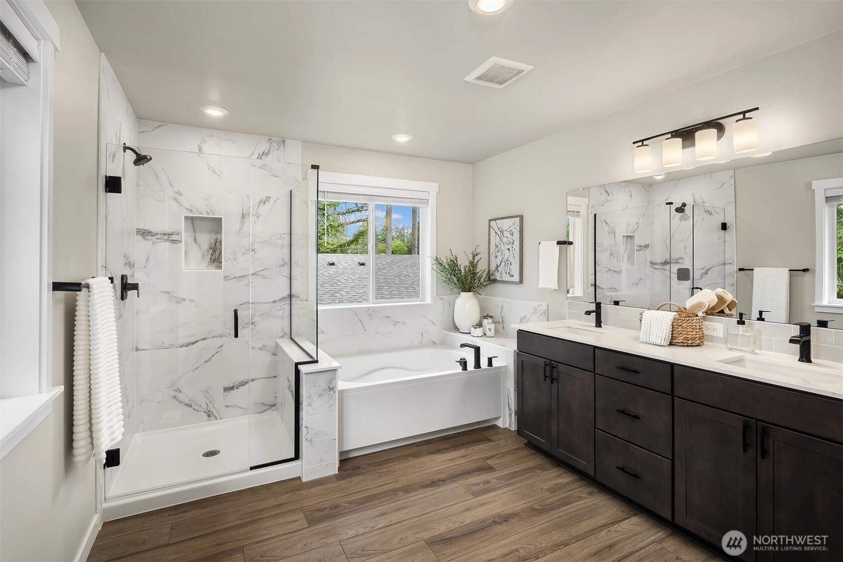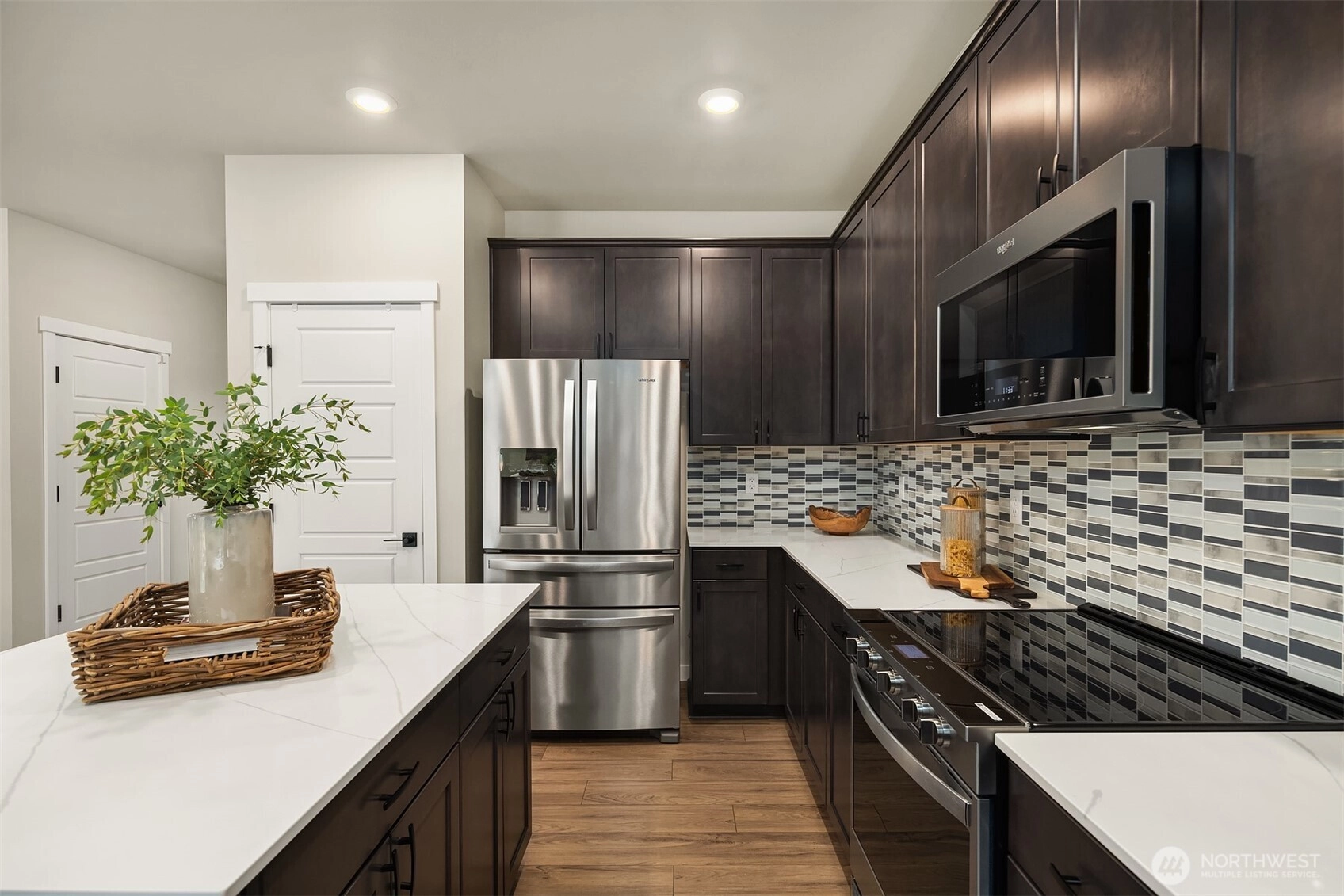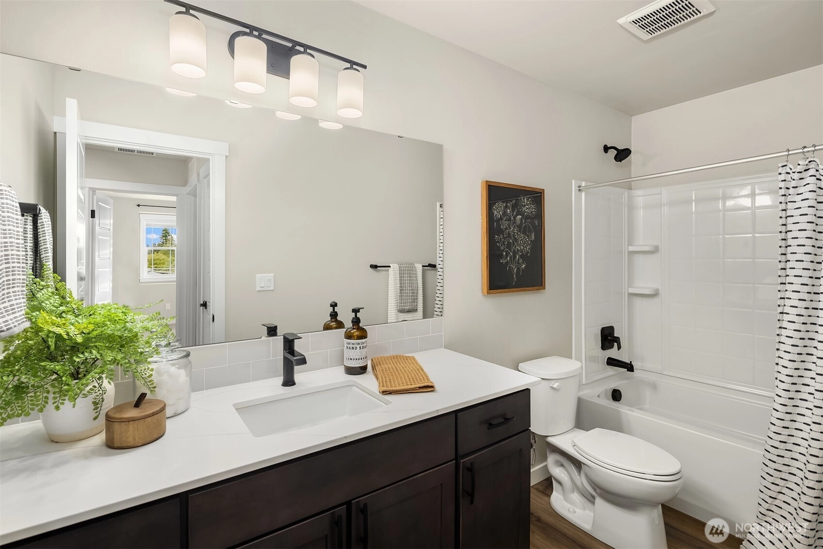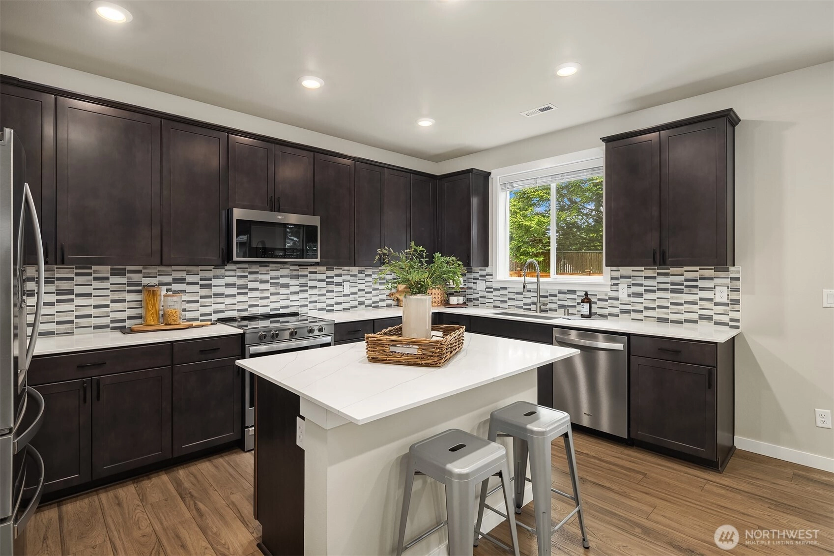 Better than new with central AC, blinds throughout & move in ready. Set back on private lot, in the desirable Montclaire neighborhood, showcasing quality upgrades throughout. The main level offers guest room and full bath. Upgraded laminate flooring & cozy gas fireplace. The gourmet kitchen features lovely wood cabinetry, quartz countertops and premium appliances. Upstairs, you'll find three additional bedrooms bonus room and 2 full bath. Spacious garage with EV charging port. Located just minutes from Kent Station, the Sounder Train, and with convenient access to Seattle and Bellevue. Pre-inspected for buyer’s peace of mind.
