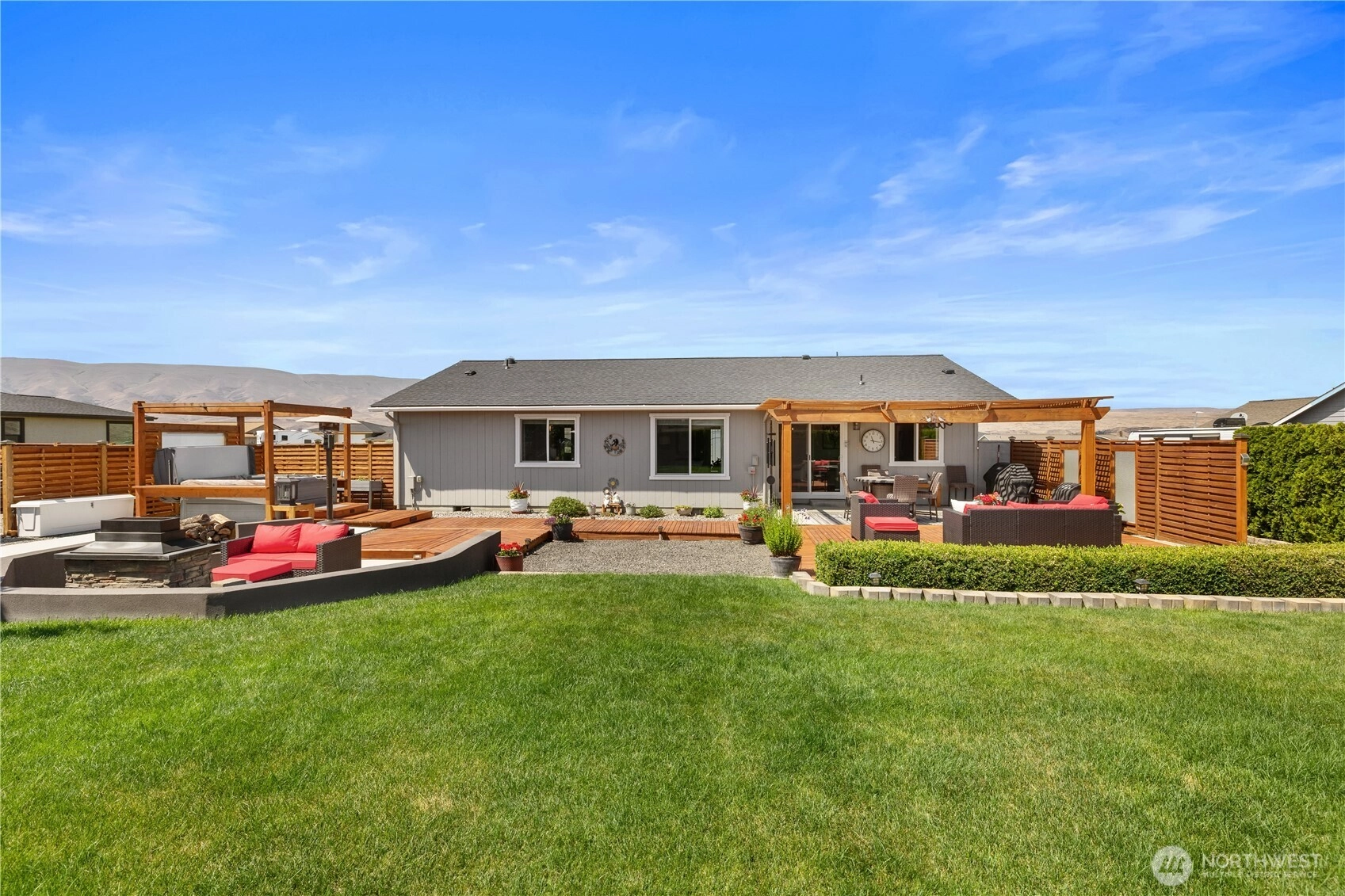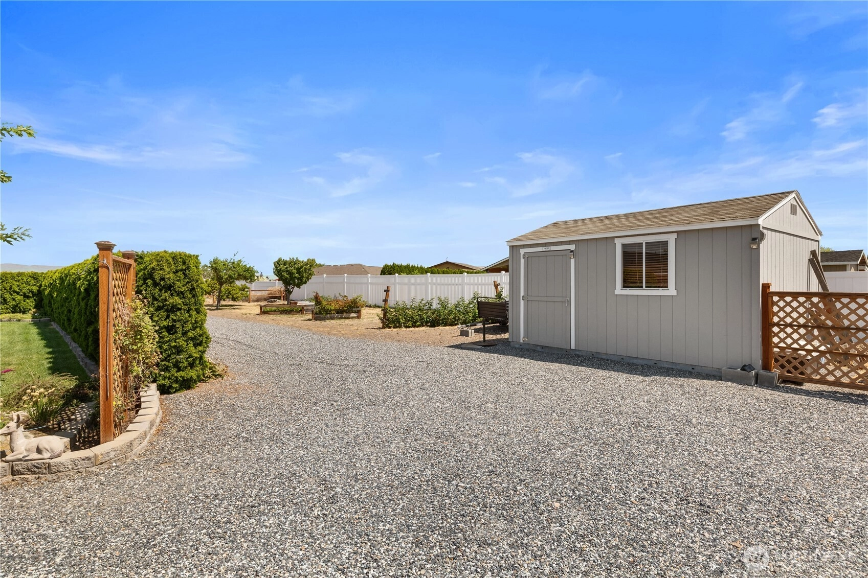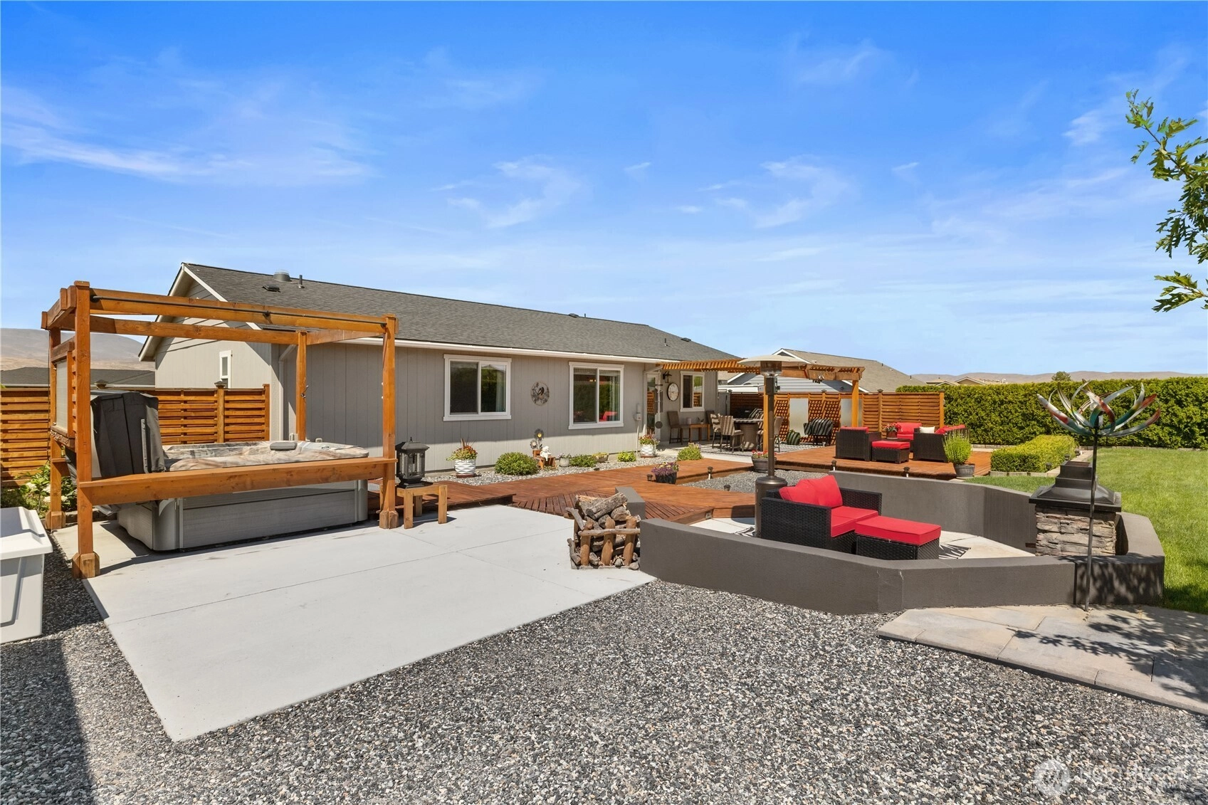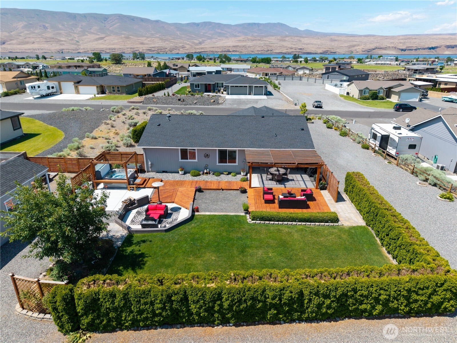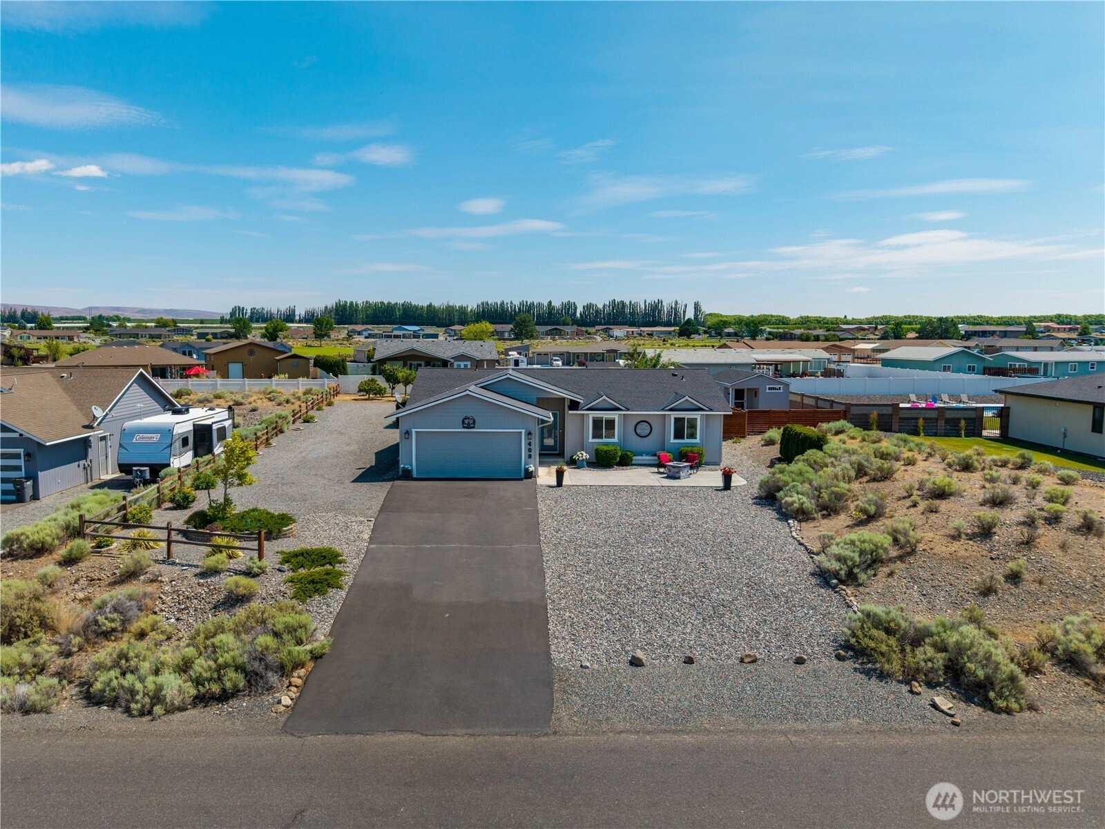 Live where every day feels like a getaway! This updated 3-bed, 2-bath home in Desert Aire is set on a spacious .50 lot with breathtaking views of the golf course, mountains, and Columbia River. Inside, the open-concept layout features vaulted ceilings, stylish flooring, and a modern kitchen. The primary suite offers a walk-in closet and private bath for your comfort. Step outside to a fully fenced backyard oasis—complete with expansive decking, multiple seating areas, a hot tub, privacy fencing, garden beds, RV parking & hookups, and several outbuildings. Enjoy access to community amenities including a boat launch, airfield, clubhouse, golf course, parks, community pool & trails. Ideal as a full-time home or a relaxing vacation retreat!