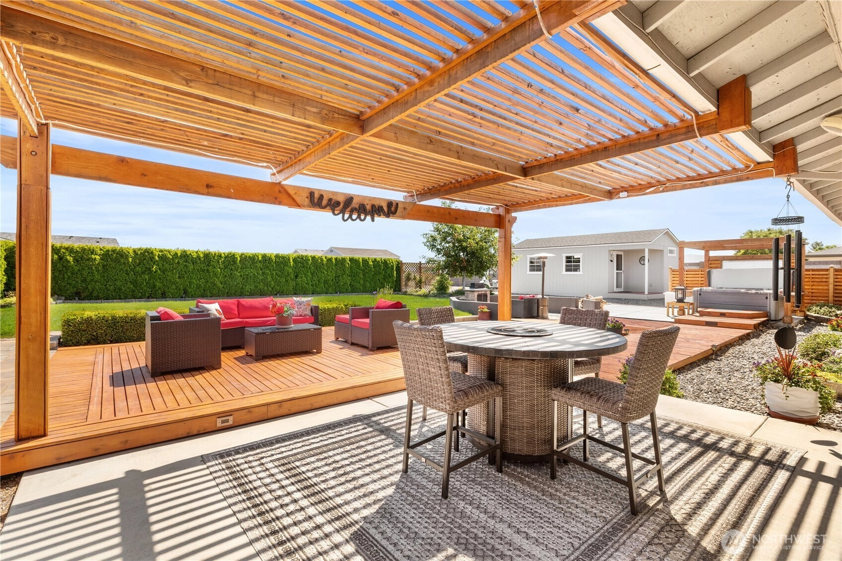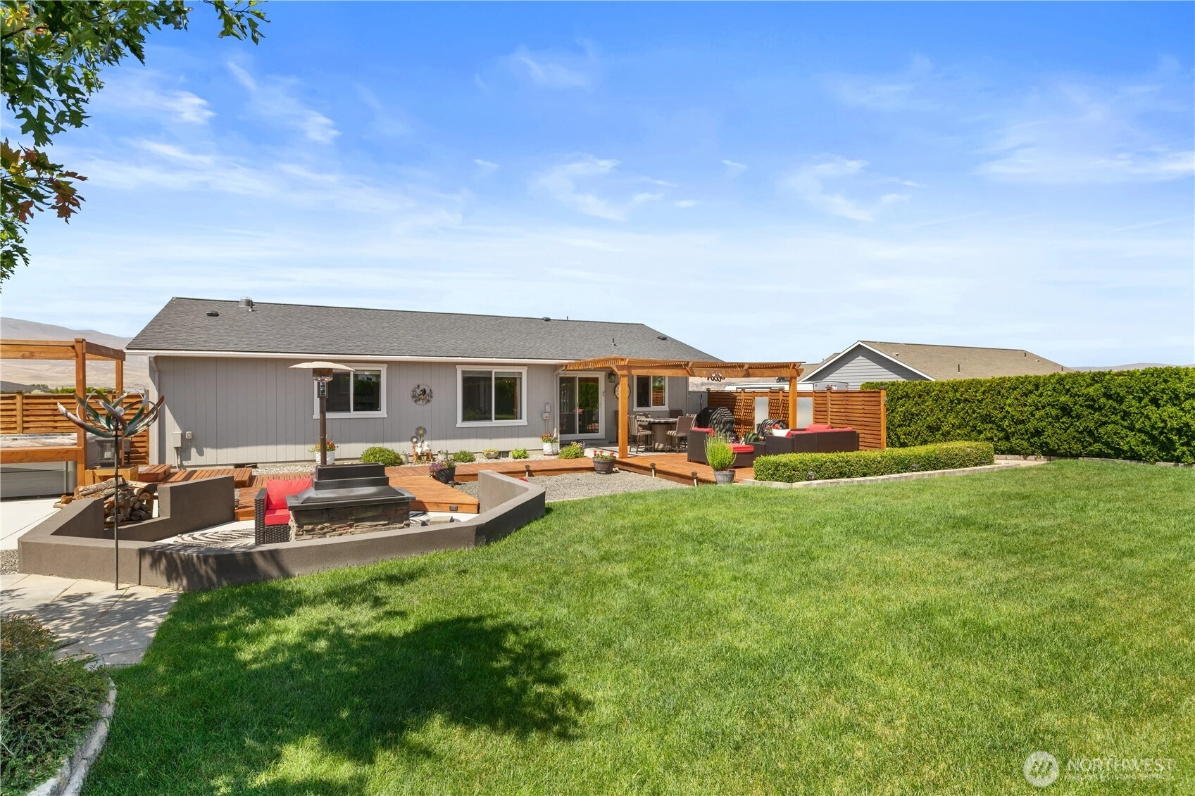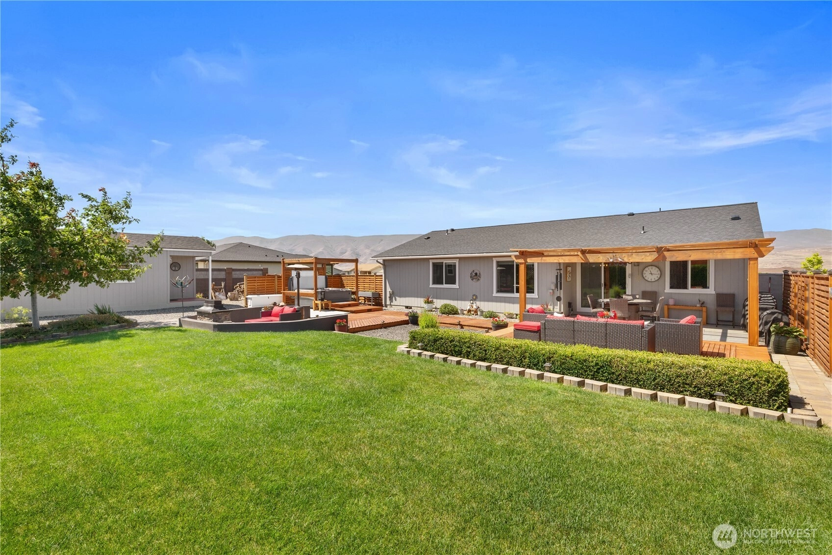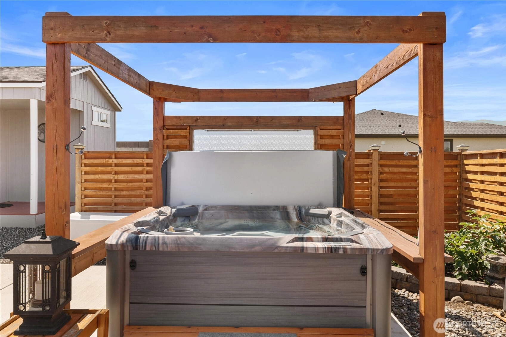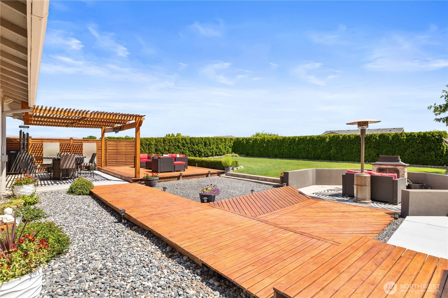 Live where every day feels like a getaway! This updated 3-bed, 2-bath home in Desert Aire is set on a spacious .50 lot with breathtaking views of the golf course, mountains, and Columbia River. Inside, the open-concept layout features vaulted ceilings, stylish flooring, and a modern kitchen. The primary suite offers a walk-in closet and private bath for your comfort. Step outside to a fully fenced backyard oasis—complete with expansive decking, multiple seating areas, a hot tub, privacy fencing, garden beds, RV parking & hookups, and several outbuildings. Enjoy access to community amenities including a boat launch, airfield, clubhouse, golf course, parks, community pool & trails. Ideal as a full-time home or a relaxing vacation retreat!