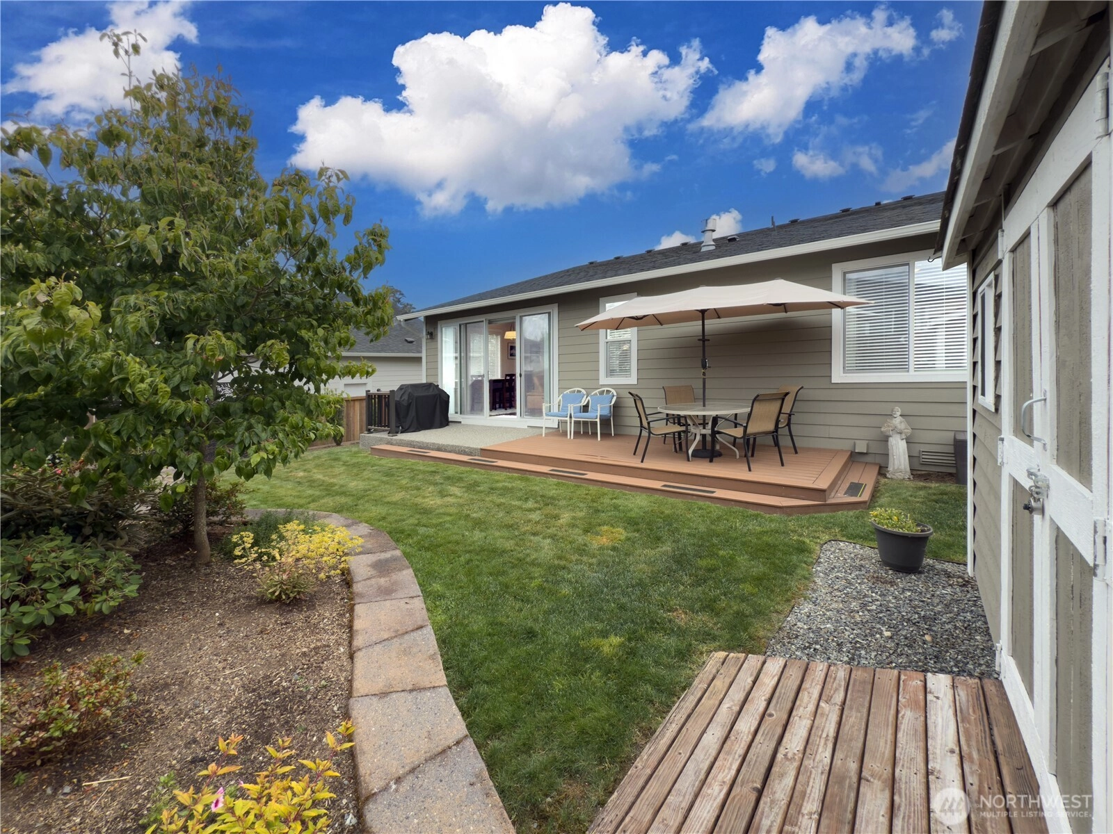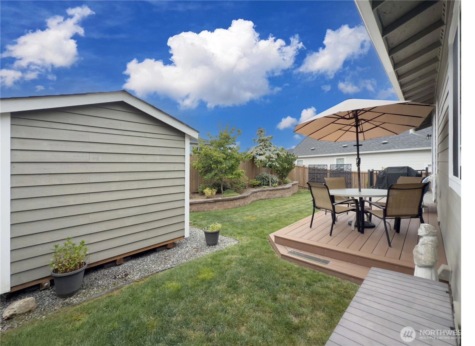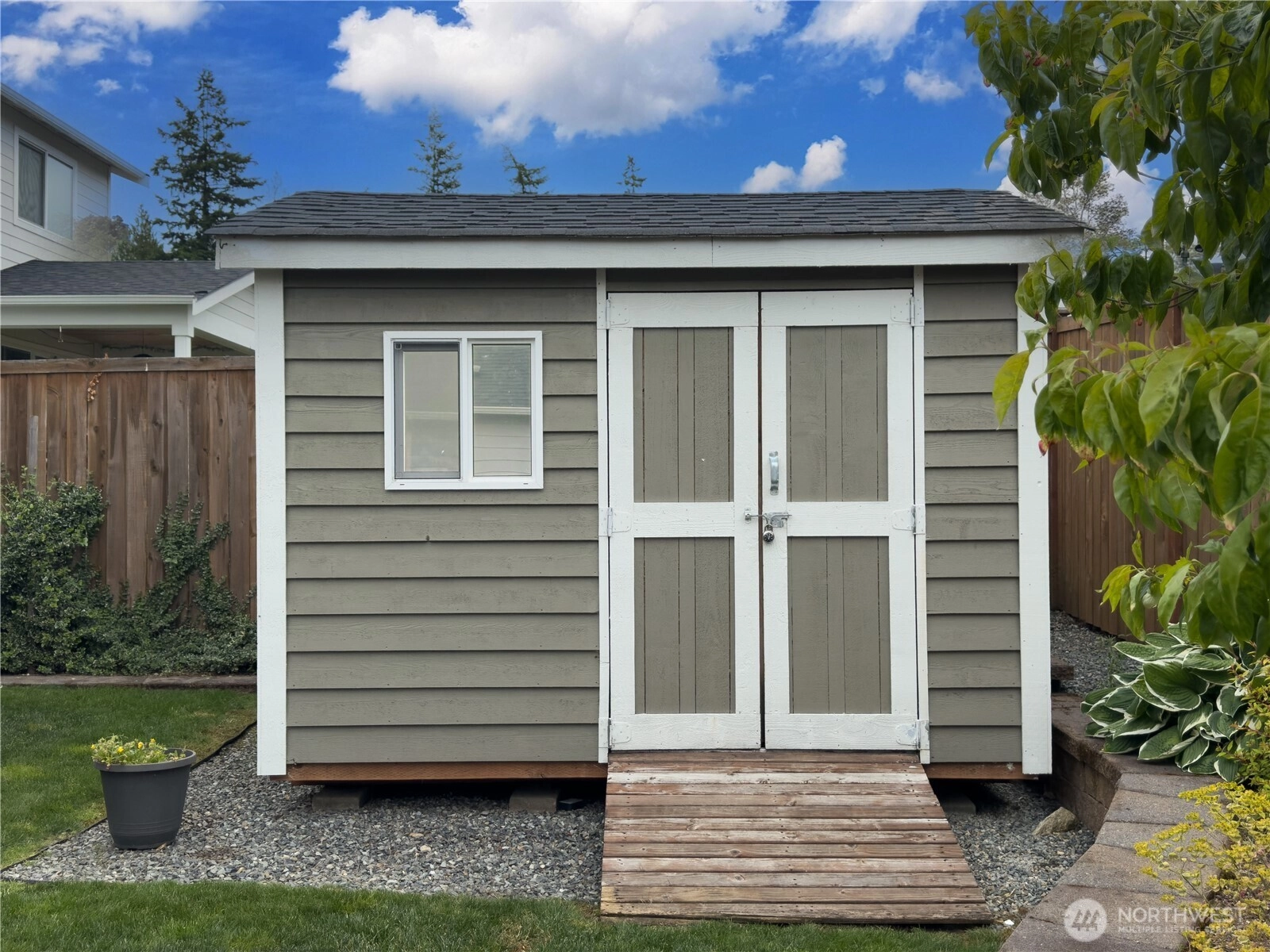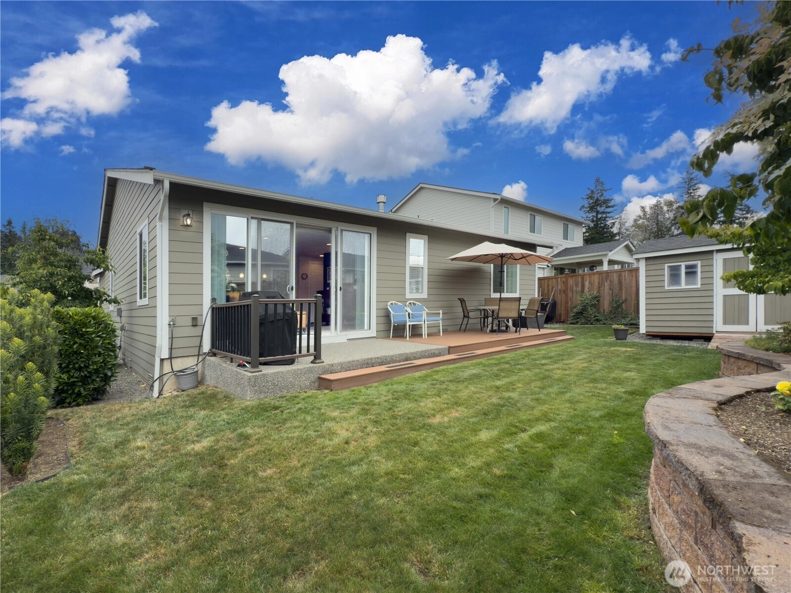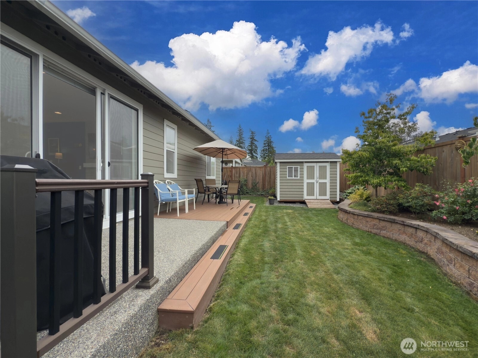 Welcome to this immaculate 2019-built better than new rambler has 1,425 sq ft of stylish living and over $50K in thoughtful upgrades. Soaring 9-ft ceilings, 8-ft doors, upgraded trim, and engineered hardwoods offer refined comfort. Stay cool with A/C and warm by the custom gas fireplace. The kitchen shines with granite counters, stainless steel appliances, gas range, and under-cabinet lighting. Outside, relax on the composite deck, garden in raised beds, or use the shed for storage. Even the garage is finished with a exterior side door, opener, and hanging storage. Low insurance w/ sprinkler syst & security. All appliances stay. Formal Dining/Bonus Room easily converted to 3rd Bedroom if desired. Located in the Lake Stevens Schools!