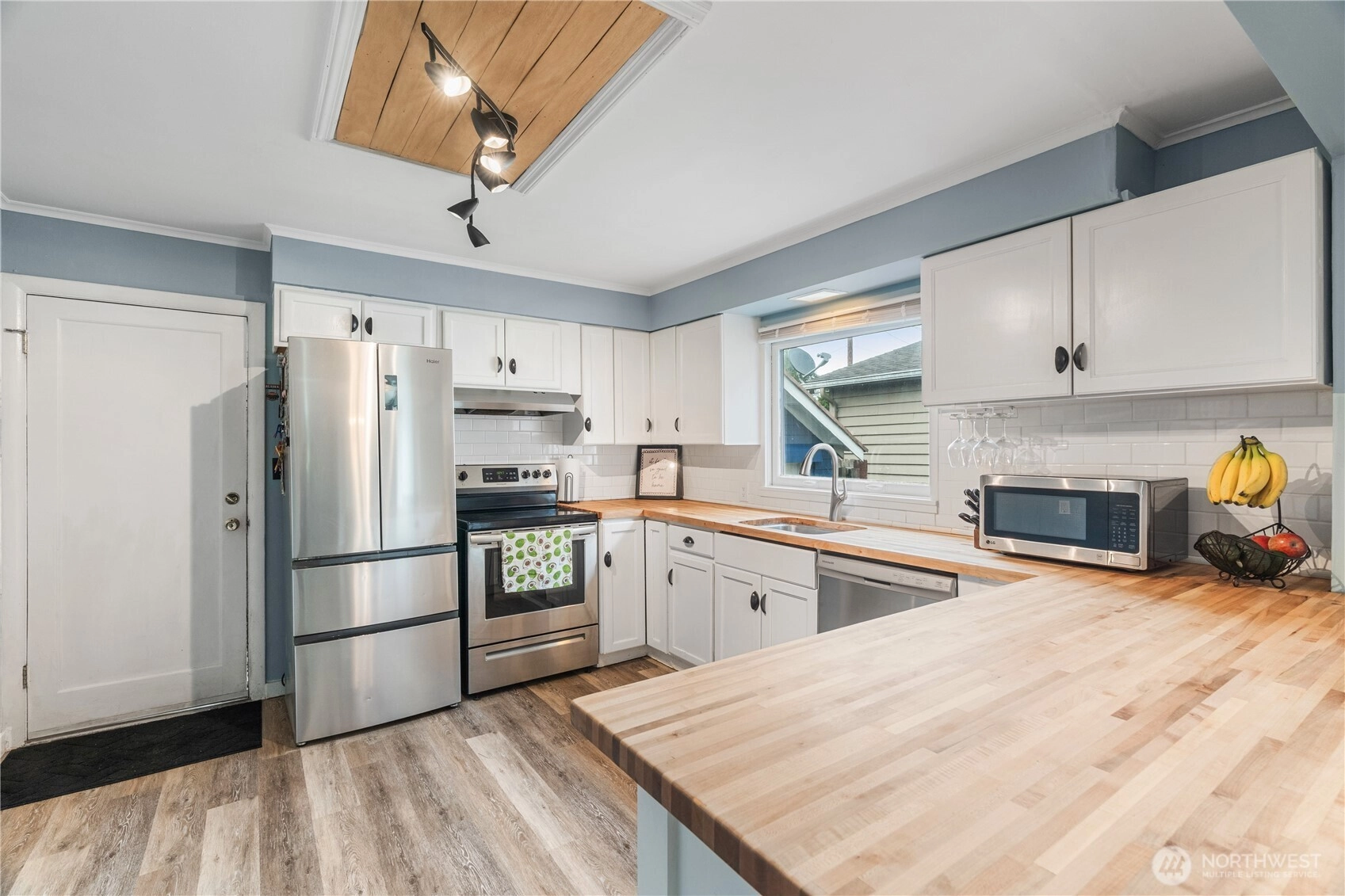 Thoughtfully updated and full of charm! The kitchen showcases stainless steel appliances, butcher block counters, and an eating space, all complemented by new LVP flooring throughout. Main level features a full bath, laundry room with prep sink, and a bedroom. Upstairs includes two additional bedrooms. Enjoy outdoor living year-round with covered front and back porches. Tucked just off the back porch, a separate bonus room offers endless possibilities as a shop, artist studio, or home office. A fully fenced backyard and 1-car garage add privacy and convenience. Upgrades include a new roof (2021), minisplits (2023), a 200 amp panel, and fresh exterior paint, making this gem completely move-in ready!