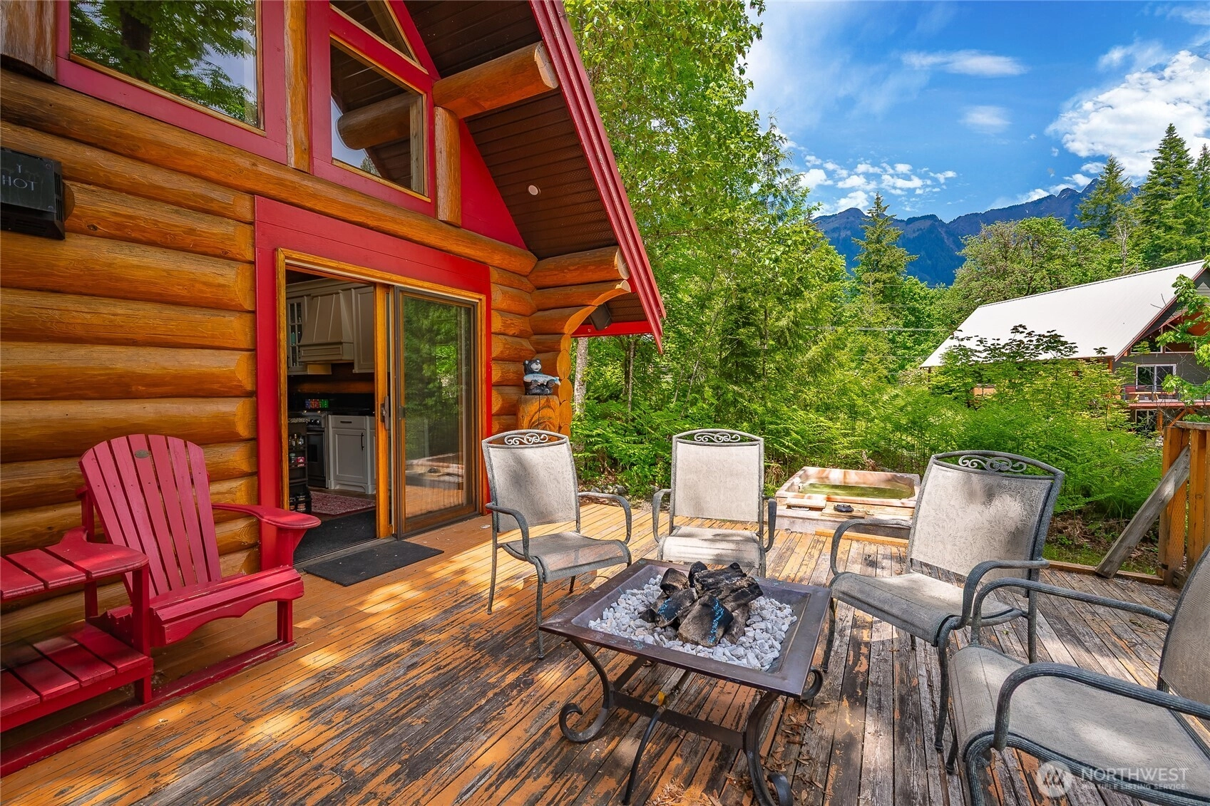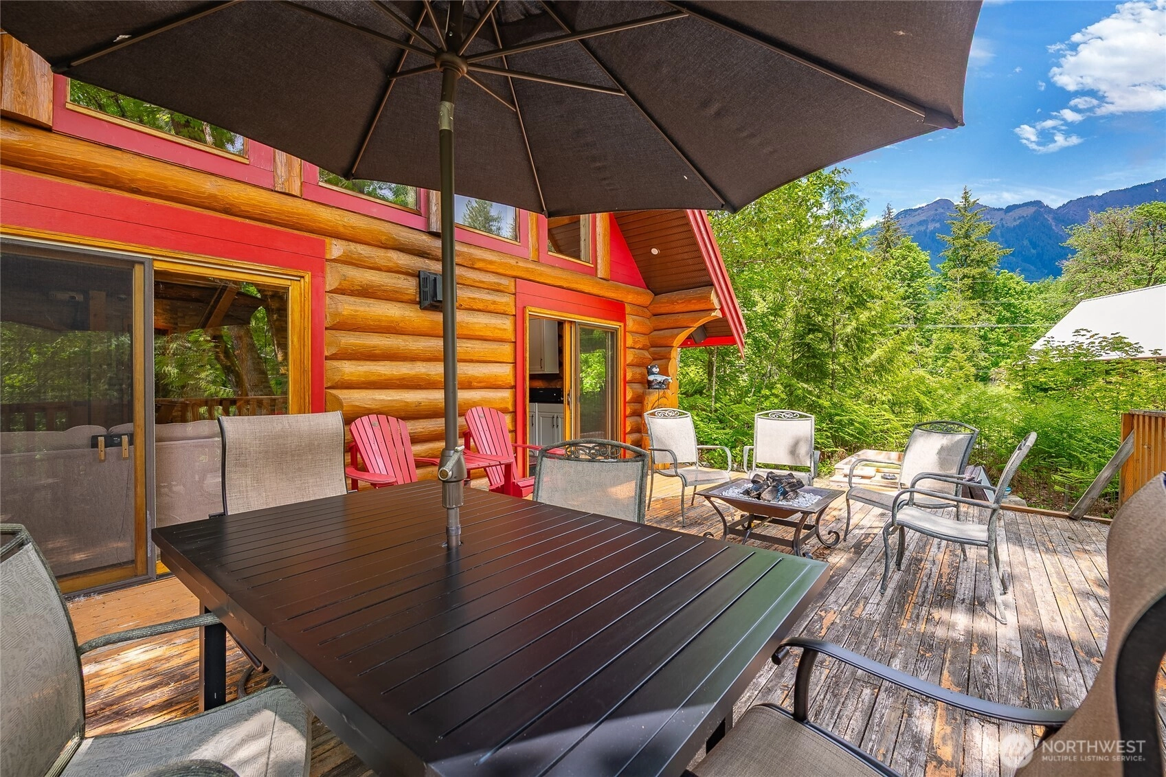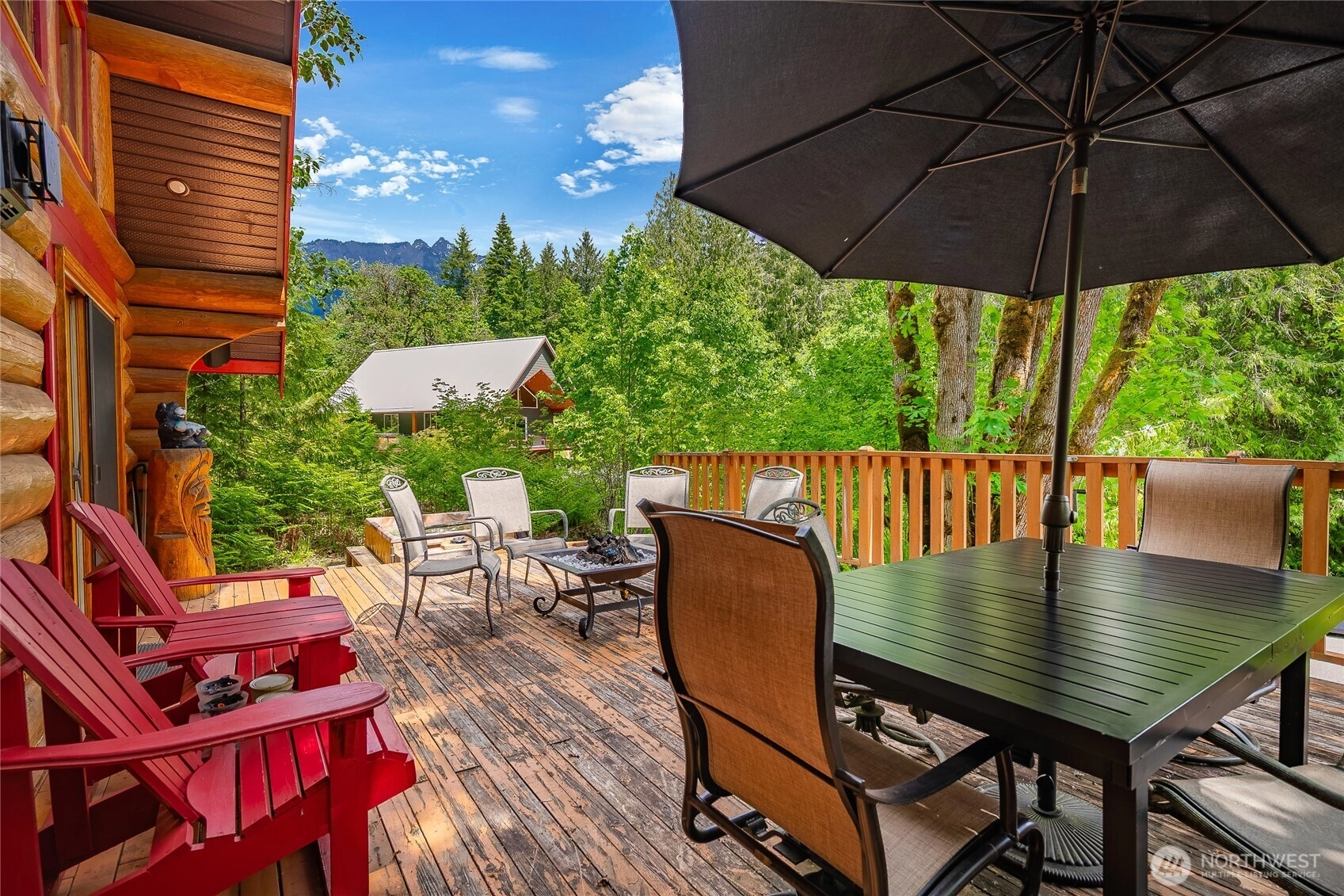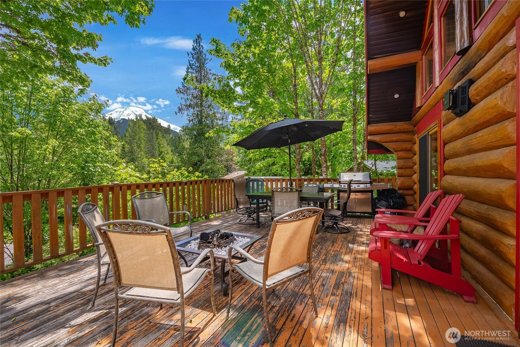 Amazing views of Mt. Baker from the front deck or inside! One of a kind, custom True Log cabin, logs sourced from British Columbia. Located in the Mt. Baker Rim gated community! The wall of windows will wow you, while you look out at the mountains from the living room or kitchen. The cabin boasts 2 bedrooms & a large loft space that sleeps at least 4. The front deck very spacious with BBQ, smoker and ample seating for everyone. The lot is large, open and aerie, with a private patio, string lights and fire pit. There is a very large standup crawl space to store your snowboards, skis and bikes as well as this space serves as the utility room. .30 minutes to Mt. Baker! Amenities include swimming pool, sauna, clubhouse, tennis courts, & more.
