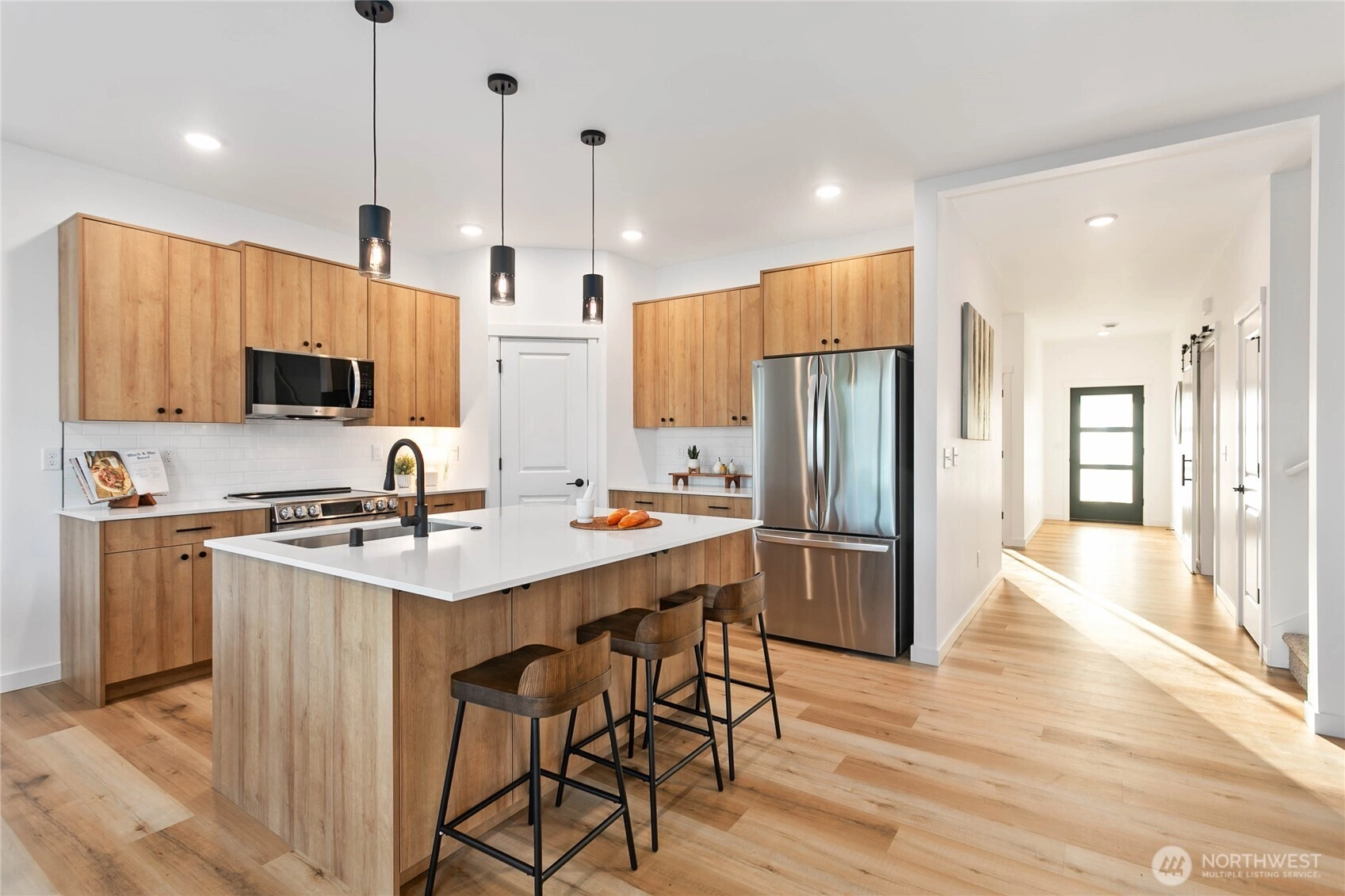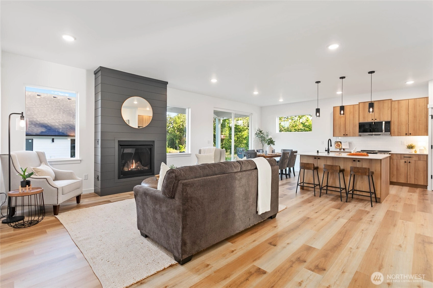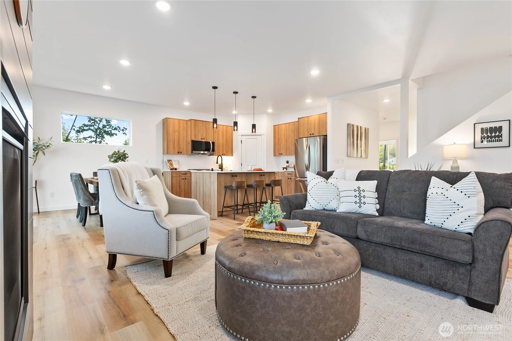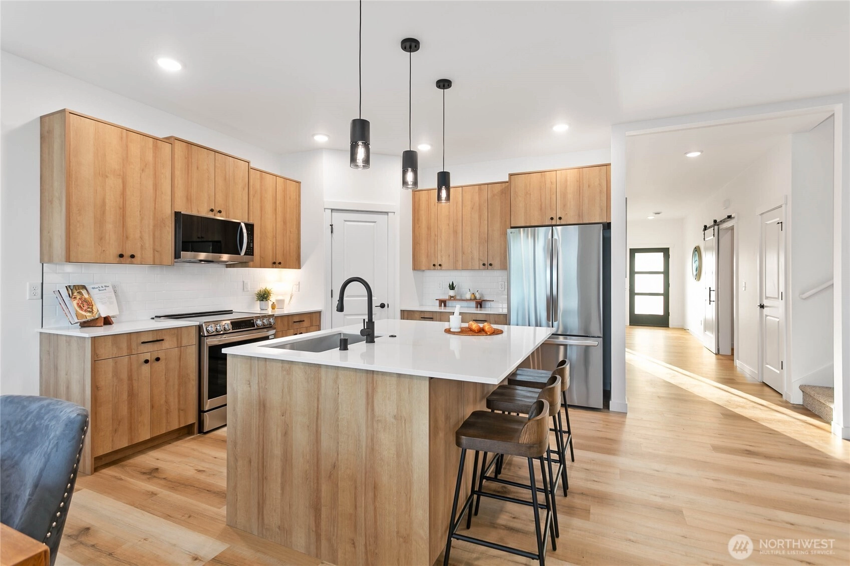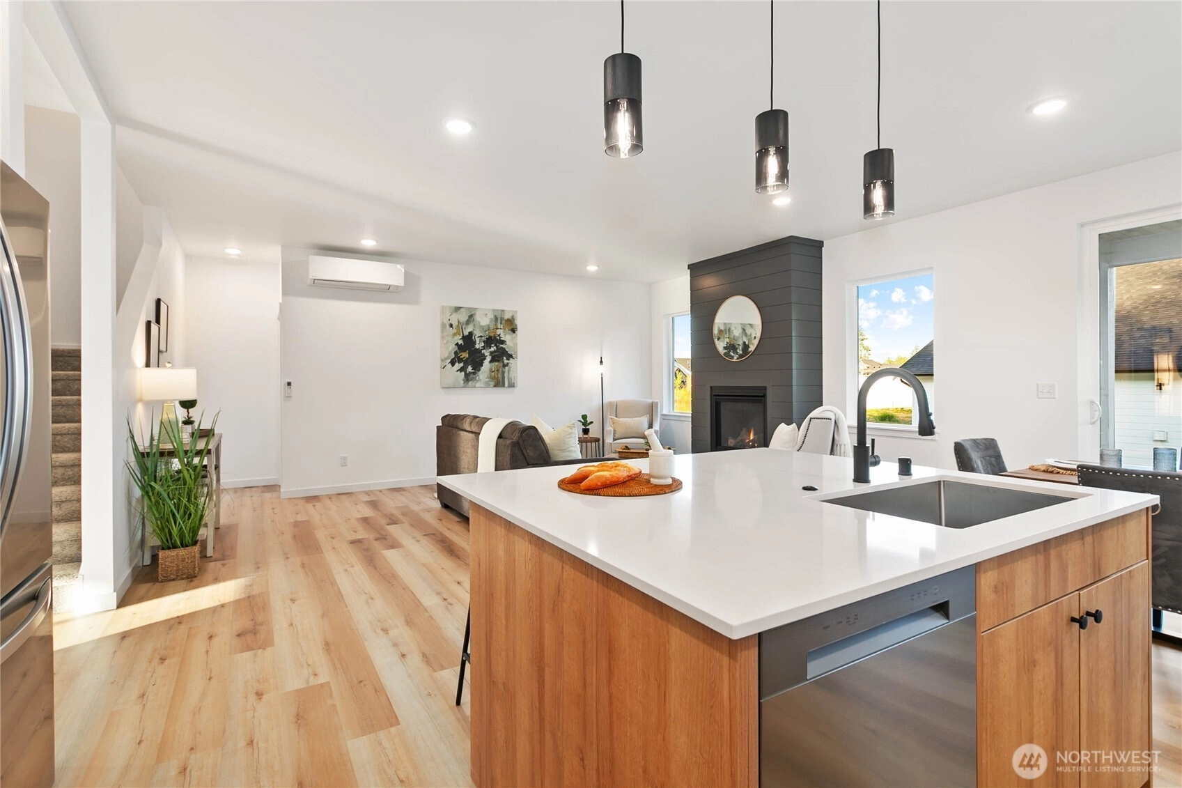 Experience modern living at its finest in the heart of Blaine's vibrant community! This beautifully crafted 4-bedroom, 3-bath home is designed with sleek finishes for ultimate comfort. Inside, you'll find LVP flooring, elegant quartz countertops, and soft-close cabinetry throughout. The kitchen boasts sleek brushed black fixtures, stainless steel appliances, and a spacious walk-in pantry. The serene primary bath features a floor-to-ceiling tile shower and a walk-in closet. Relax by the propane gas fireplace in the inviting living area. The primary bedroom and one additional bedroom, perfect as an office, are conveniently located on the main floor. *Enjoy savings with our Preferred Lender: .75% Lender Credit and $5,000 Seller Credit.