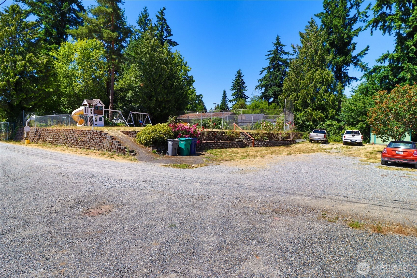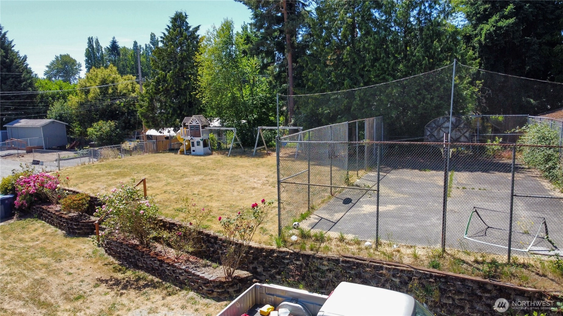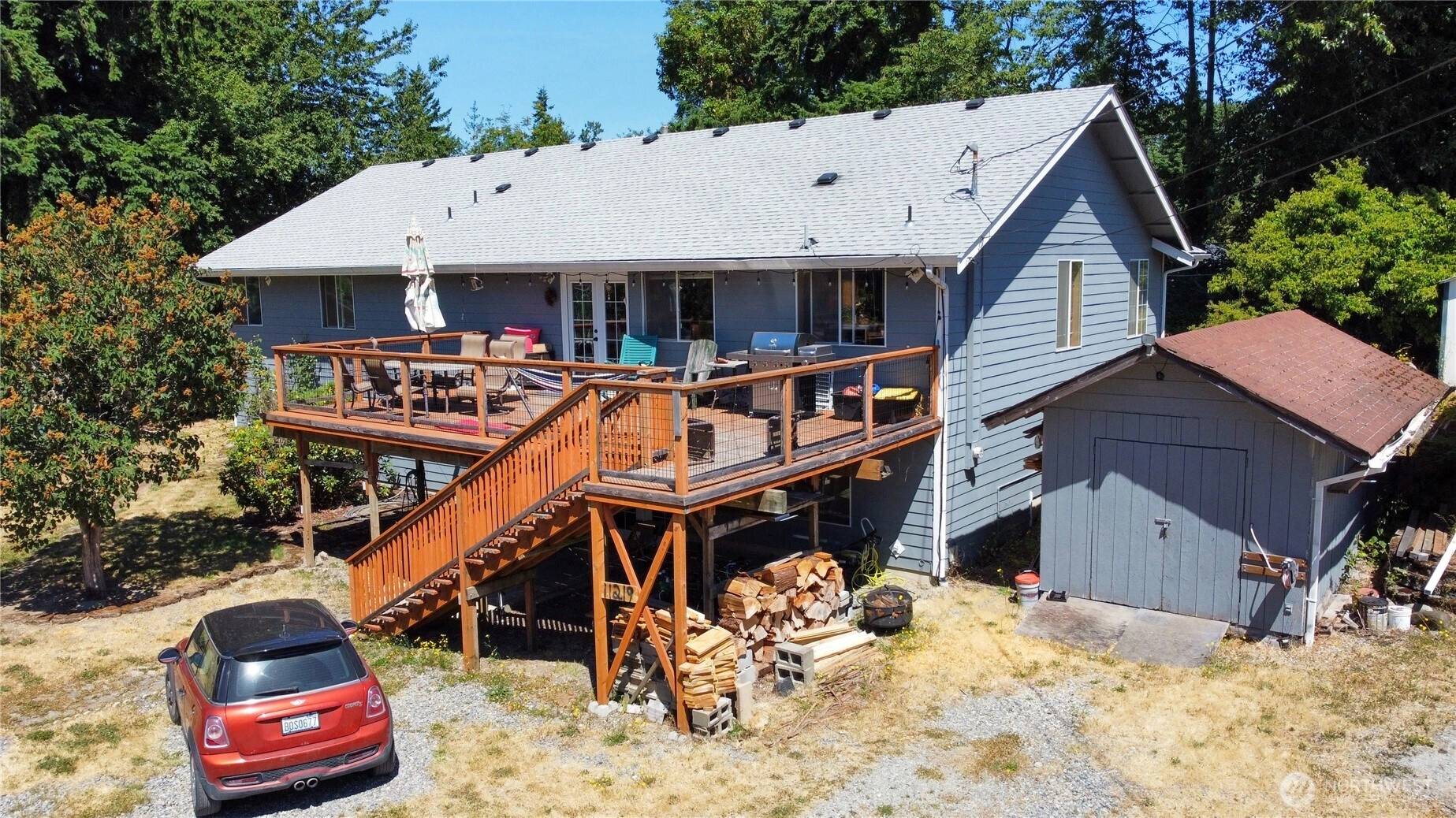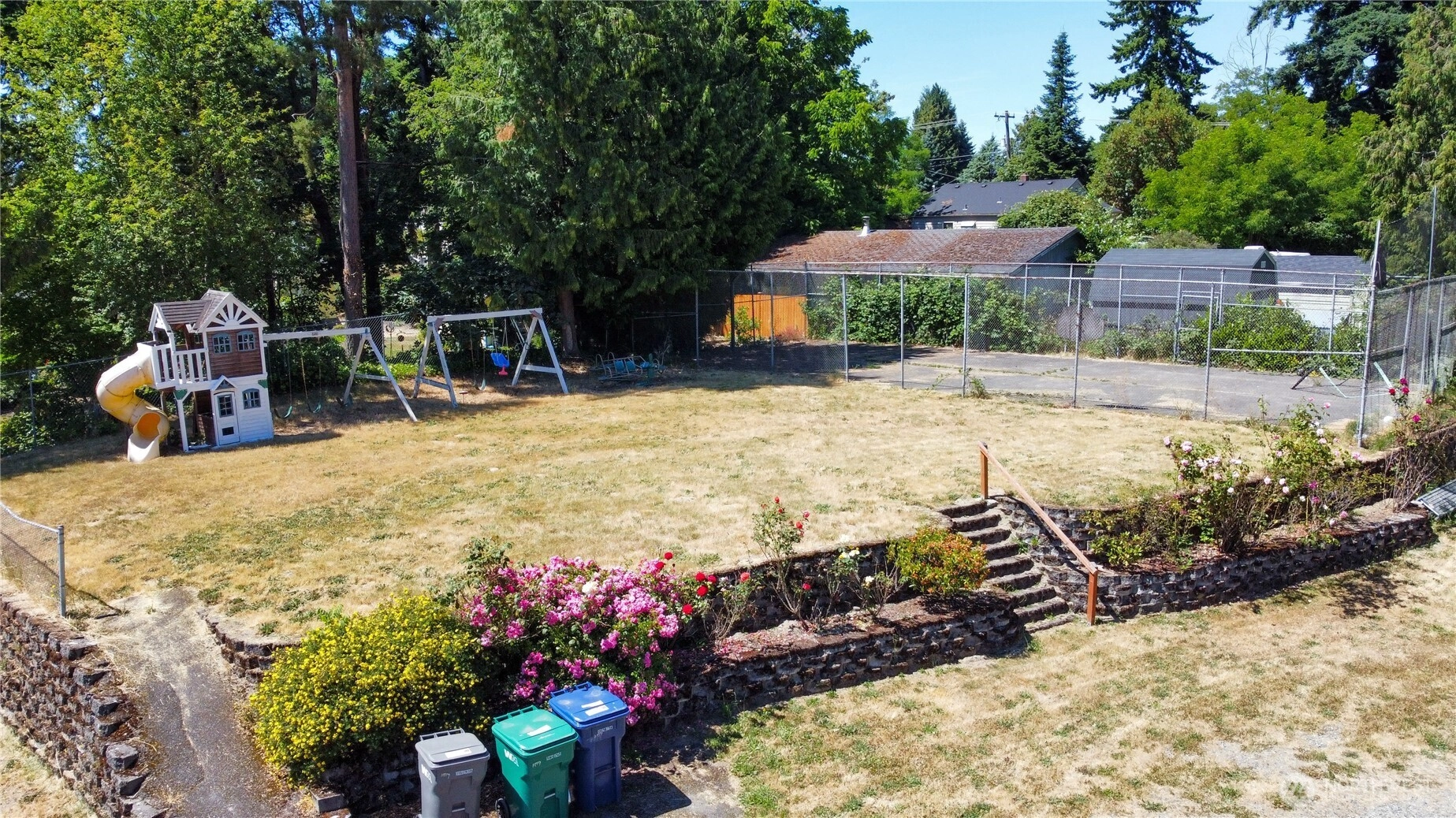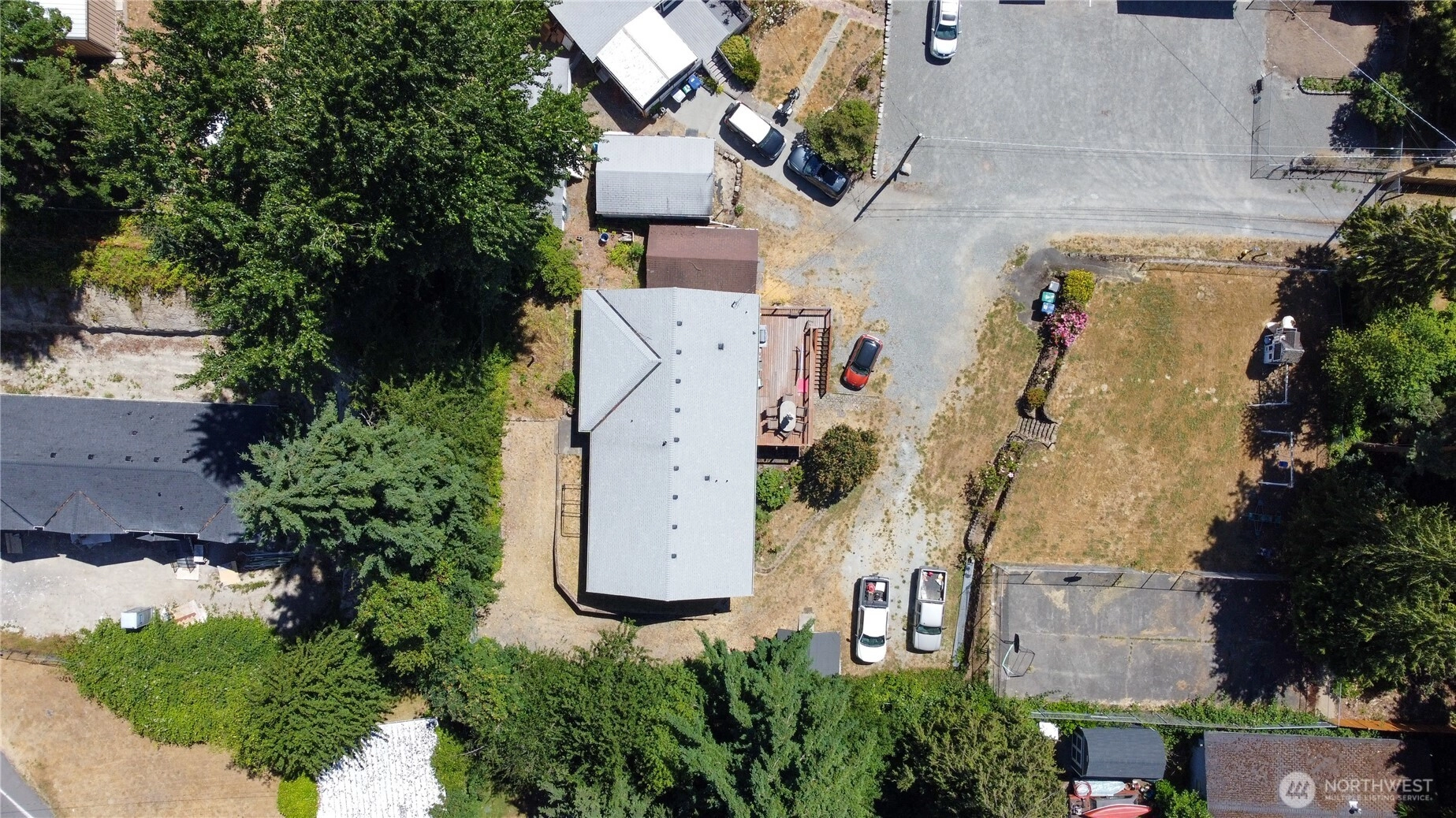 This custom home was built in 1992 by Terhune Homes. The 3400 sq. ft. house sits on a Huge 18,700 sq ft lot. Great potential for Multigenerational living. The upper level has 3 beds 2 full baths & a large living room. Large open family room off of the kitchen can be used as a dining area or a great family room. French doors lead out to the newer deck and railings. The lower living area has a separate & level entrance. There are 2 bedrooms downstairs a full bath, full kitchen, living and dining room, bonus room or office, laundry room and storage. Large property 18,700 sq ft. Possible build a DADU or your Dream home on the large, attached lot. (buyer to verify) Huge sports court and 2 additional outbuildings. Roof approximately 6 years old