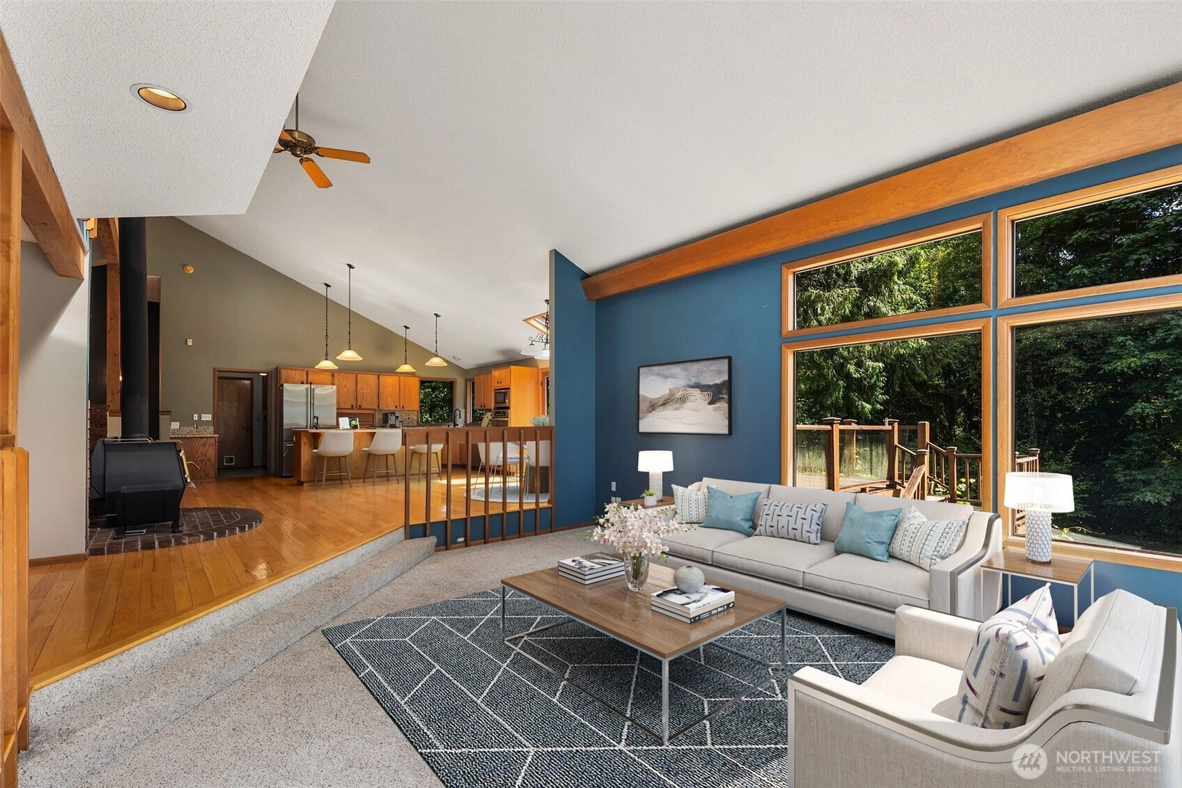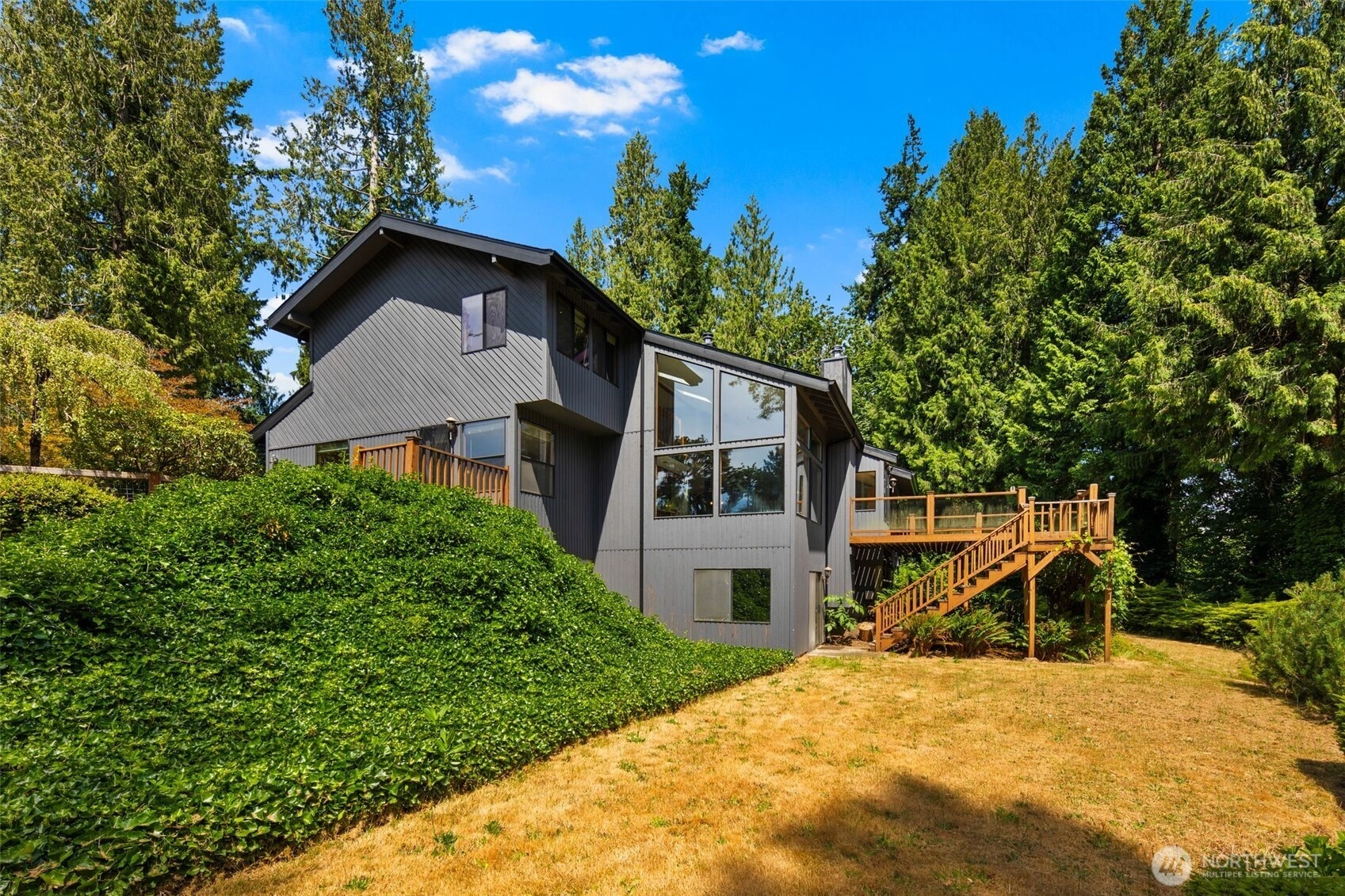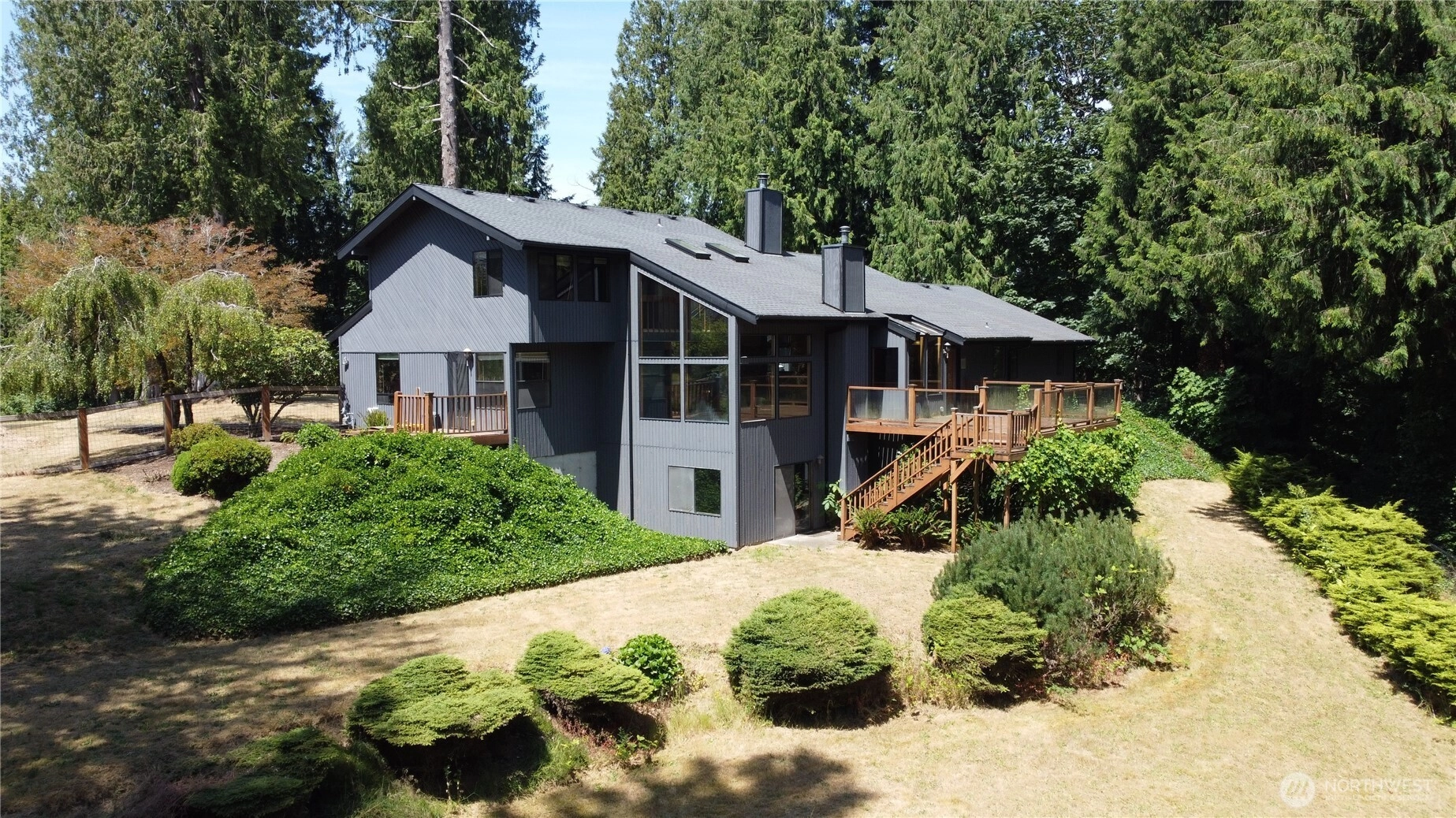 A Private Northwest Retreat! This custom-built home is tucked away in a peaceful, park-like setting with easy-care landscaping. Step inside to a bright and spacious open-concept layout featuring vaulted ceilings, a gourmet kitchen, formal dining area, breakfast nook, sunken living room with wet bar, and a beautiful open staircase leading to the loft and bedrooms. The main-level primary suite includes a luxurious double shower, private door to deck, and access to both a sunroom and a private sauna, perfect for unwinding while taking in the stunning views. The expansive daylight basement offers endless possibilities for living, entertaining, or relaxing. More than just your next home, this is your forever home.