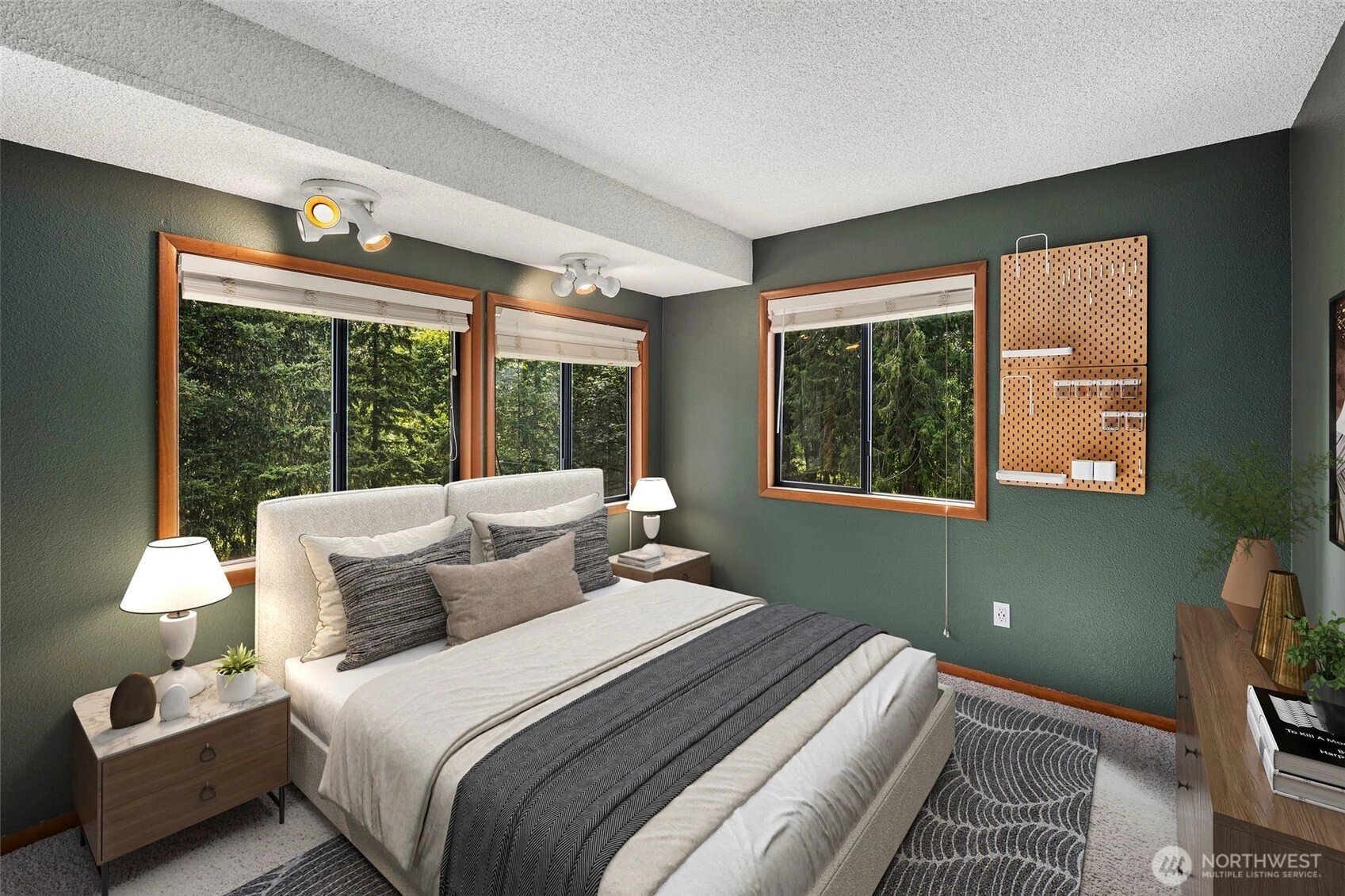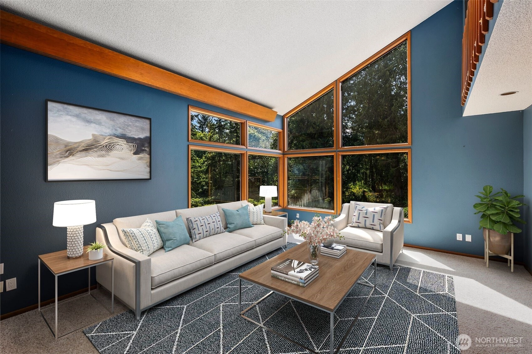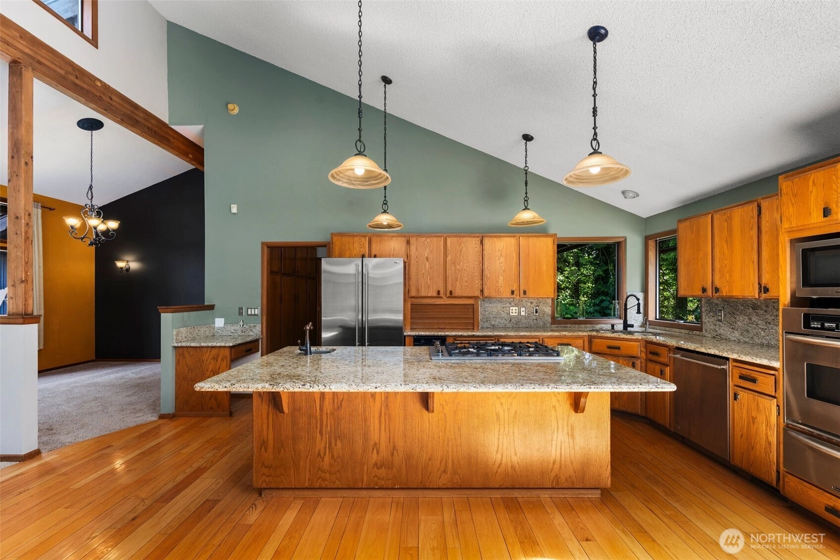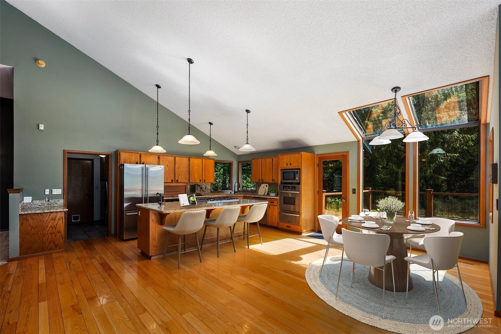 A Private Northwest Retreat! This custom-built home is tucked away in a peaceful, park-like setting with easy-care landscaping. Step inside to a bright and spacious open-concept layout featuring vaulted ceilings, a gourmet kitchen, formal dining area, breakfast nook, sunken living room with wet bar, and a beautiful open staircase leading to the loft and bedrooms. The main-level primary suite includes a luxurious double shower, private door to deck, and access to both a sunroom and a private sauna, perfect for unwinding while taking in the stunning views. The expansive daylight basement offers endless possibilities for living, entertaining, or relaxing. More than just your next home, this is your forever home.