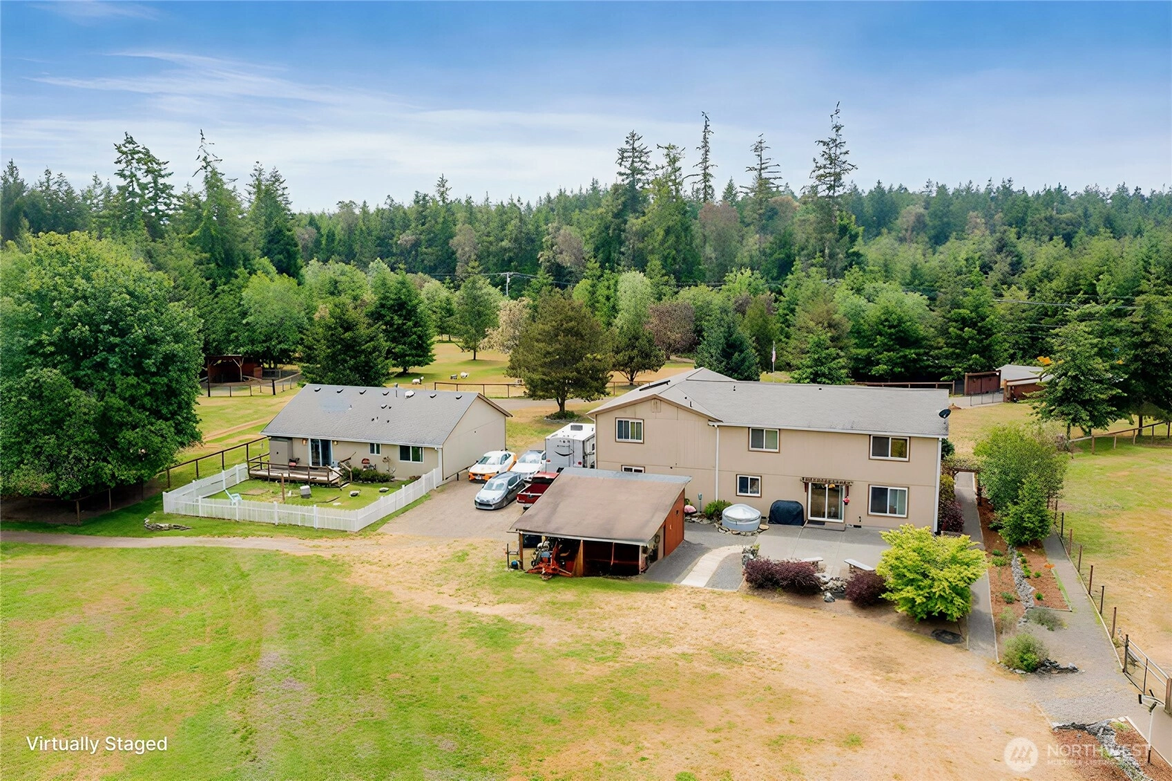 Turn-key 4BR/3BA custom home with a 3 bdrm ADU Rambler on a fully equipped hobby farm! Enjoy 3,000 sq ft of updated living space w/AC, jetted tub, office, digital climate controls & ceiling fans in all BRs. Outdoors: 7.35 Acres, 3 fenced pastures, horse round pen, ATV trails, chicken coop, duck enclosure w/plumbed pool, 200 sq ft shed, RV hookup, EV-ready garage & generator plug-in. Relax w/water feature, hot tub & fire pit. Gated entry w/remotes & package slide. ADT security, high-speed DSL. ADU w/ 1200 sq ft, 3BR/2BA, garage & fenced yard. Prime location—school bus stop at driveway, 2 min to Evergreen Elem, 11 min to Key Center, 29 min to Costco, near Joemma & Penrose Parks. A rare blend of comfort, space & rural charm!