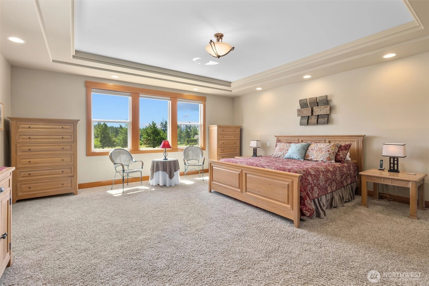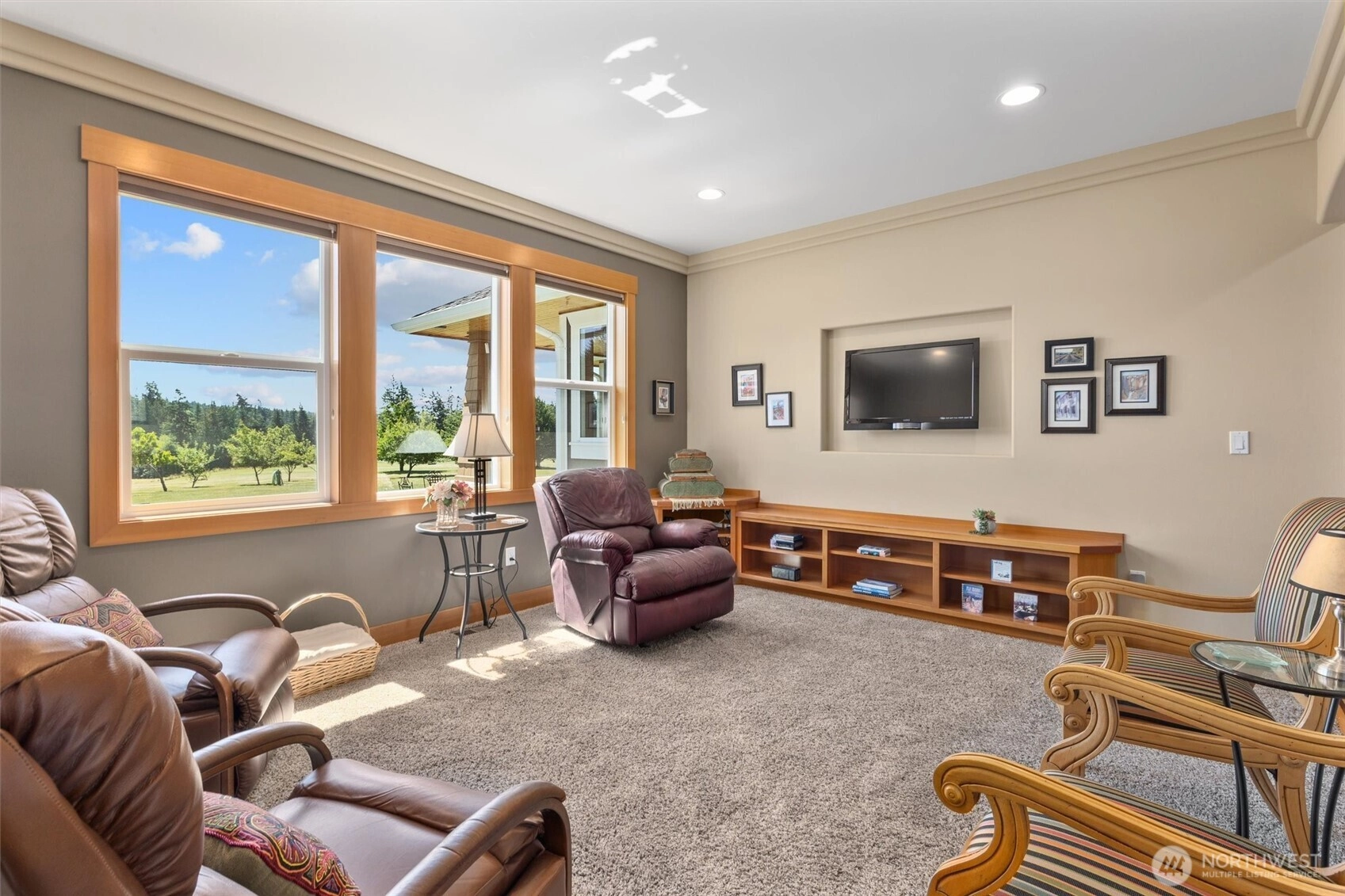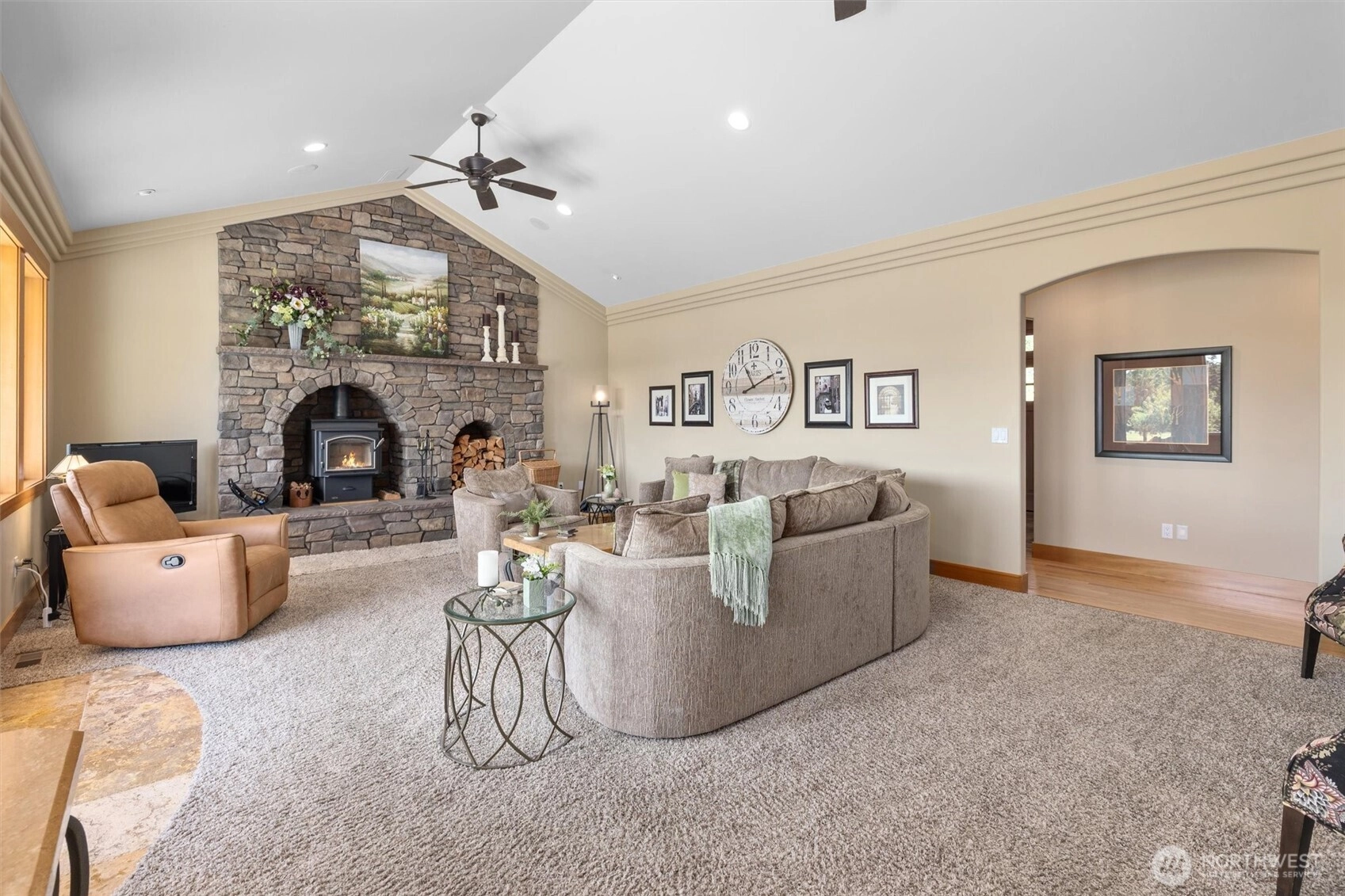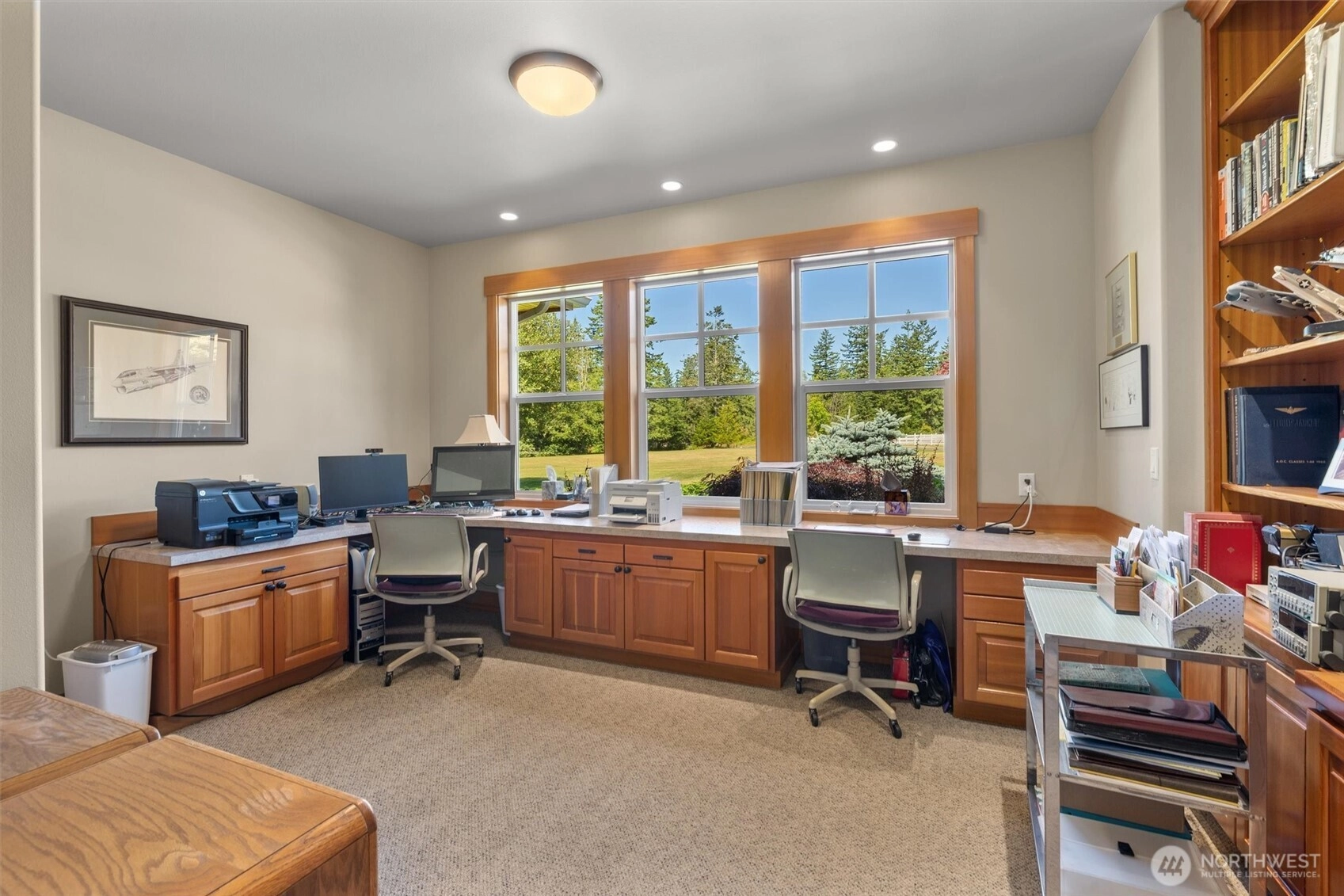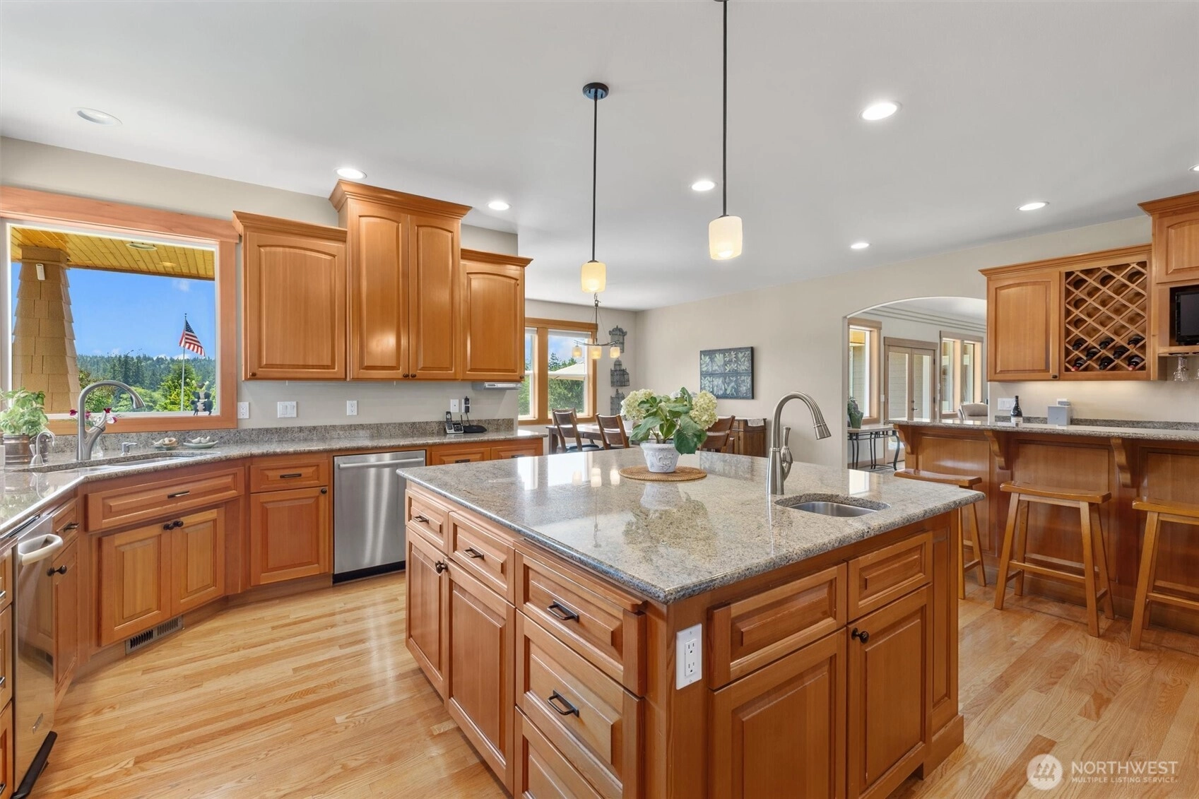 Welcome to your westside Camano Island sanctuary! Set on 10 acres of sunny fields & evergreens, this nearly 4,000 sq. ft. craftsman rambler blends elegance w/relaxed island living. Oak floors w/inlays & coffered ceilings frame a gourmet kitchen w/granite counters, prep island, stainless appliances & wine bar. Entertain in the formal dining room, enjoy the grand stone fireplace, or relax in the den/rec room. The spa-like primary suite is a private retreat, while 2 more bedrooms PLUS a large office offers versatility! Main house has it's own 3-car gar. + there is a HUGE 2,200 sq. ft. shop w/14’ ceilings-fits an RV & includes a studio area for extended use/guests. Fruit trees, sprinklers & manicured grounds complete this exceptional property!