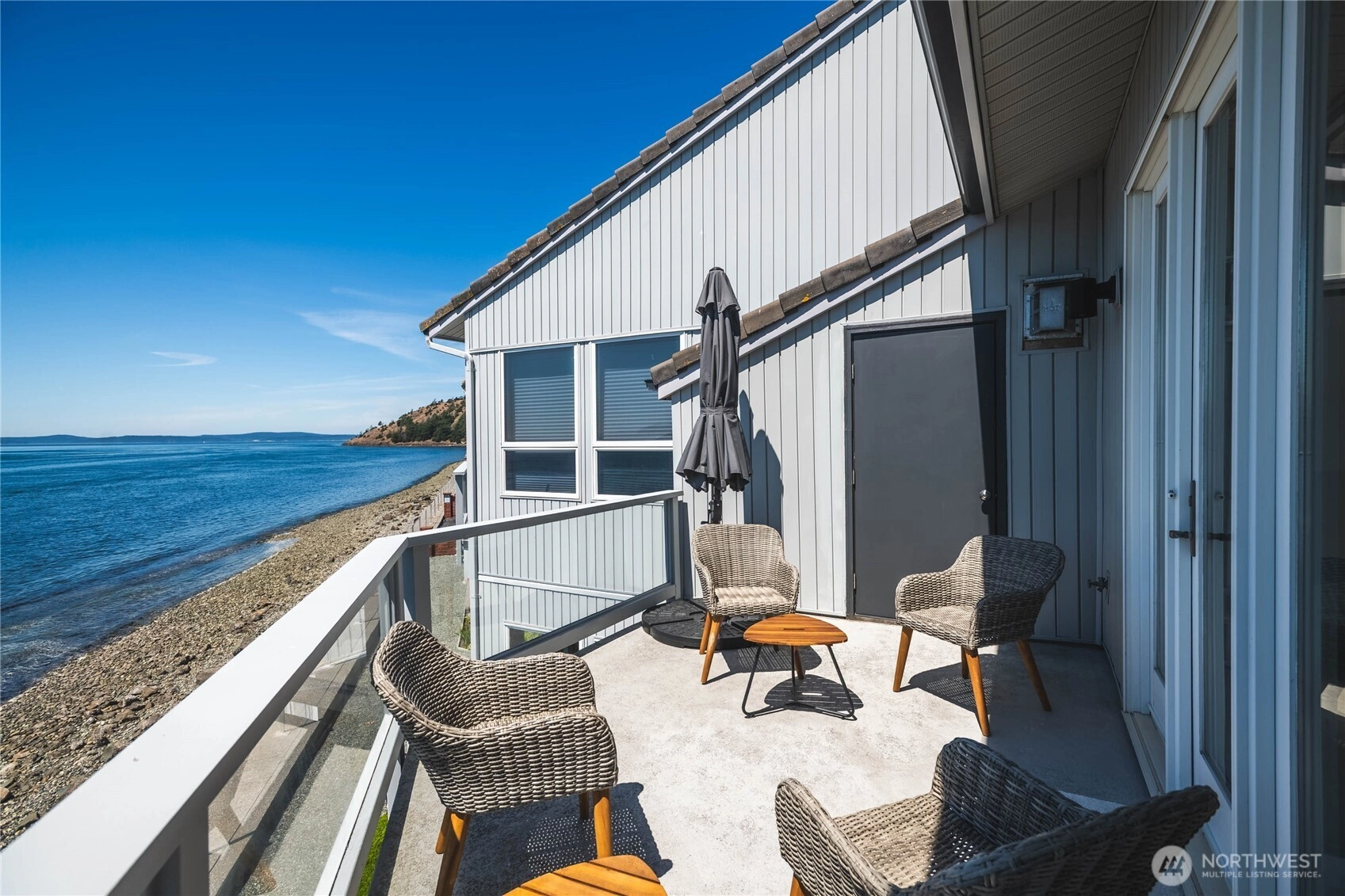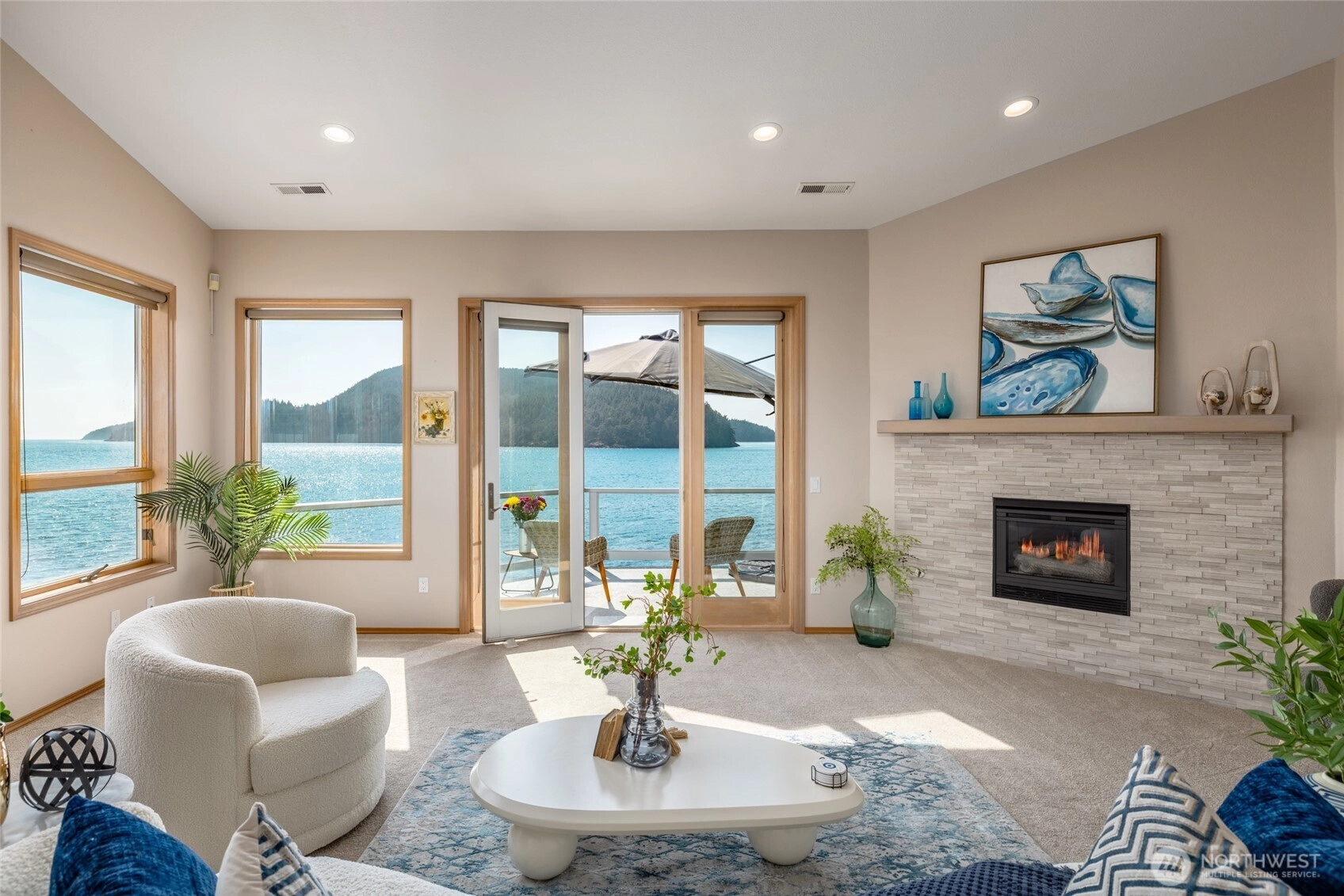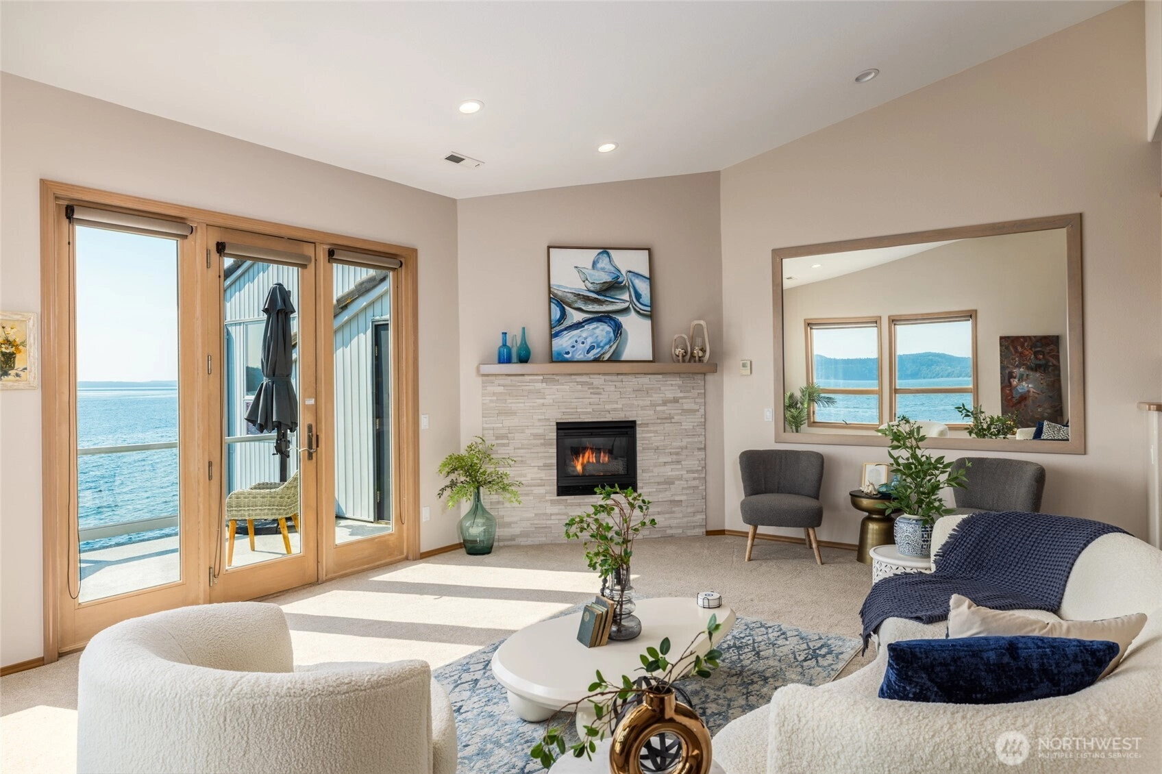 Waterfront Living large! Remodeled in 2019, this exquisite 2-bedroom condo by Burrows Bay offers unending views, sunsets, wildlife and many special features. Quartz countertops, LED lighting, skylights, new flooring and a lot of extra storage. With nine-foot ceilings, a private deck with storage, enclosed garage (with locked storage unit) and an additional outside parking space. Skyline amenities include tennis and pickle ball courts, waterfront parks, and clubhouse. The best Anacortes has to offer! These units don't come on the market often, don't miss this opportunity!