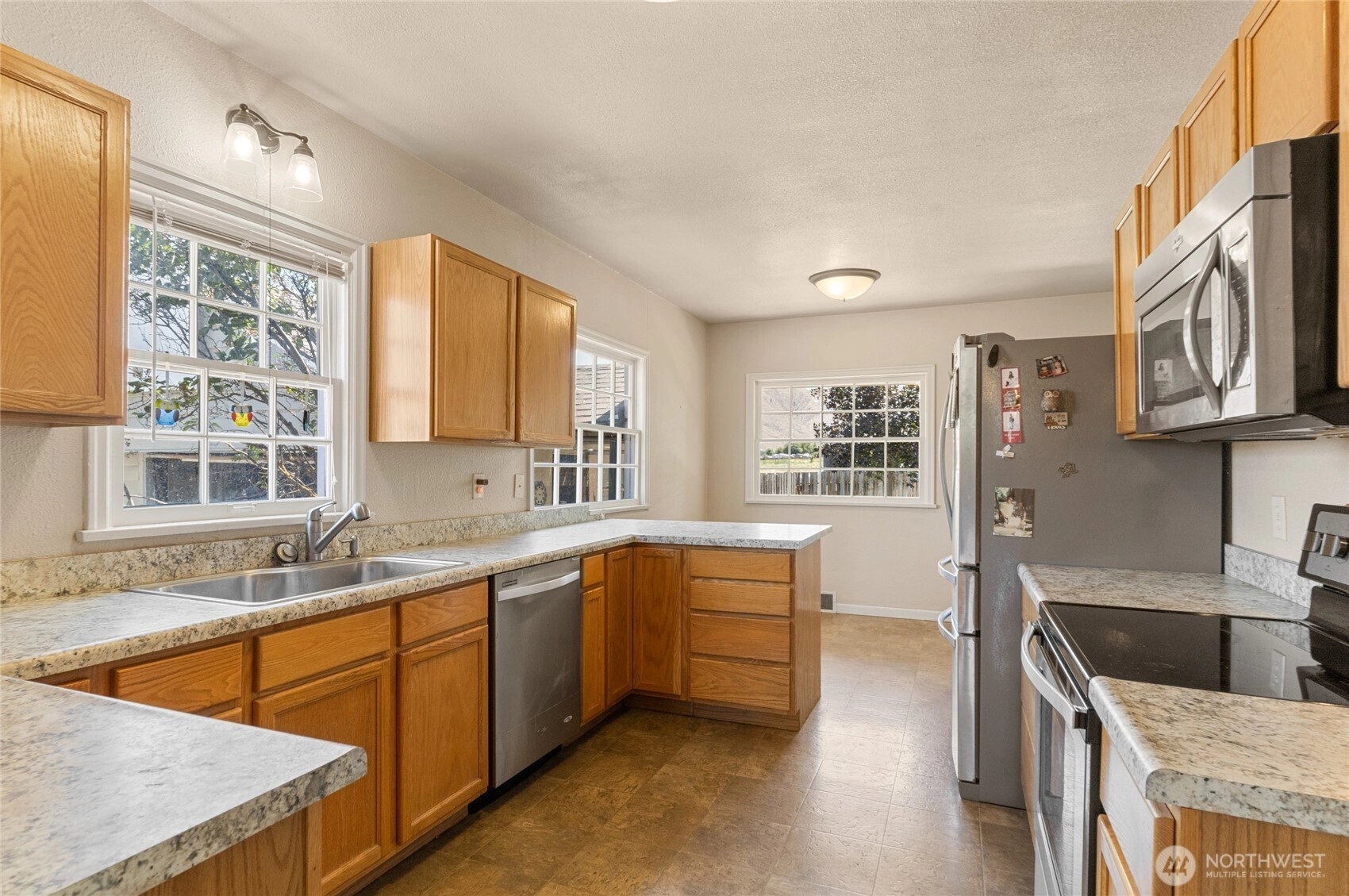 This very spacious 5-bedroom home is ideal for those looking to expand. Move-in ready, features a fully equipped kitchen with updated appliances & a convenient breakfast bar. The open layout allows for plenty of natural light throughout the home. Enjoy cozy evenings with two fireplaces—one in the main living room & another in the downstairs family room. All bedrooms are generously sized. The home includes a 506 sq ft garage with additional parking in the back, perfect for boats, RVs or other outdoor toys. The large backyard features a well-maintained deck & a covered seating area, waterfall feature, making it perfect for outdoor dining and entertaining. This home combines space and charm—an excellent opportunity for any growing household.