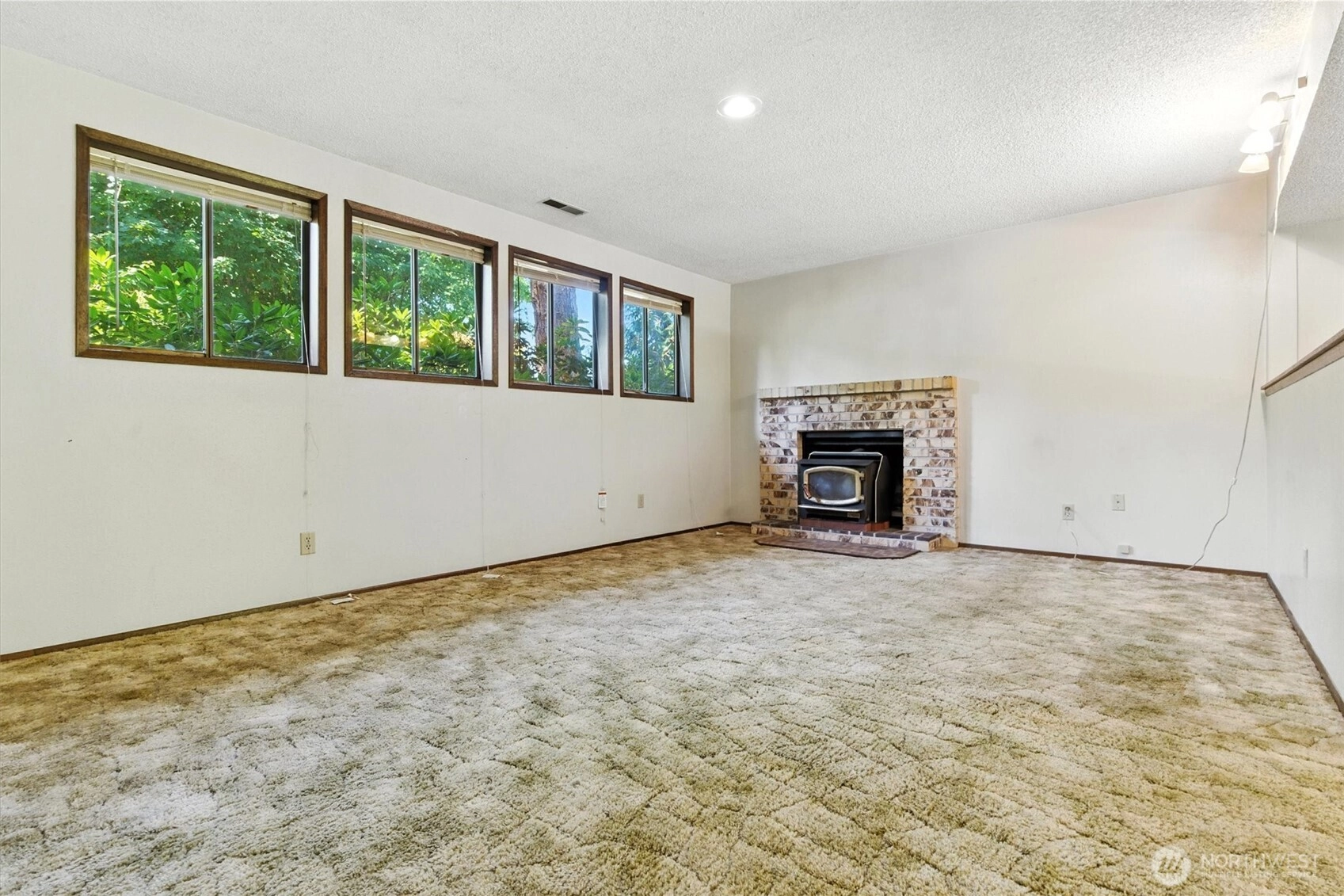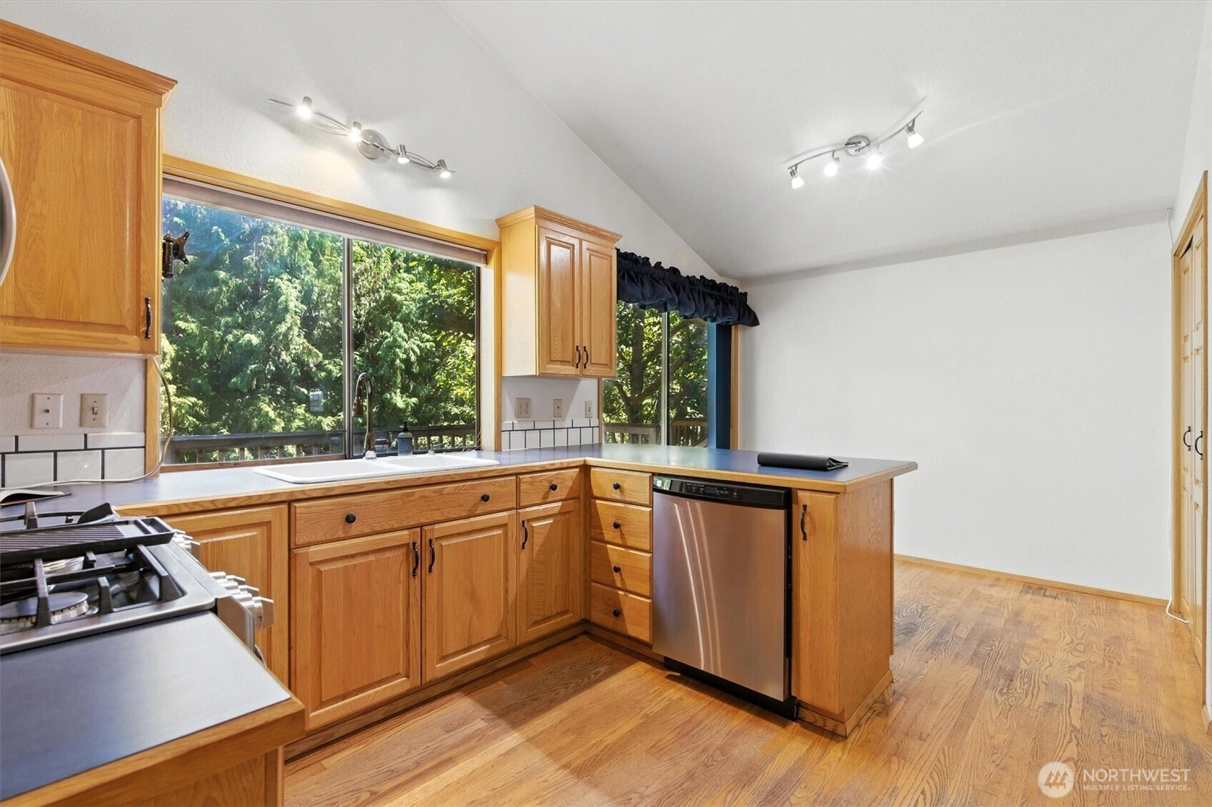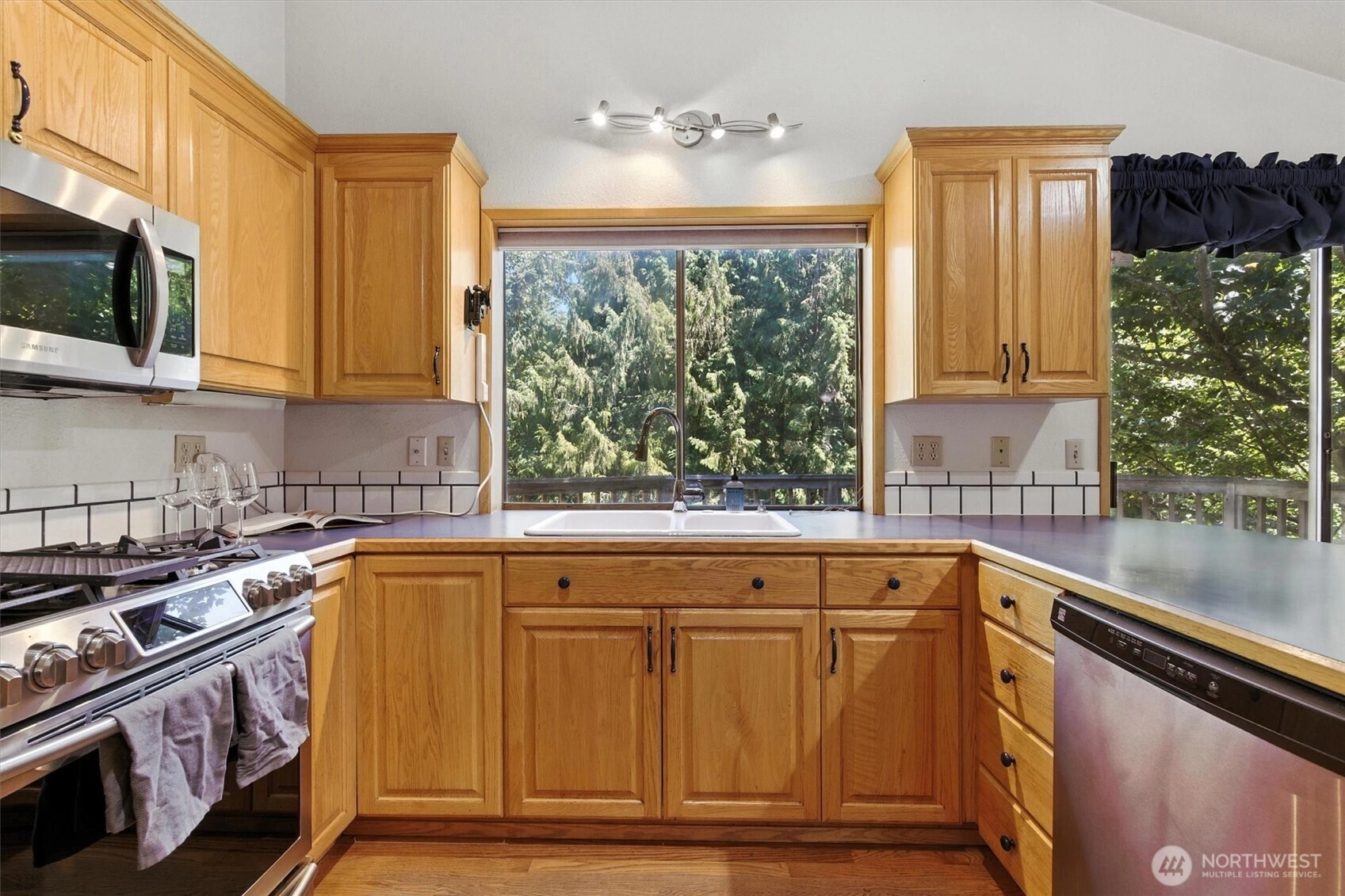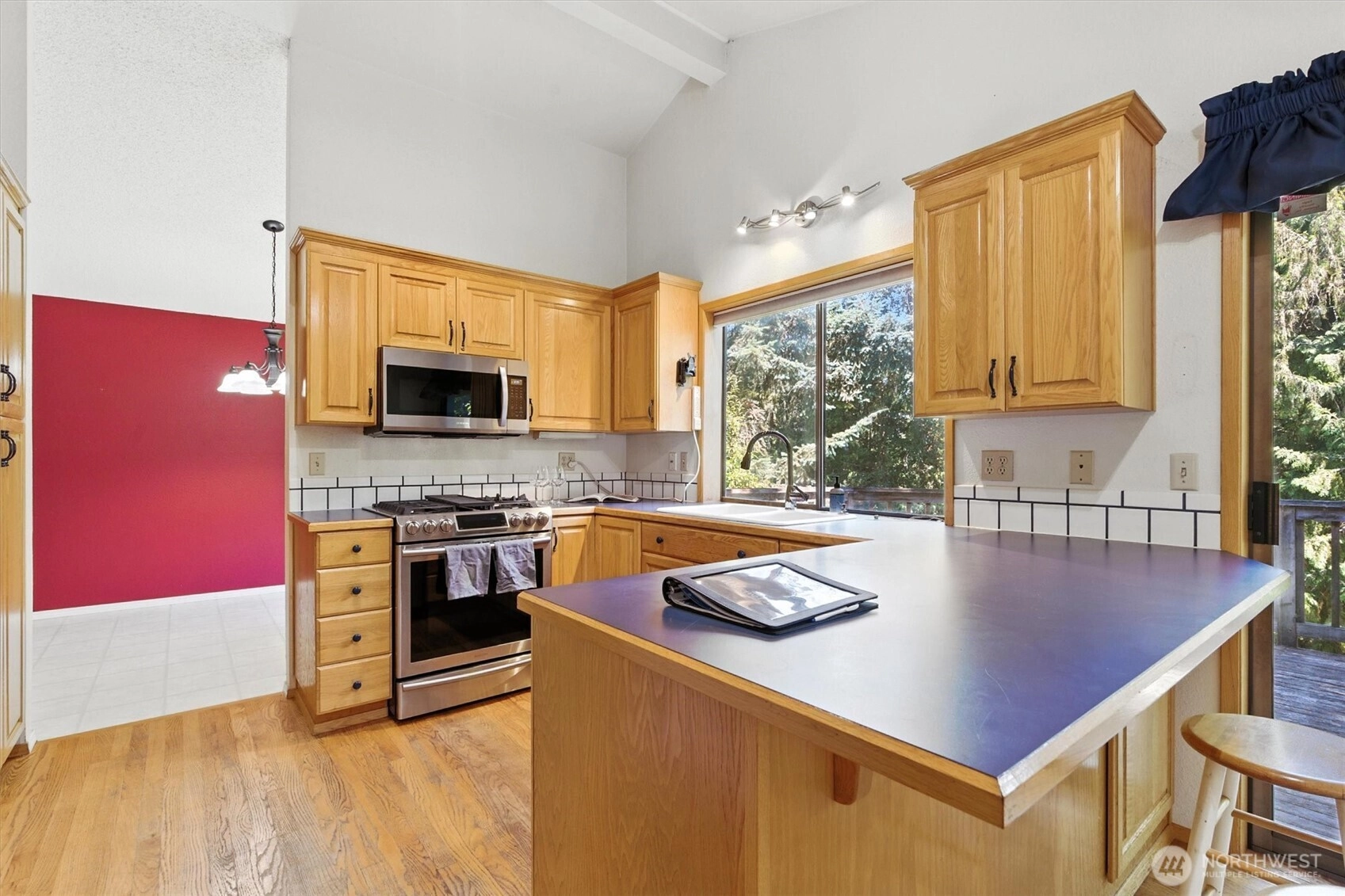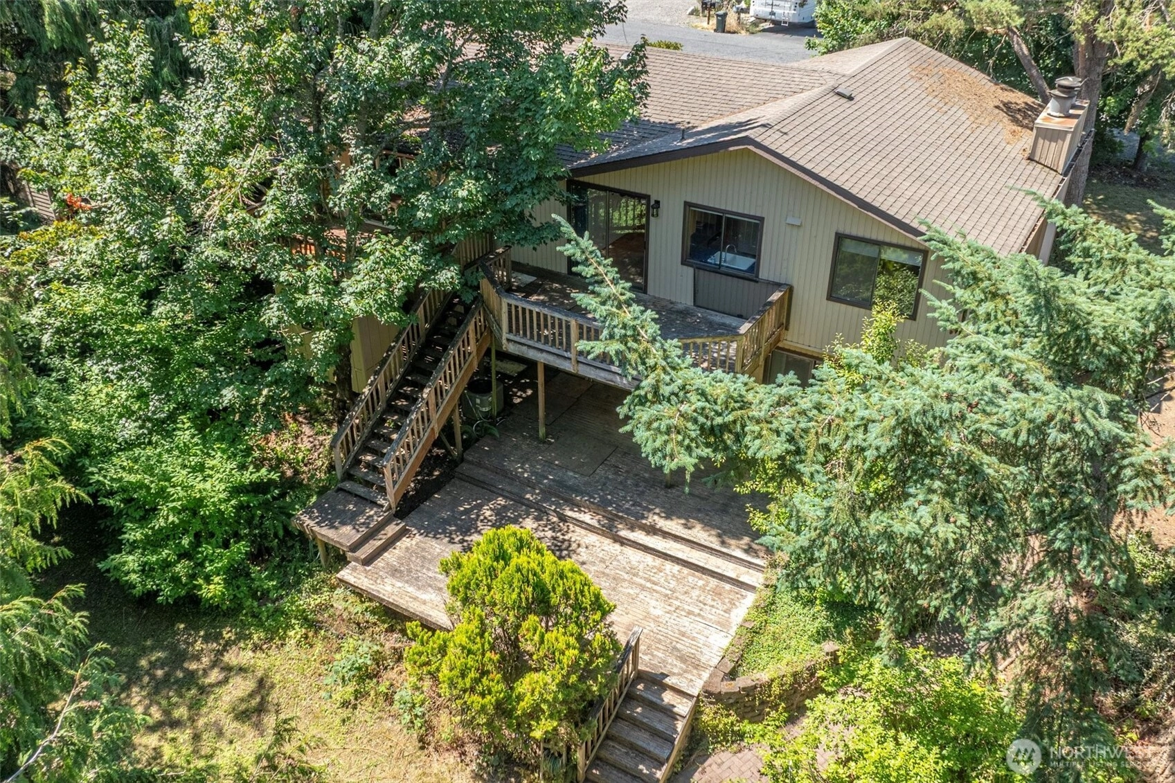 Welcome to island living! This home features plenty of room for everyone with 4 bedrooms, 3 bathrooms, and even an extra living space downstairs with a wet bar. Upstairs you have great vaulted ceiling in the living room, kitchen and dining room. The kitchen features tons of cabinets with sliding drawers for all the pots and pans you have. Outback you have a huge deck with mature blueberry bushes that you can't beat as well as Rainier cherry trees. You also have a large 12 by 30 foot carport for all the toys you need, a 2 car garage, and street parking as well. This home comes with private lake access to the best park on the lake with stunning mountain views, a boat launch, tennis and pickleball courts and so much more!