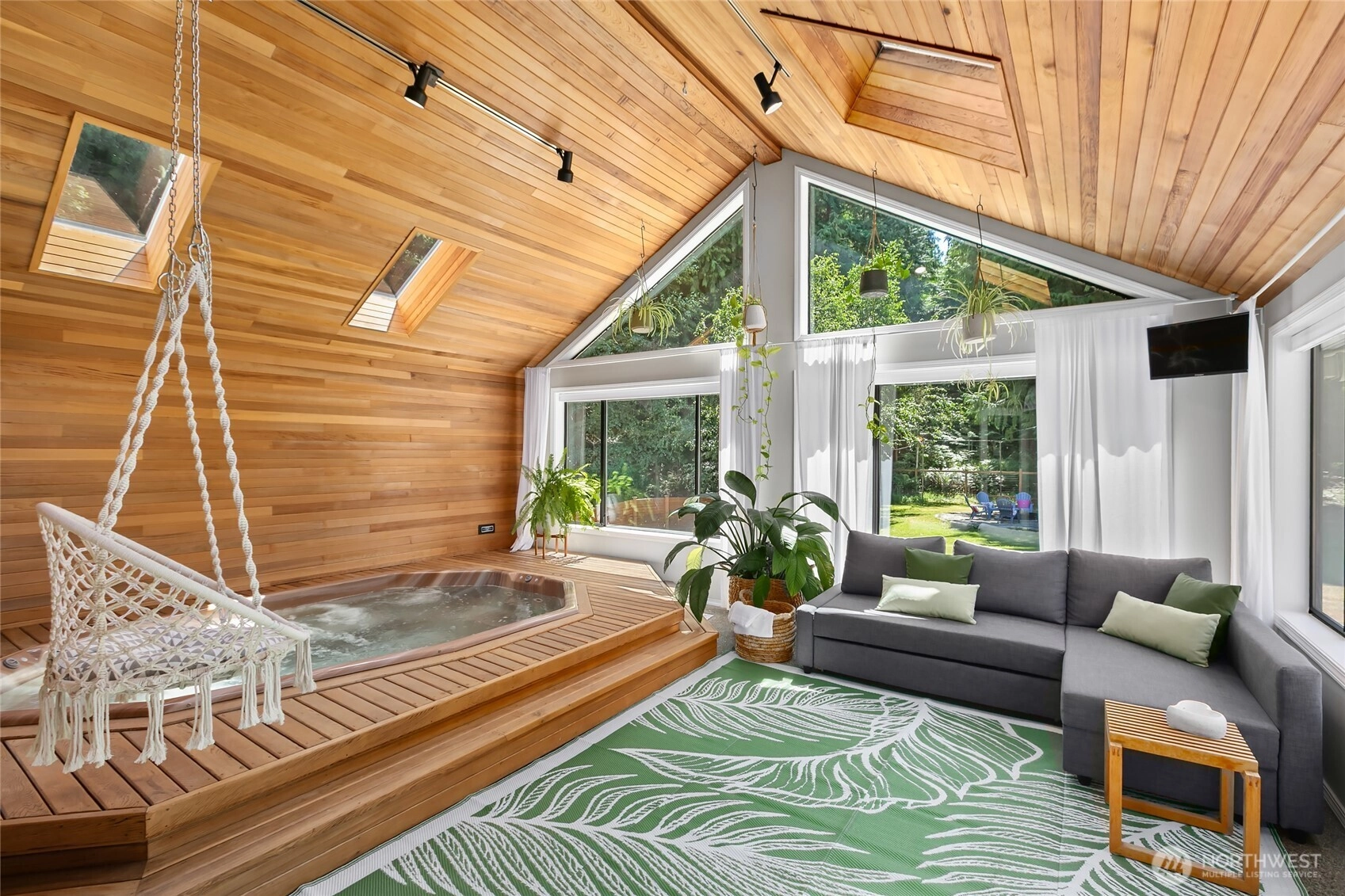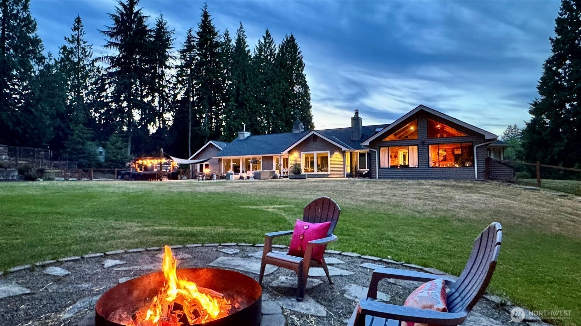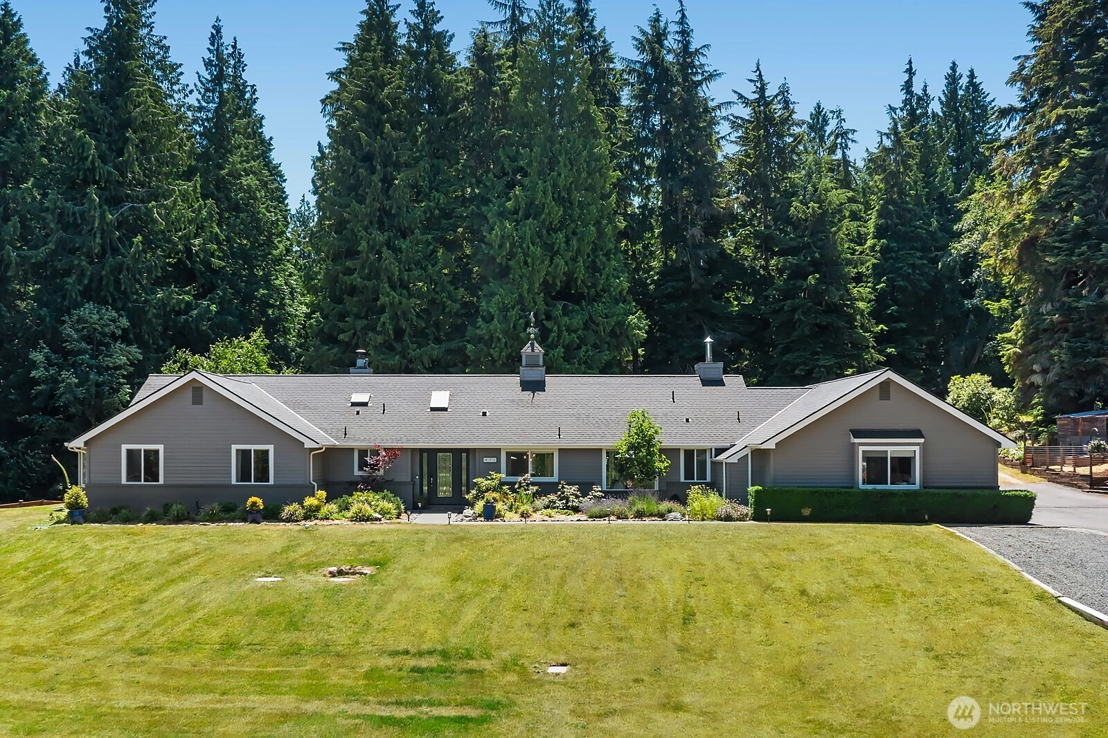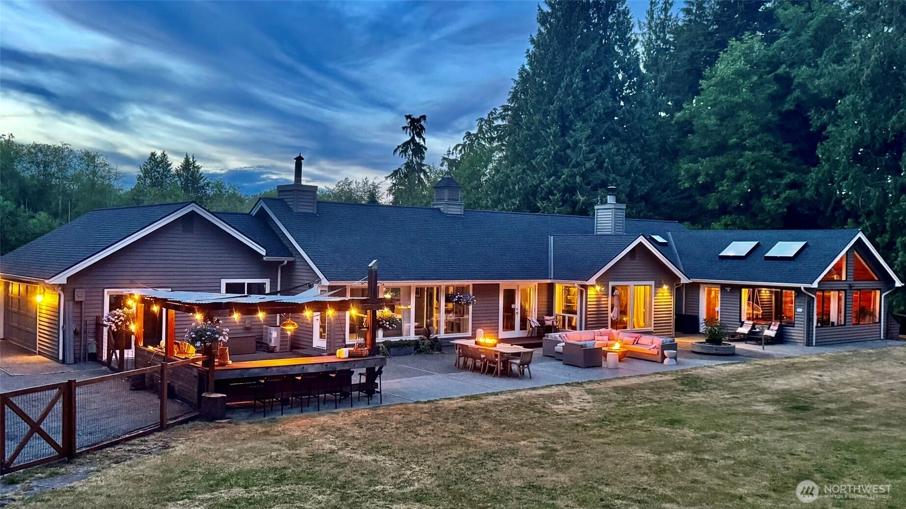 Exquisite 5.4-acre estate just minutes from downtown Langley. Stunning remodeled rambler designed for modern indoor/outdoor living. Contemporary design features pecan hardwoods, custom cabinetry & quartz counters throughout. Open concept living offers a seamless, flowing floorplan, connecting kitchen, living, dining & family room to the outdoor spaces. Three generous bedrooms & an idyllic 429 sq ft hot tub/spa retreat. The lot is an entertainer, gardener or hobbyist's dream w spacious patio, covered outdoor kitchen & bar, stage style decking, fenced in rear yard as well as fruit trees, raised beds, meadow, chicken coop, 1152 sq ft workshop & charming playhouse. Preinspected, newer roof & septic, low-e windows make it move in ready!