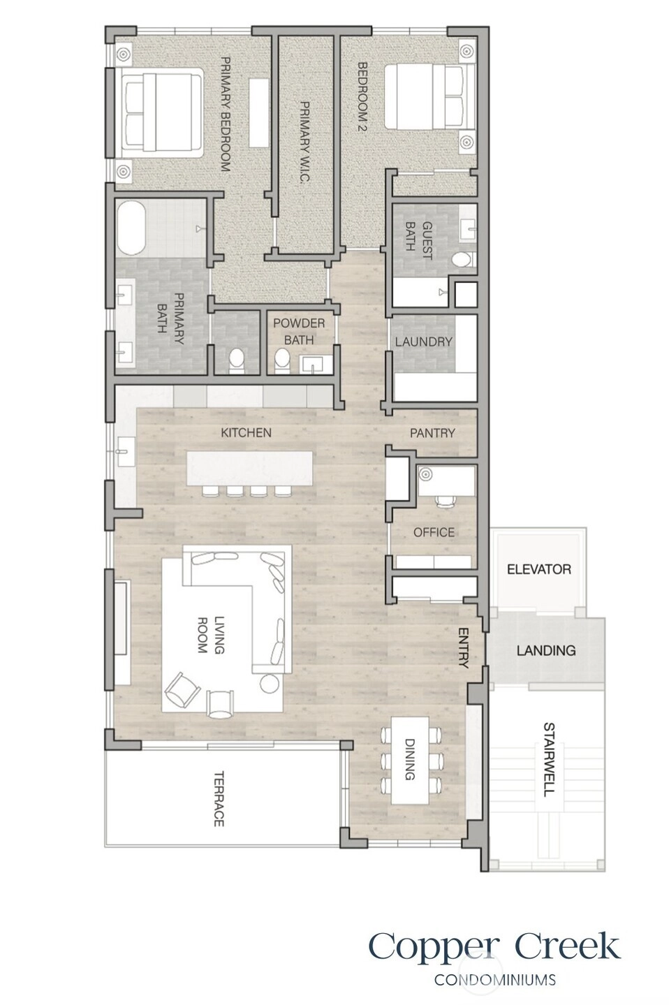 Last residence available at Copper Creek! An exclusive opportunity to own a penthouse in the newly constructed community built by Cordillera Homes. Offering 2 beds, 2 ½ baths & versatile flex room, this spacious residence is thoughtfully designed for modern living with over 2,000 sqft. Enjoy the ease of a secure, lock & leave lifestyle with convenient elevator access & a private terrace for year-round comfort. The open concept layout is perfect for entertaining, featuring a premium kitchen with Thermador appliances, a walk-in pantry & dedicated office. Unwind in the spa-like primary suite, complete with a freestanding tub, a luxurious multi-function shower & sleek fixtures. Secure underground parking ensures convenience for homeowners.