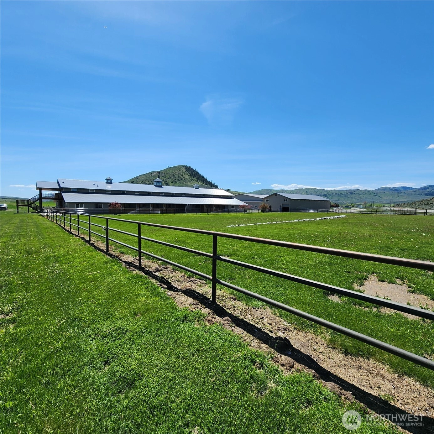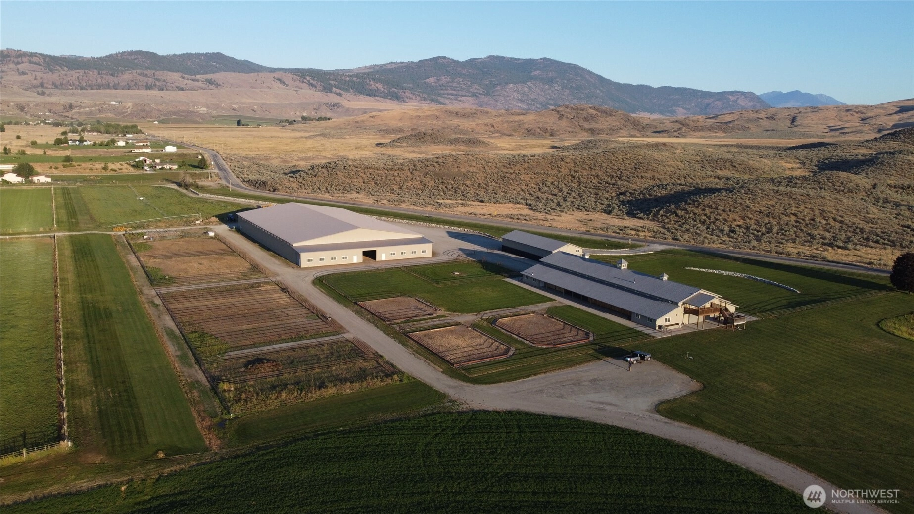 Pine Creek Equestrian Facility. Fully irrigated 114.7 acres, including two large, just like new, custom-built barns. Barn #1 features cedar-wrapped ceilings, modular box stalls, a hot water washing facility, padded floors, a heated tack room, and a spacious, one-bedroom, one-bath apartment with a viewing window overlooking the stalls. Barn #2 is a large workshop and storage barn. The free-span riding arena measures 280x150. The property features multiple paddocks, two working pivots, and wheel lines, as well as two wells and a 12-inch pressure line for alfalfa irrigation. Producing approximately 350 tons of Alfalfa per season. The facility is located 5 minutes from Tonasket and Hwy 97, with paved access & an airport nearby.