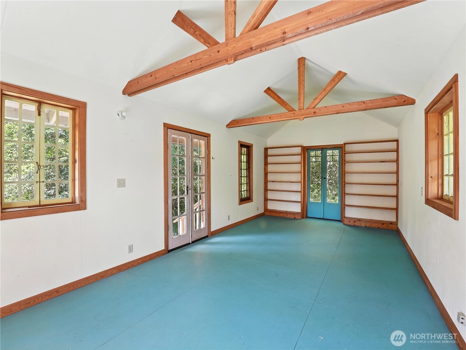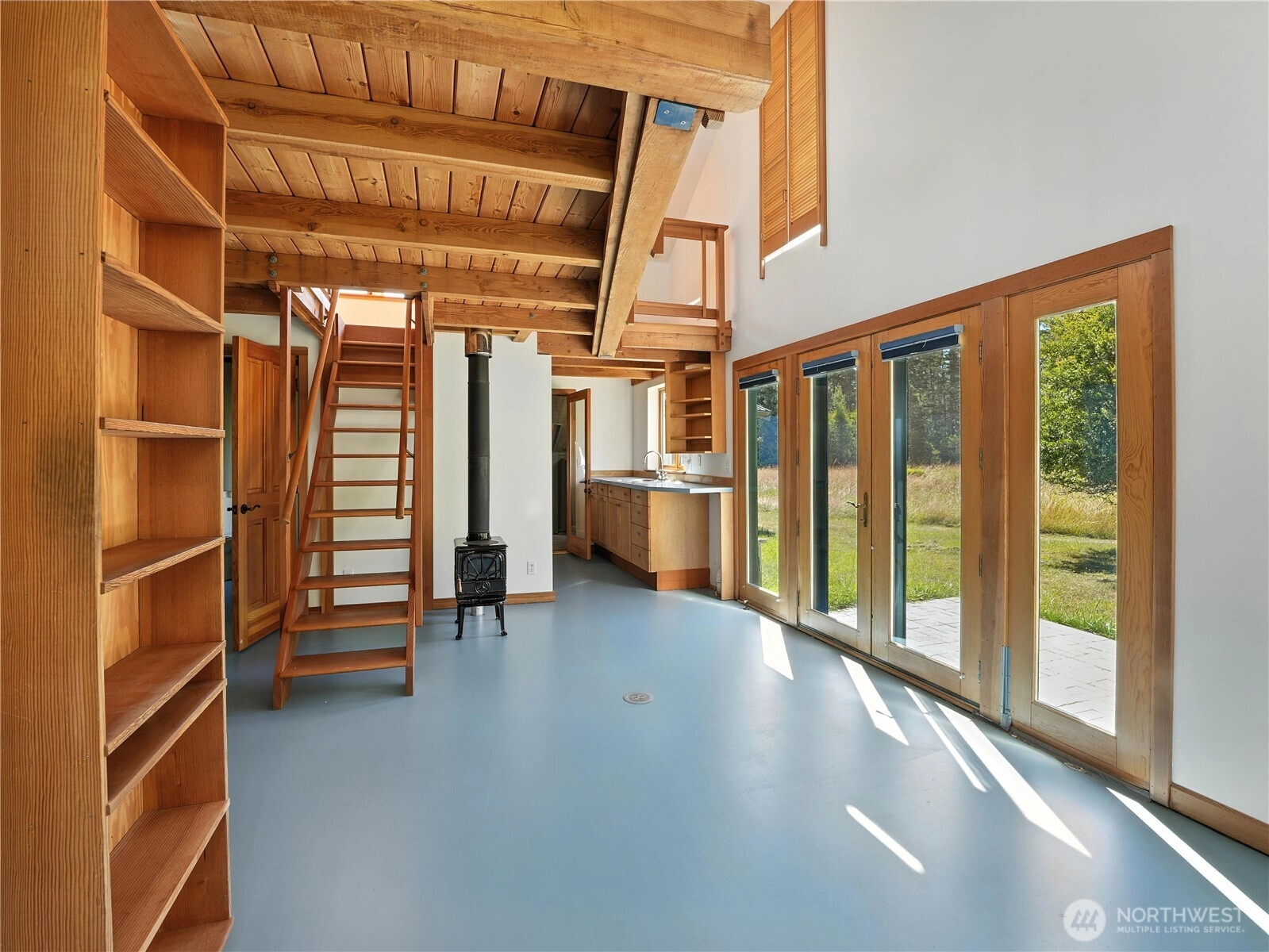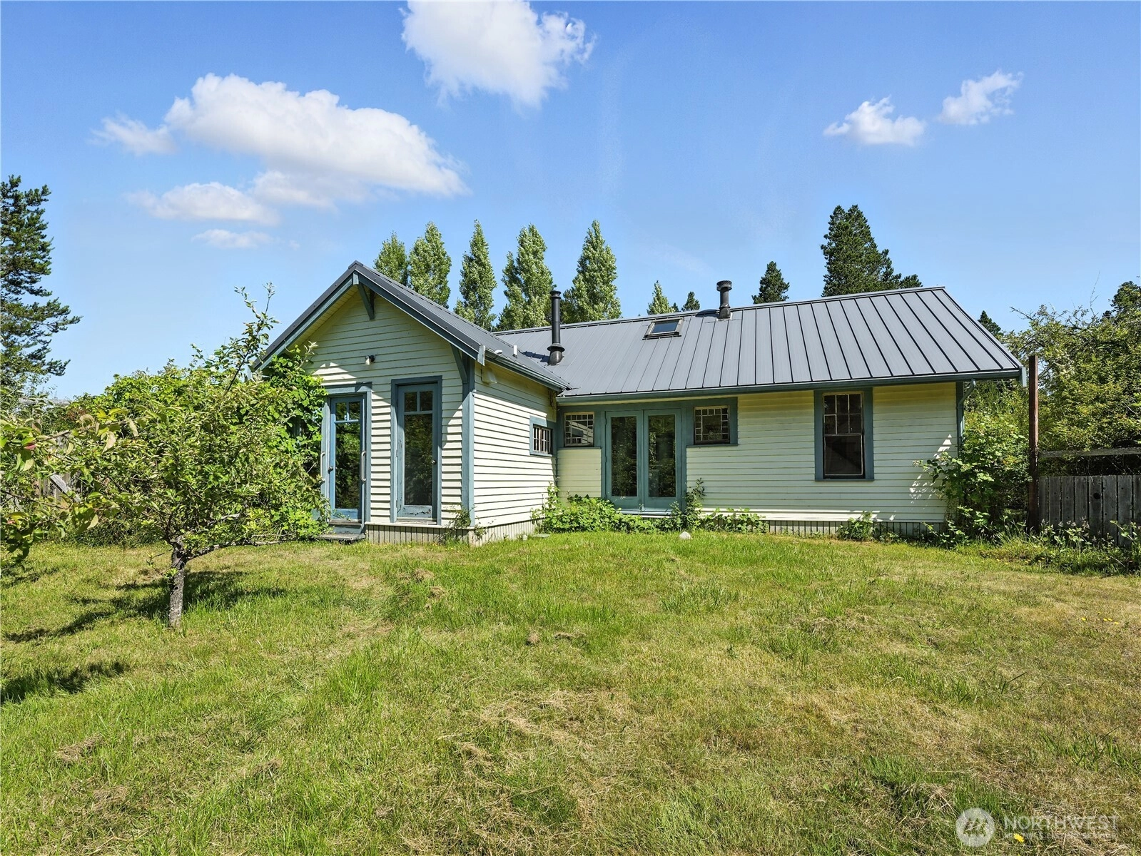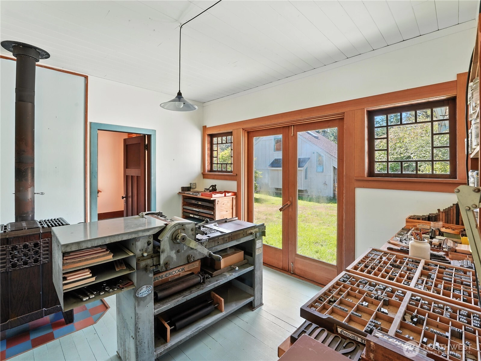 An Artists studio with an Architects cottage! This perfectly located North end retreat features a 1935 creators studio and a 1997 Ted Bower designed "Cabbage", a cross between a cabin and a cottage. The studio, with swaths of color gets flooded with light, has options for expanded living or creating. The Cabbage, with 2 beds, 1.25 baths and 1,100sf is the perfect island get away. Skylights, dutch doors to a patio overlooking the fielded and wooded 10 acres, a courtyard with apple trees between the studio and Cabbage all create a sense of privacy from the outside, but connection between the two homes. A third structure, the "Coterie" is perfect for a yoga studio or separate office. Cabbage is great one level living with primary on main.
