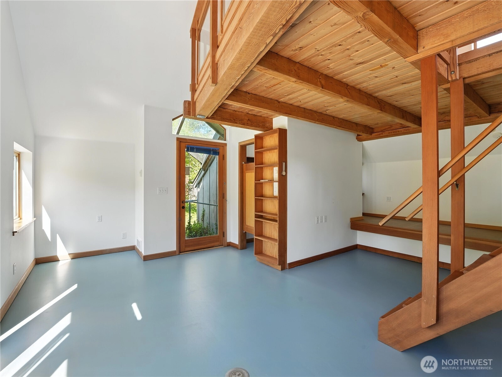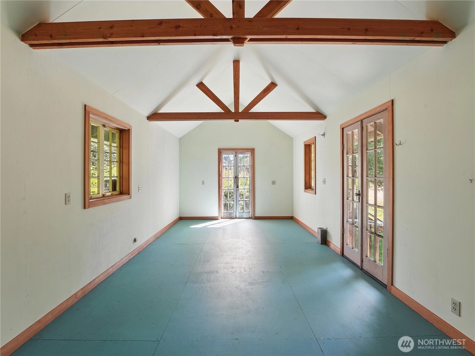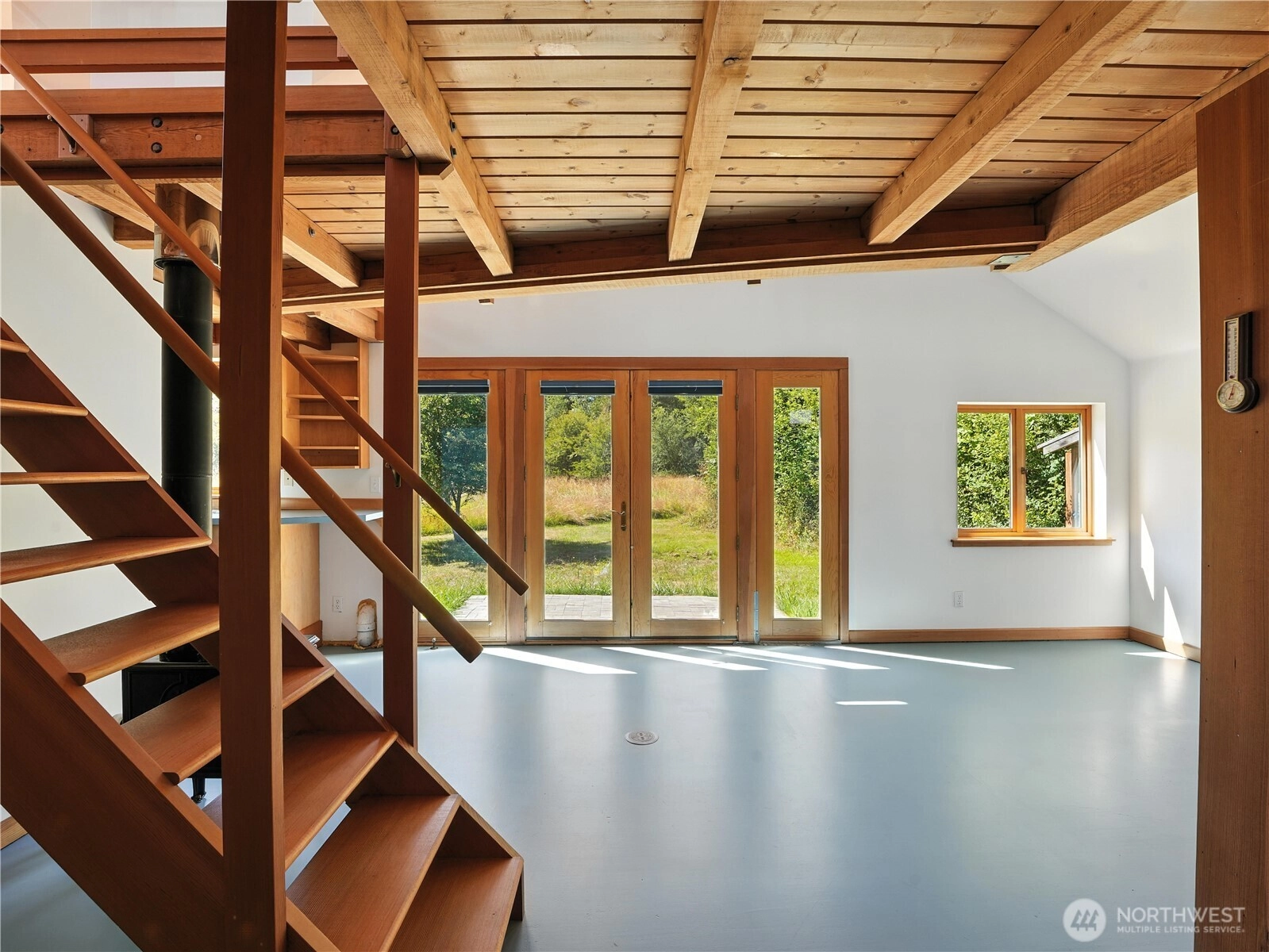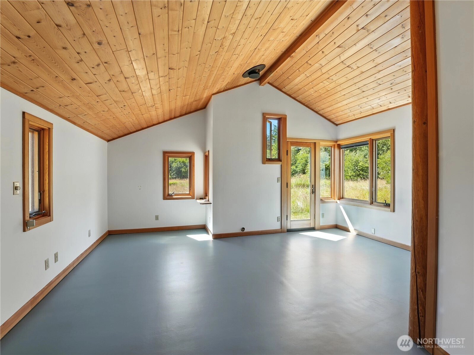 An Artists studio with an Architects cottage! This perfectly located North end retreat features a 1935 creators studio and a 1997 Ted Bower designed "Cabbage", a cross between a cabin and a cottage. The studio, with swaths of color gets flooded with light, has options for expanded living or creating. The Cabbage, with 2 beds, 1.25 baths and 1,100sf is the perfect island get away. Skylights, dutch doors to a patio overlooking the fielded and wooded 10 acres, a courtyard with apple trees between the studio and Cabbage all create a sense of privacy from the outside, but connection between the two homes. A third structure, the "Coterie" is perfect for a yoga studio or separate office. Cabbage is great one level living with primary on main.
