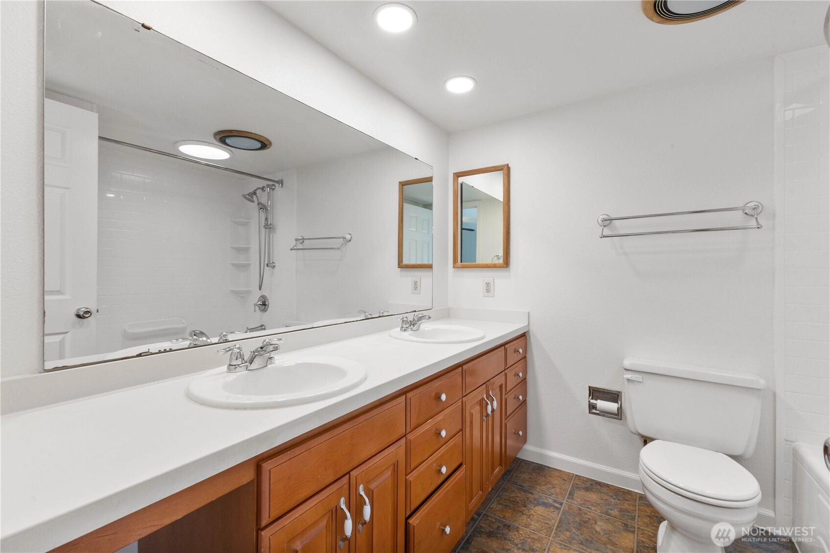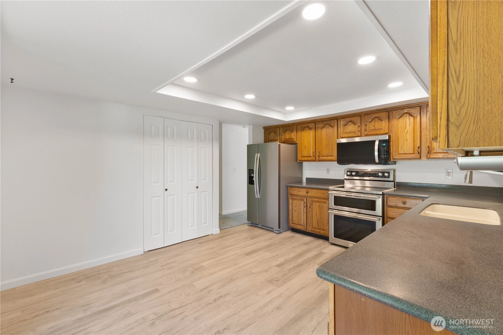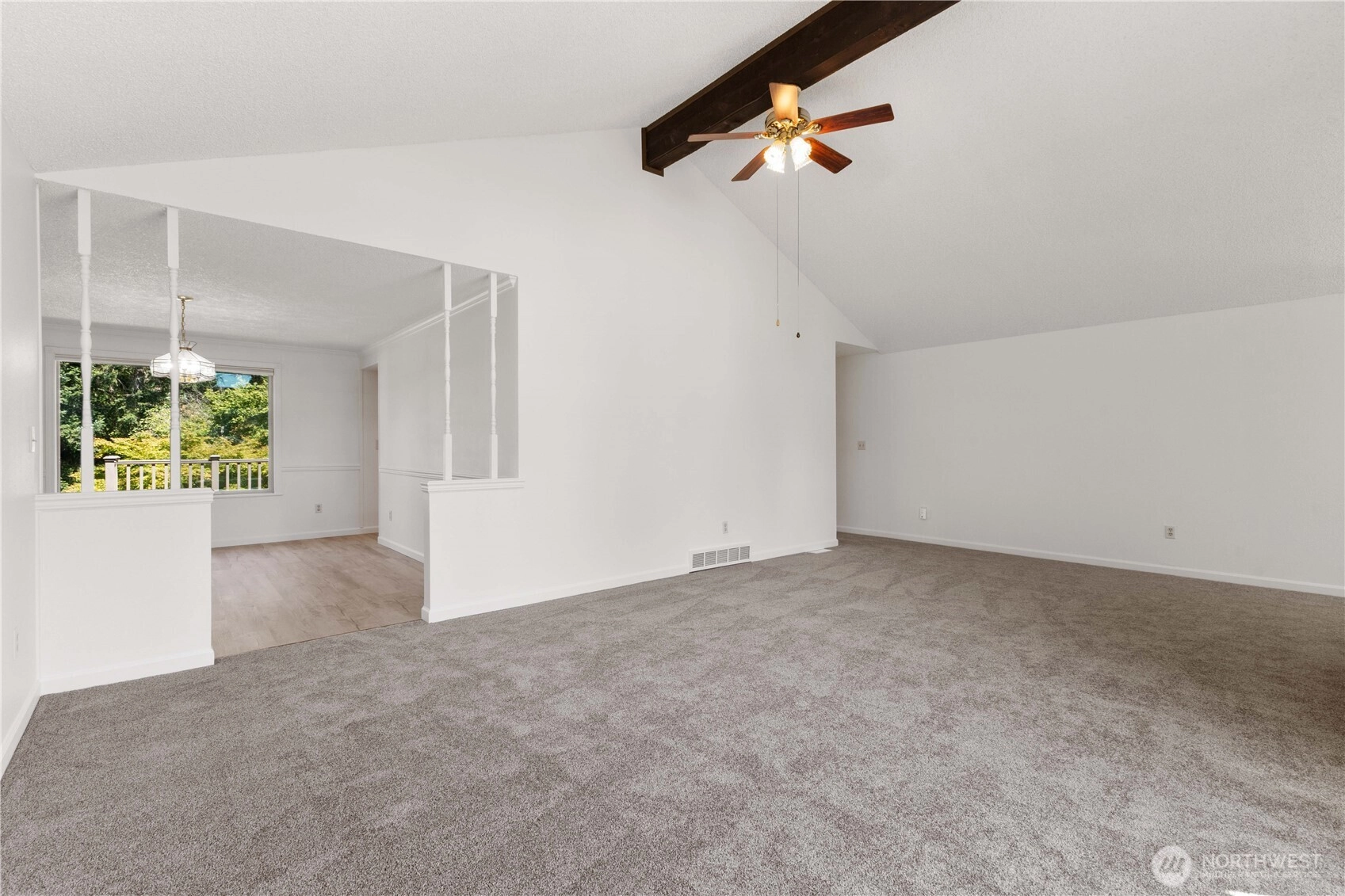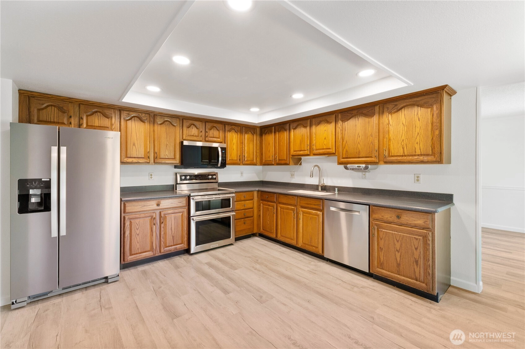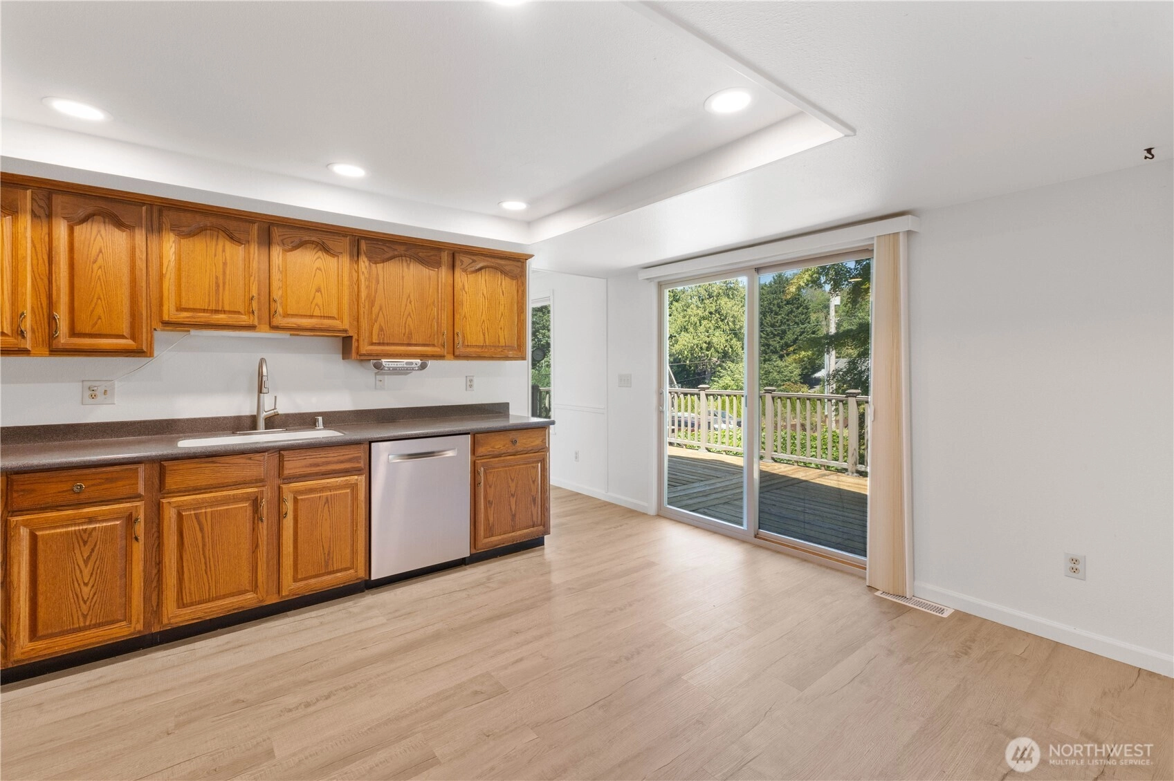 Nestled in a highly desirable neighborhood with partial sound view, this 4 bedroom home offers ample comfortable living space with thoughtful touches throughout. The main level features a sunlit primary bedroom with an ensuite and charming bay window. Enjoy cooking and entertaining in open spaces highlighted by new interior paint, fresh carpet, and luxury plank flooring. Downstairs, a fully finished daylight basement provides extra living area, laundry, and potential multi generation home or office space, etc. The fenced backyard is perfect for relaxing under mature shade trees or tending raised garden beds and grapevines. Plus, there's room for your RV or boat, a two-car garage with extra shop space, and is even wired for generator hookup!