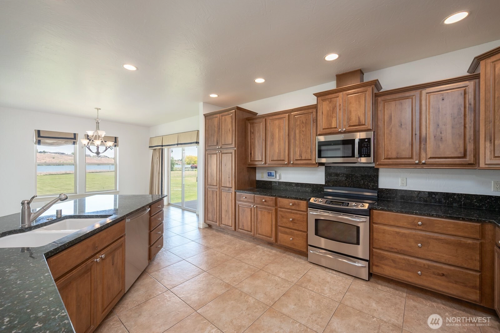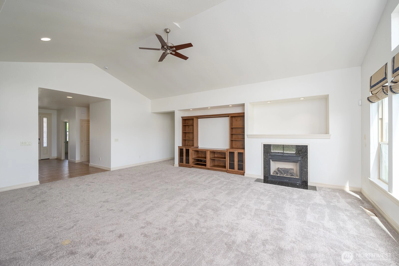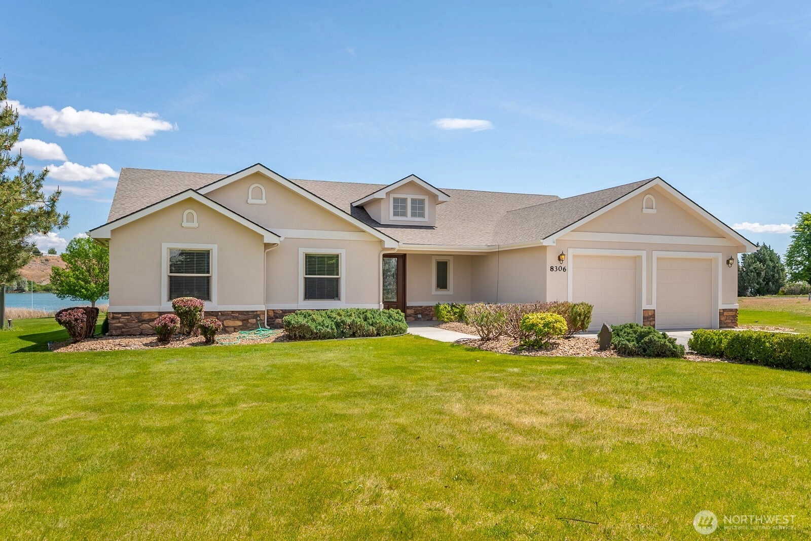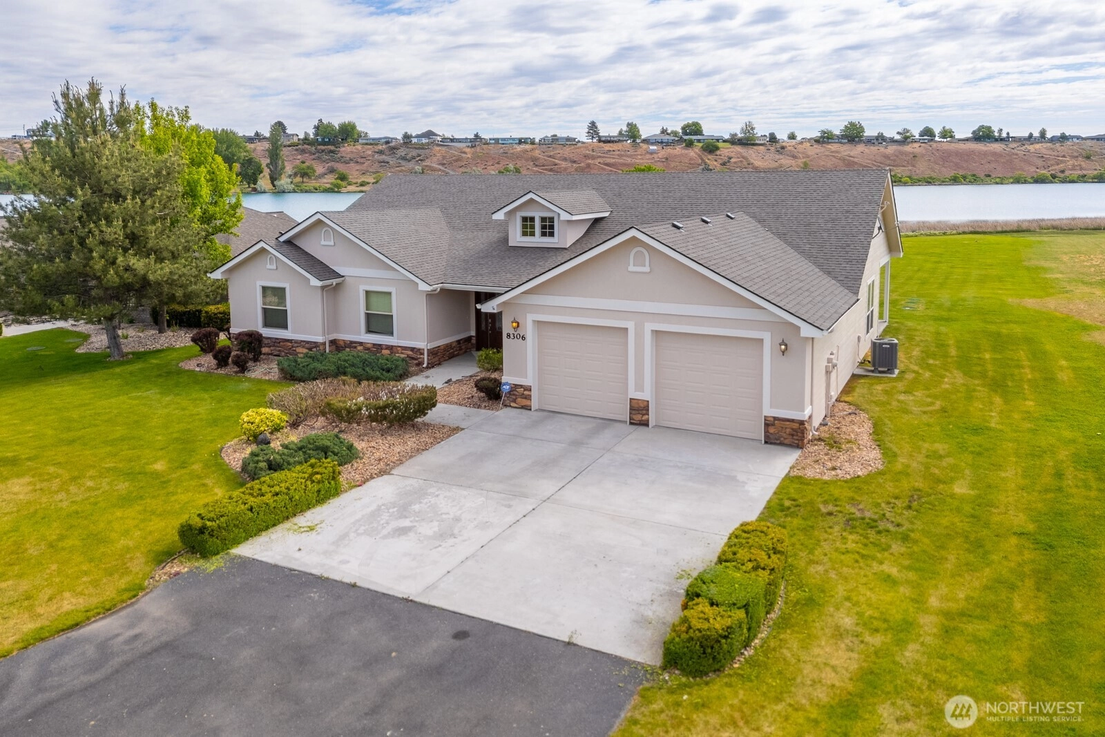 Luxurious Waterfront Living on 1 Acre, No-Bank Access + Private Dock. Welcome to this stunning 3-bedroom, 3-car 2,265 sf waterfront retreat with 105' of prime lake frontage. Step inside to find vaulted ceilings, an open-concept floor plan, gas fireplace framed by a custom-built media center, ideal for both relaxing & entertaining. The freshly painted interior & exterior, along with new carpeting, add to the warm & welcoming feel. Large private Primary EnSuite with view of the lake! Kitchen & Bath features granite countertops. Whether you're enjoying the tranquil views from the living room or launching a kayak from your dock, this property offers the ultimate blend of luxury, privacy, & natural beauty. (Shop next door not included)