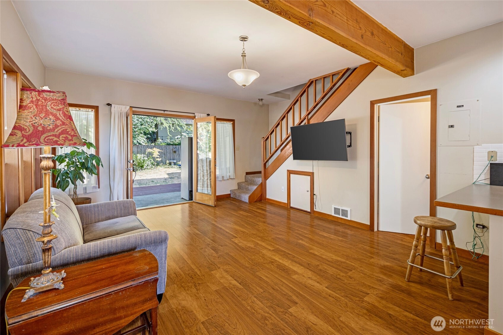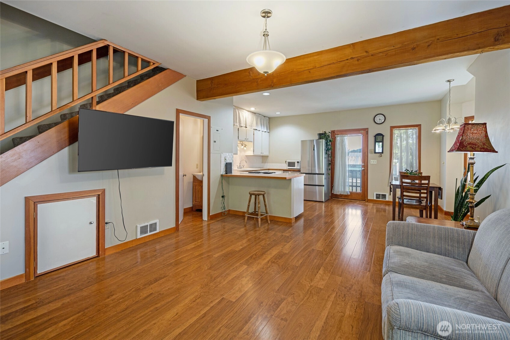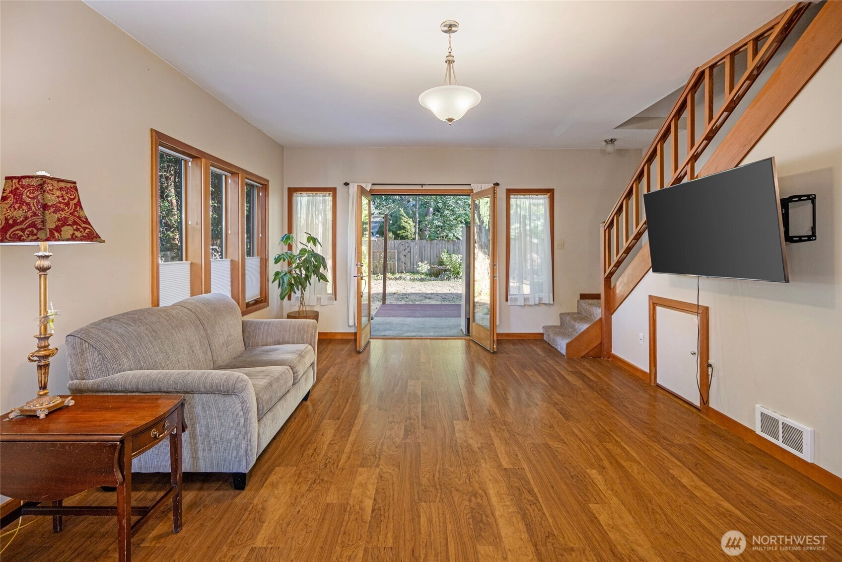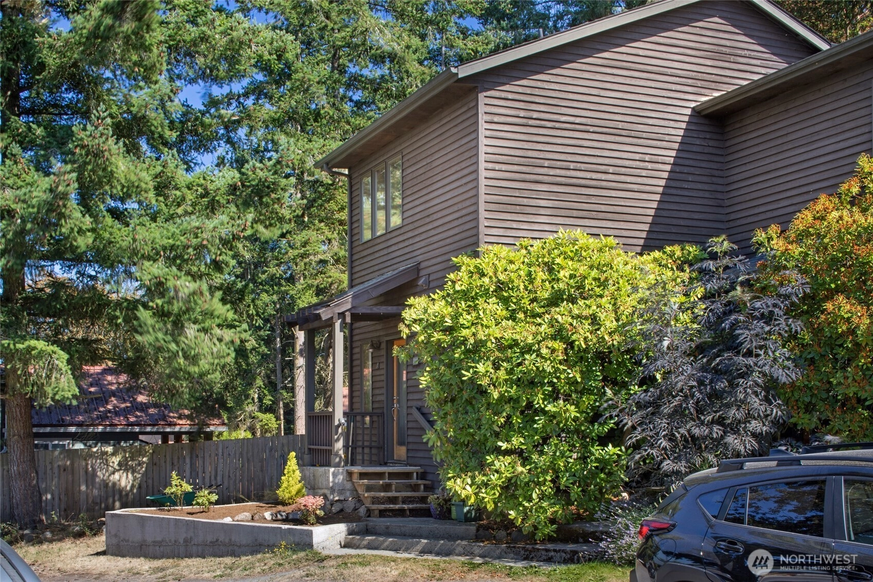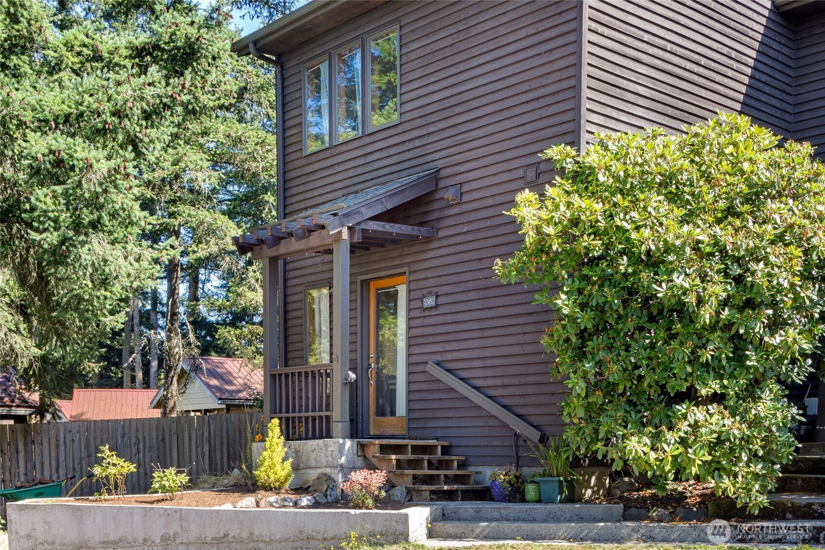 OHANA TOWNHOME CONDOMINIUMS. Pacific Northwest Townhouse located on the edge of town. 1025 sq. ft. 2 bedrooms 1.5 bathrooms. End-unit private with patio and deck offers indoor-outdoor living. Balcony off the primary bedroom overlooks shared backyard and distant island views, also an apple tree in the common area. Located on the edge of town, you're just minutes from San Juan Island Library, ferry and local shops.