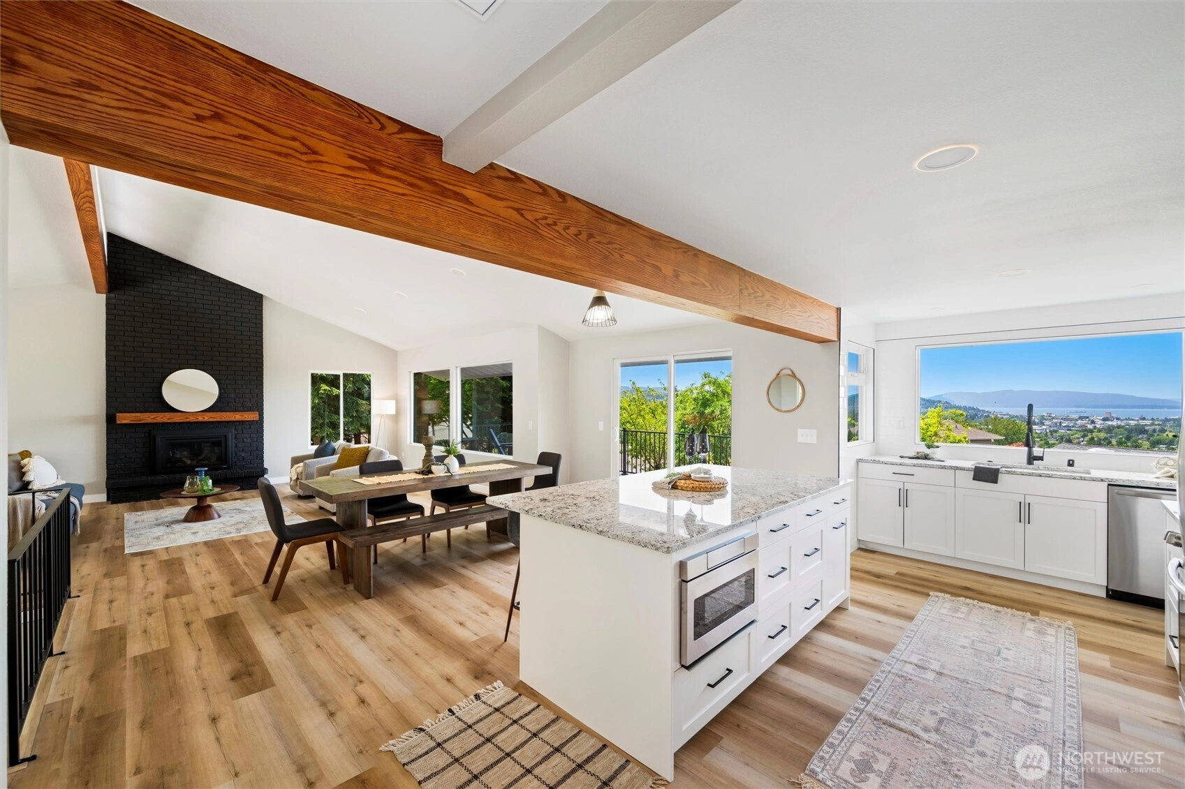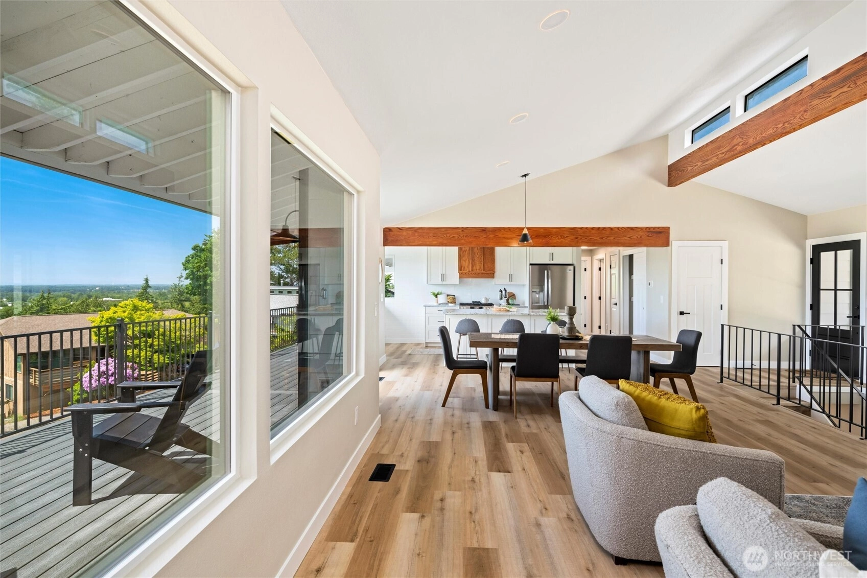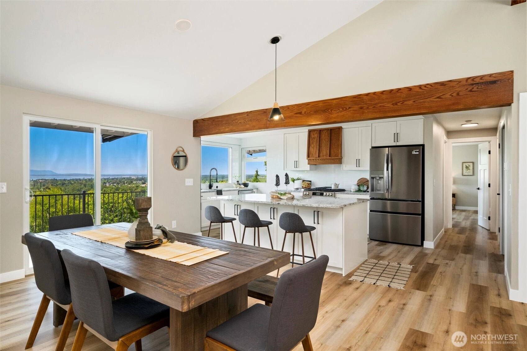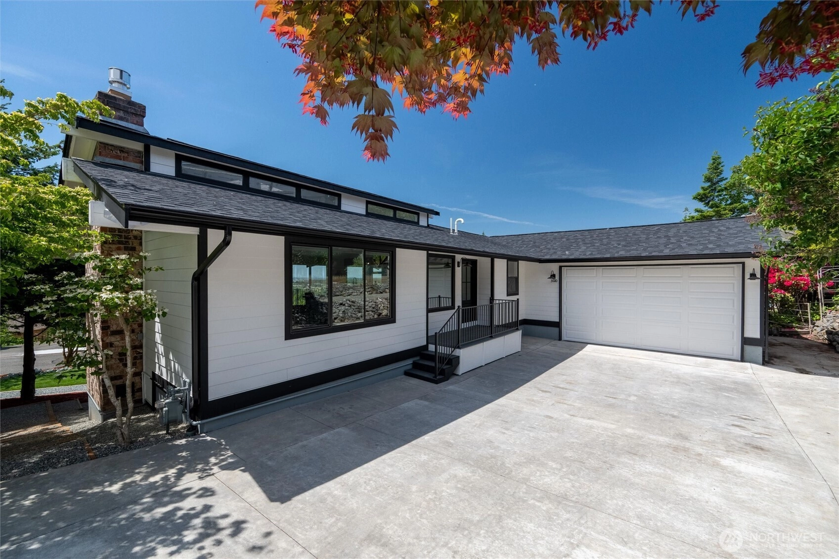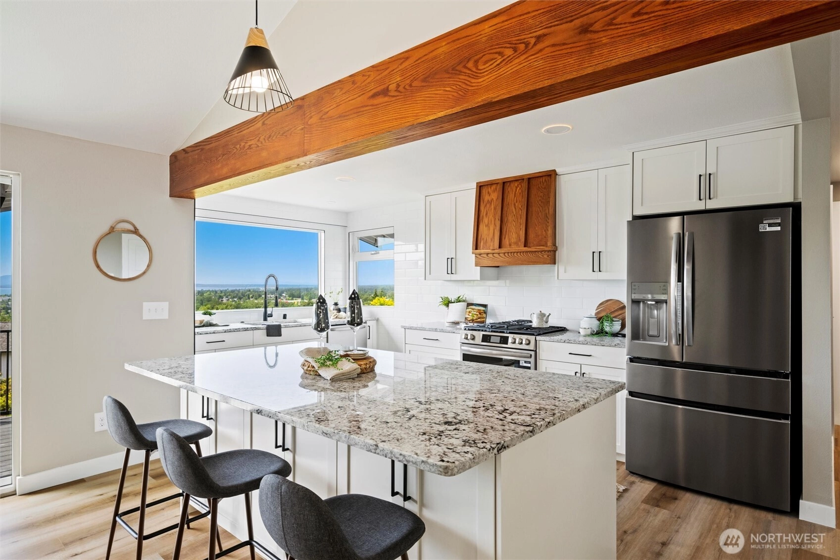 Exquisite Bellingham home with panoramic city & bay views. Vaulted ceilings and expansive windows fill the open-concept living space with light, warmed by gas fireplaces on each level. The primary suite offers deck access, ensuite bath, and walk-in closet with in-room laundry. A versatile main-level bonus room leads to the attached two-car garage. The lower level features a second full living area with walk-out yard access and its own laundry—ideal for guests or multi-gen living. Just minutes from Lake Whatcom and a short stroll to the Interurban Trail system, with the distinction of being in one of the area’s top-rated school districts. Updates include new roof, furnace, ss appliances, deck, patio, driveway, and more. A must-see retreat!